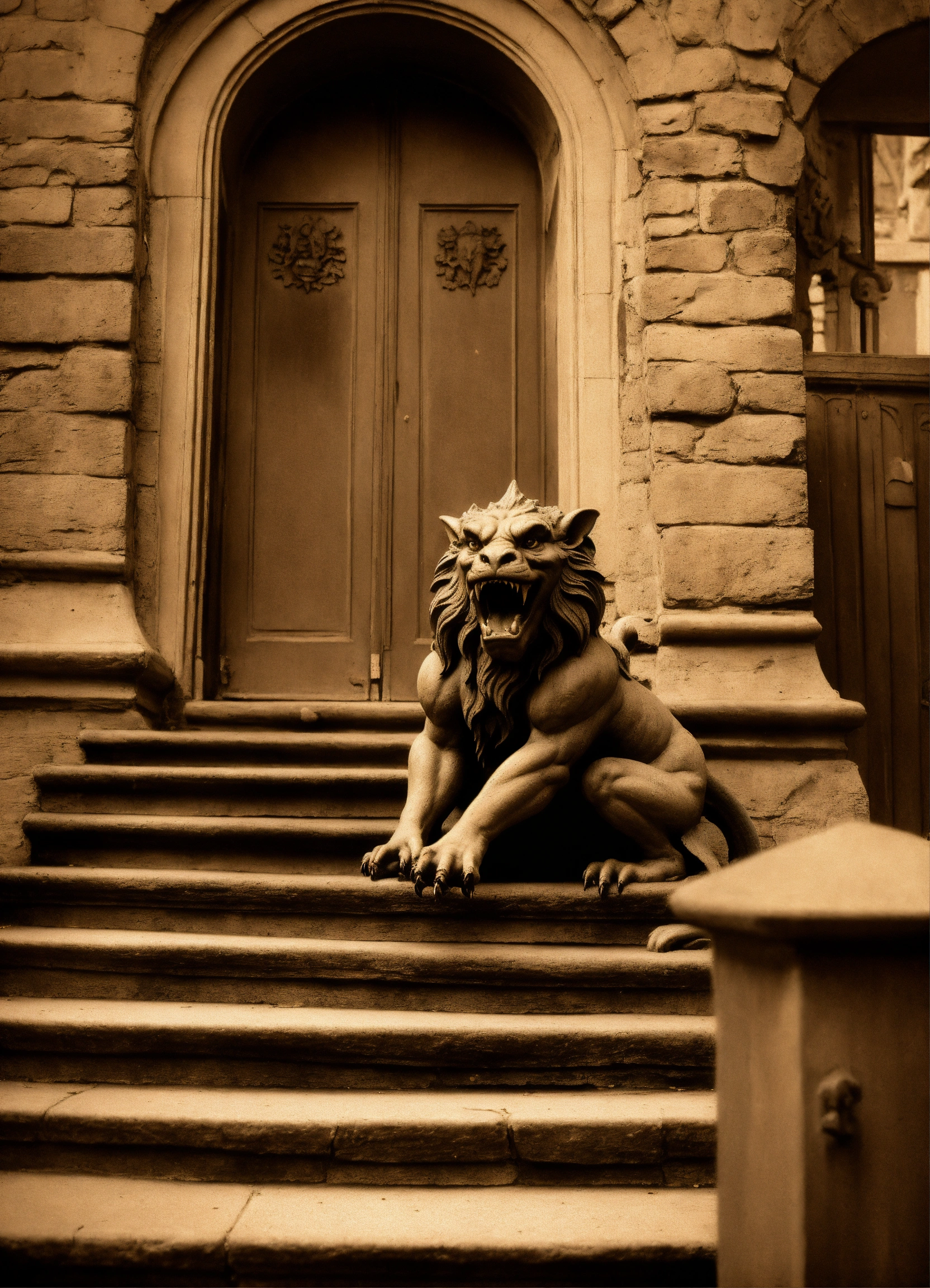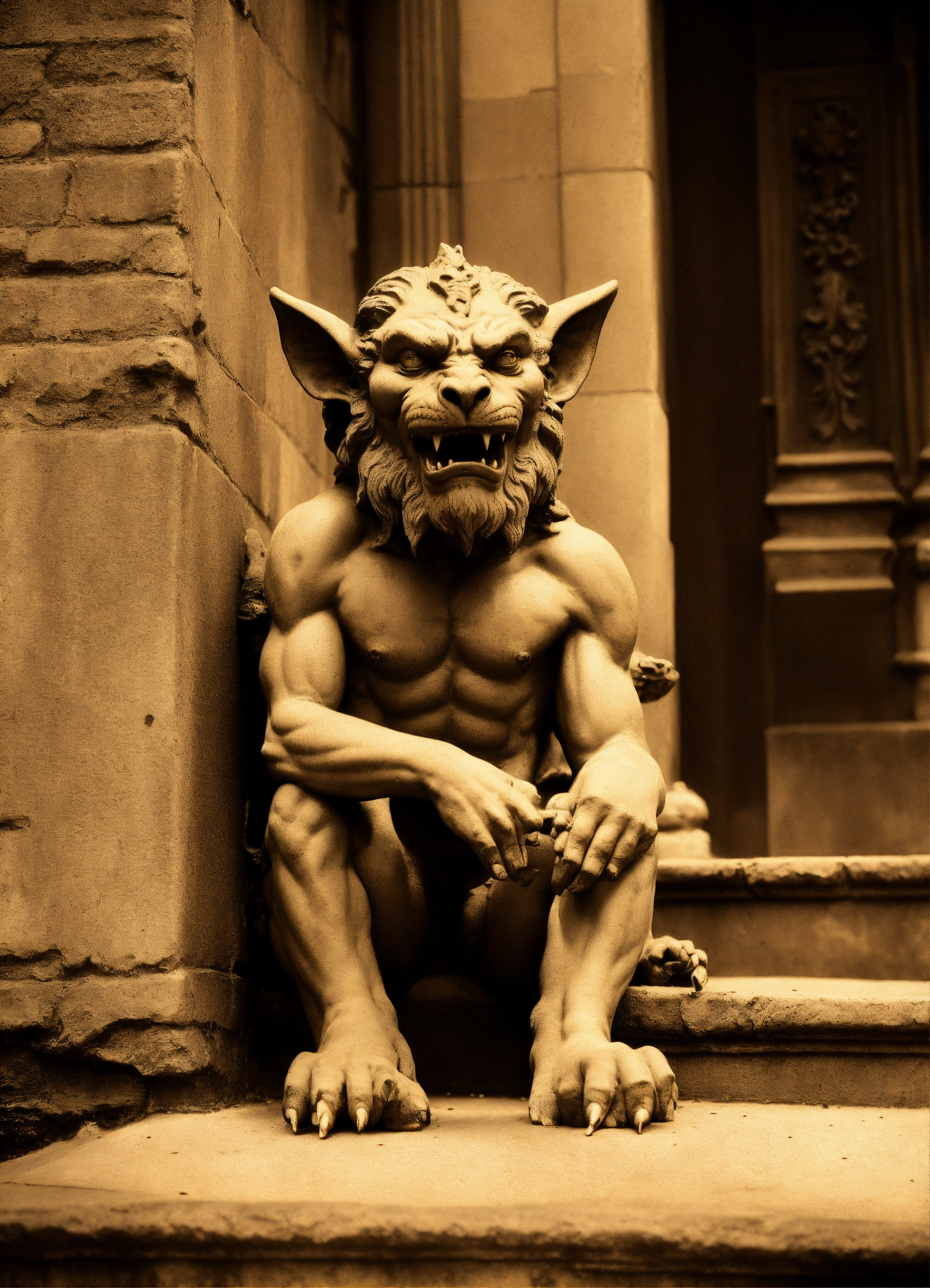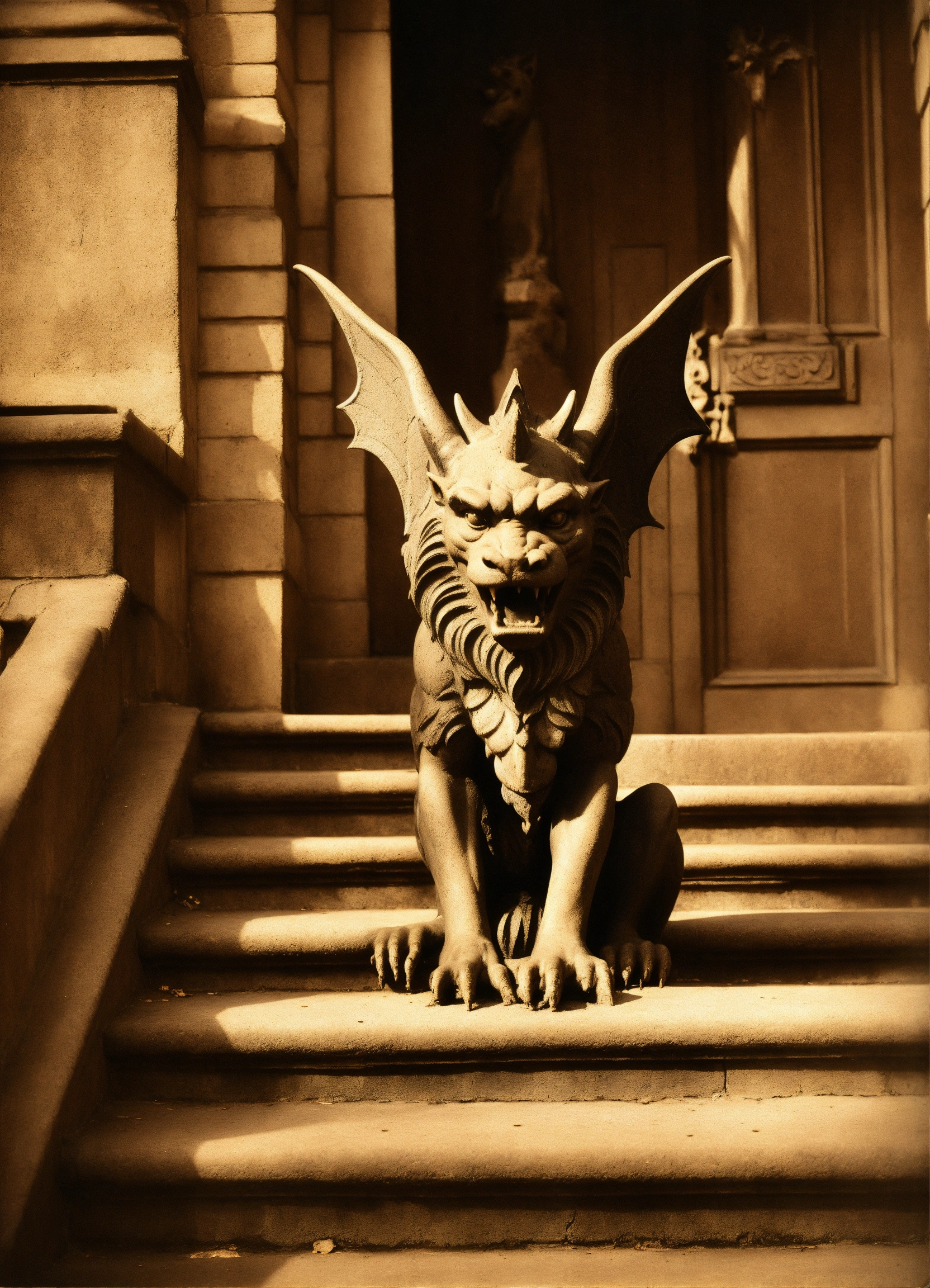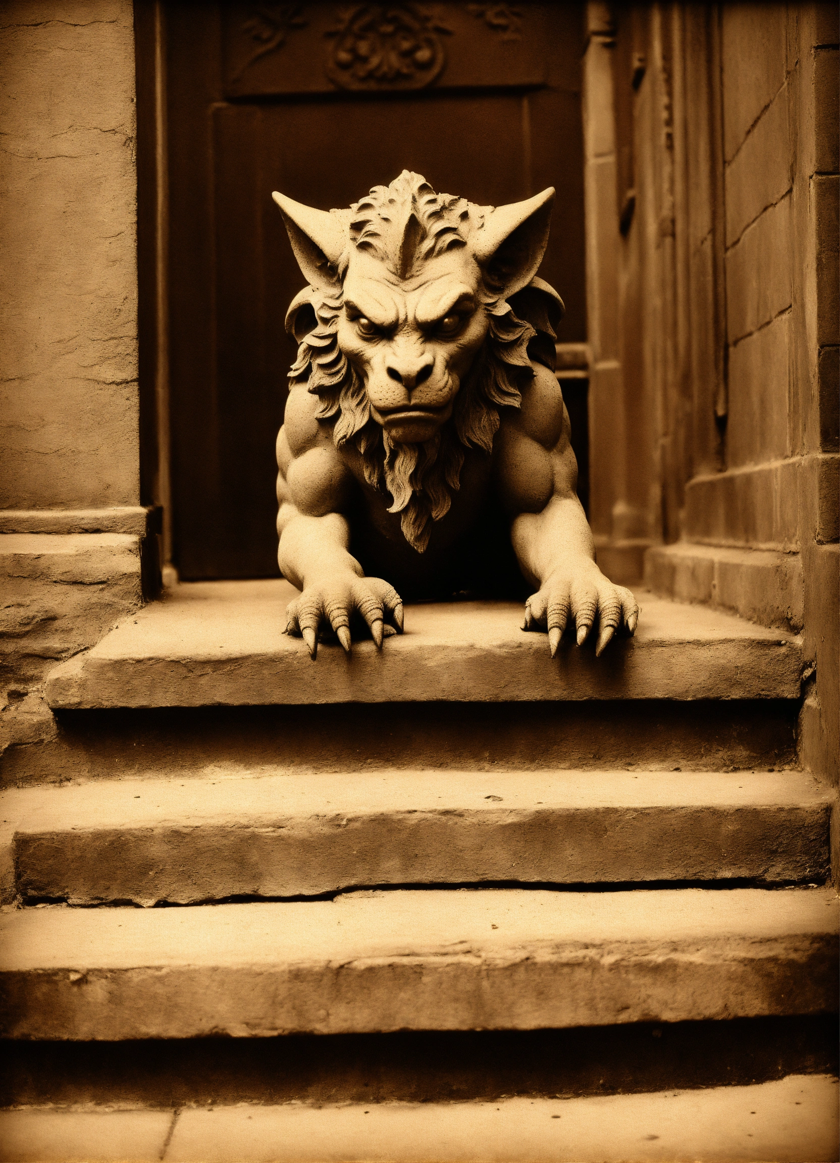 Vintage 1800s photo of a gargoyle sitting on steps, facing a dark wall, in the style of manticore, sepia tone, 19th century american art, fantastical street, goblin academia, associated press photo, east village art