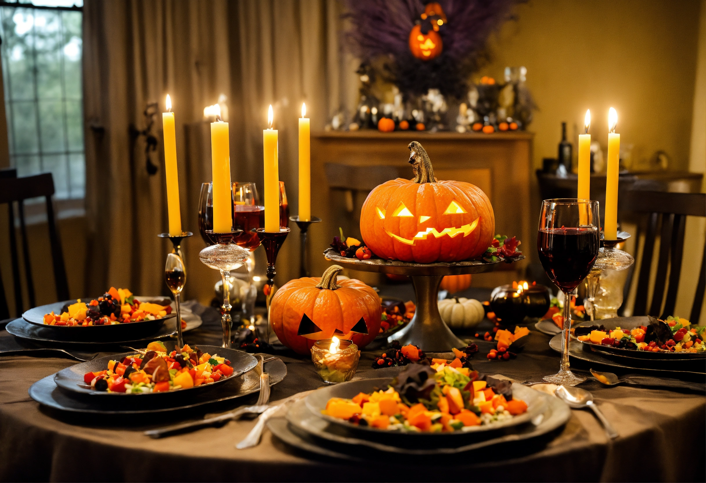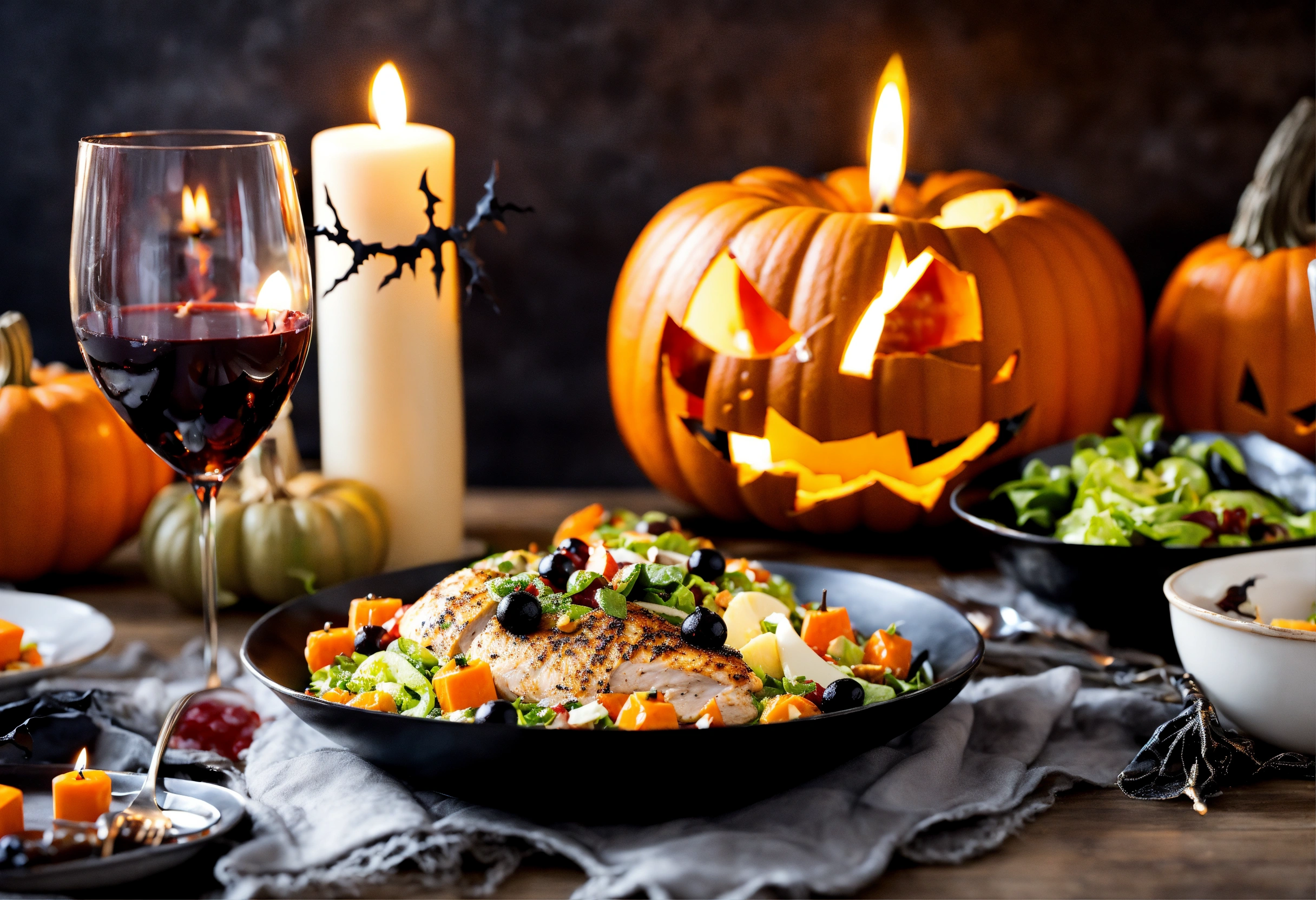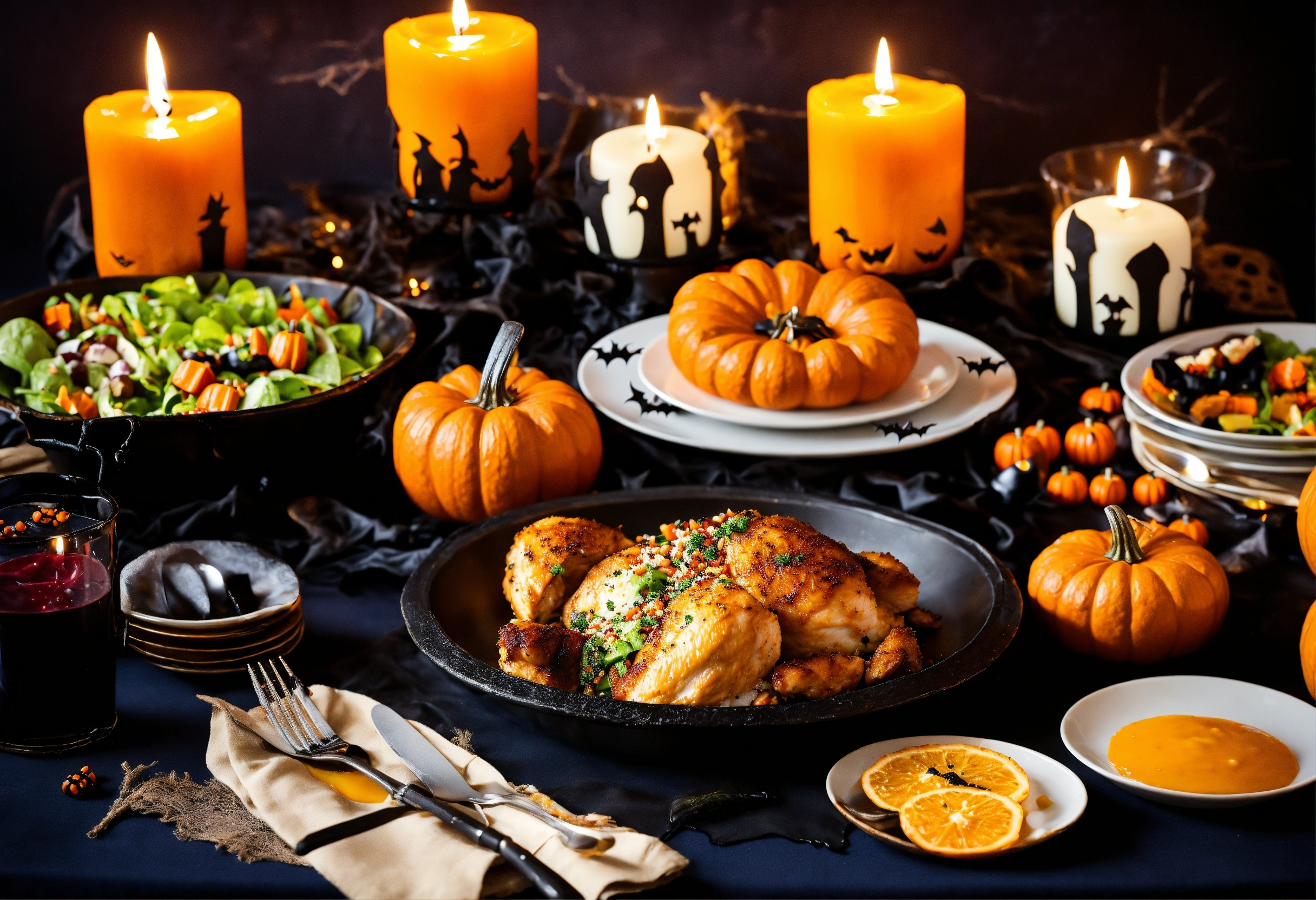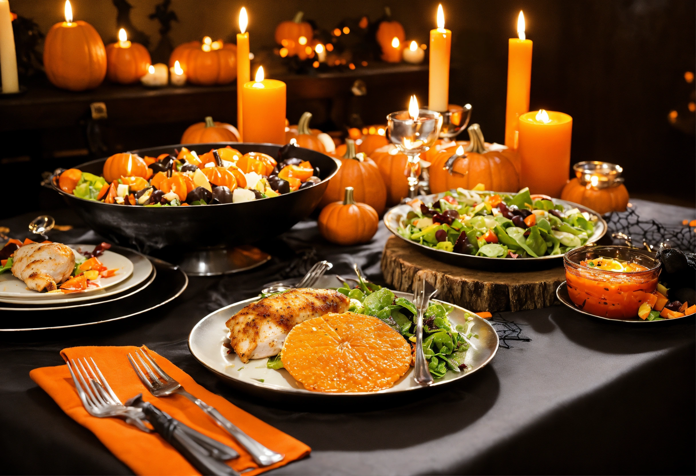 Halloween theme food, breakfast, food, chicken, salads, wine, silverware, fancy drinks, with halloween theme candles
