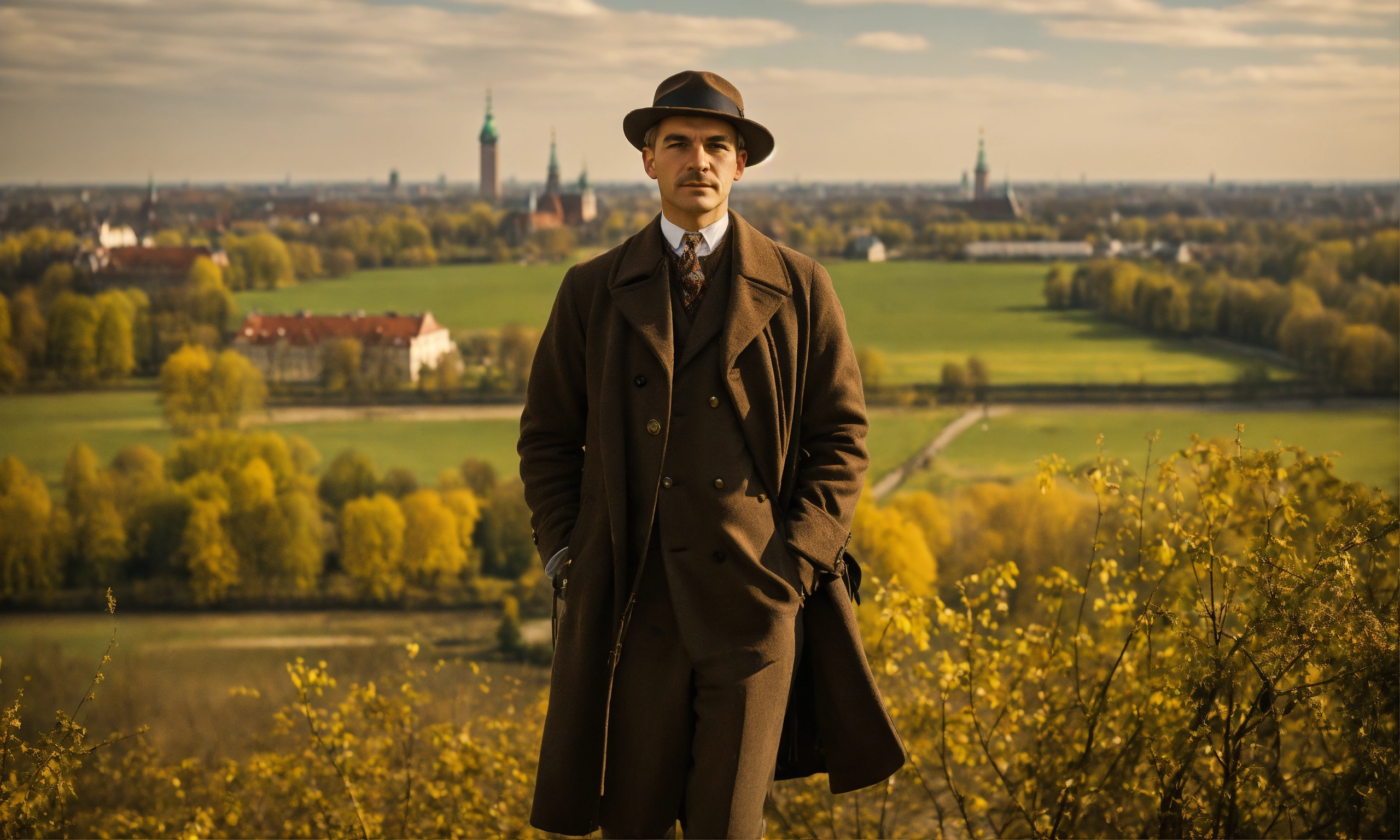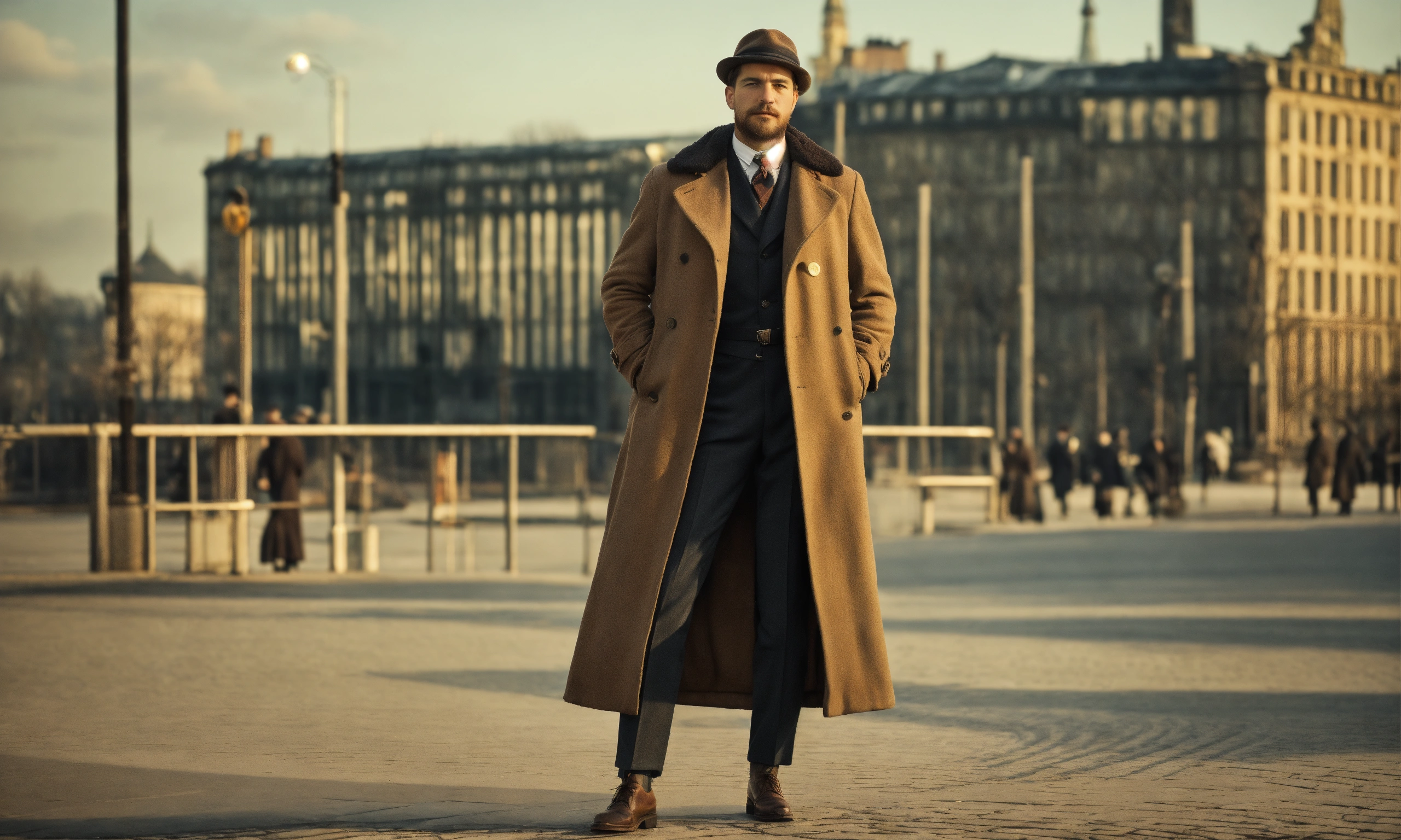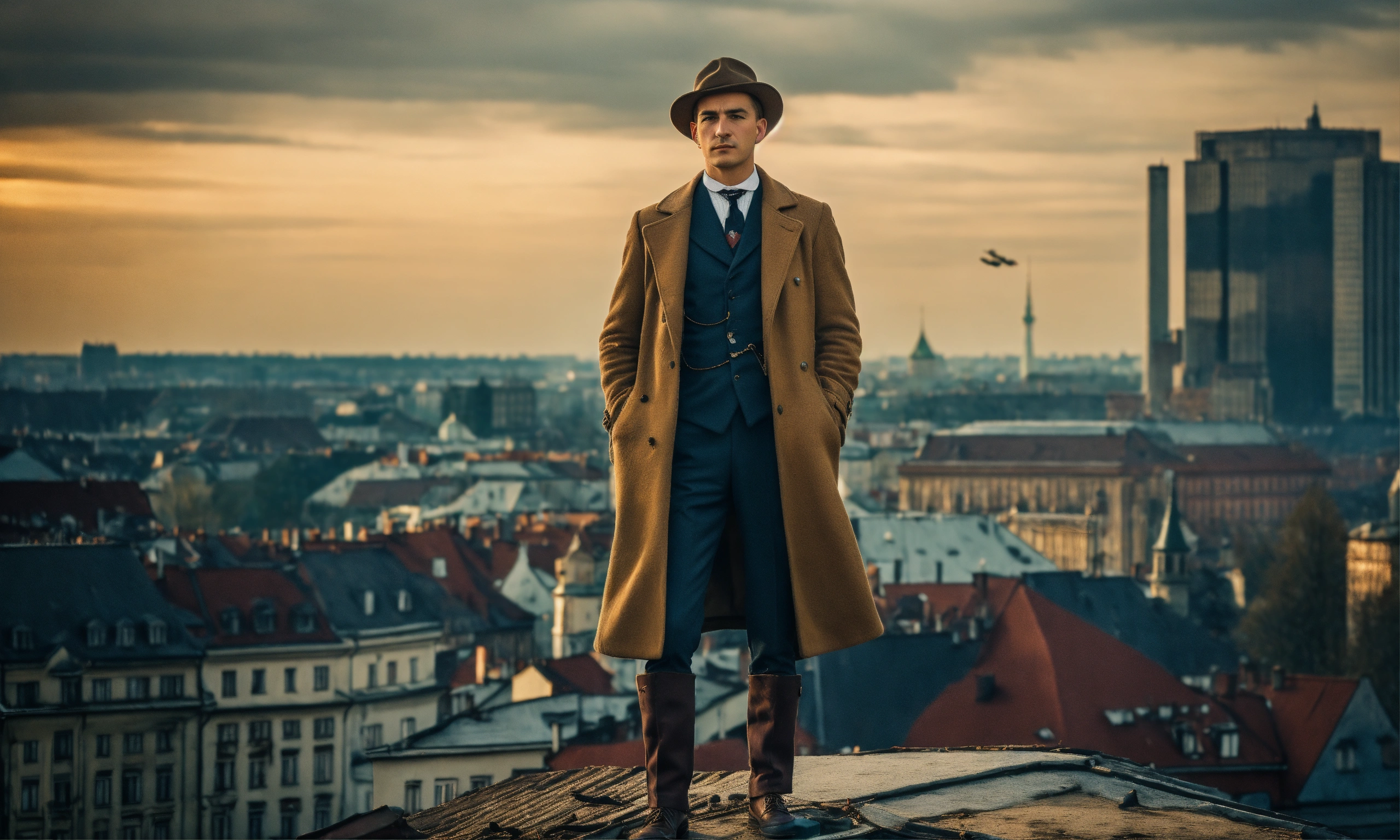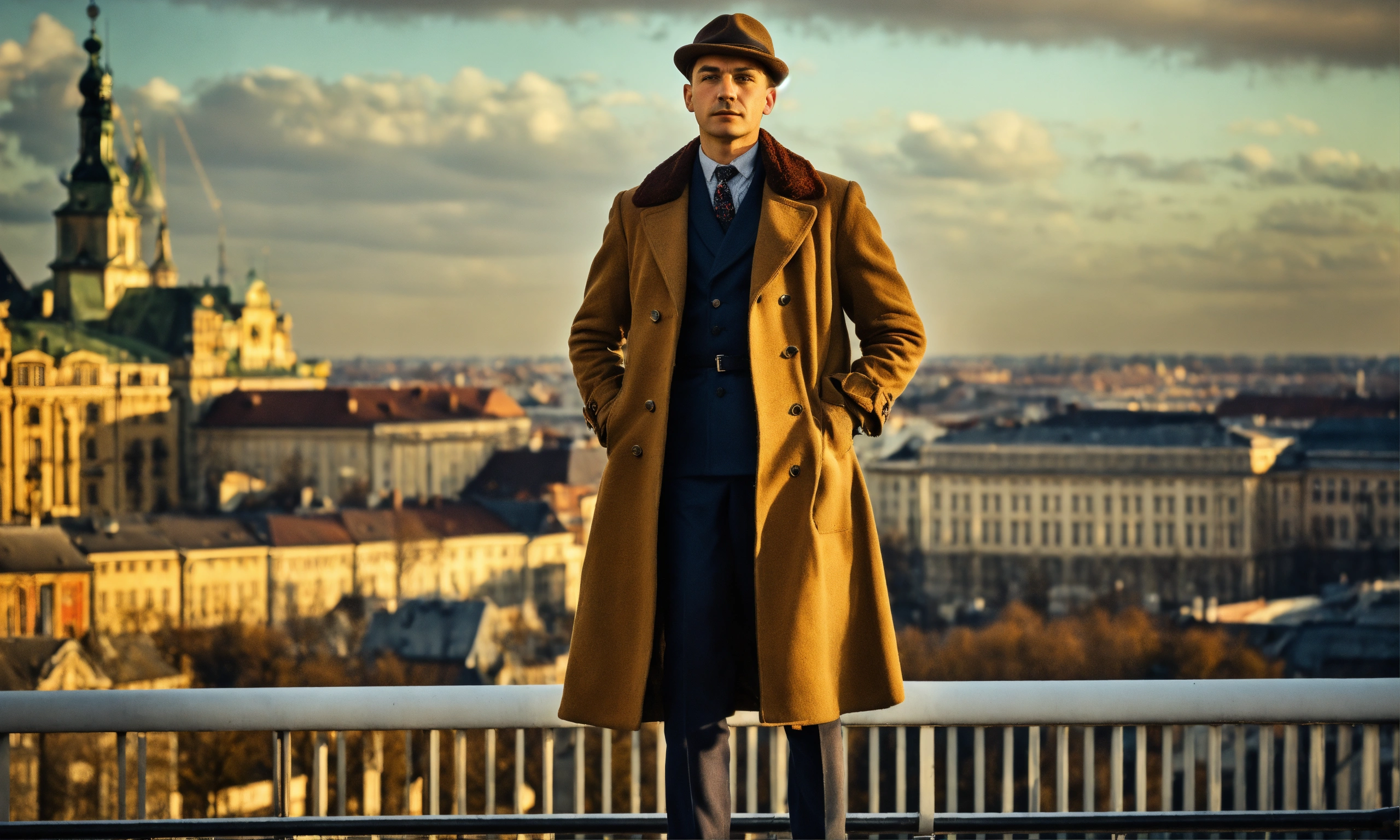 Full height retro man, retro warszawa 1920-1930, man, on top of a rievier, looks at the camera at full height, retro style, .focus in face.retro style clothing long coat. focus on gis face