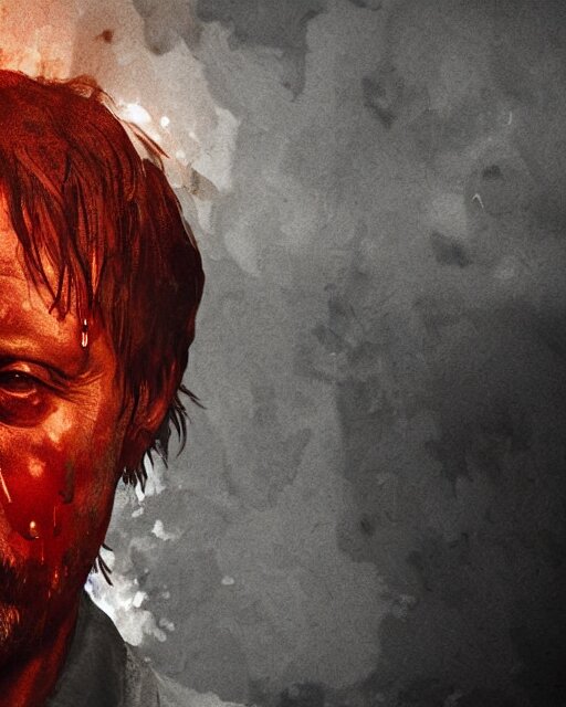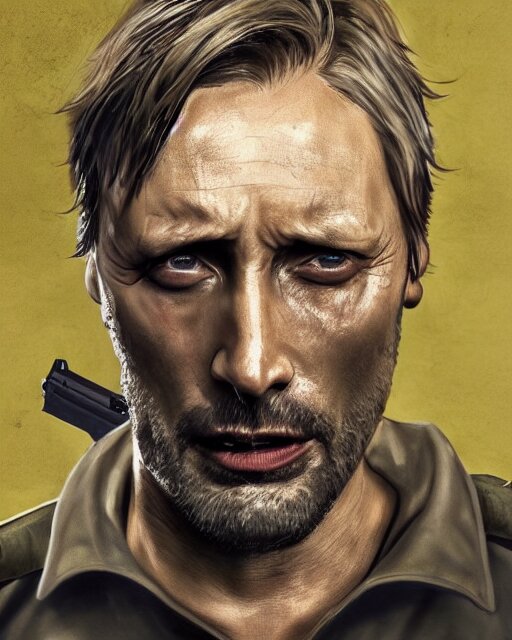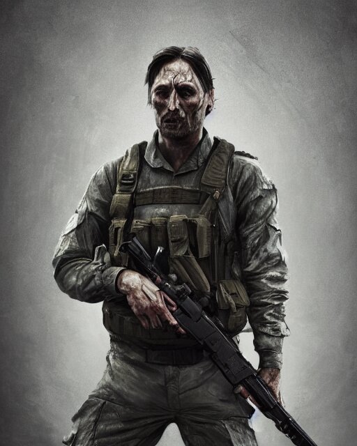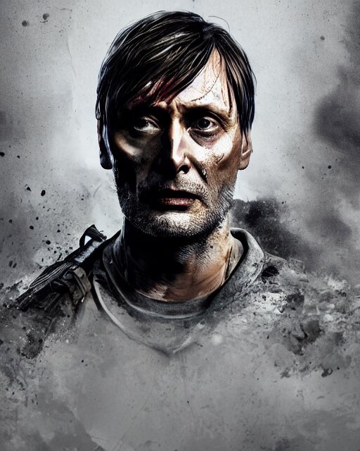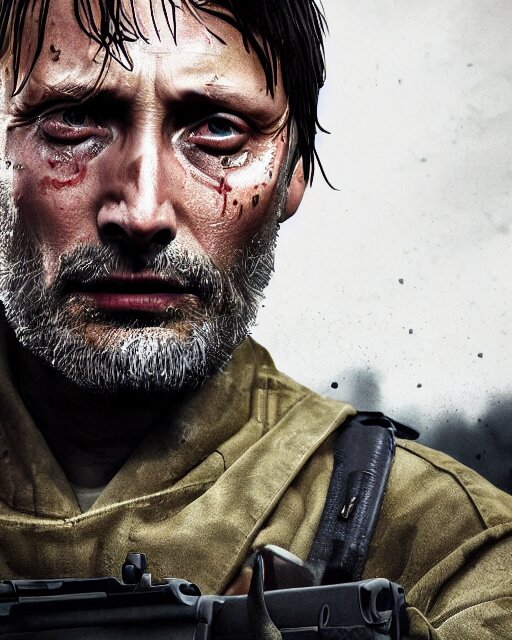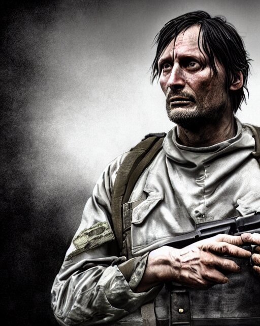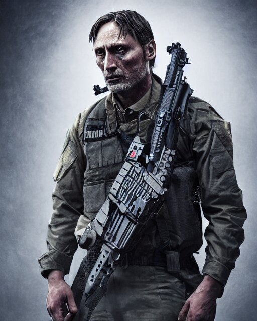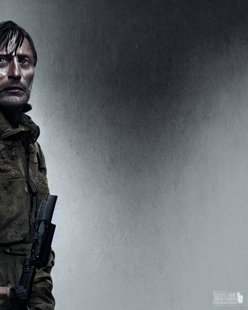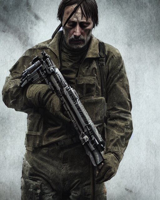 Mads mikkelson as clifford unger from death stranding wearing modern military fatigues, wielding assault rifle, weeping tears of tar, mysterious portrait, cinematic lighting, black background, digital painting photoshop, ultra detailed hdr 8 k