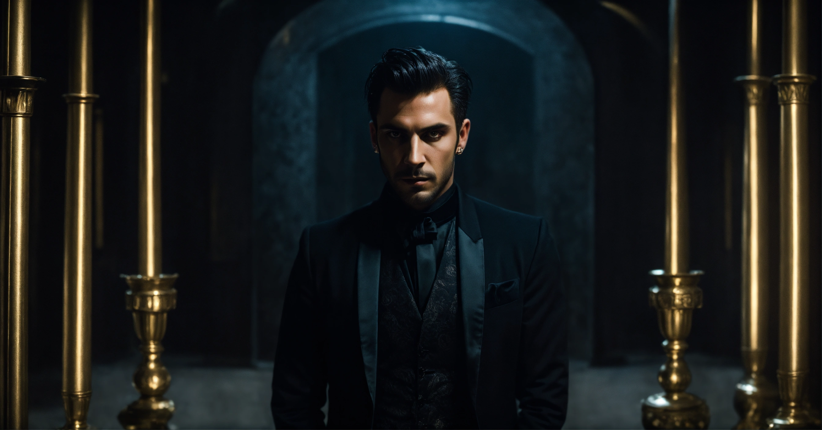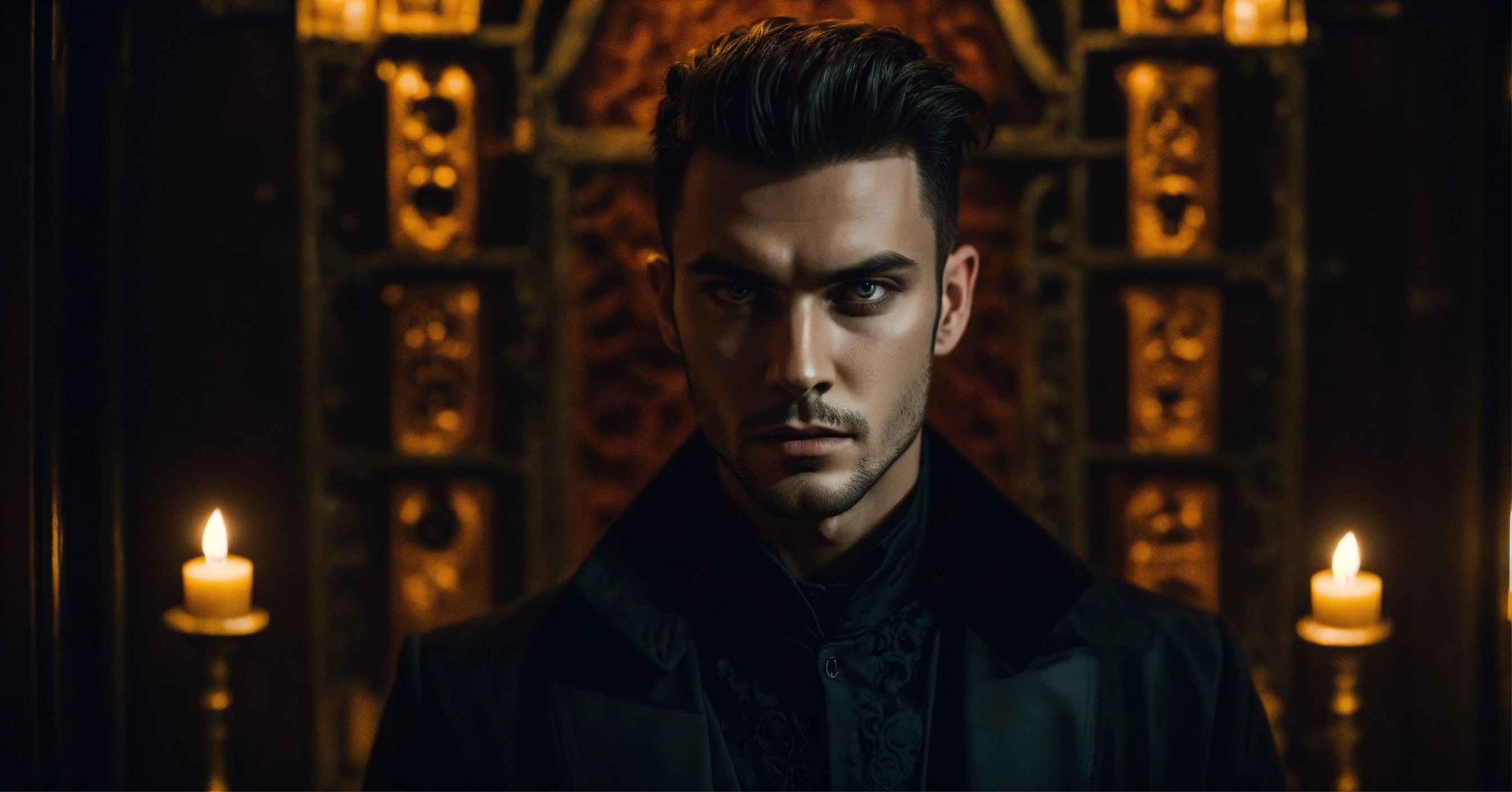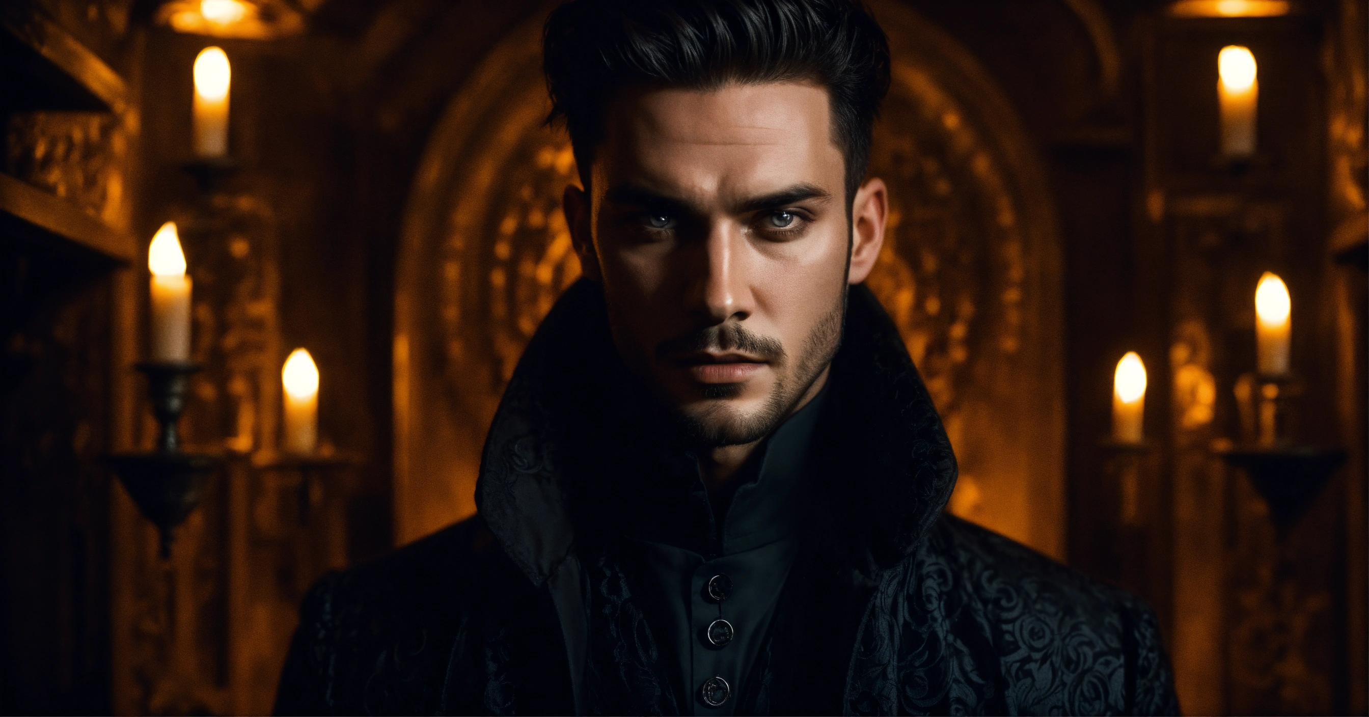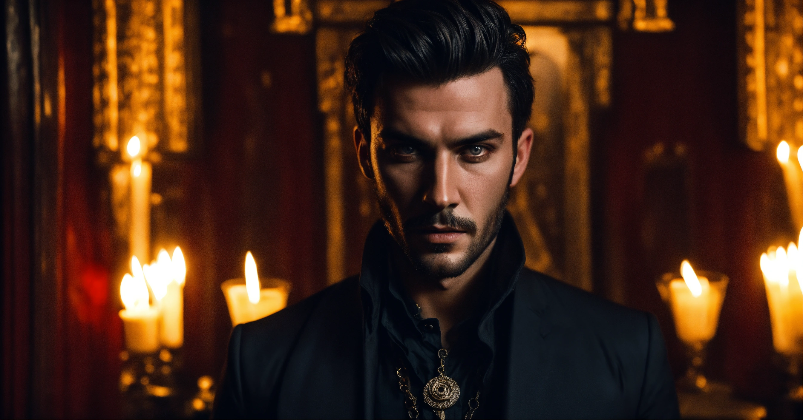 Dark and dramatic portrait of a young and handsome sinister hypnotist with mesmerising eyes, dressed in mysterious dark clothes in a secret occult chamber.