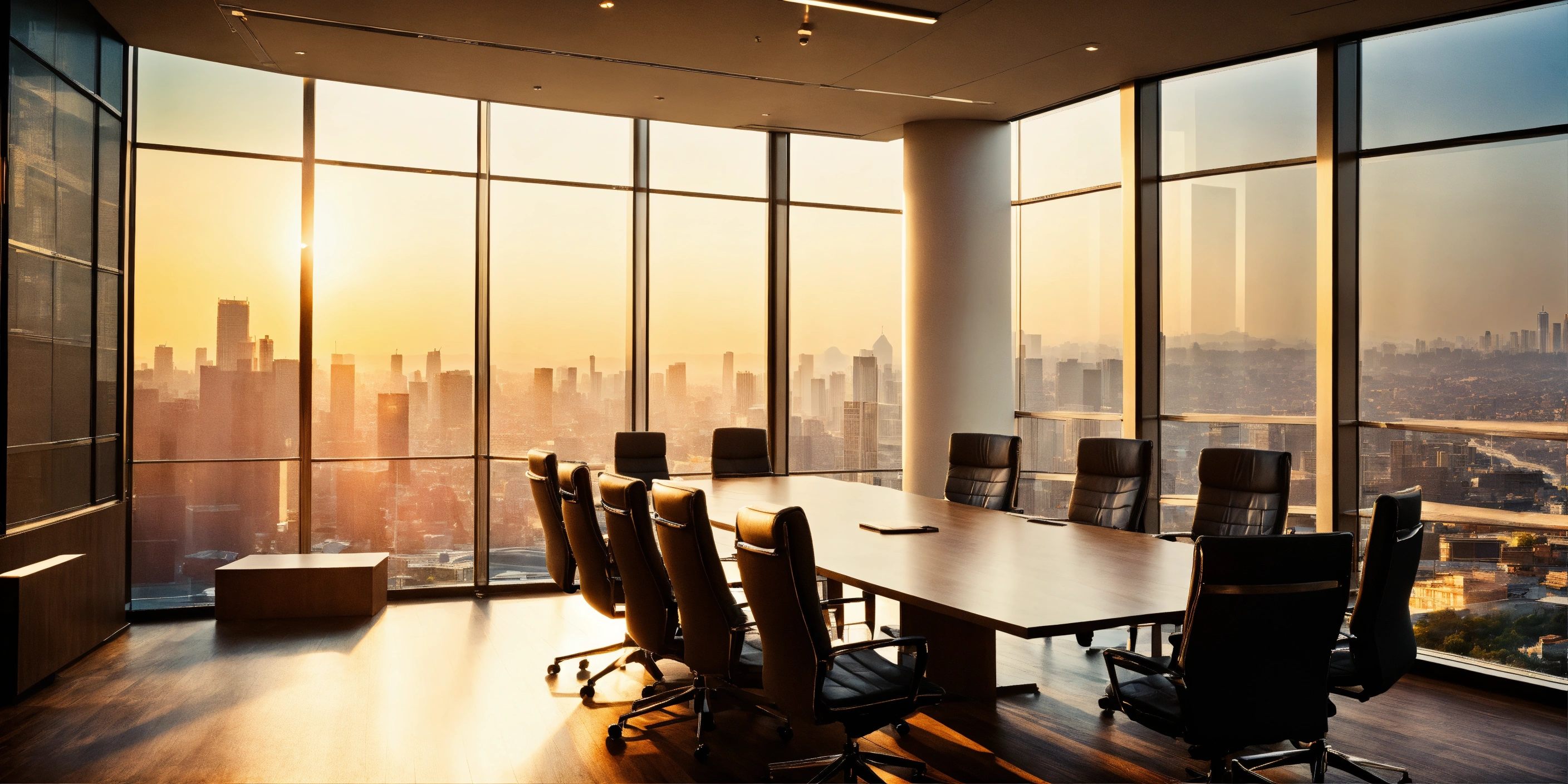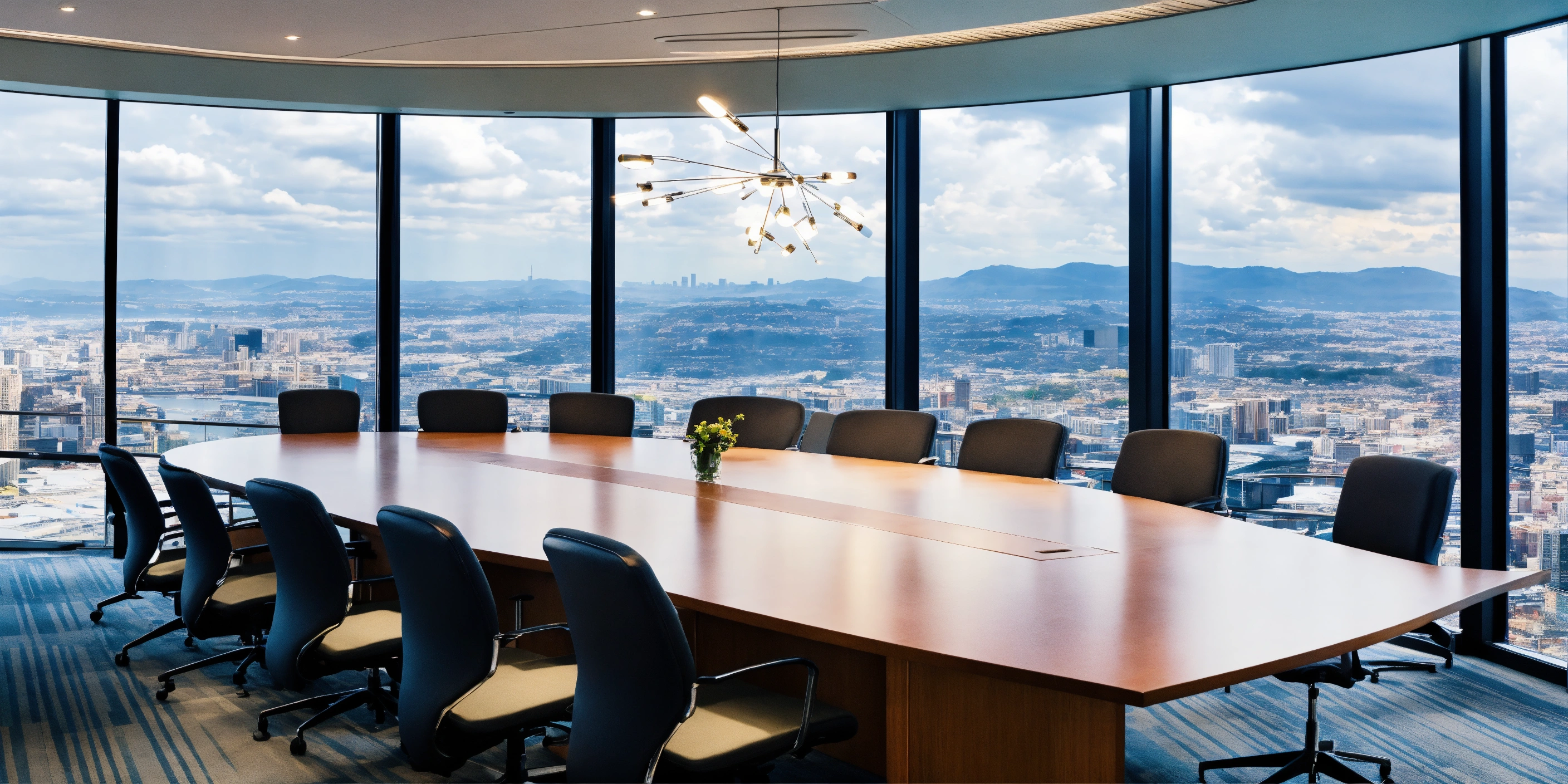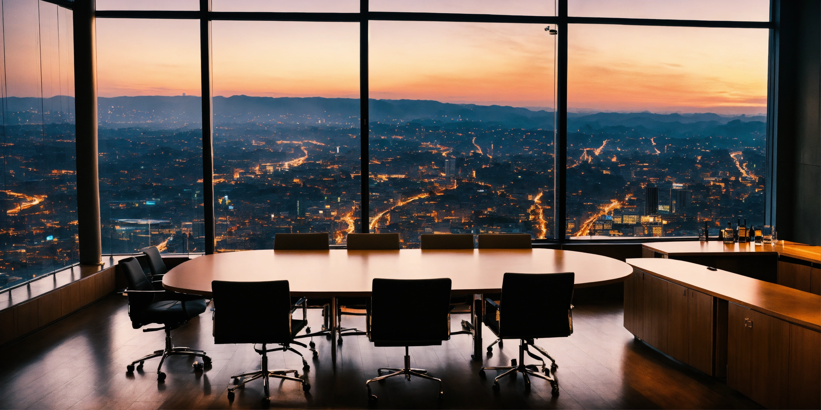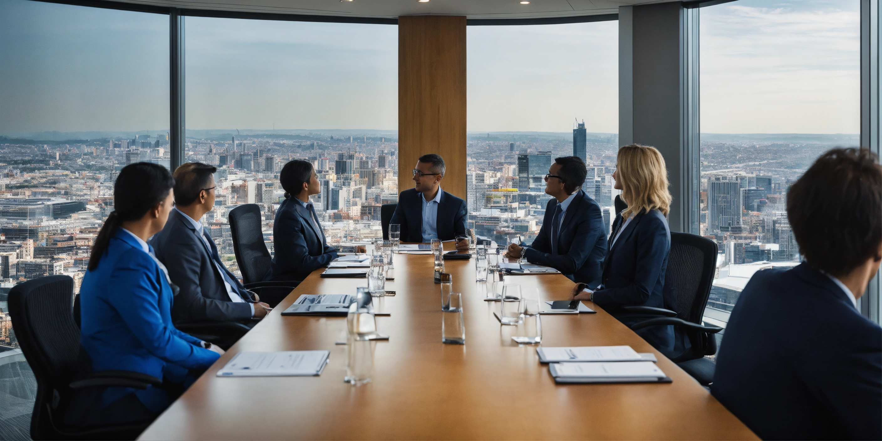 A meeting in a board room with a beautiful panoramic view of a city below