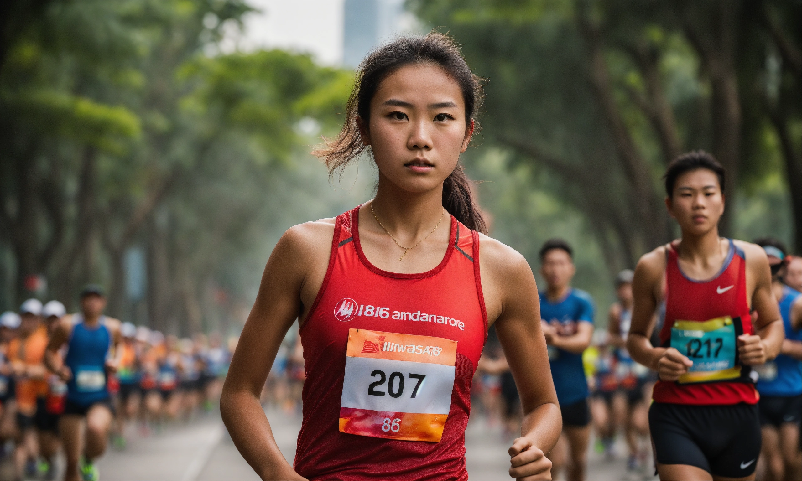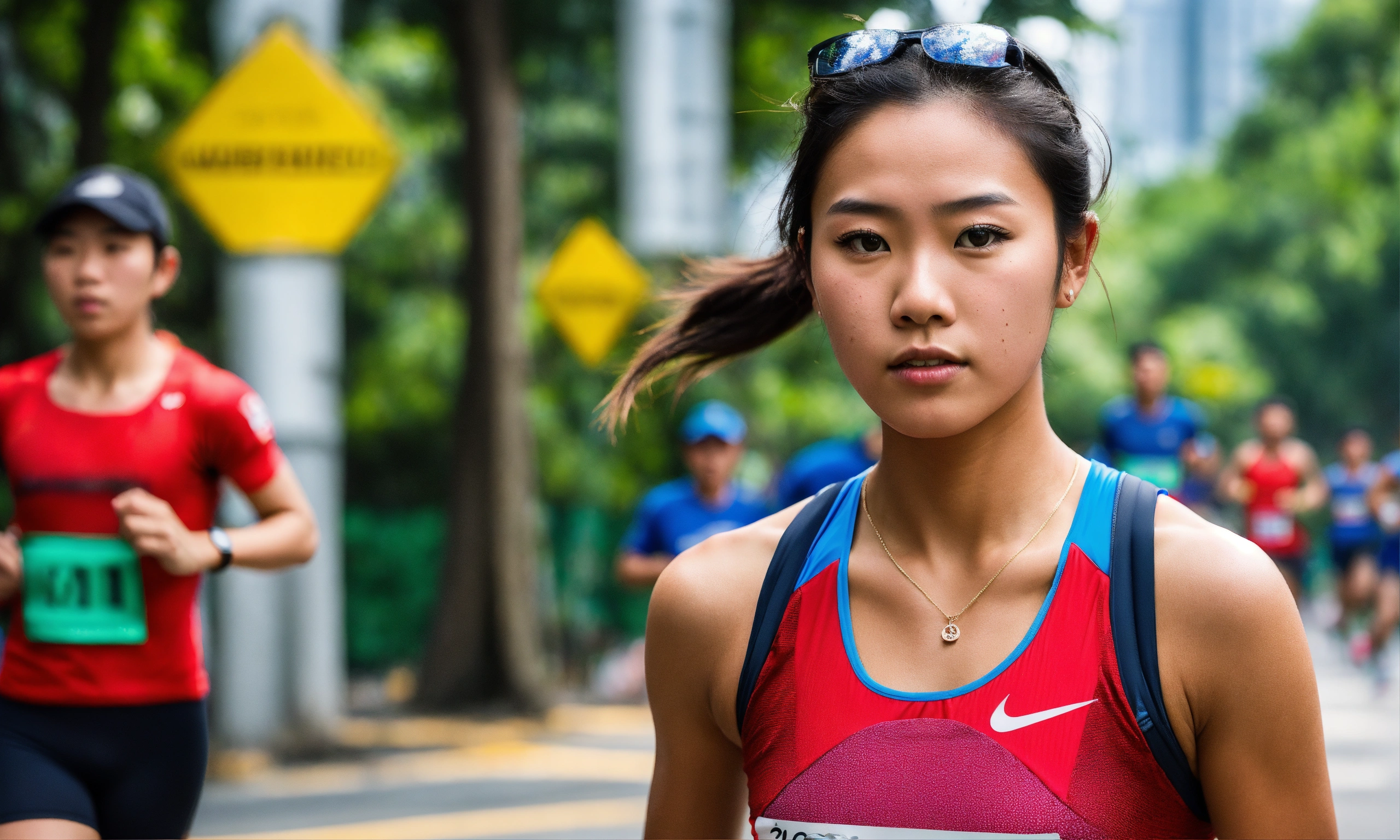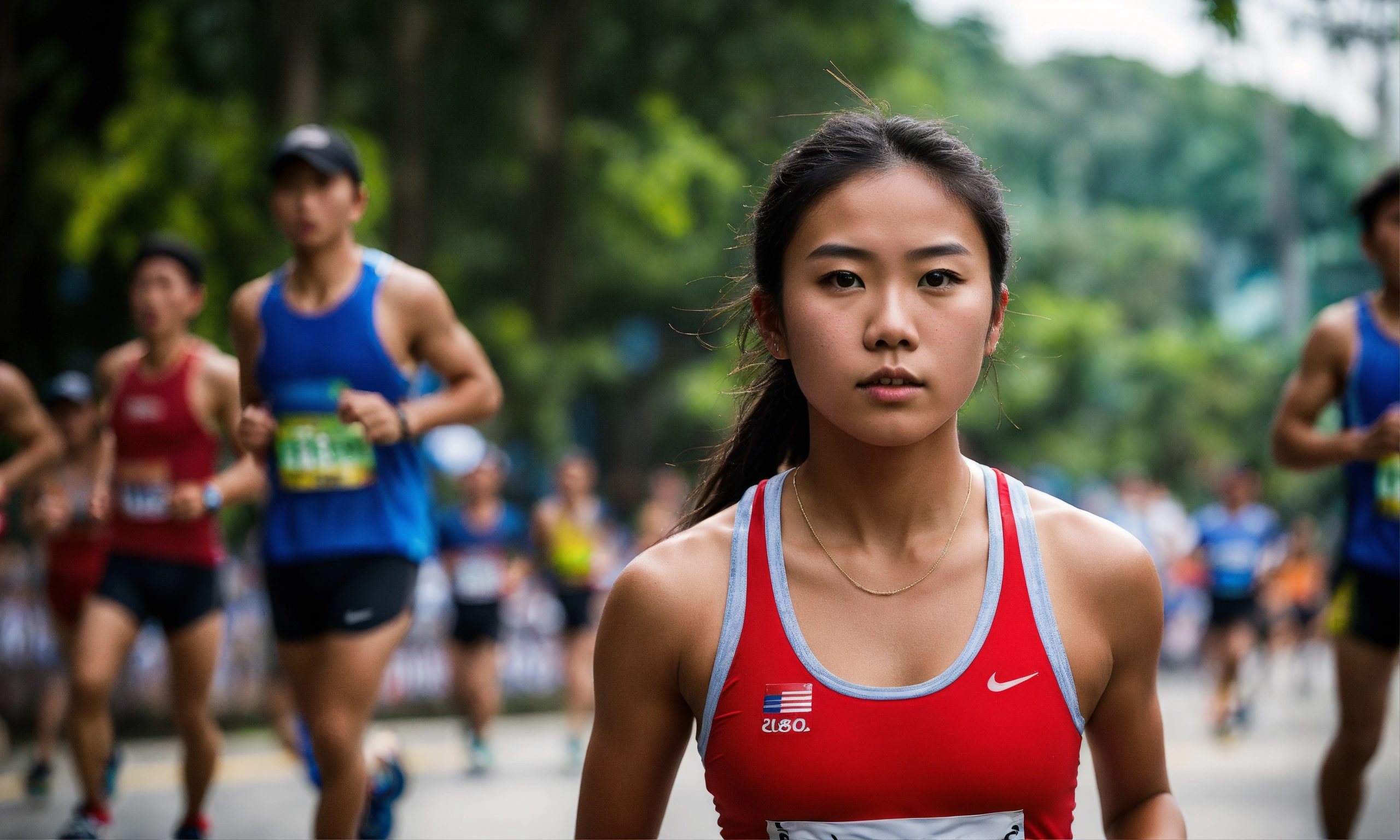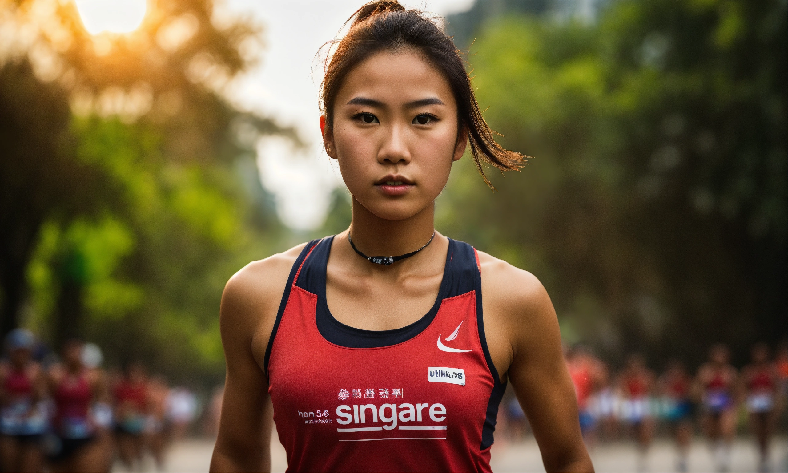 Mid-day at a world marathon event in singapore, ultra close-up frontal shot of an 18-year-old tanned and athletic asian girl, plain red singlet, looks with unwavering determination, her eyes, locked onto the camera, radiate ambition, resilience, and a deep focus, with trees and singapore cityscape in the backdrop, other runners at the back, captured with a nikon d850, 85mm f/1.4 lens, the photograph is given a touch of watercolor rendering for added depth, making her the undeniable centerpiece of the image.