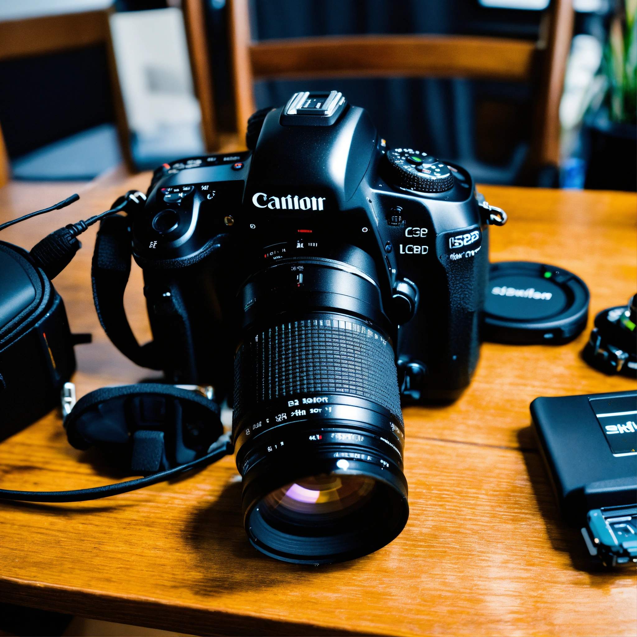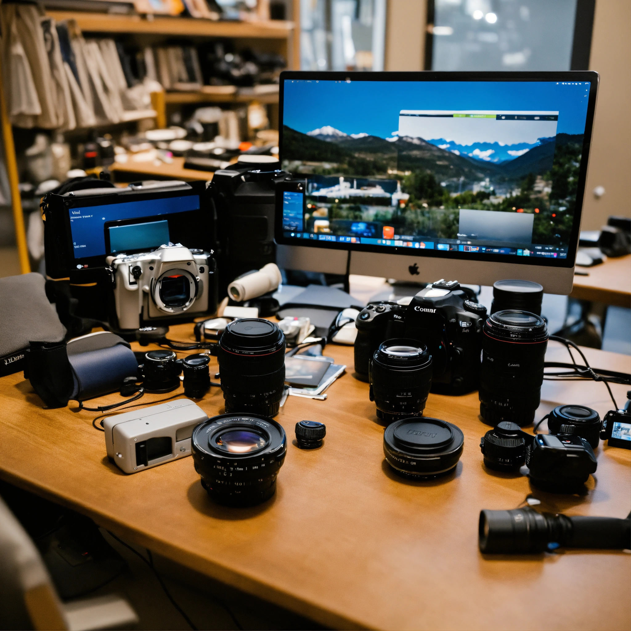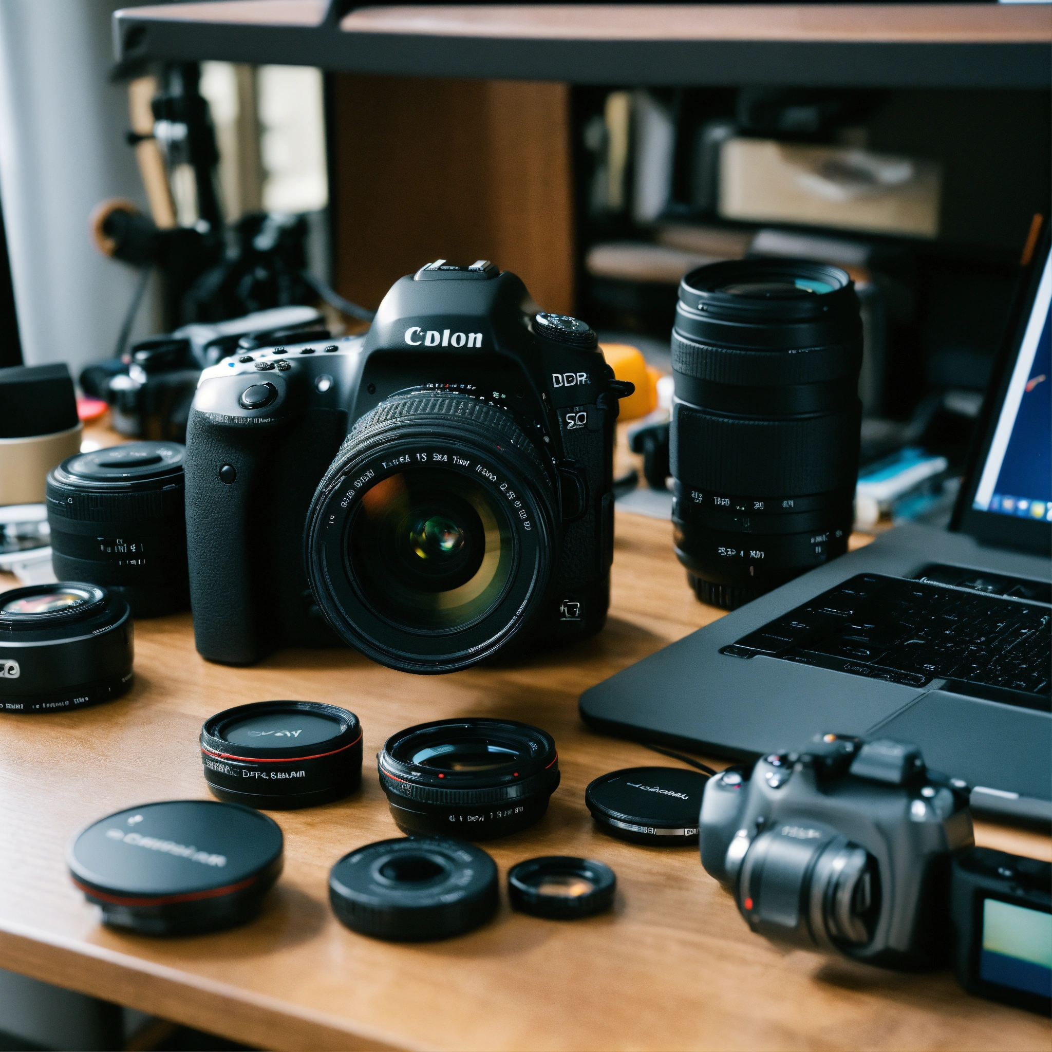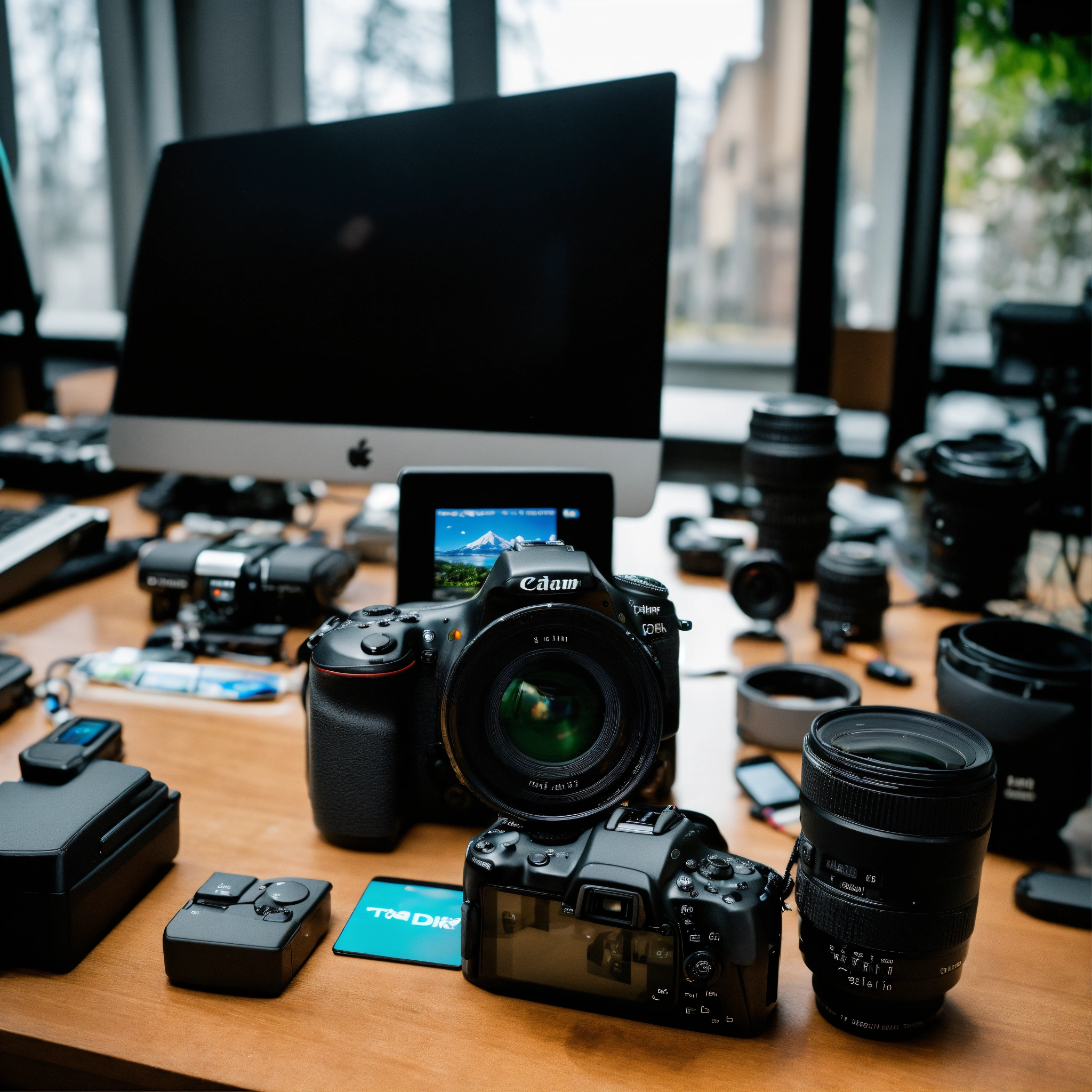 A photo of a dslr camera with a lens attached. the camera is sitting on a table next to a computer monitor. there are several other accessories, including a tripod, batteries, and memory cards, near the camera.