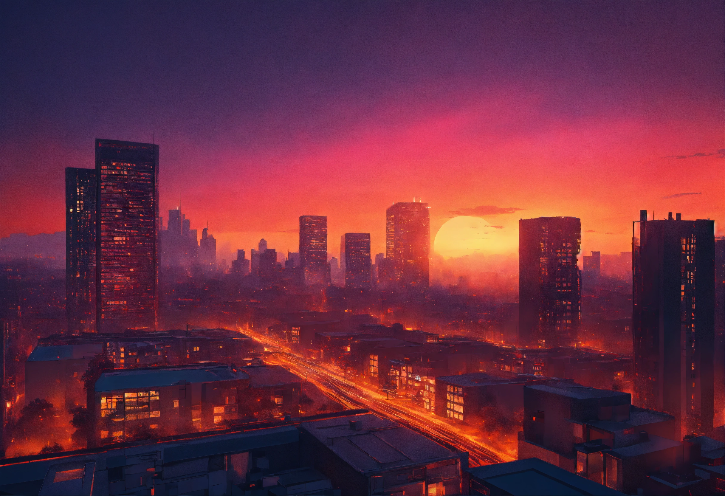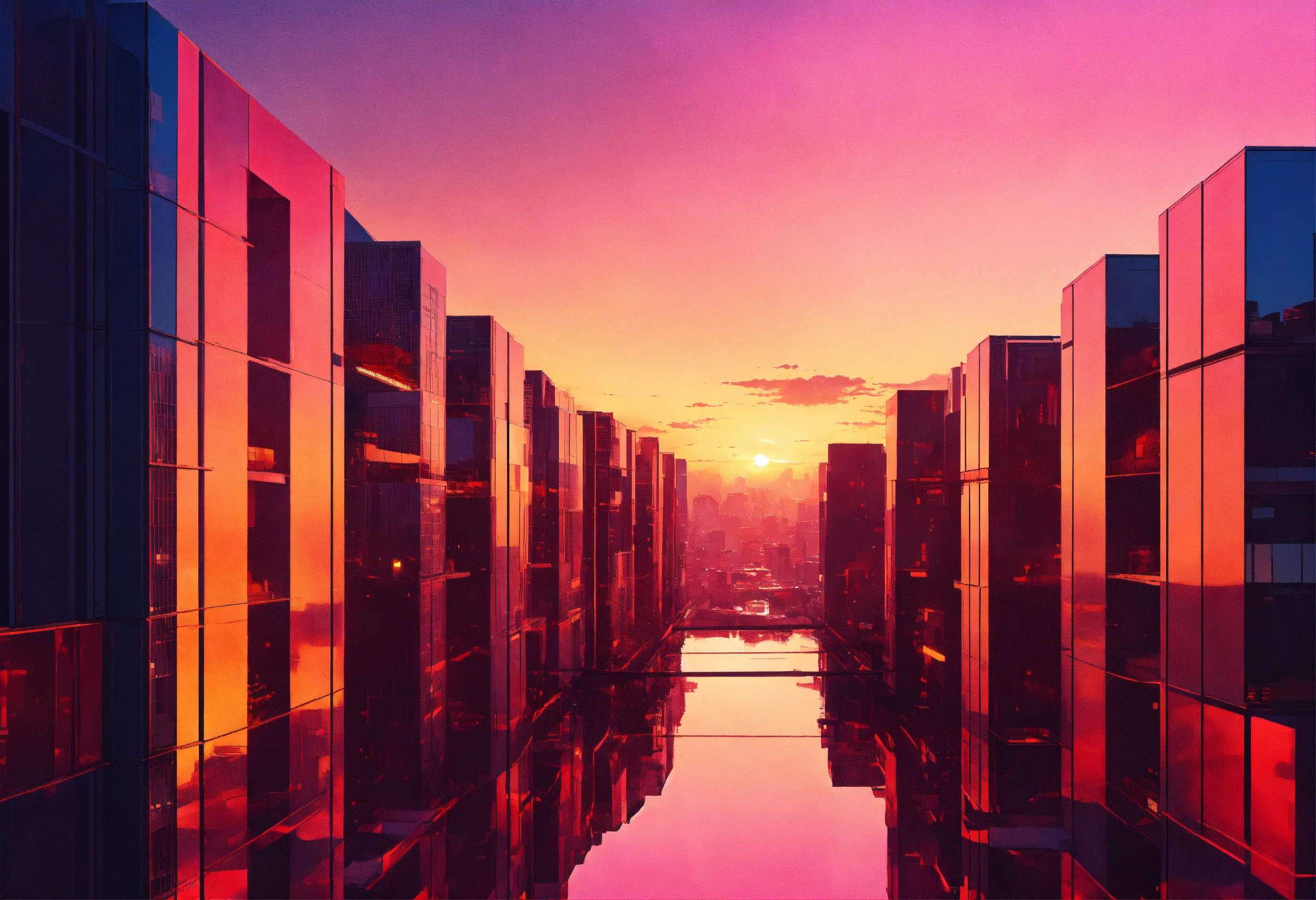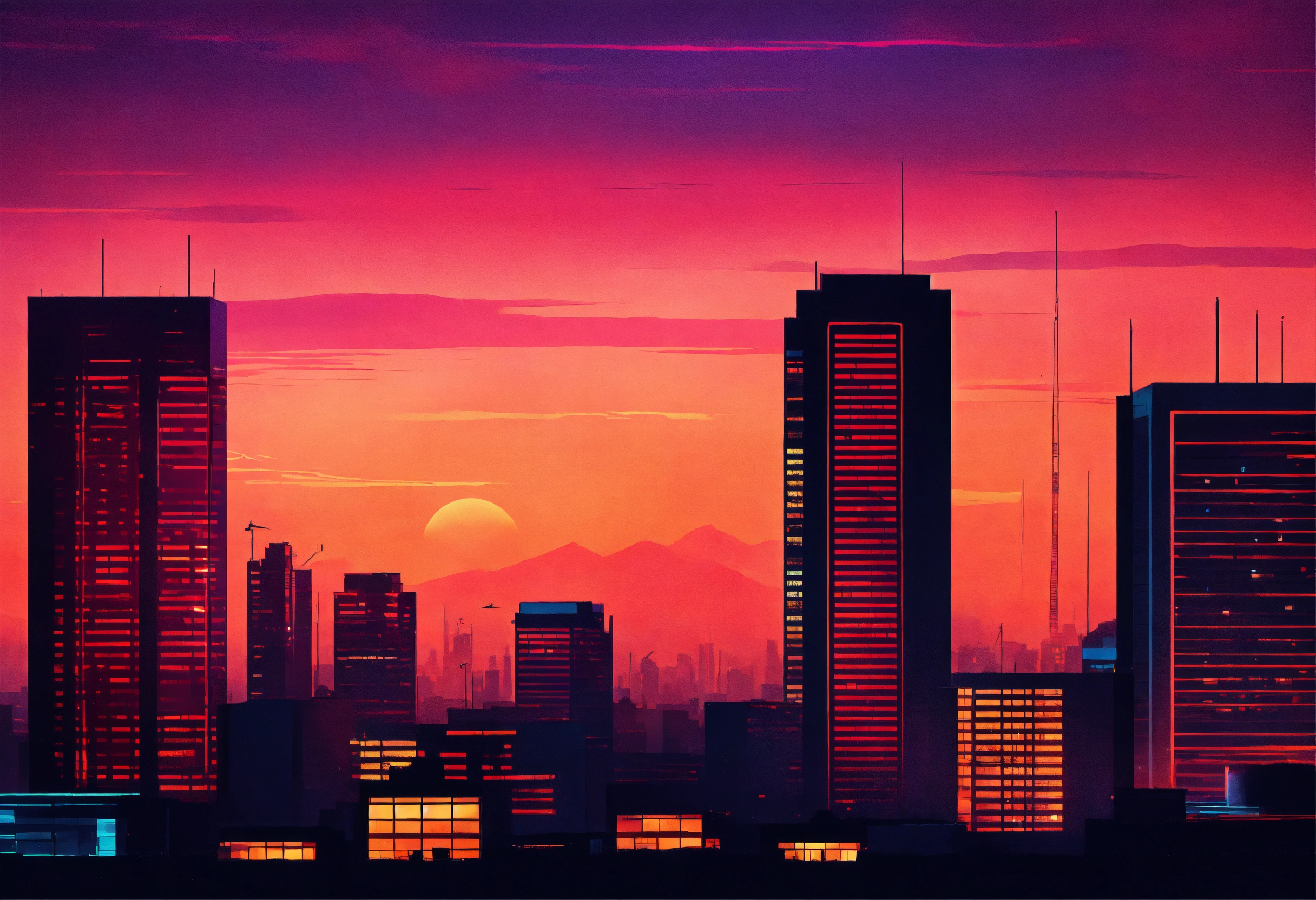 A minimalist cityscape with geometric buildings silhouetted against a vibrant sunset, capturing the essence of urban minimalism. 8k