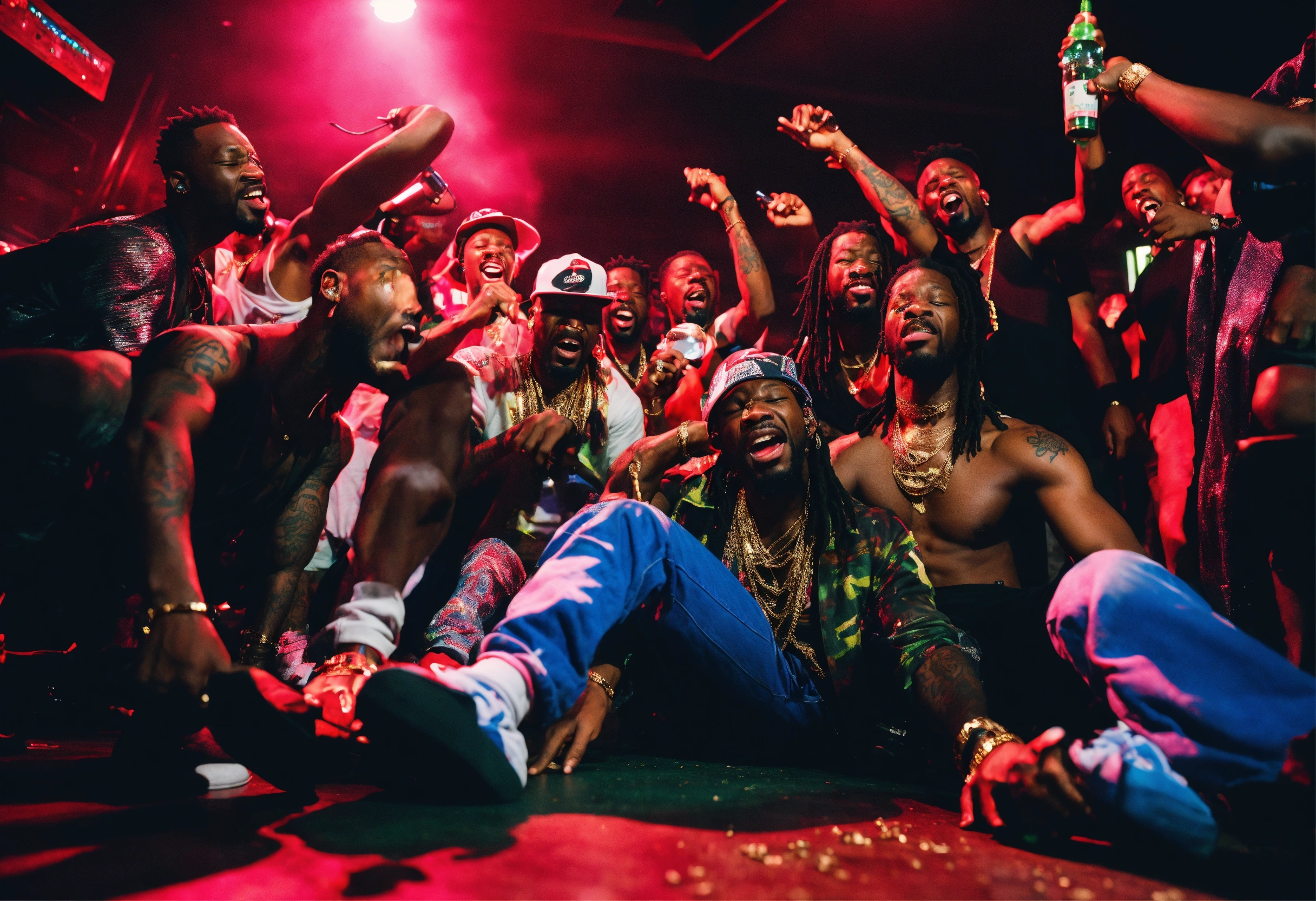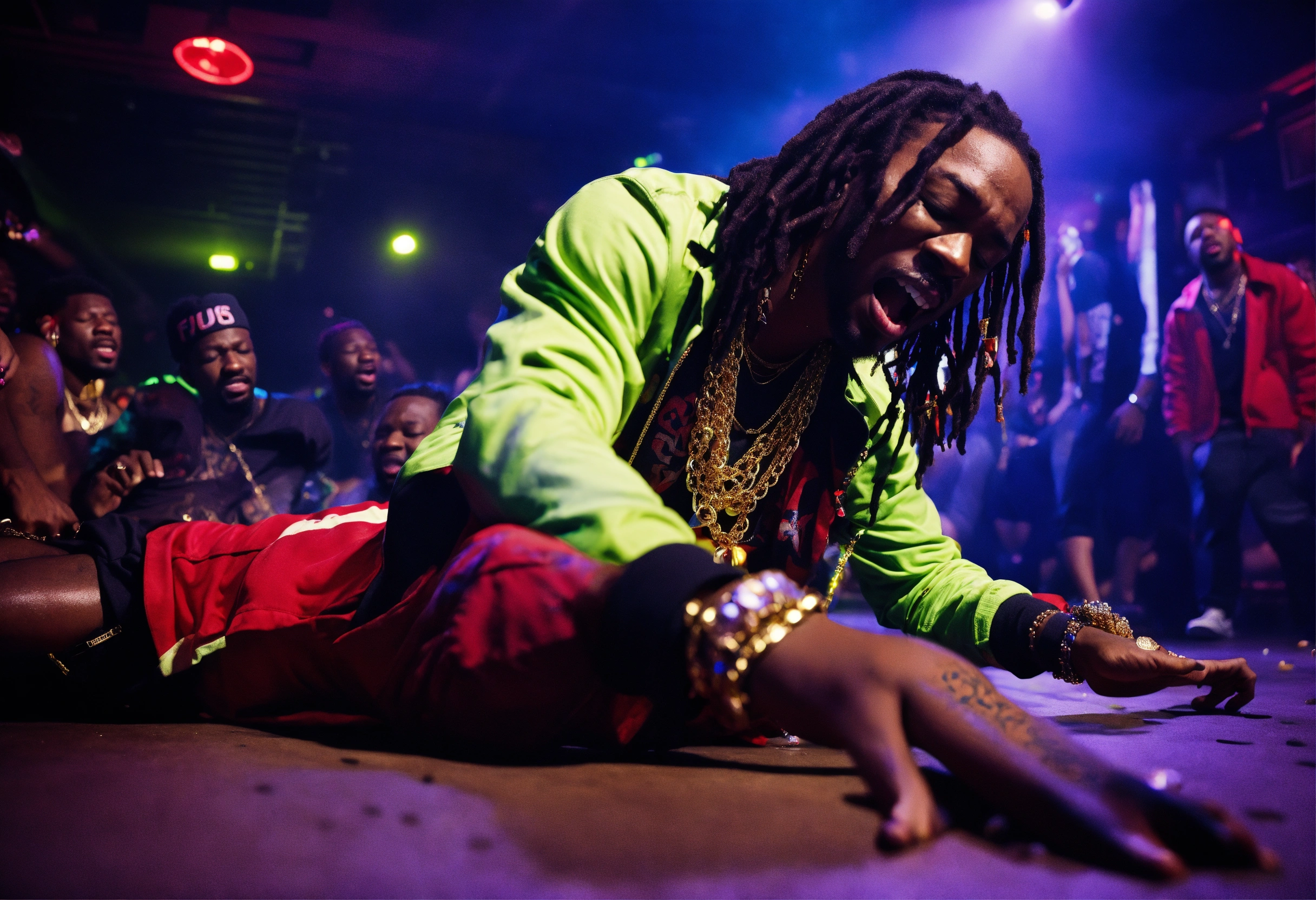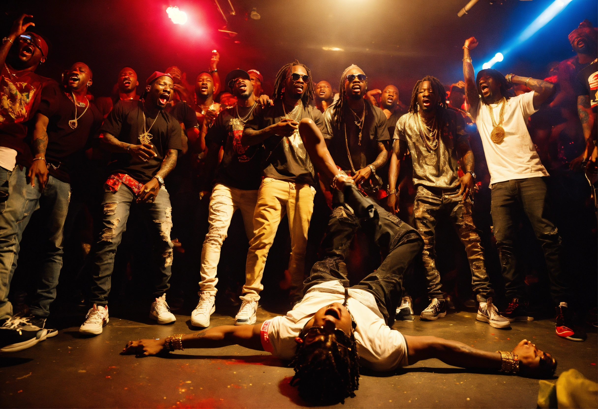 Full body shot rap group lost boyz " freaky tah", laying on the ground of a nightclub eyes closed red water all over his clothes in a nightclub in south jamaica, queens on 134th blvd. in rochdale new york people cheering in the background screaming, epic details 8k, super high quality, tattoo, gold neckless, canon eos 5d, burst out screaming, background.