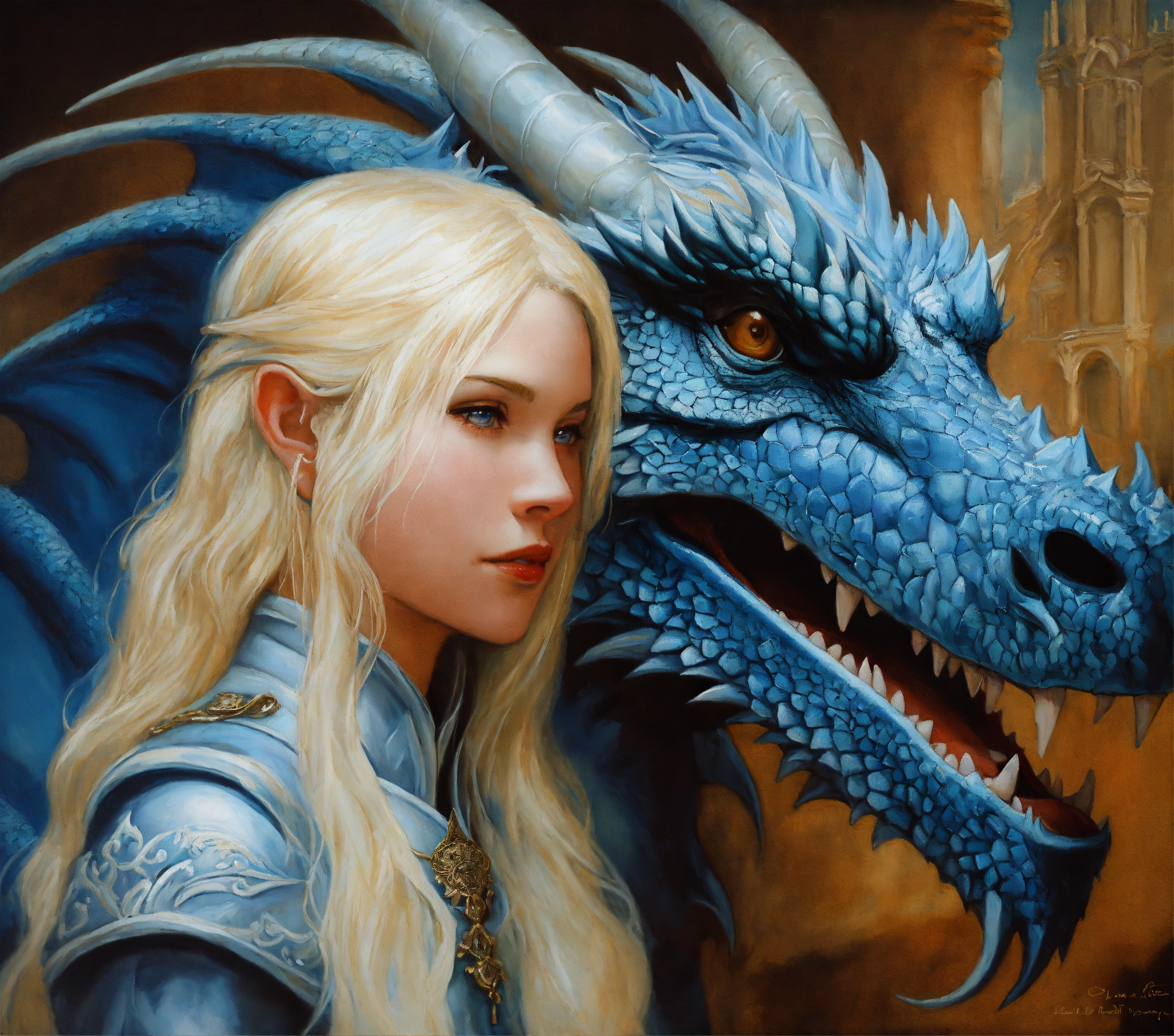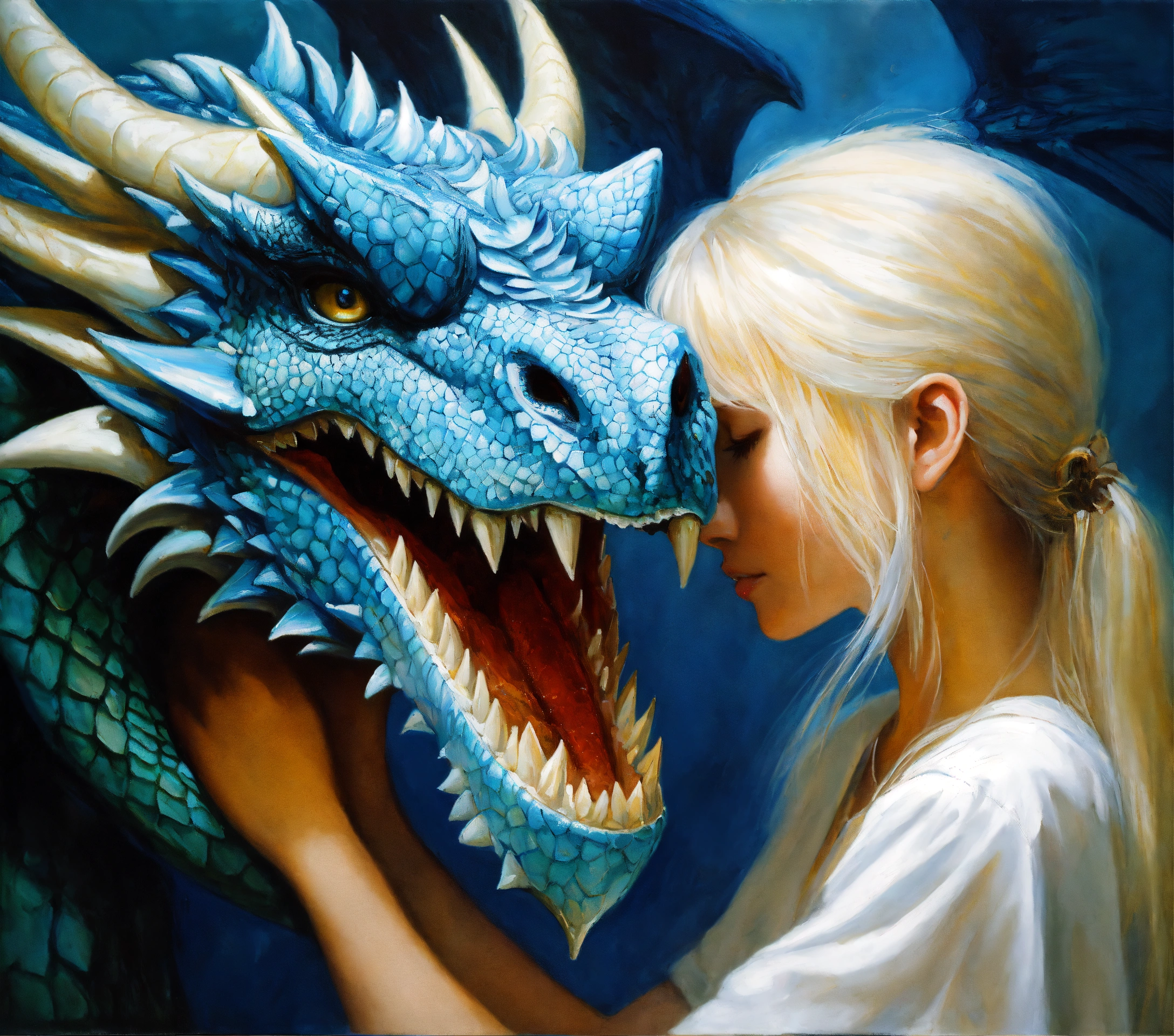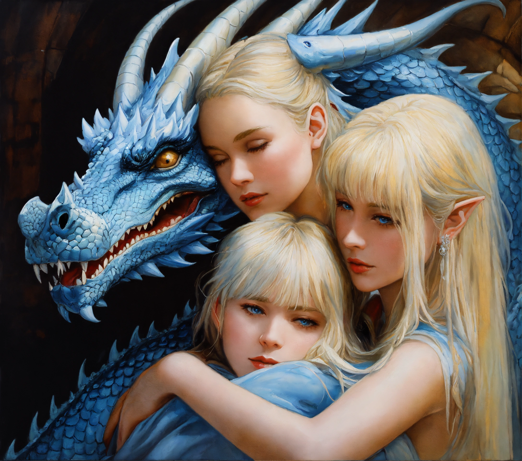 Oil painting of a huge, magnificent two meter big blue dragon head with a 15 year old white blonde elf girl lovingly hugging the dragon head, the dragon's head is as big as the entire girl, ultra detailled, ultra realistic, in the style of luis royo