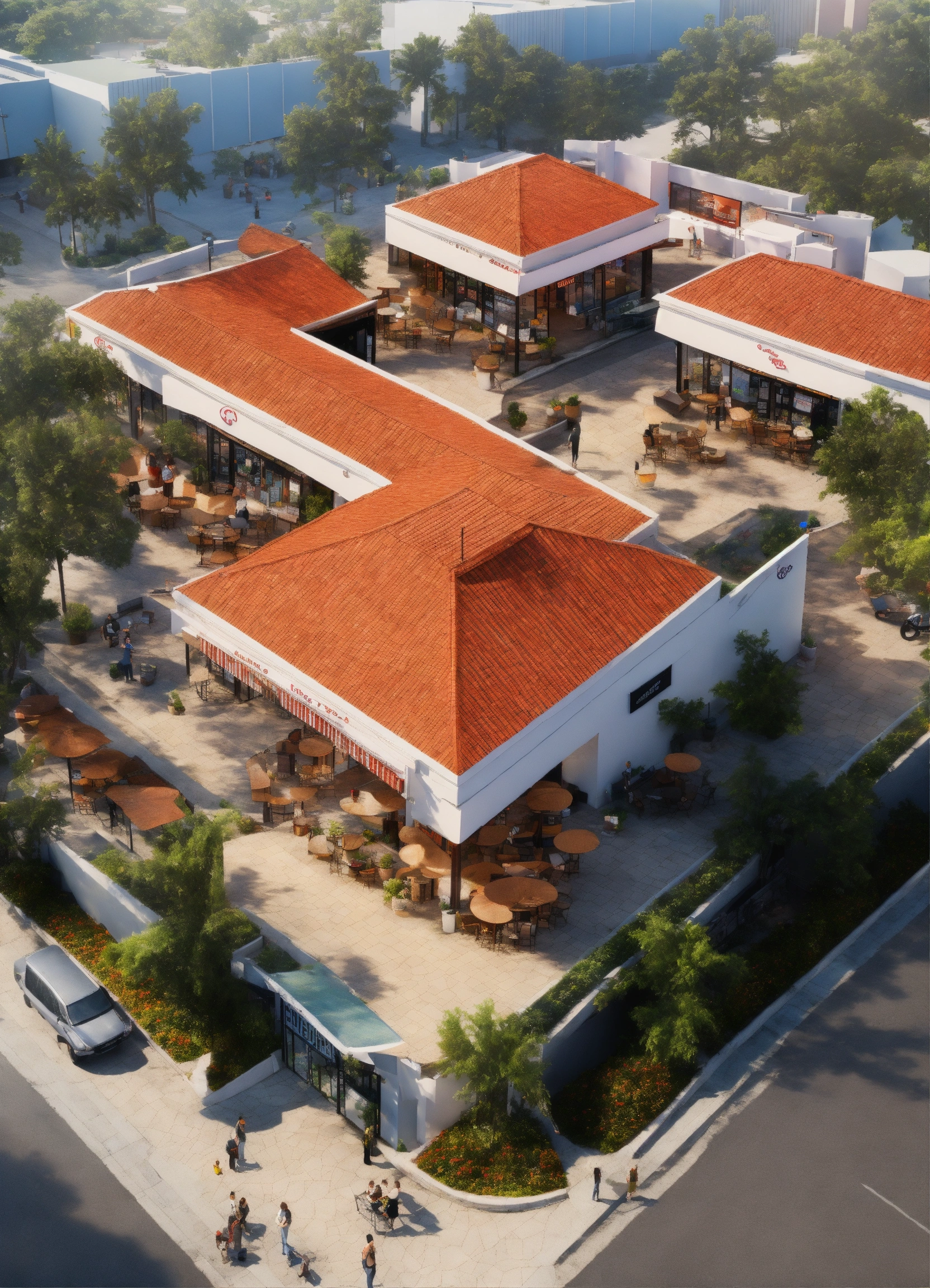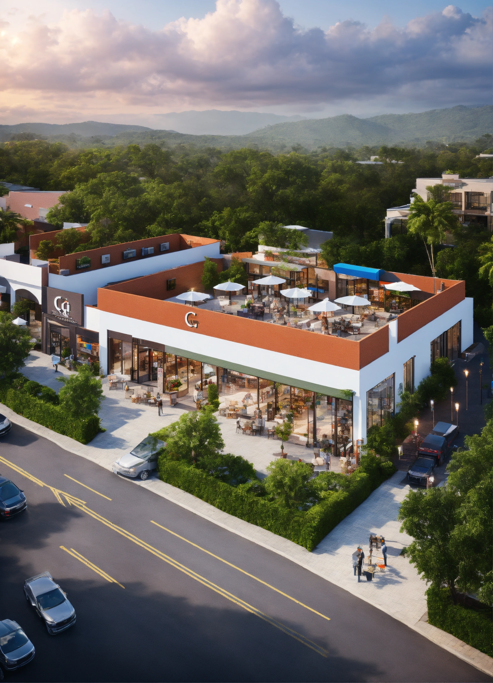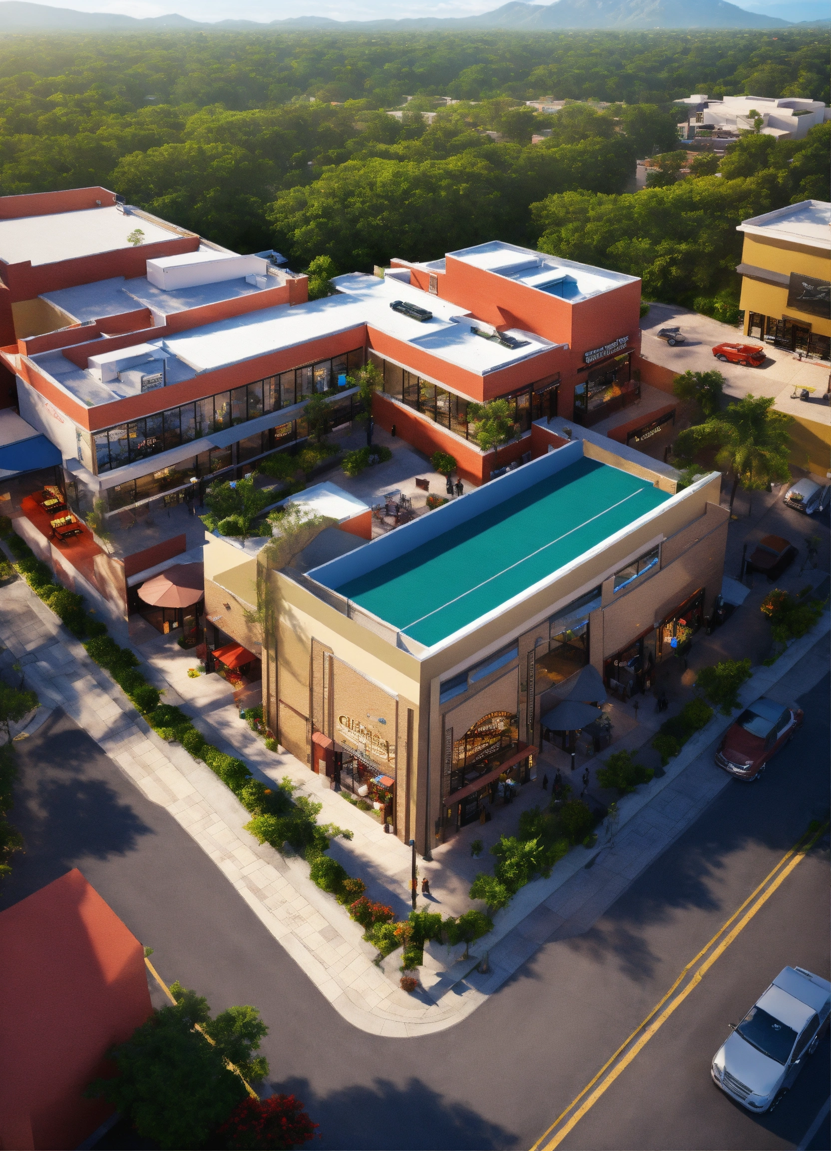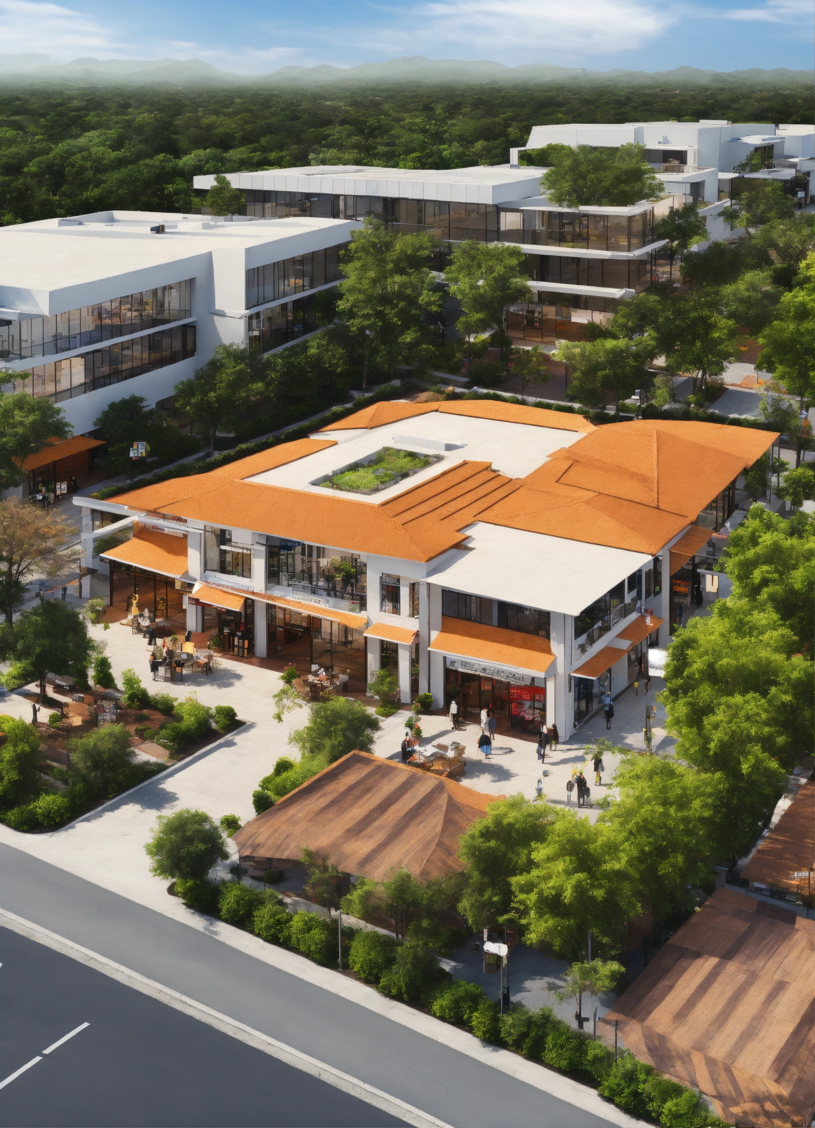 2 acre retail plaza with through road colonial architecture with roof top cafes and g+2 aerial view