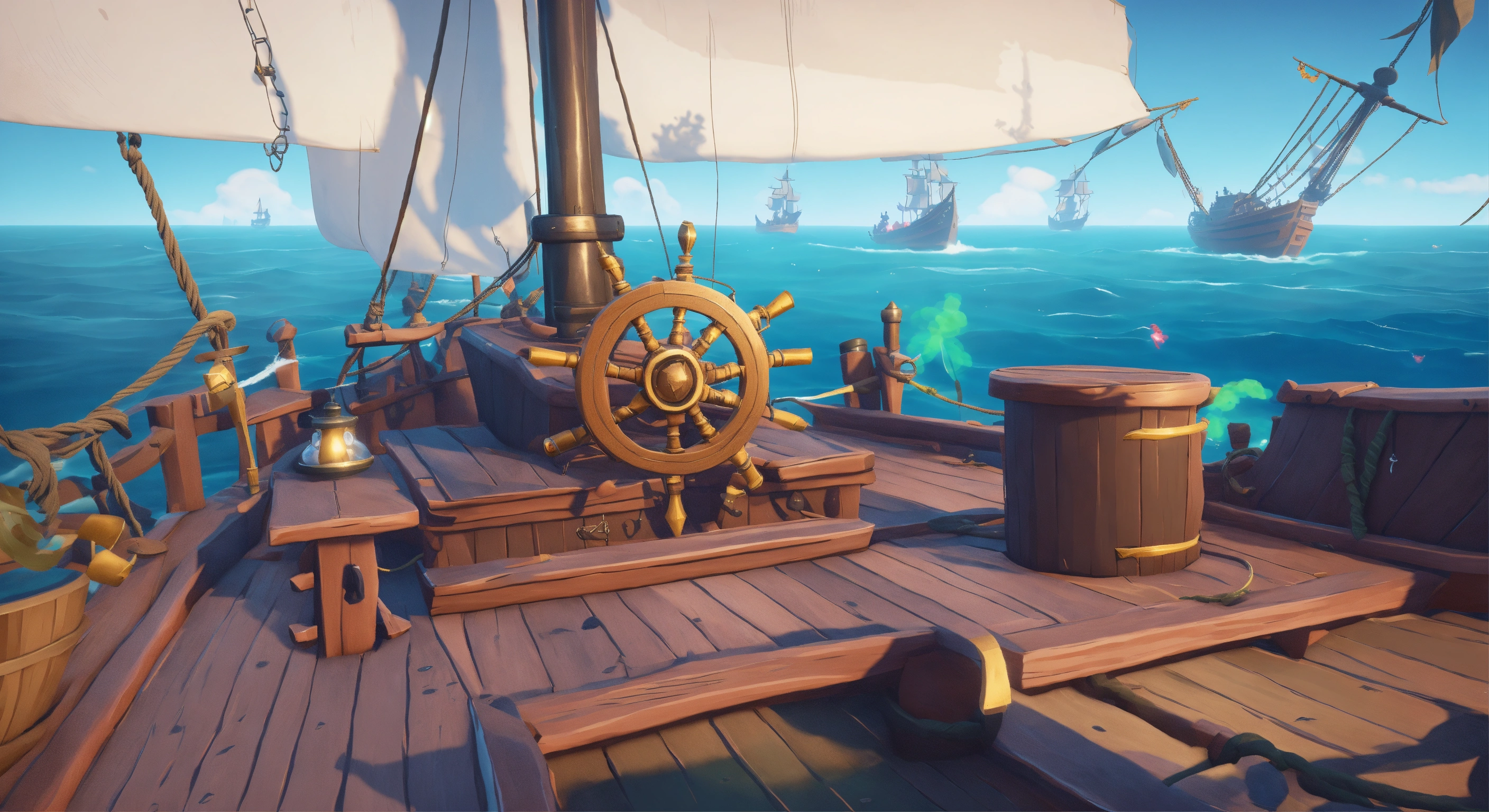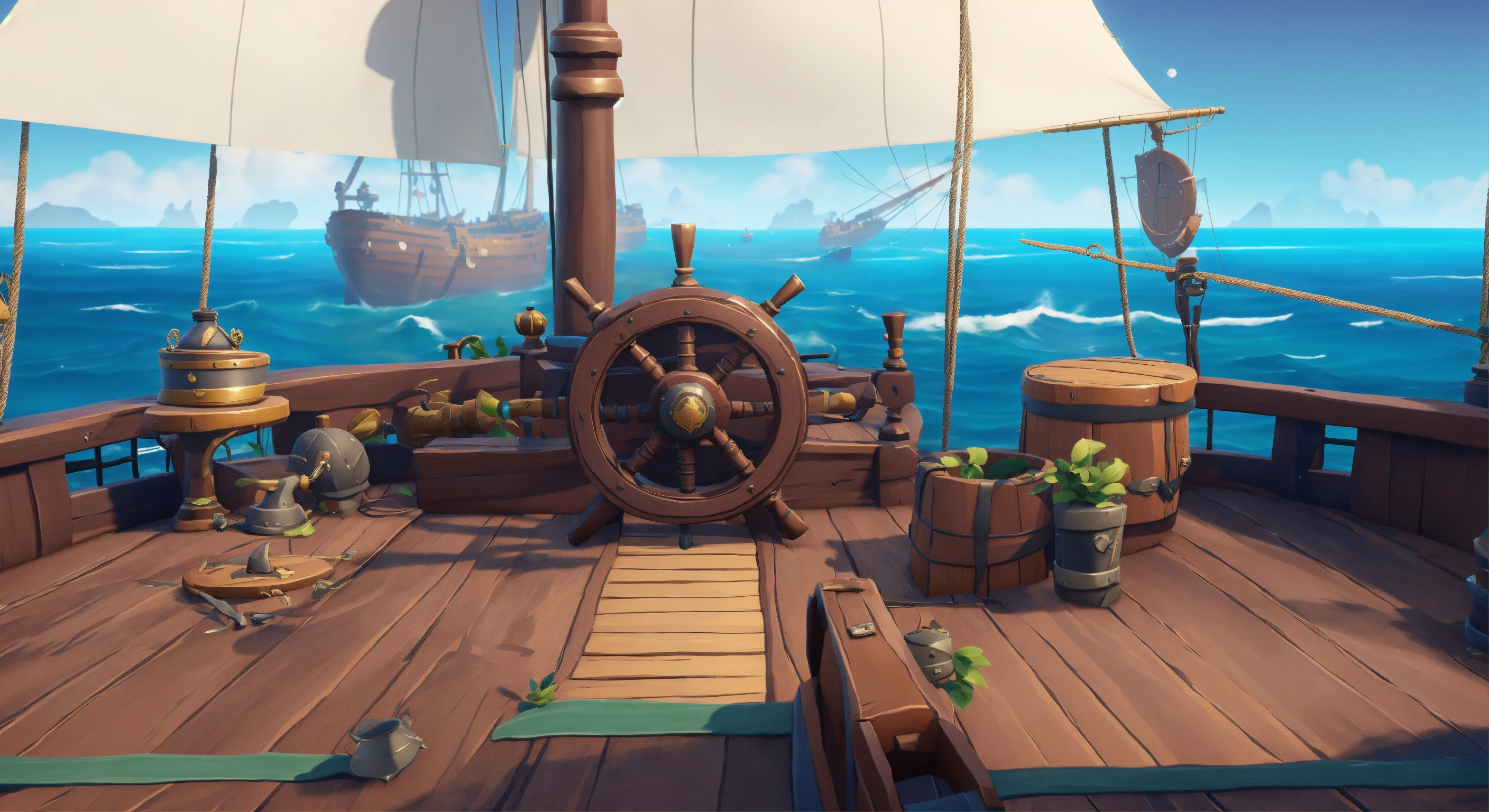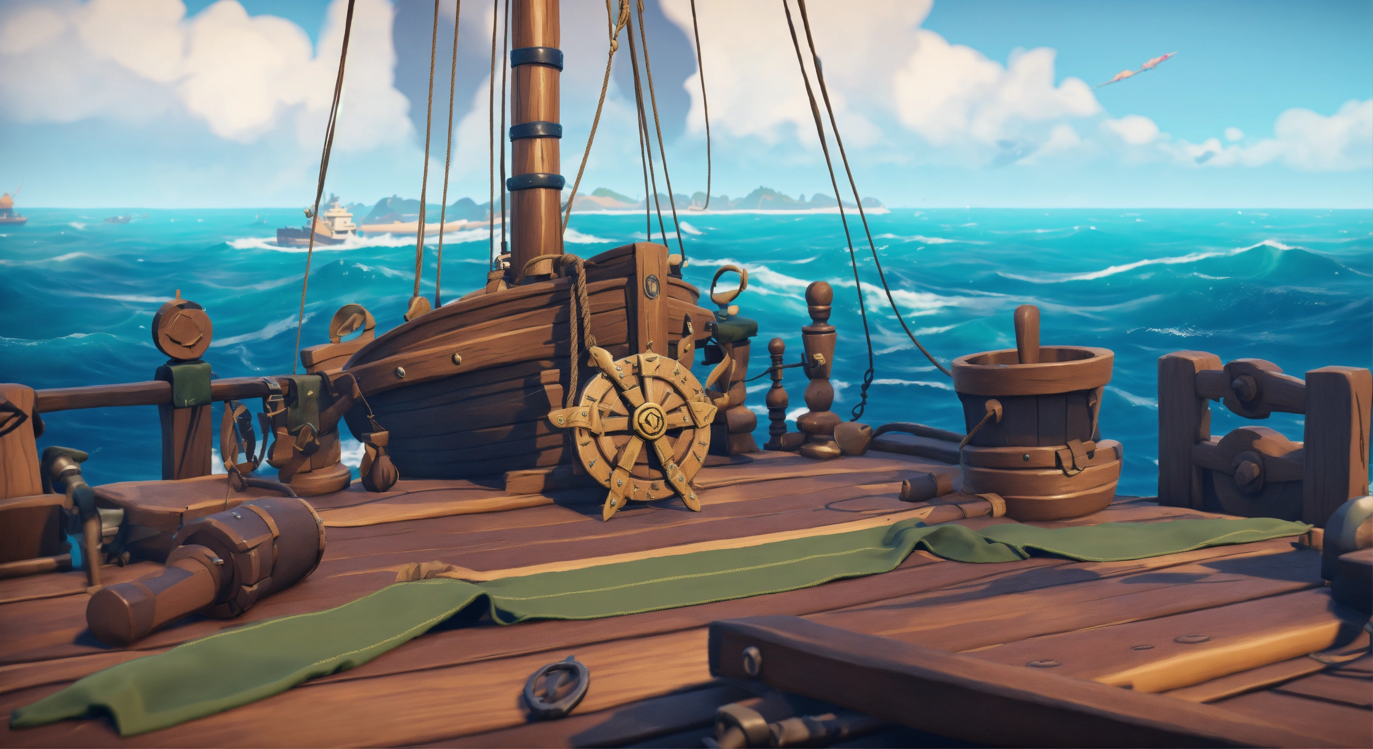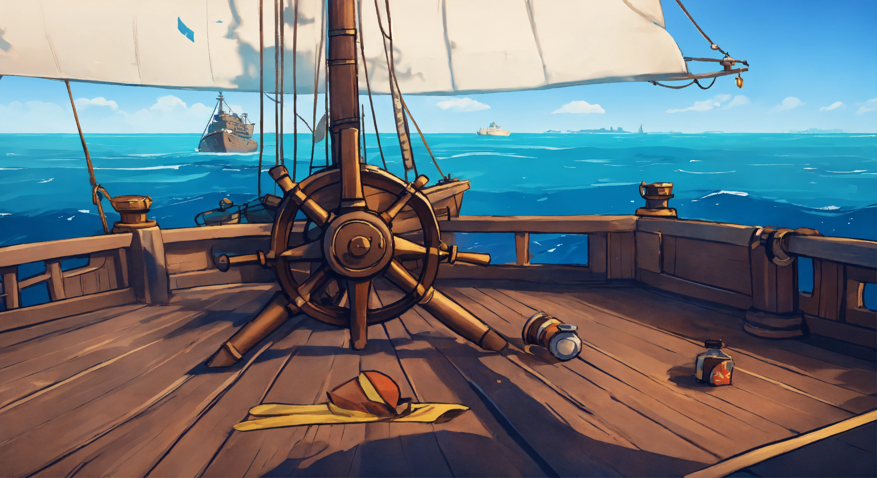 Ship deck with rudder, on the background sea and tiny islands, detailed hand illustration rendered in sea of thieves game style, cute cartoon style