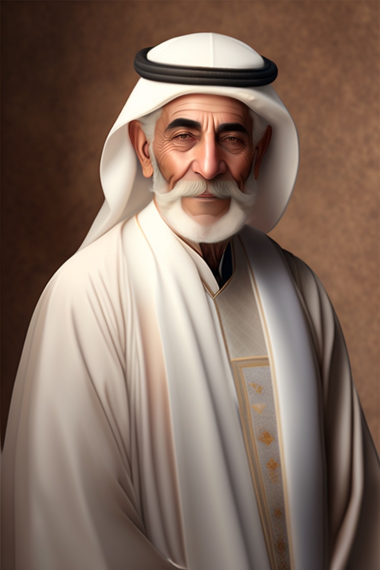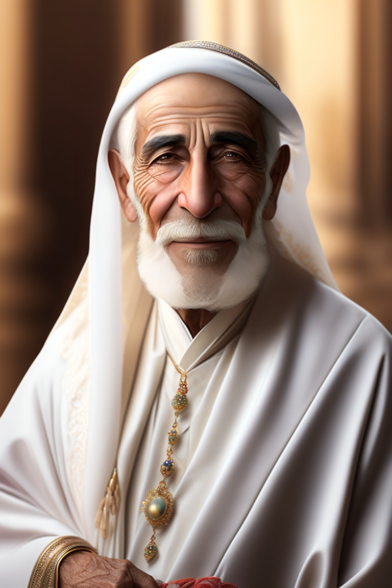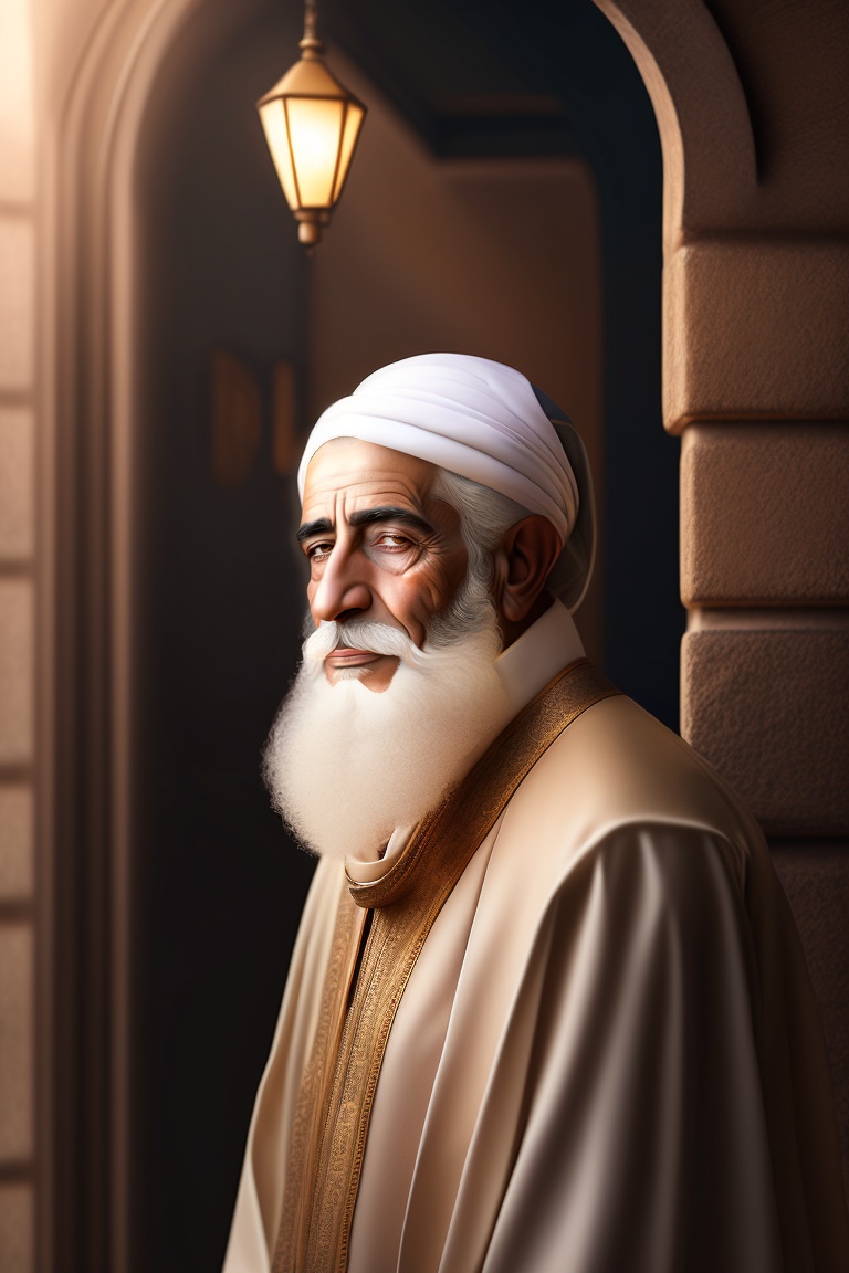 A wise old arab man appears, with wisdom and dignity white tunisian abaya year 1900, looking at the camera