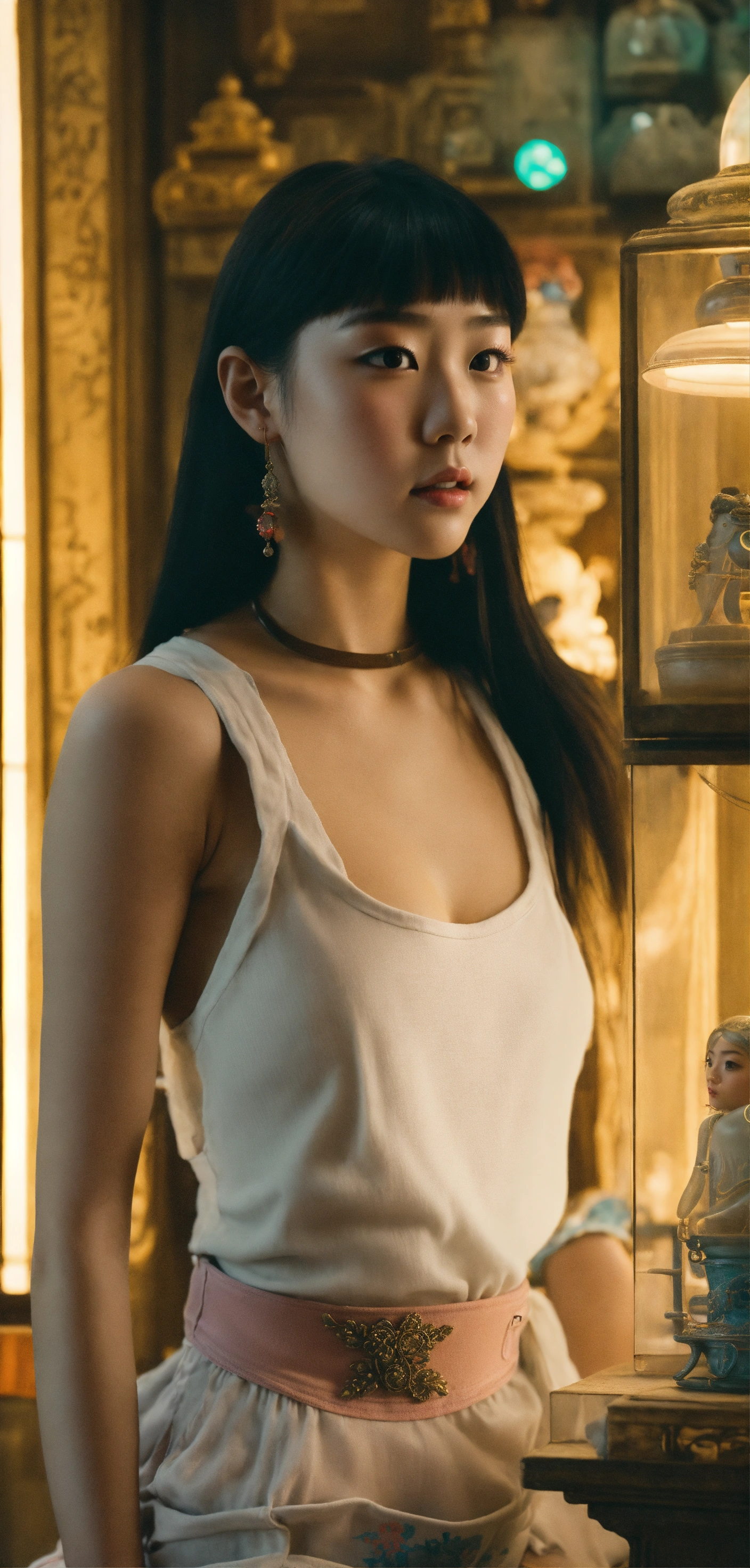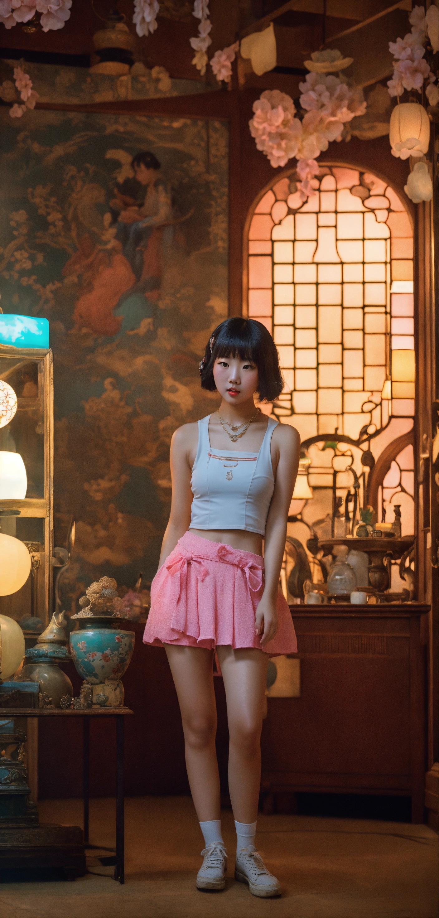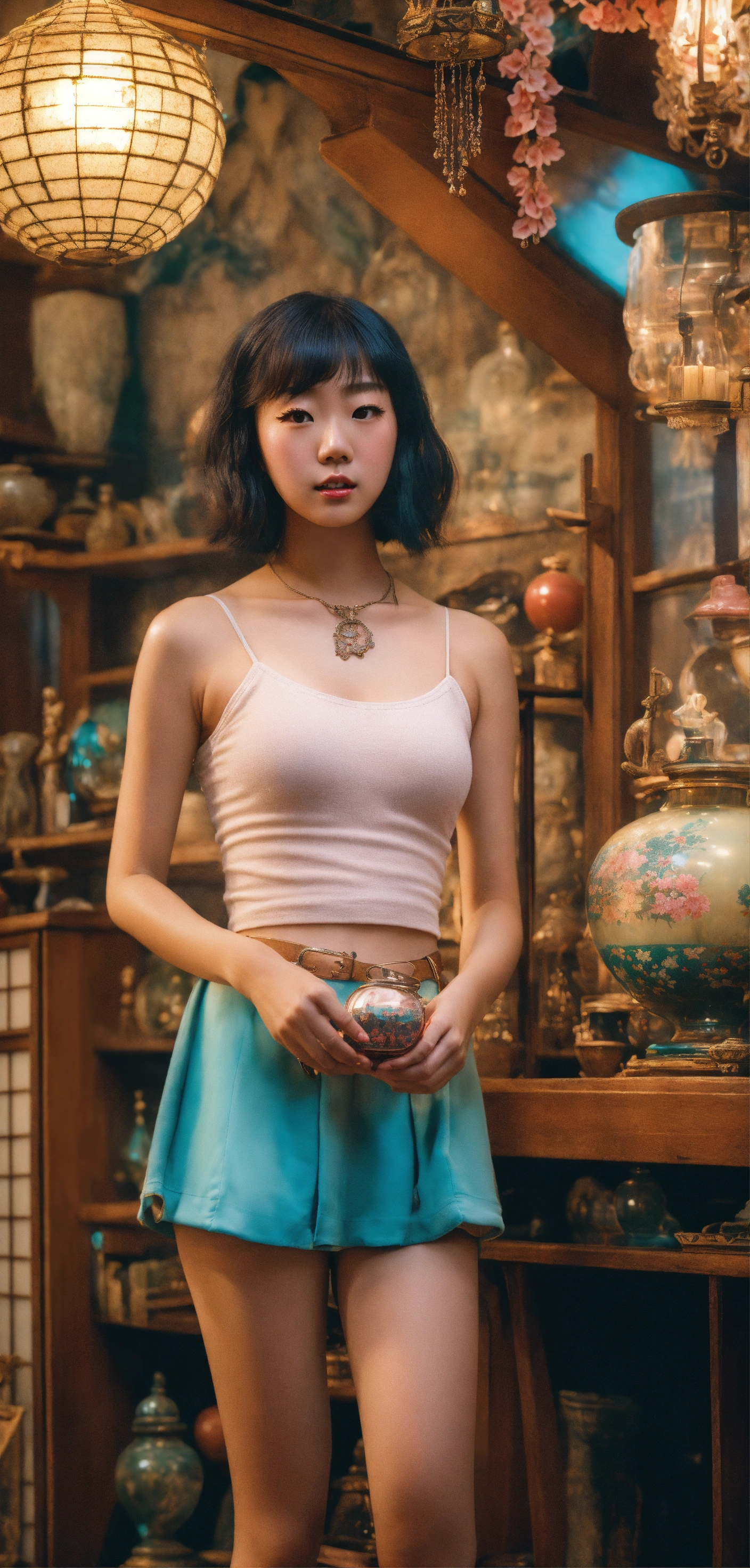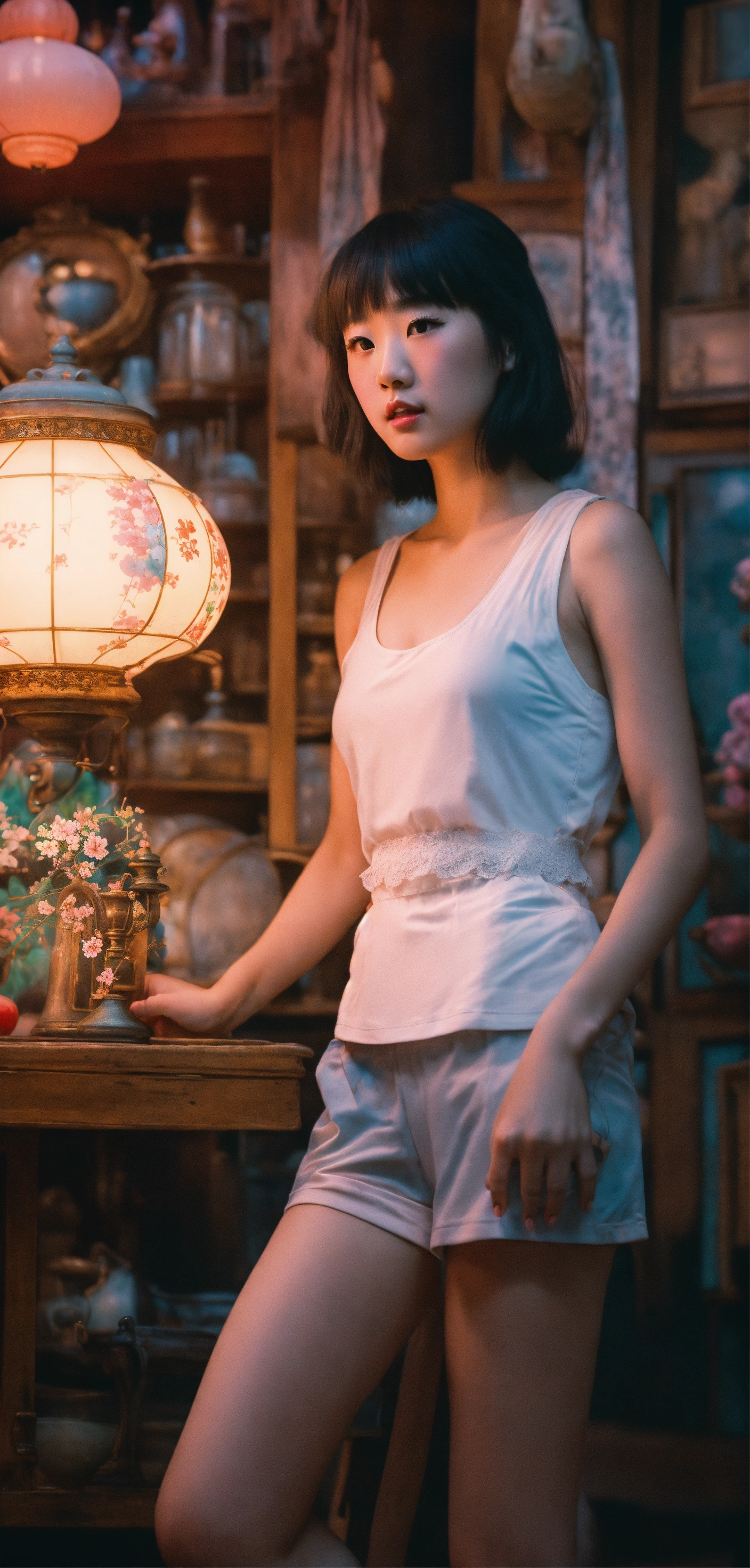 A hyper-realistic photograph of "within a medieval parlor, a mischievous poltergeist playfully rearranges antique curiosities, extremely cute and desirable japanese young woman with a white short tank top and a short, retro-futuristic vaporwave aesthetic." 64k, editorial shot, muted colors, silent colors