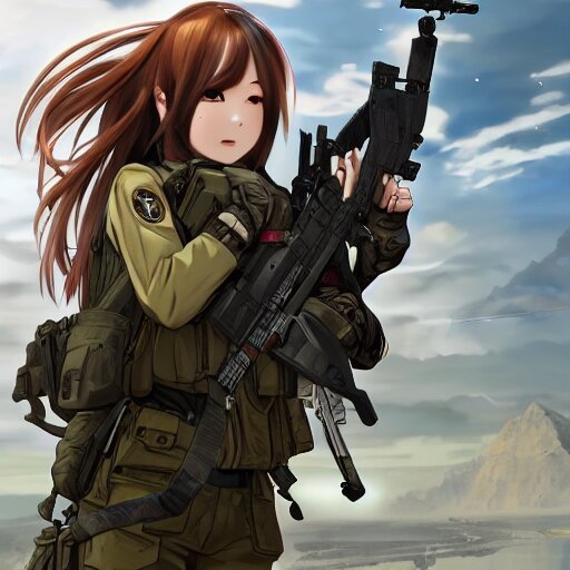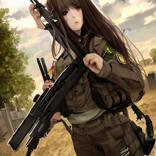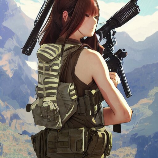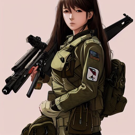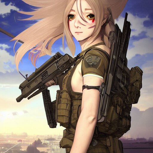 Soldier girl, mission extraction point, anime style, long hair, hair down, symmetrical facial features, girls frontline cg, hyper realistic, pale skin, 4 k, rule of thirds, extreme detail, detailed drawing, trending artstation, hd, backpack, d & d, by alphonse mucha, greg rutkowski, sharp focus, backlit
