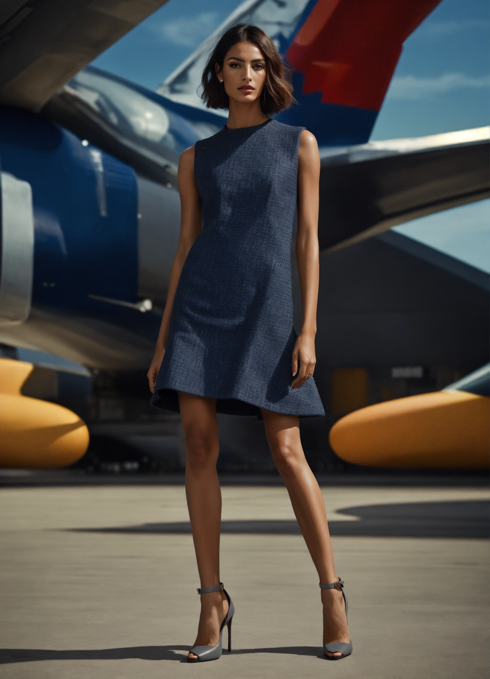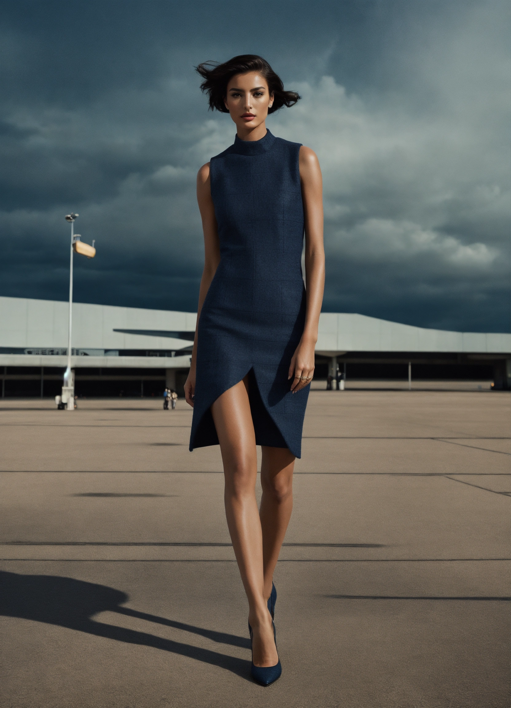 Create a visually stunning scene balenciaga photoshoot featuring a tanned brazillian supermodel in navy blue tweed sleeveless split short dress, stilettos, iso 400, surrealistic, 8k, full frame, airport inspired background in grey, darker aestethic