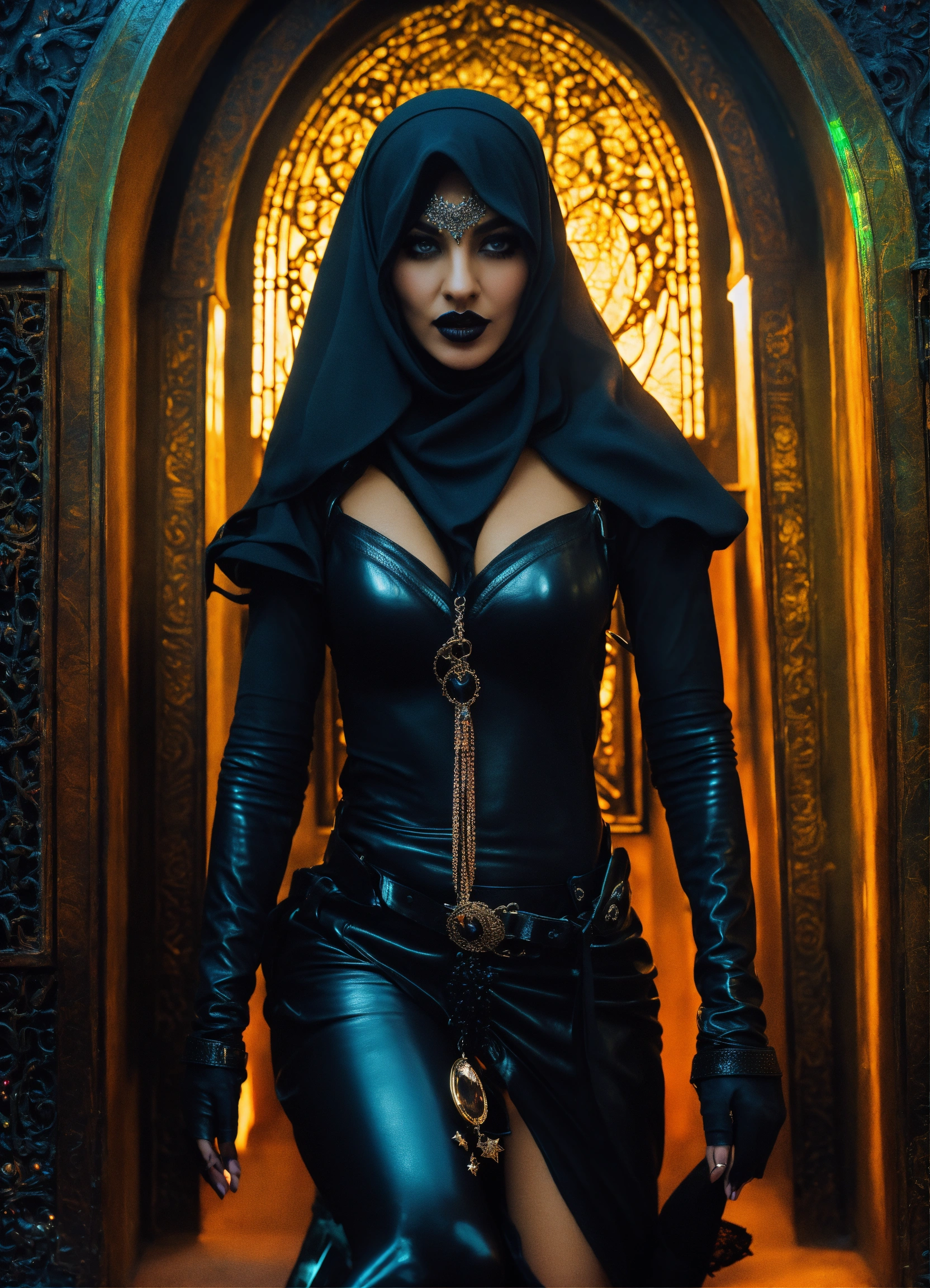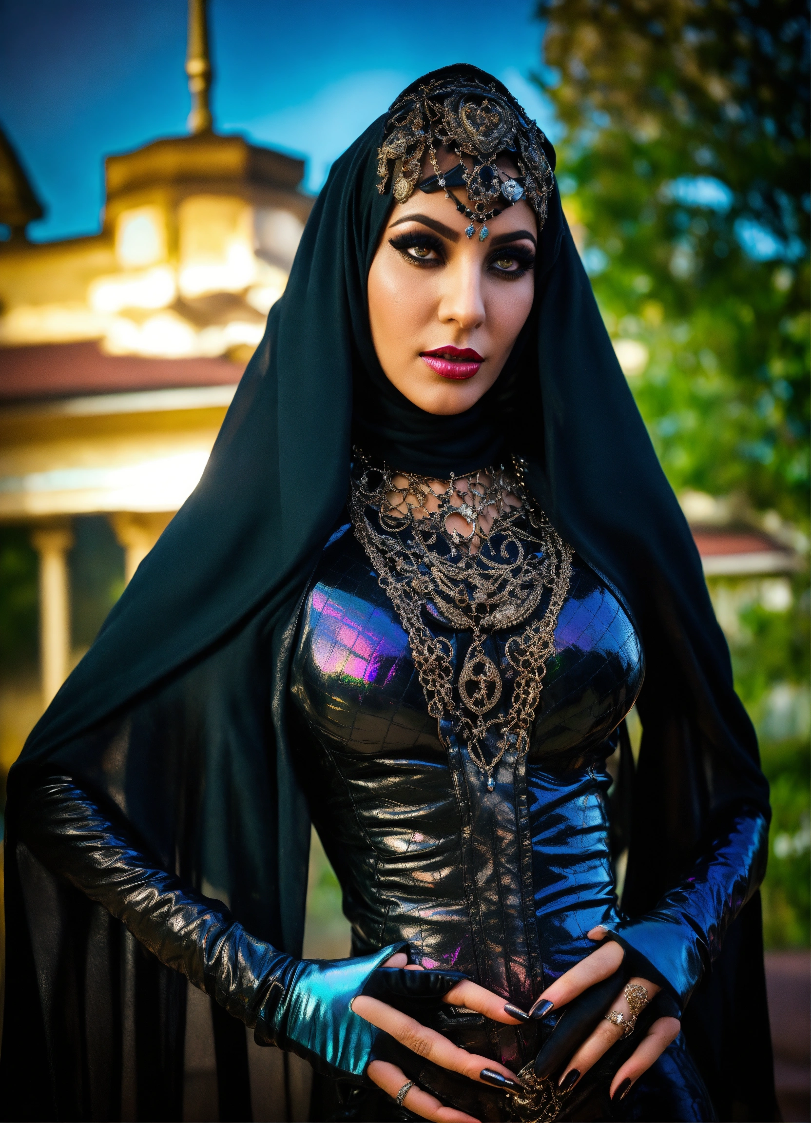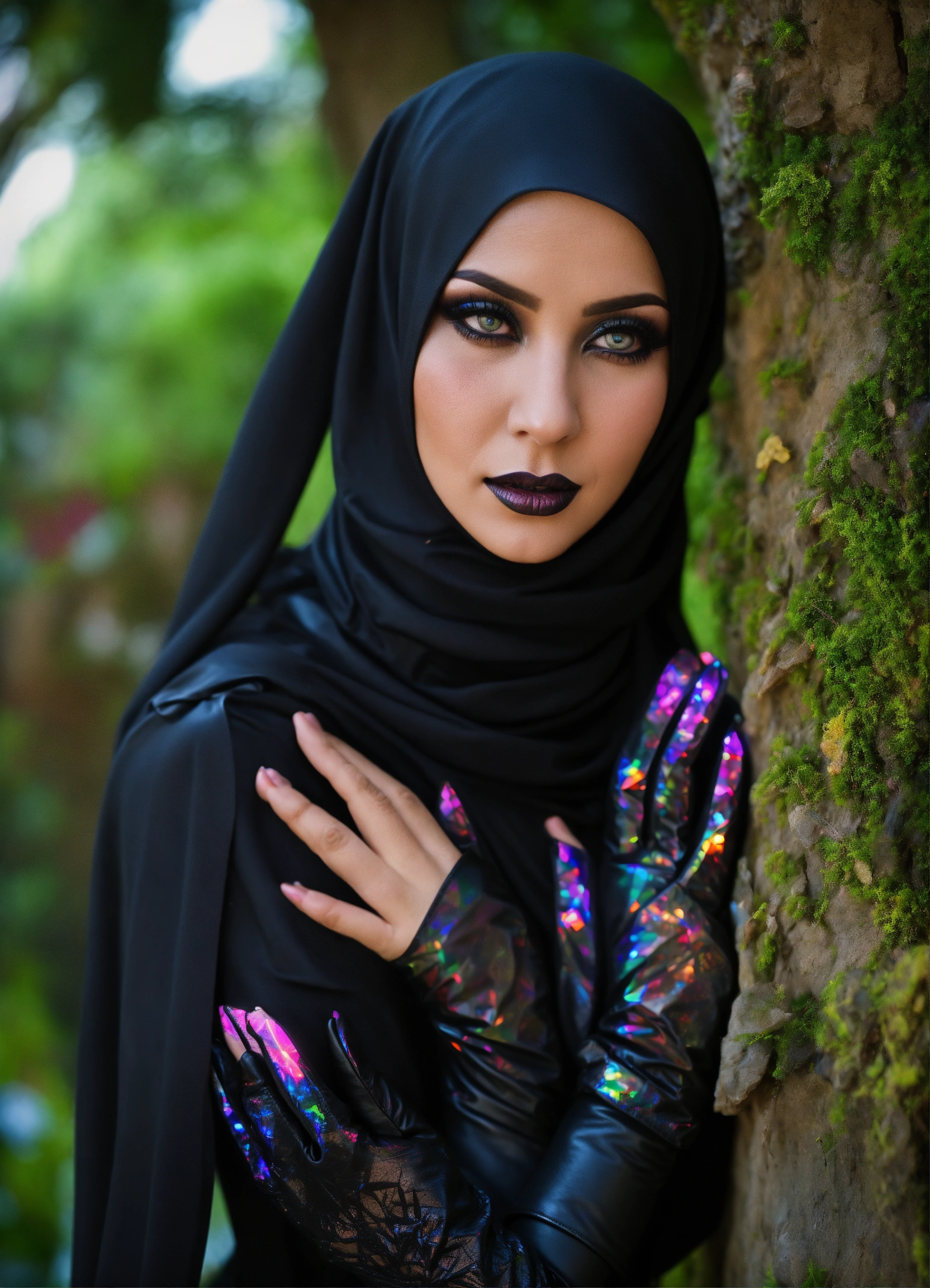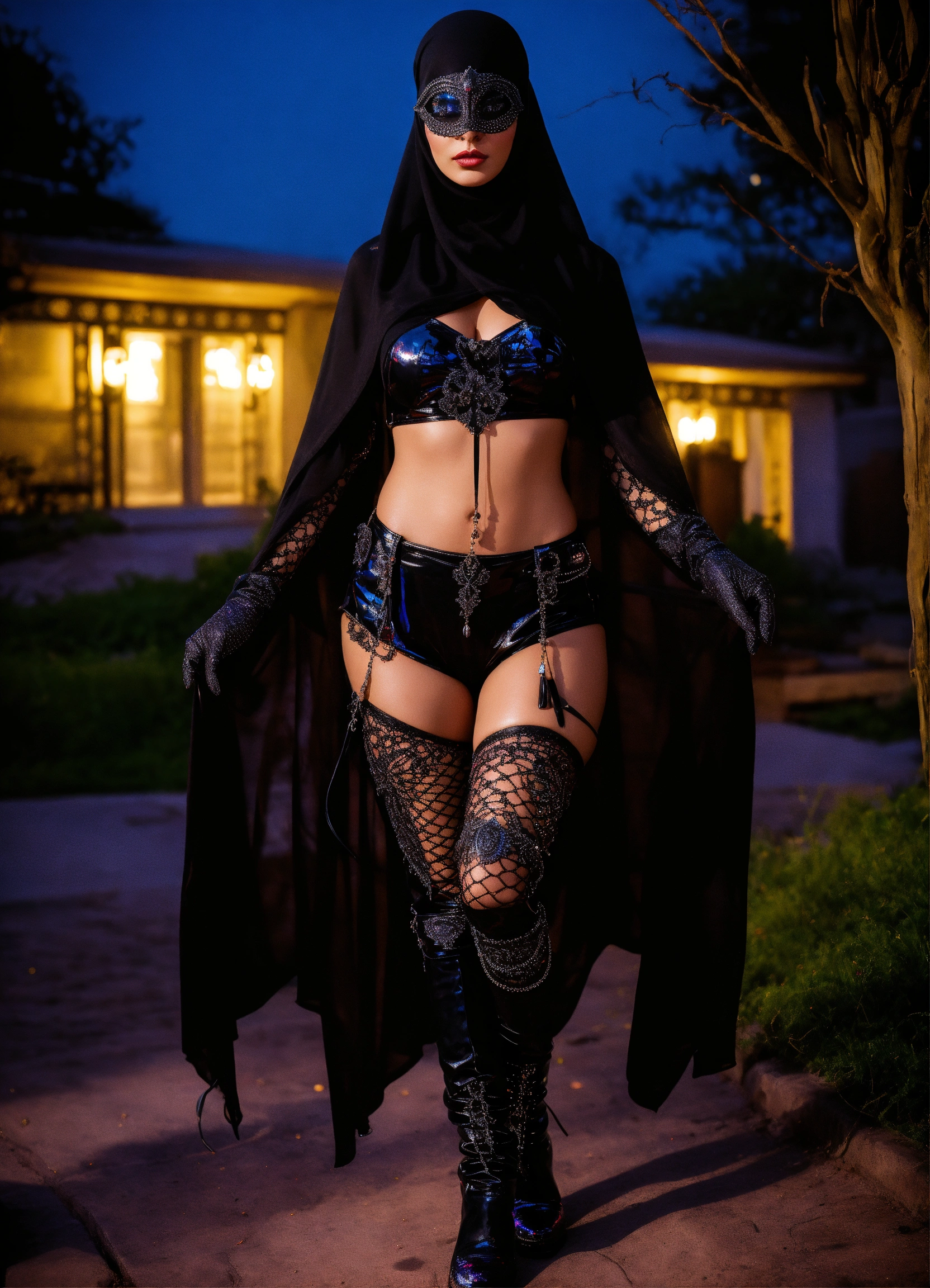 Evil occult satanic goth hypnotic arabian sorceress zenobia with doom gaze veiled eyes, extremely powerful hypnotic eyes wearing "black holographic leather veiled "skin tight" hijab" & "black leather high heeled boots" & "black holographic leather gloves" & "skin tight short shorts", at my front porchstep, sending me deely into trance, waving her gloved hands in front of my eyes, casting a powerful spell, muslimah sorceress, falling deeply mindless & helpless under her controlling power, most evil full veiedl hijab hypnotist in the world, "powerful zenobia deep trance inducing eyes"