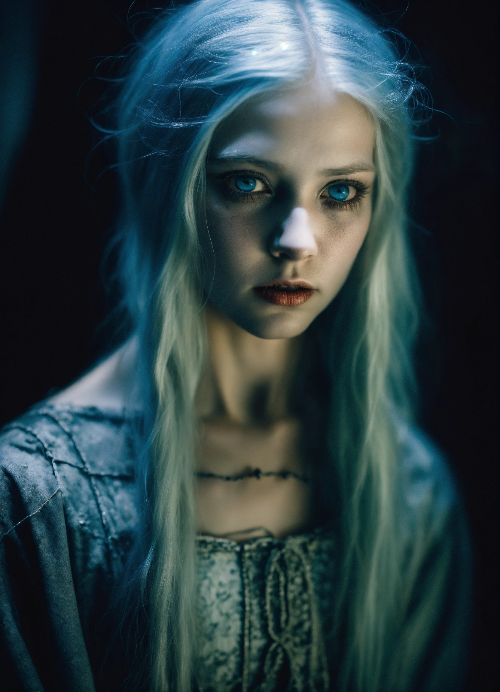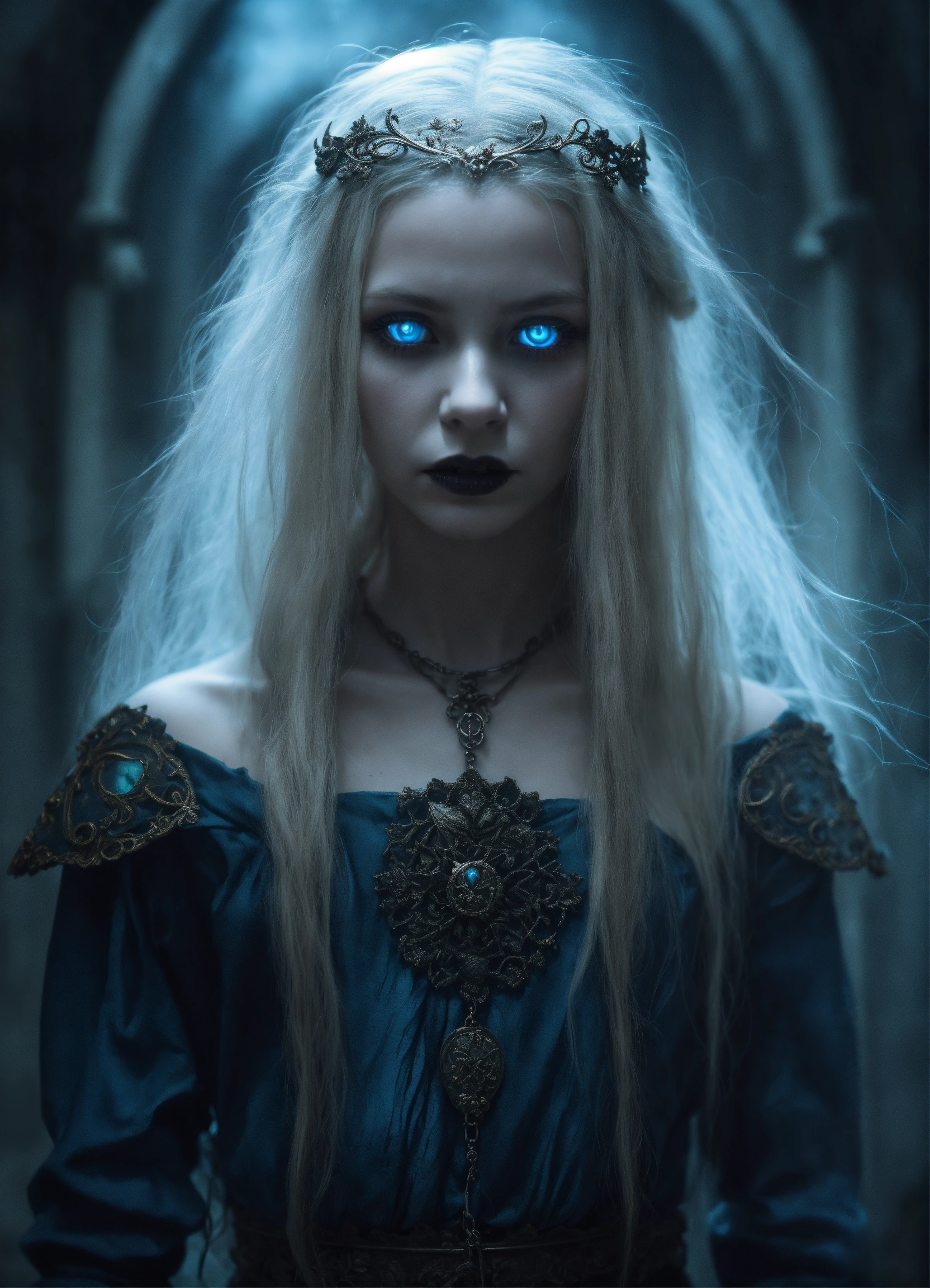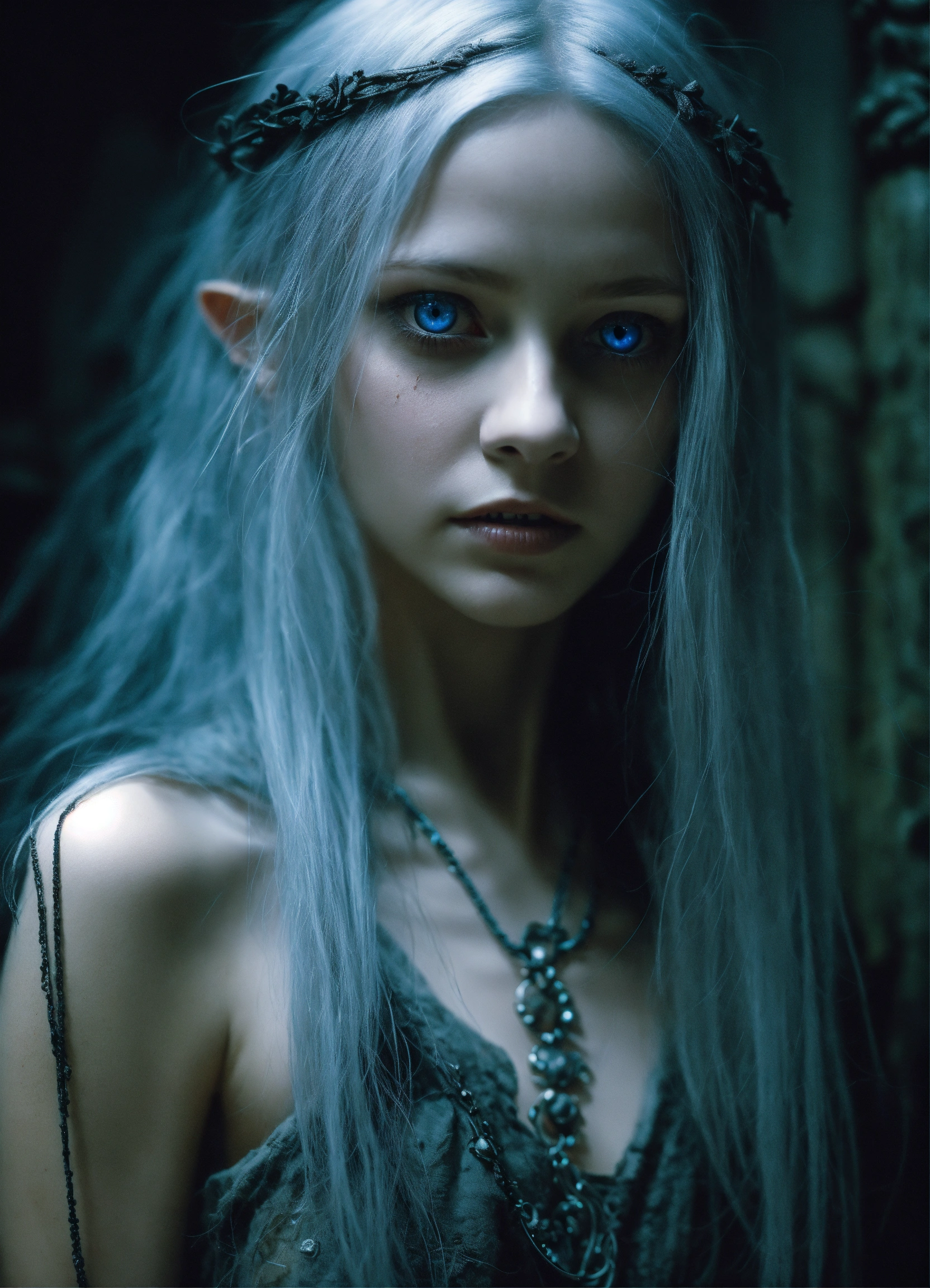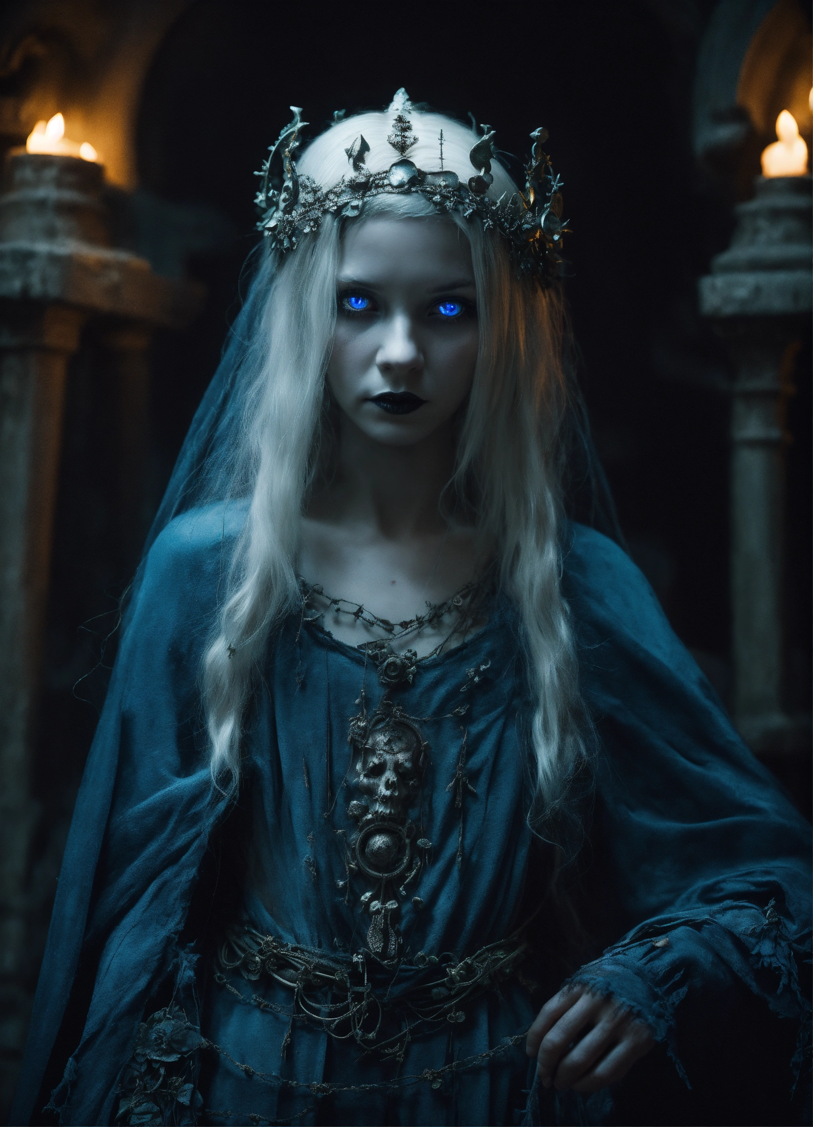 Body portrait, eleven year old childish female goth necromancer, very skinny and emaciated with long silverwhite hair and alabaster skin pale as a corpse and glowing blue eyes is overcome by darkness in a gloomy crypt, slim face, innocent looking, graceful, wispy, glowing blue eyes, ghostly, rotting flesh, dead, evil, demonic, undead, darkness, grotesque, mysterious, dark, cold ambient lighting, focus on face, extremely detailed, fantasy, medieval setting