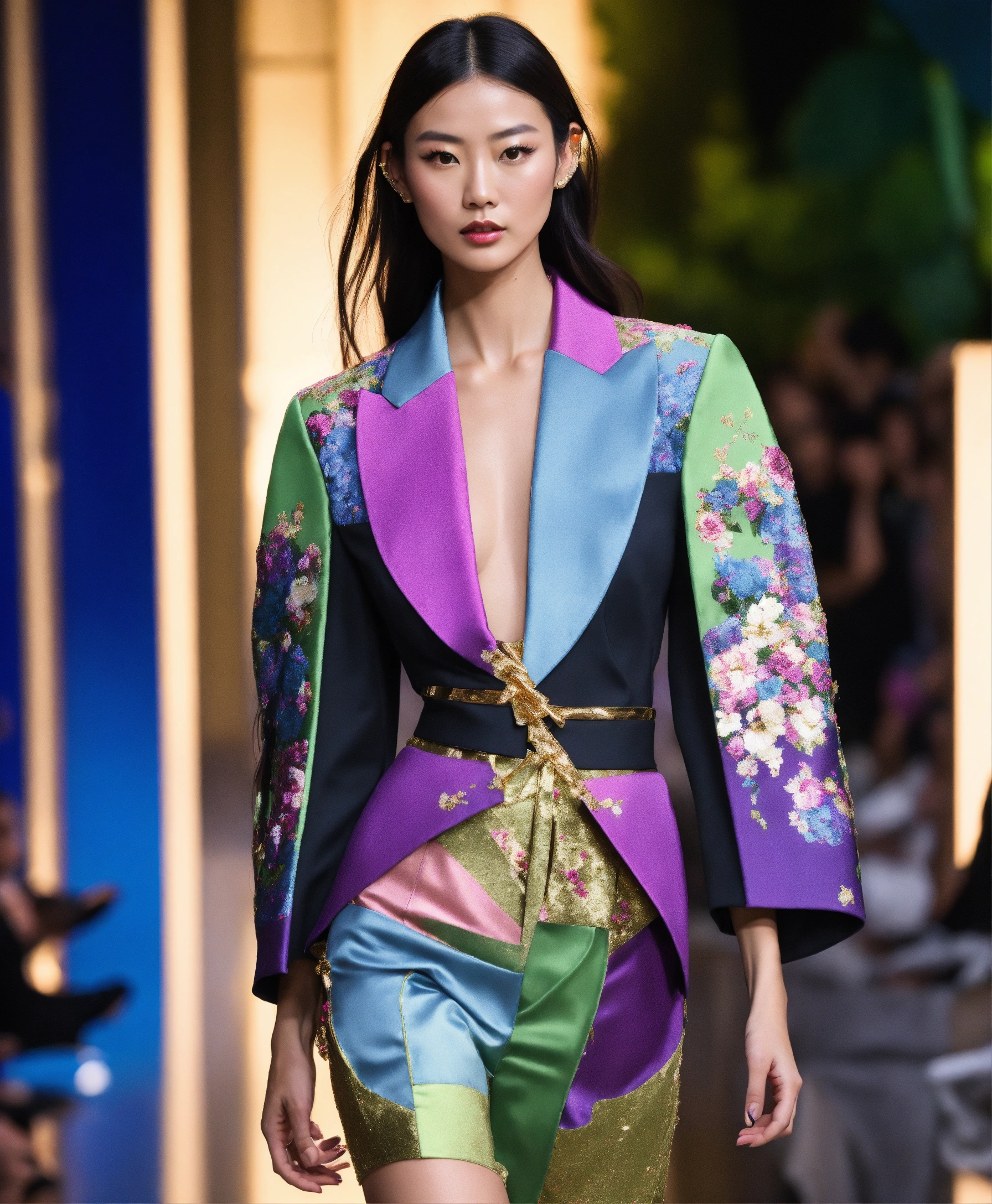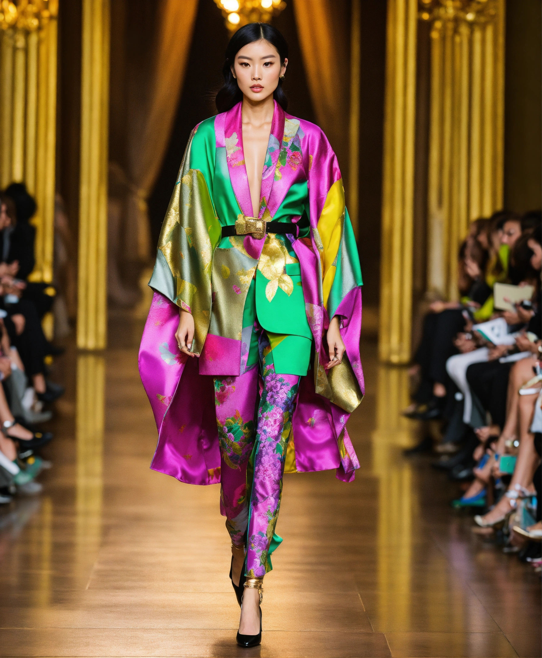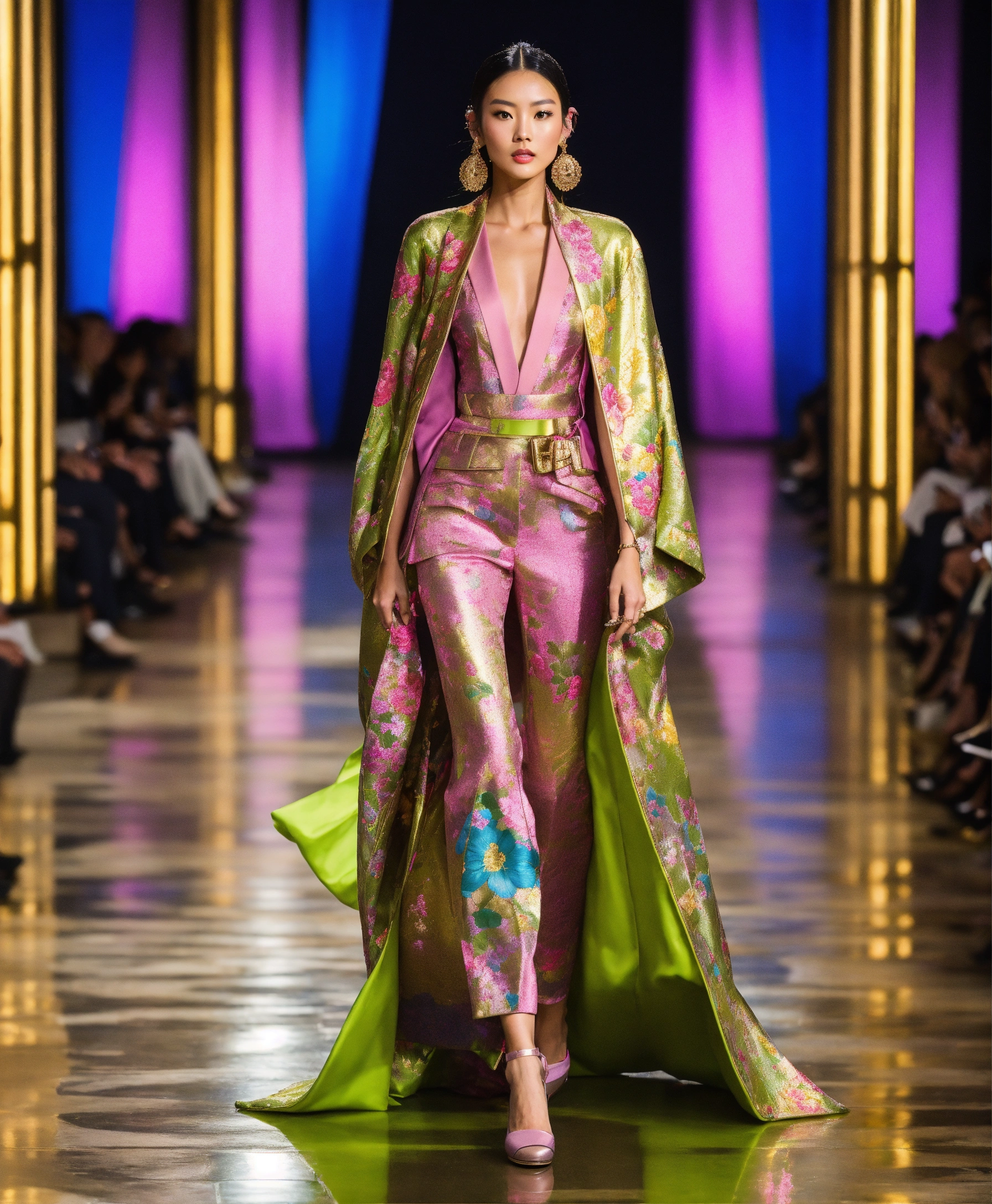 Ultra realistic full body photo of a stylish japanese model walking the runway modeling summer designer novelty interesting complex unusual street sporty classy modern dolman sleeve outfit brave, paris versailles details cutouts and and gold geometric pattern floral structured tailored jacket pink gold green lilac peridot silver magenta lime fuchsia yellow blue black gray copper mauve bronze sheen metallic edgy haute couture ultimate elegance beautiful luxurious awesome wealthy resplendent magnificent sublime 12k