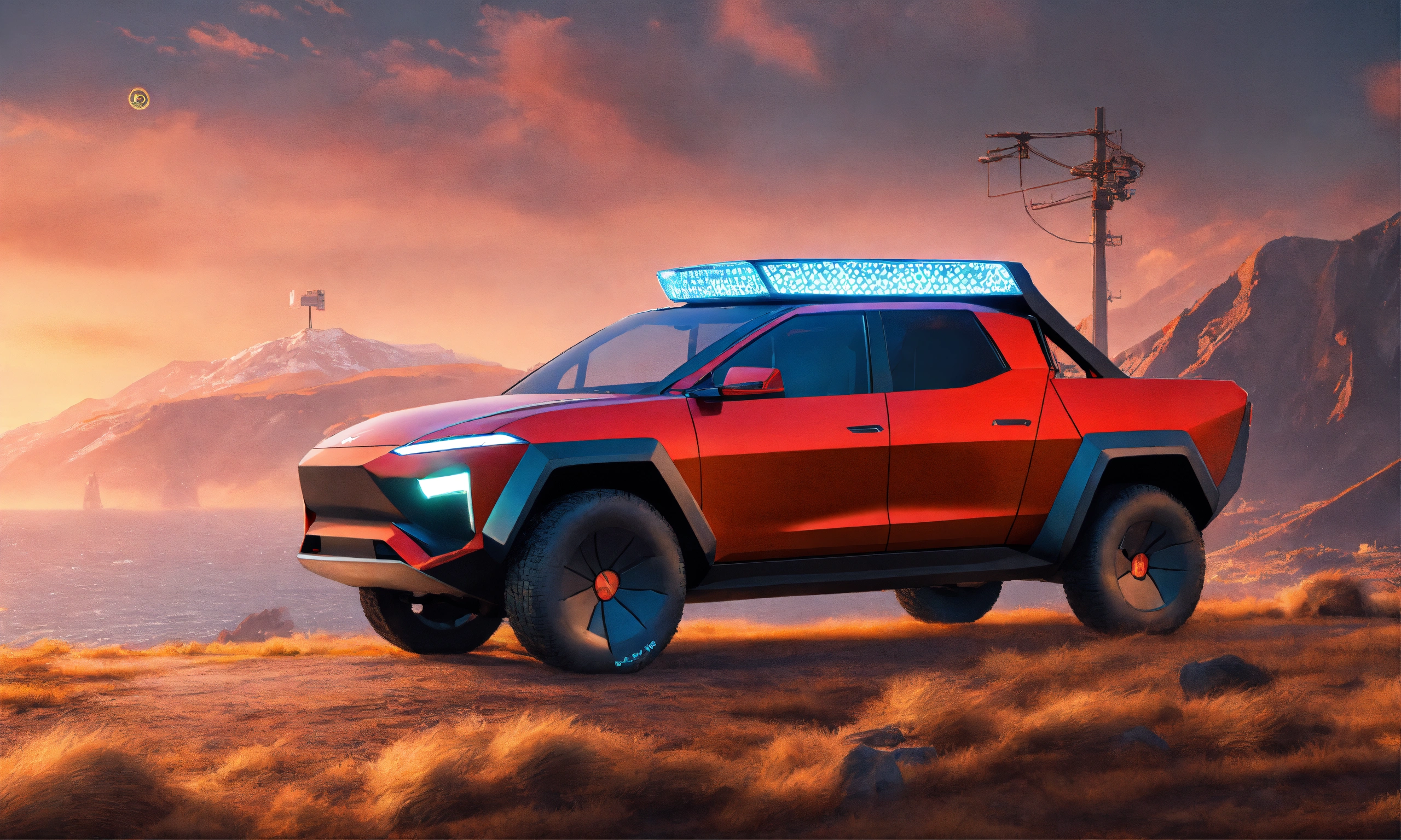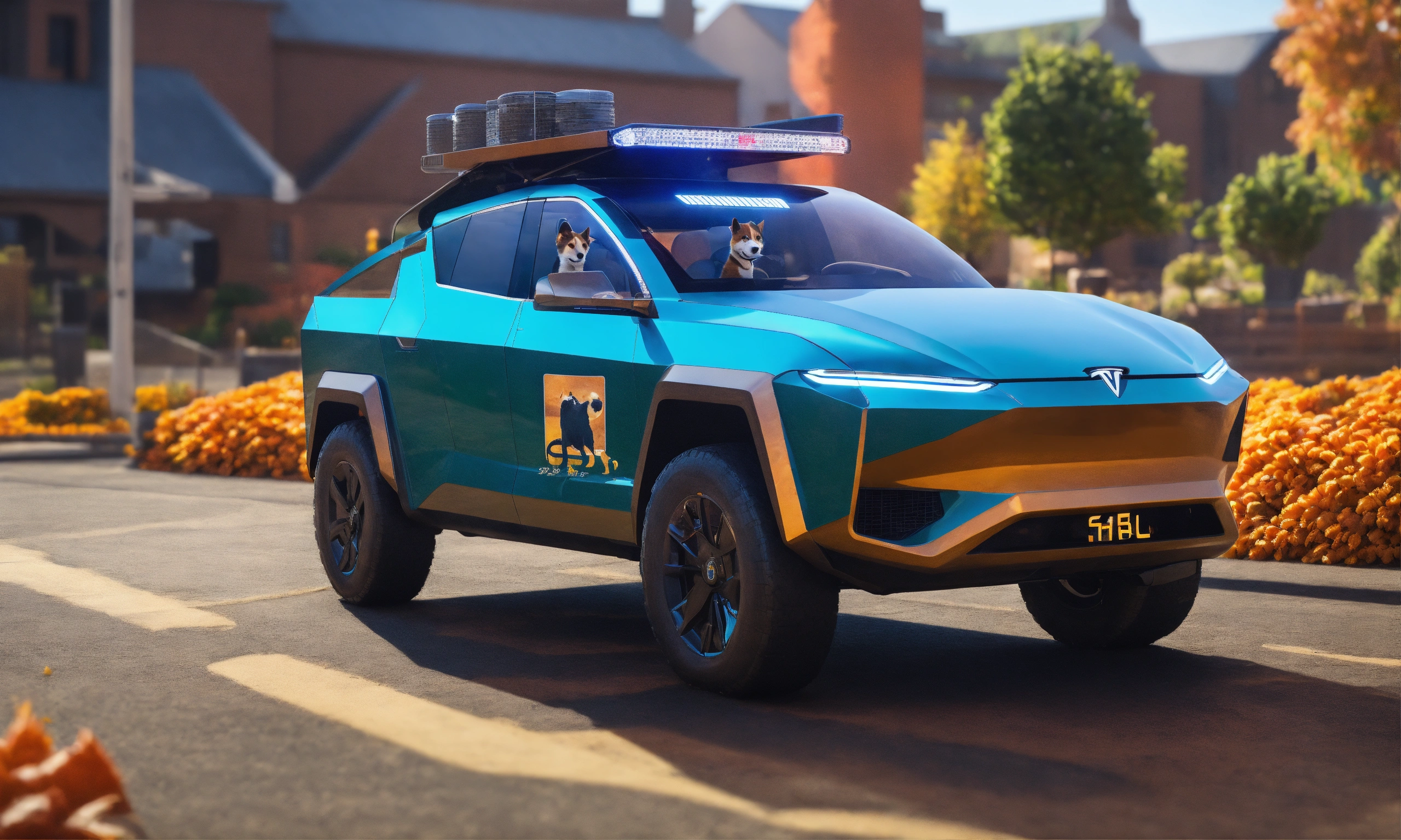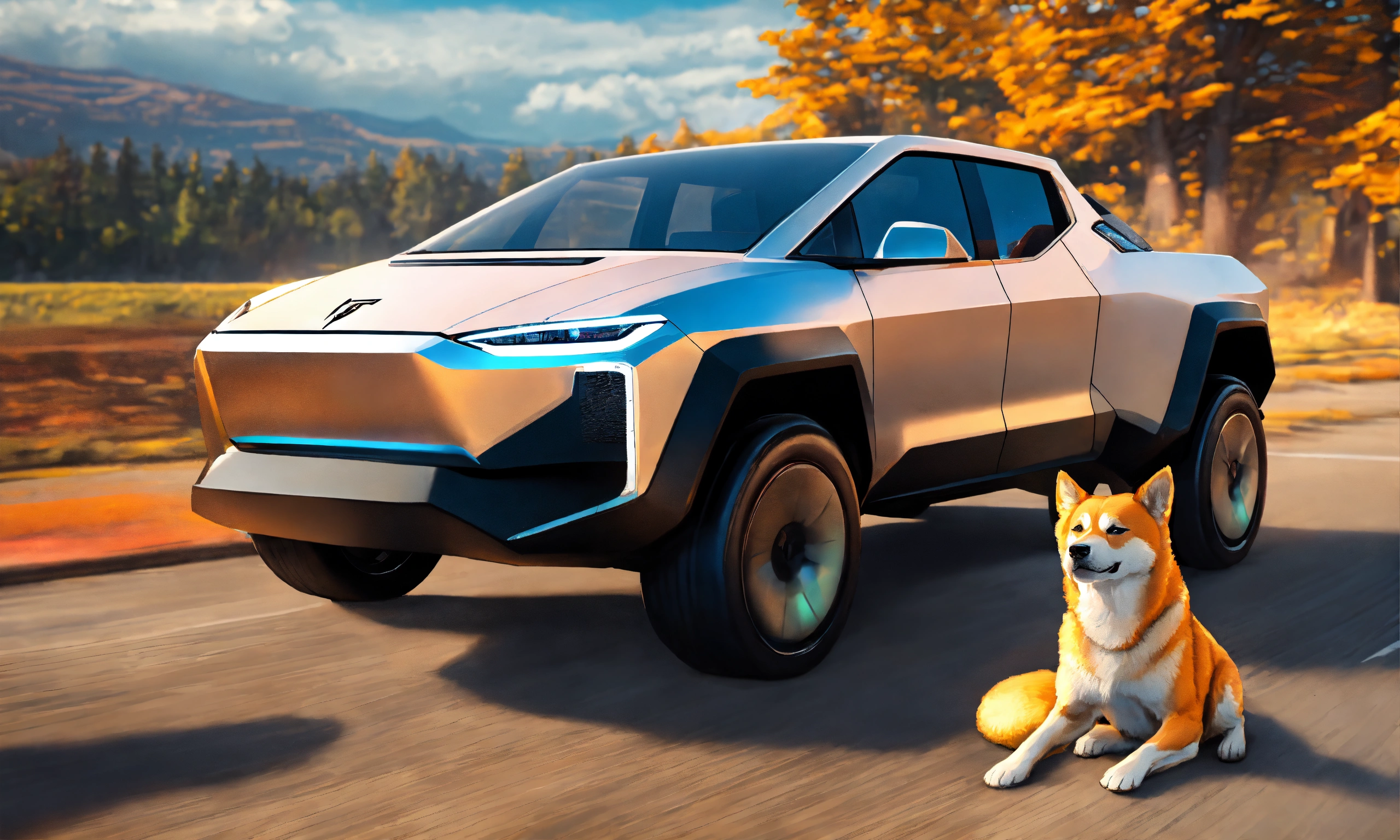 Produce an image of a realistic tesla cybertruck with a shiba inu driving it, include dogecoin crypto logo on the truck or in the background details