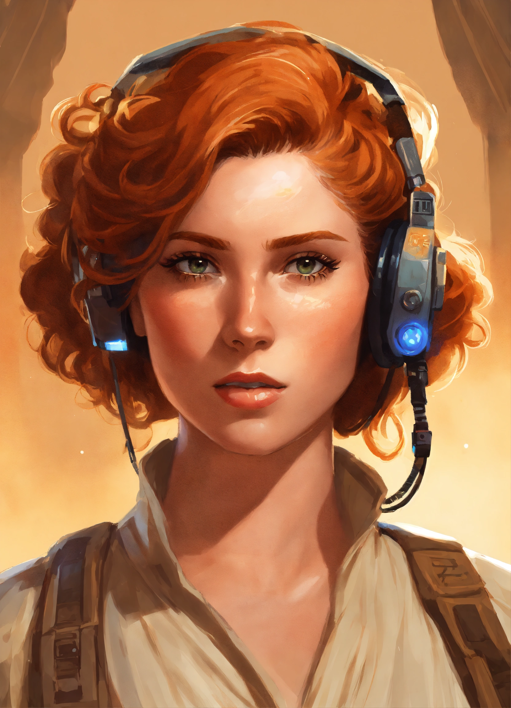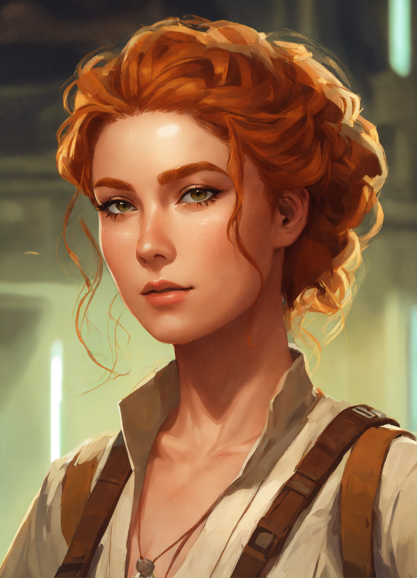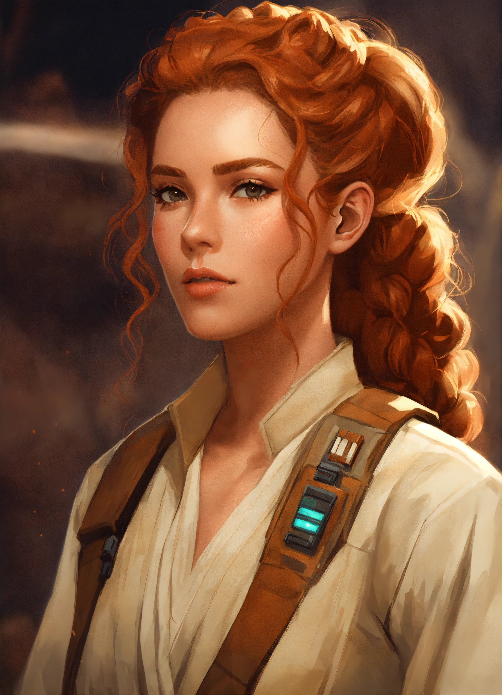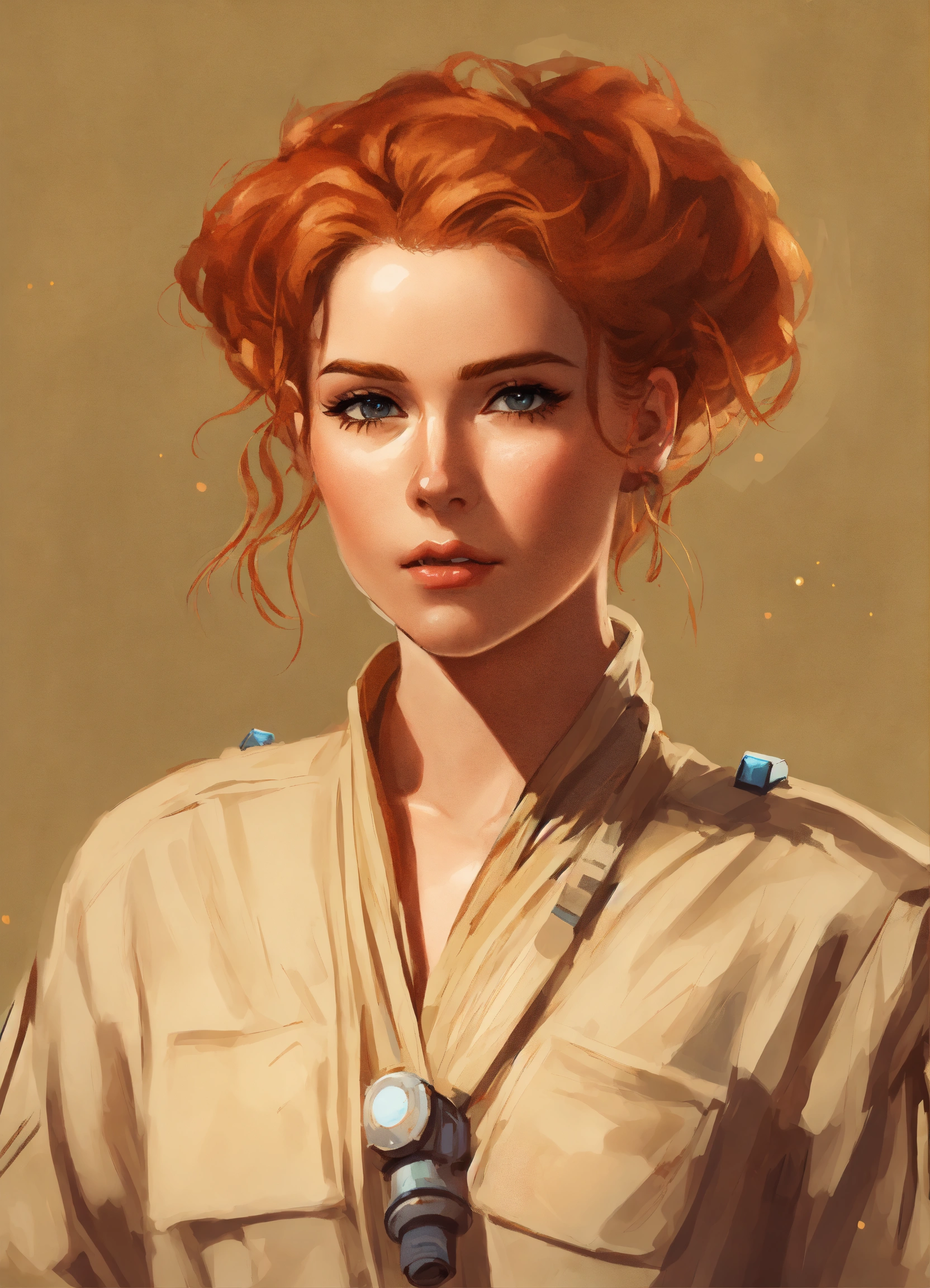 A digital character art portrait of a stunningly gorgeous star wars archaeologist woman with coiffed ginger hair, in a puffy cream blouse.