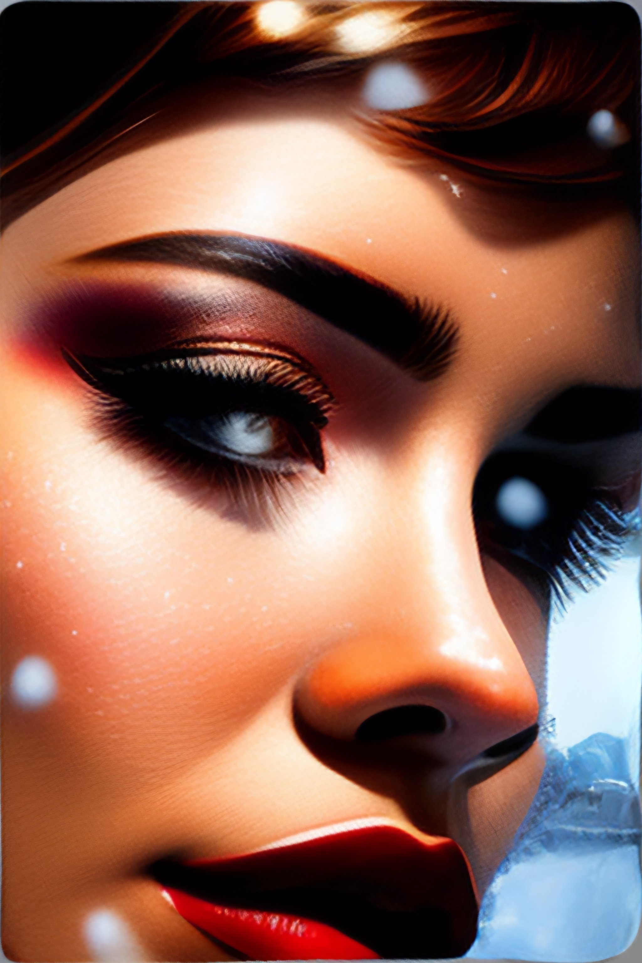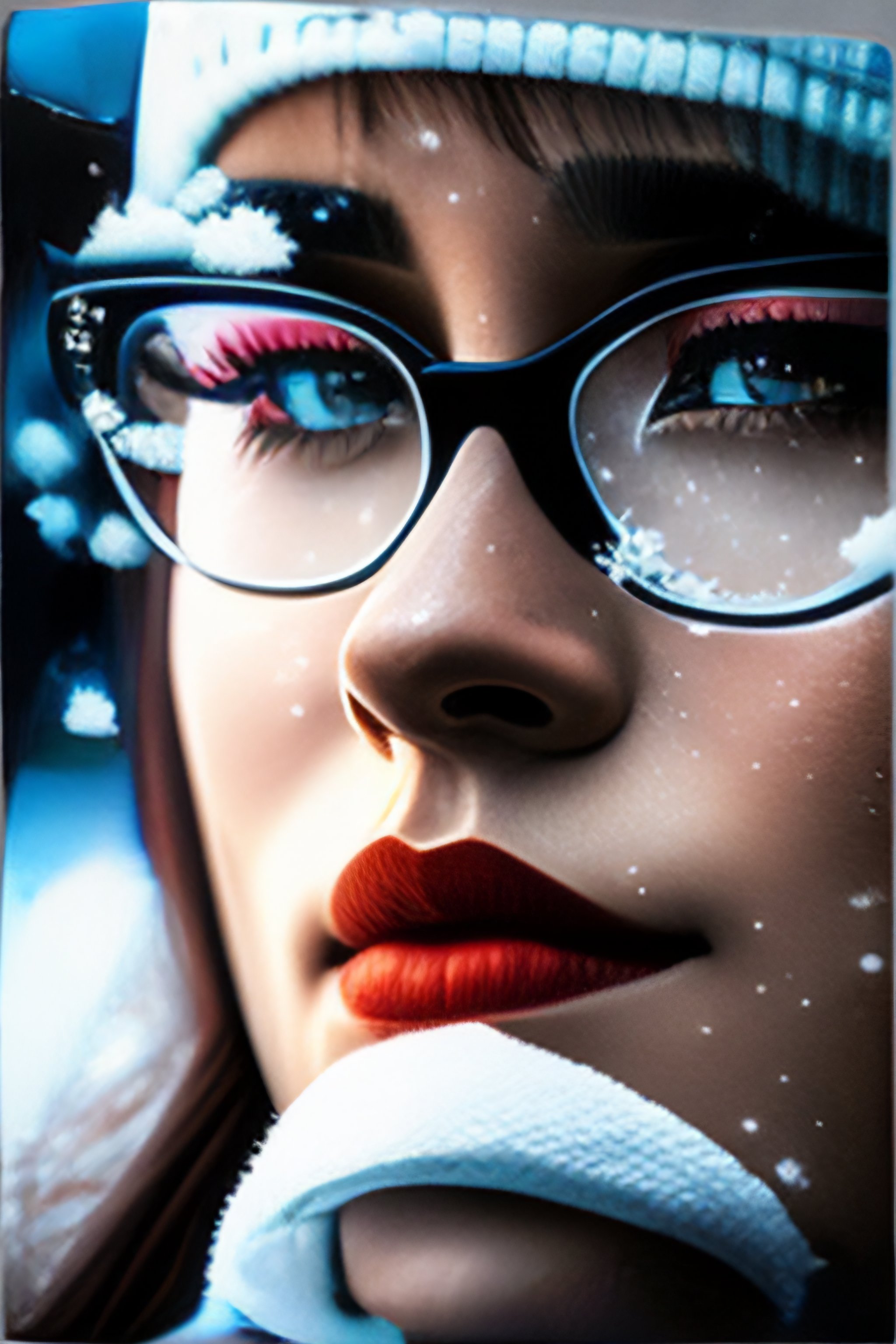 Close up of a person wearing glasses snow flakes on nose and eyelashes