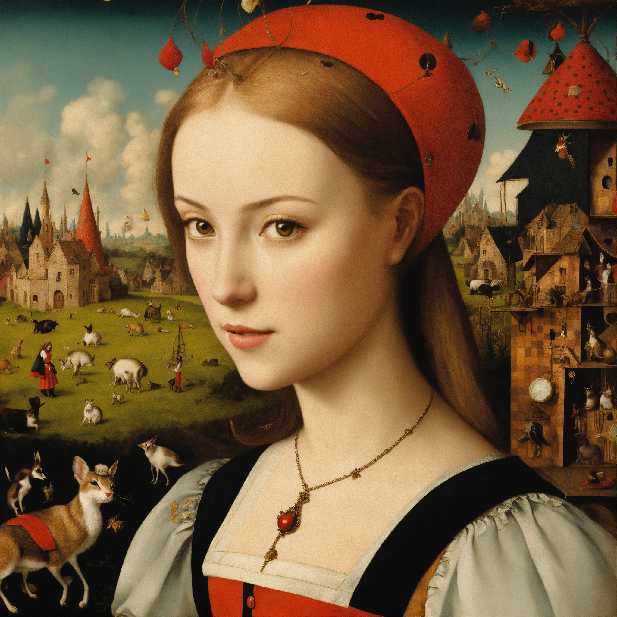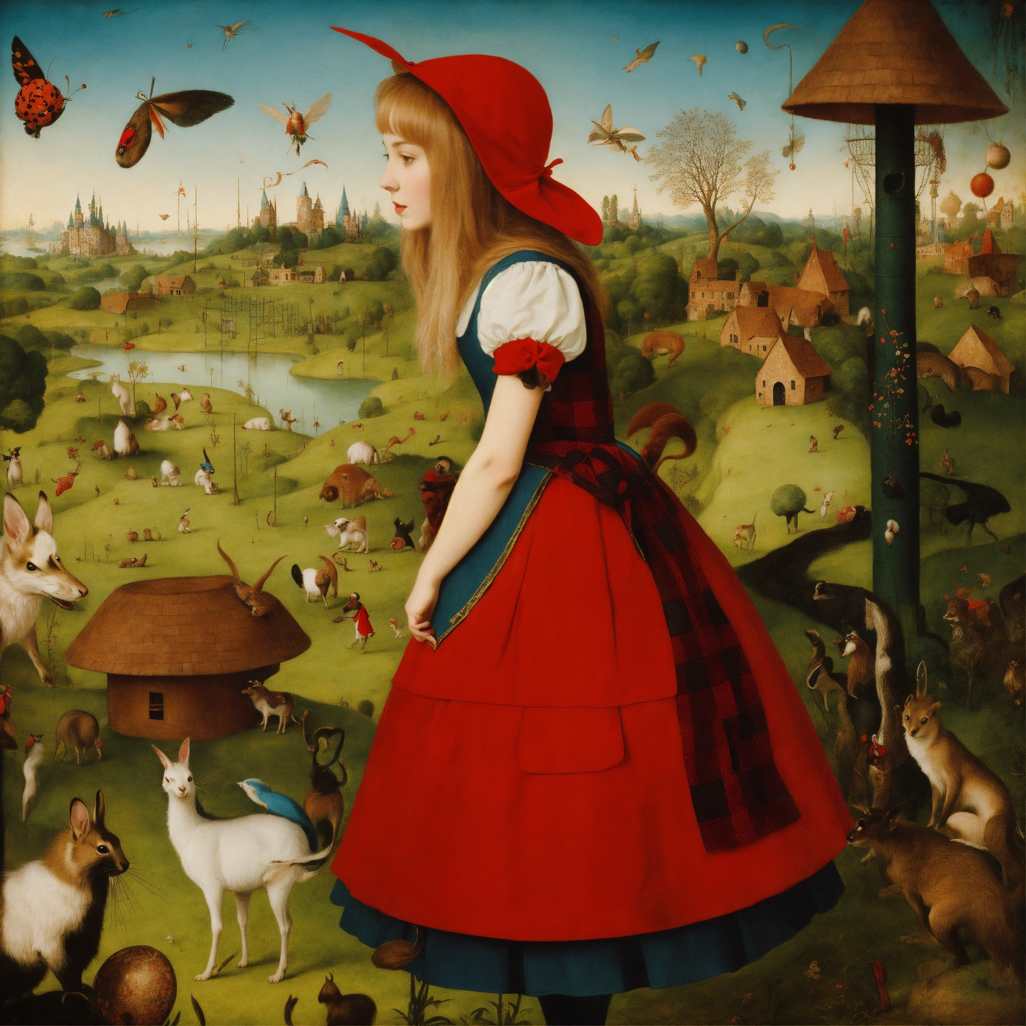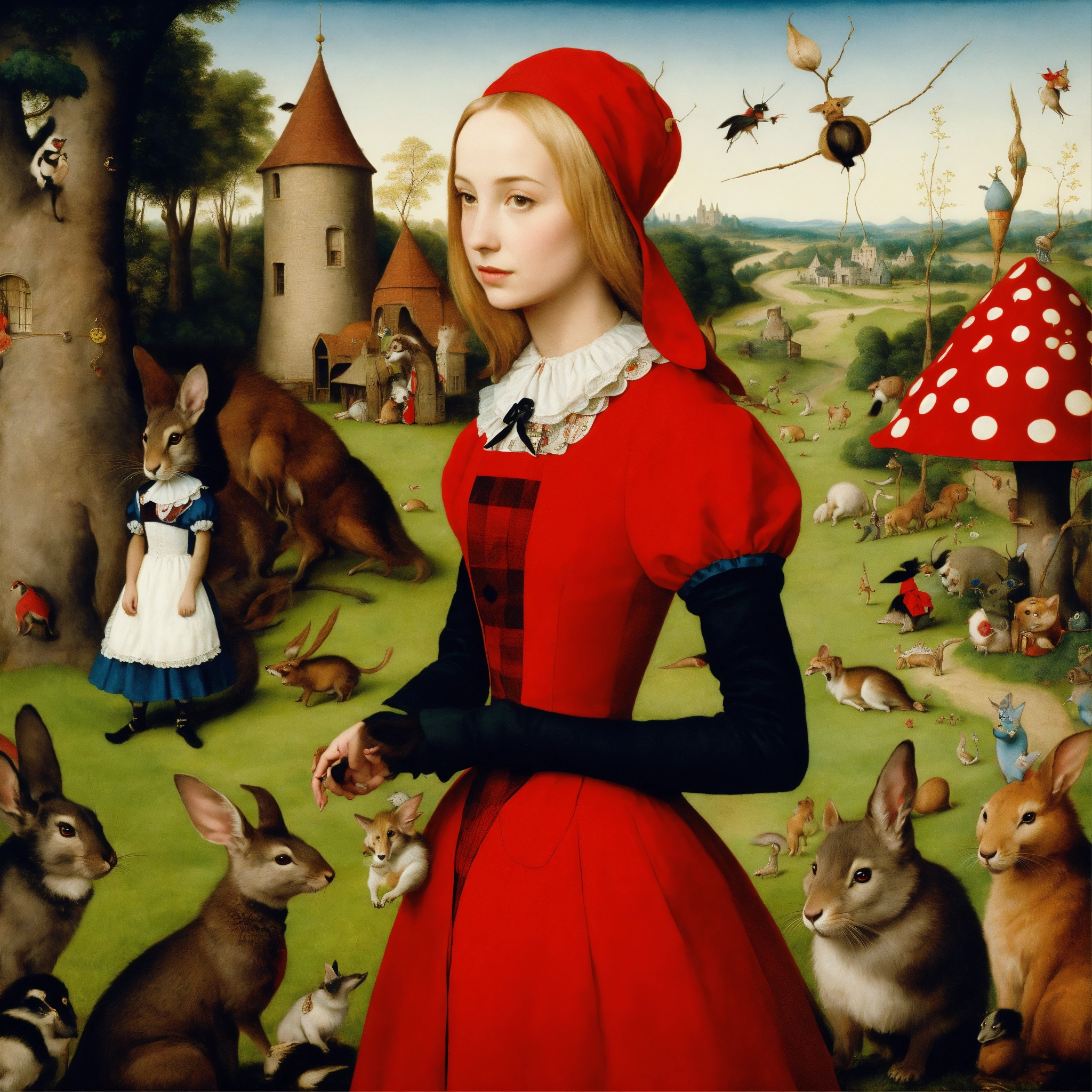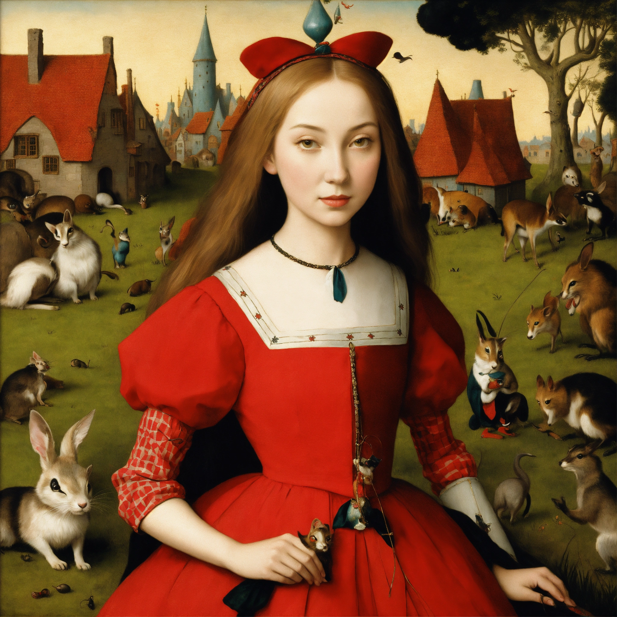 Alice in wonderland by hyueronimus bosch, and alice's queen in a strange village with strange animals, a close up of alice looking lovely into your eyes wearing red and black chequered top
