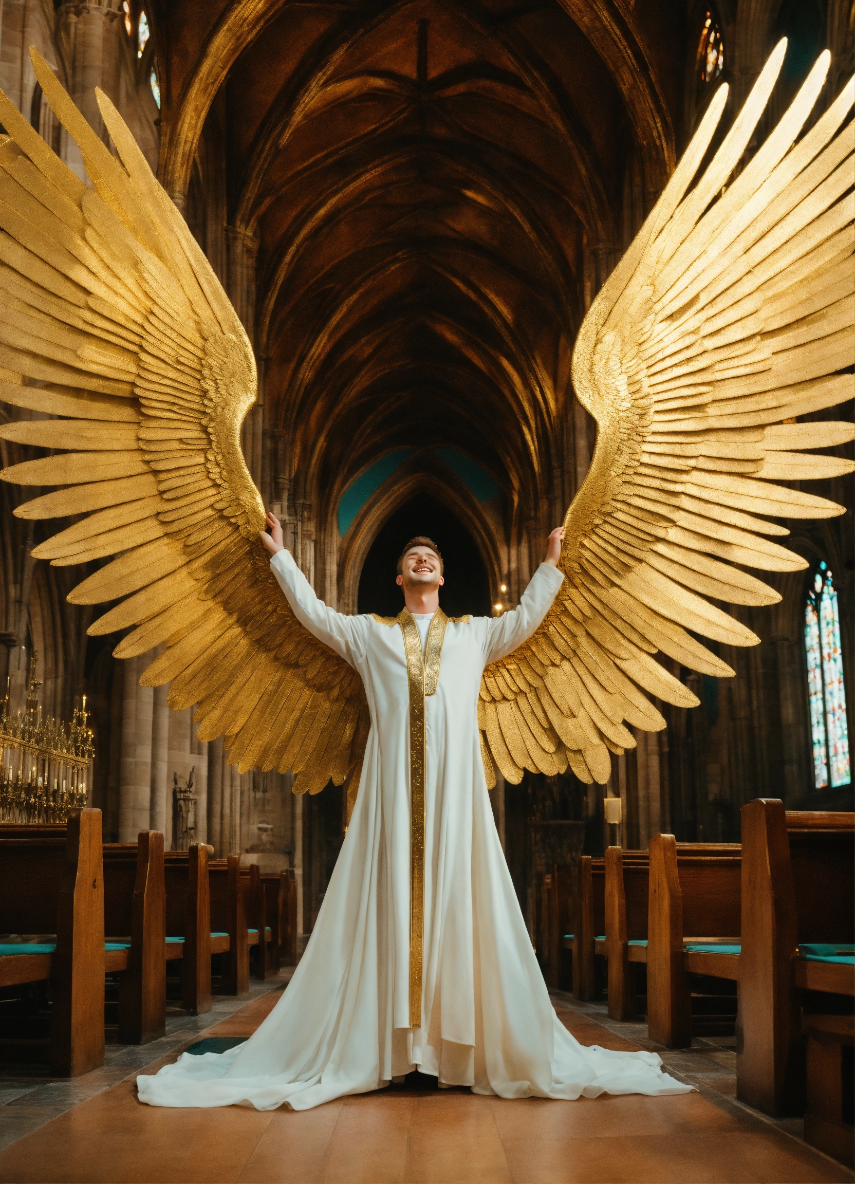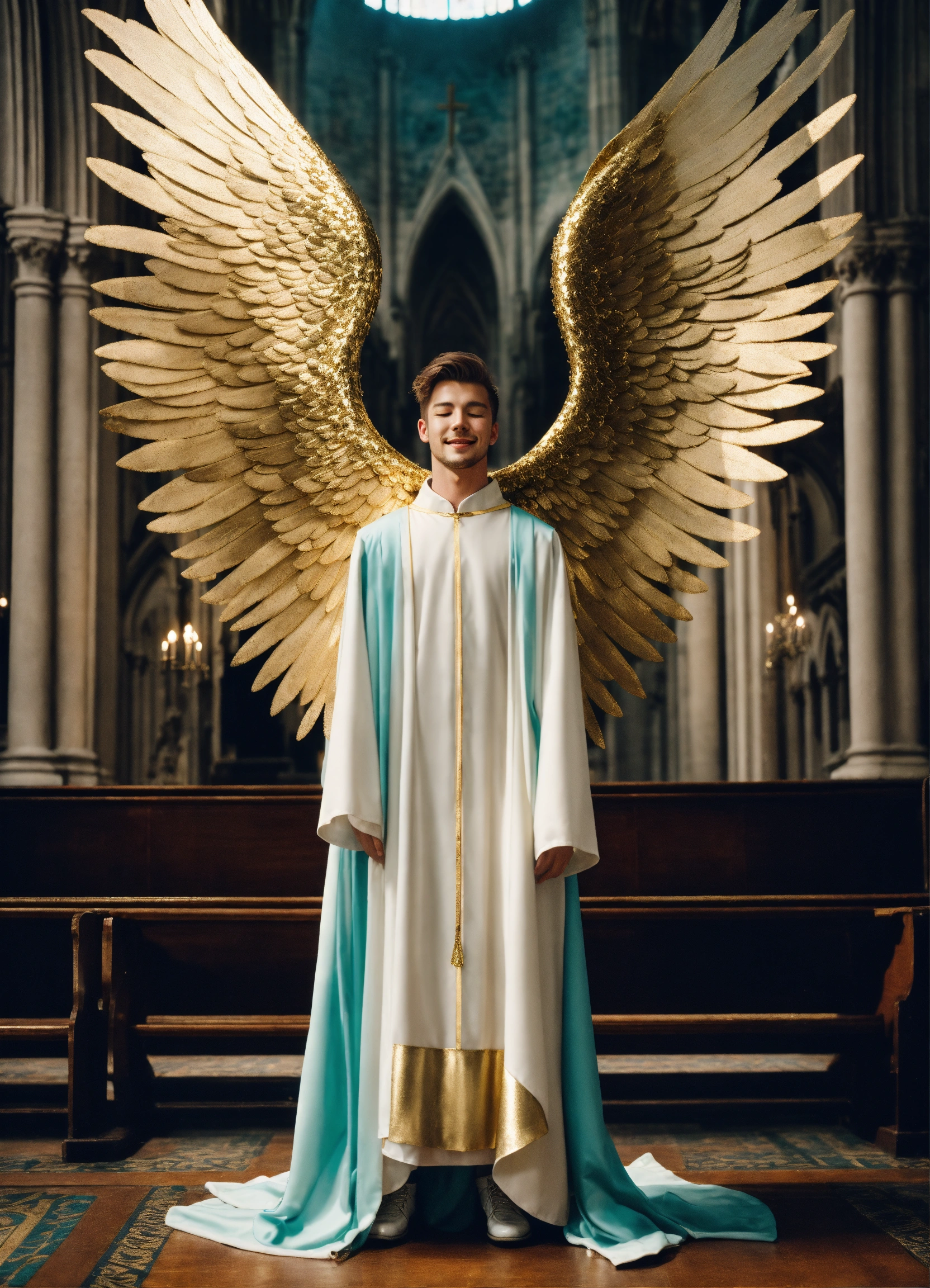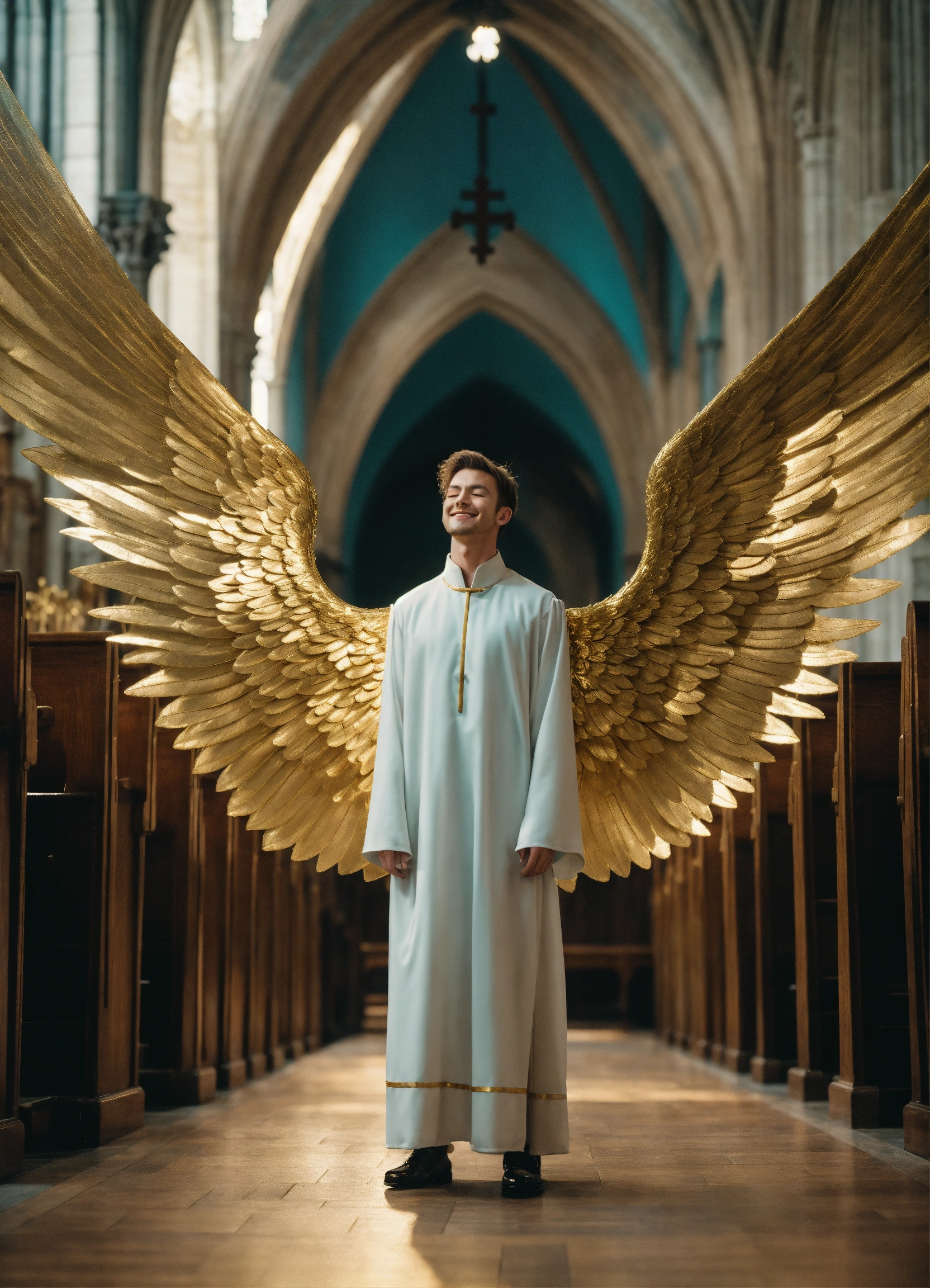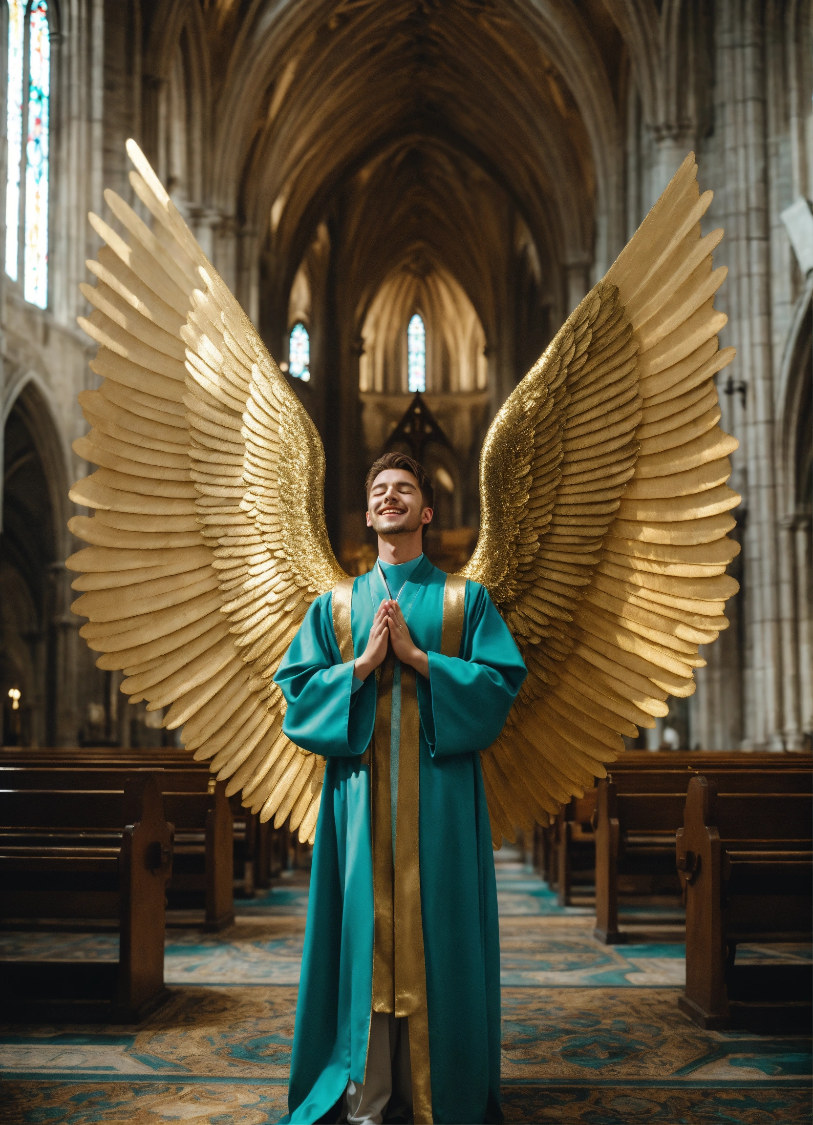 Iconoclastic surrealistic photo portrait of 25 year old masculine large supermodel white male joyous archangel, massive white wings attached to his back, gentle smile, short brown hair, eyes closed, praying, wearing futuristic teal and gold choir robes with high neckline, no chest showing, ethereal, symmetrical, iconic, fantasy magazine photoshoot by alessio albi, background is raining sparkling gold in a sunny cathedral with rows of wooden pews and sparkling magic. film grain.