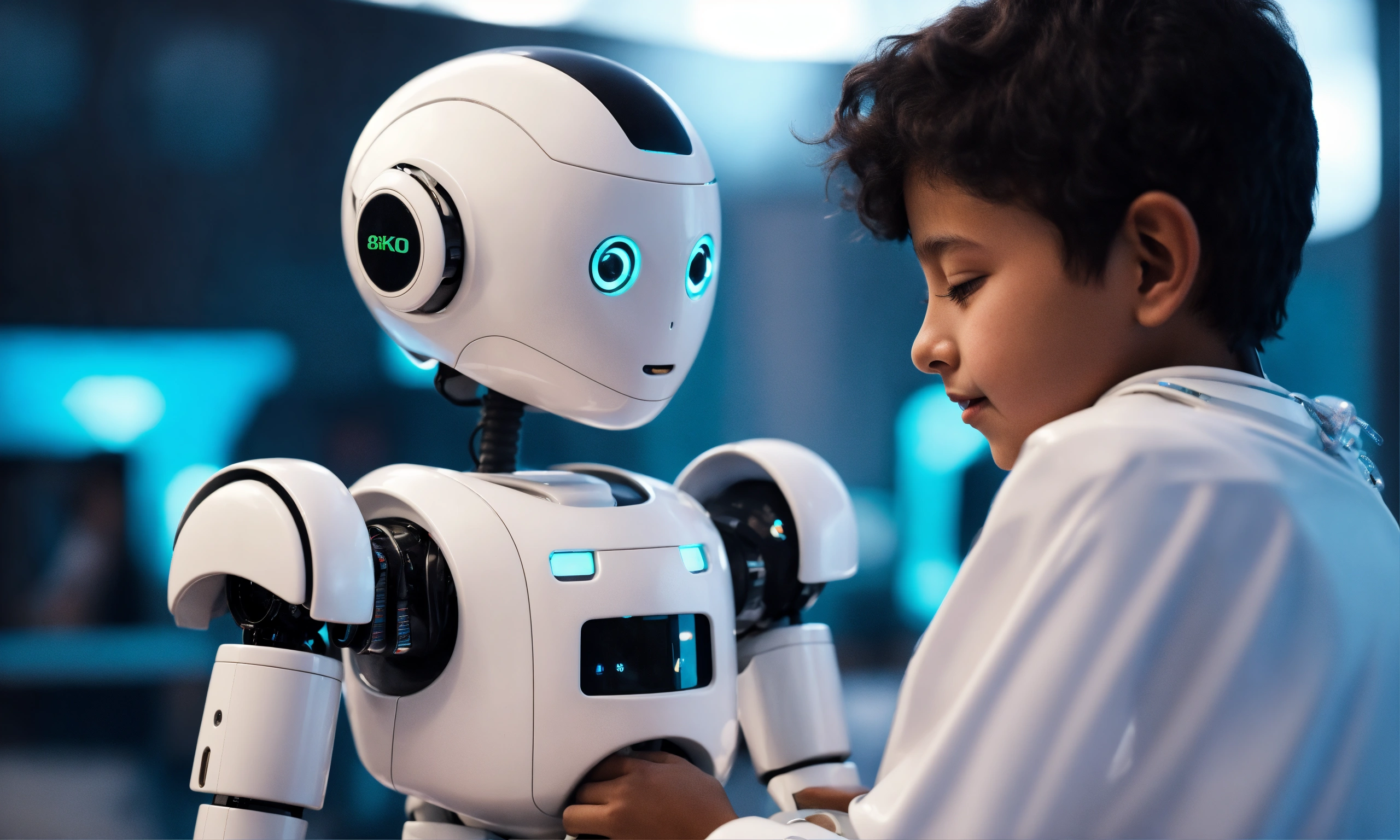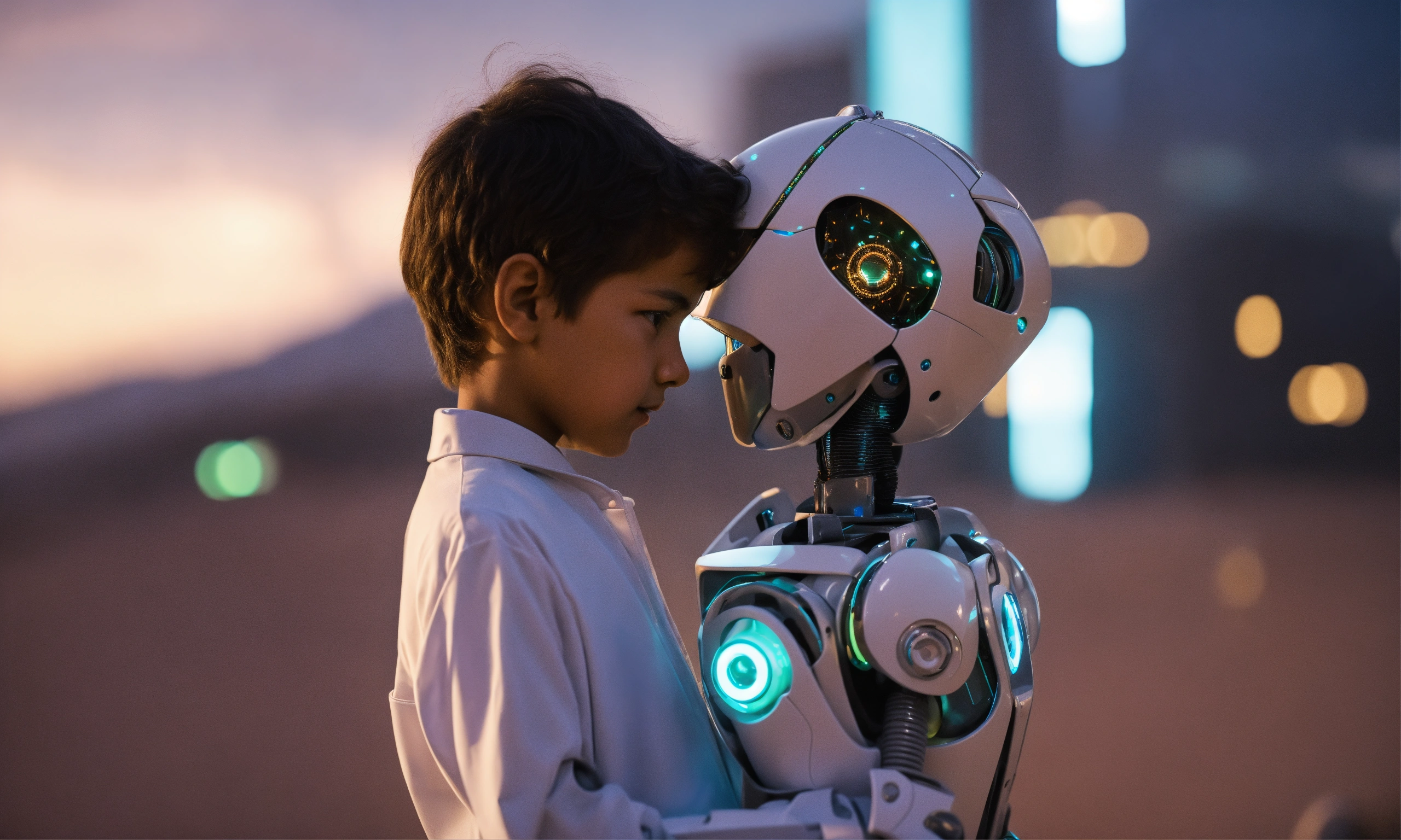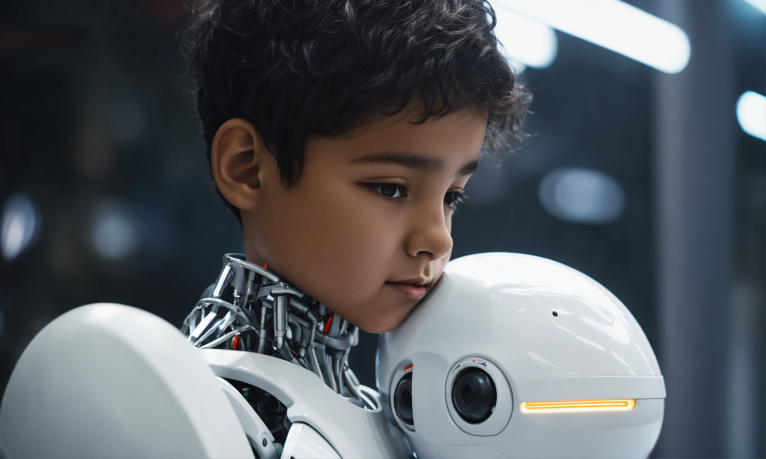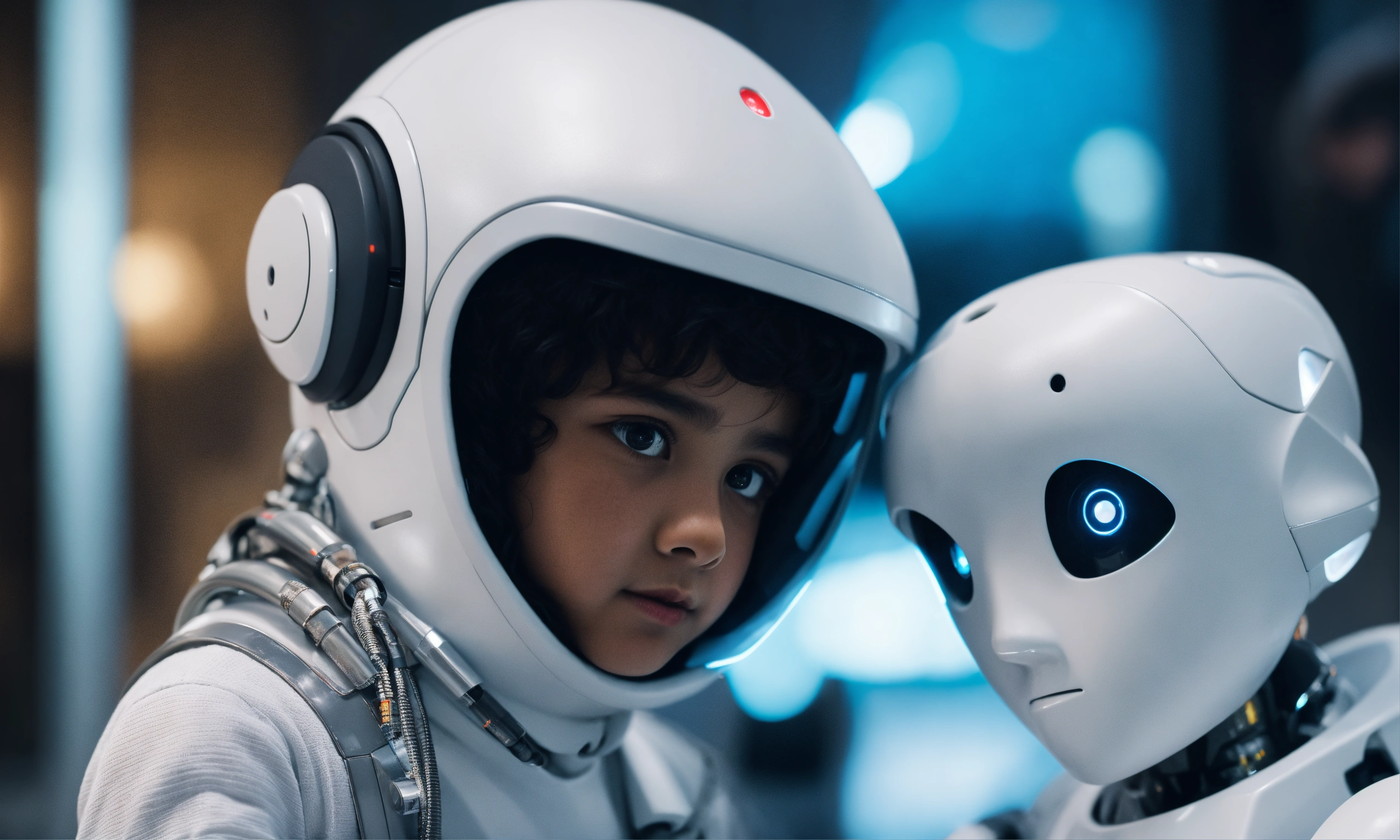 Close up of a saudi kid hugging his robot friend, white costume, photo-realistic, 8k, high definition