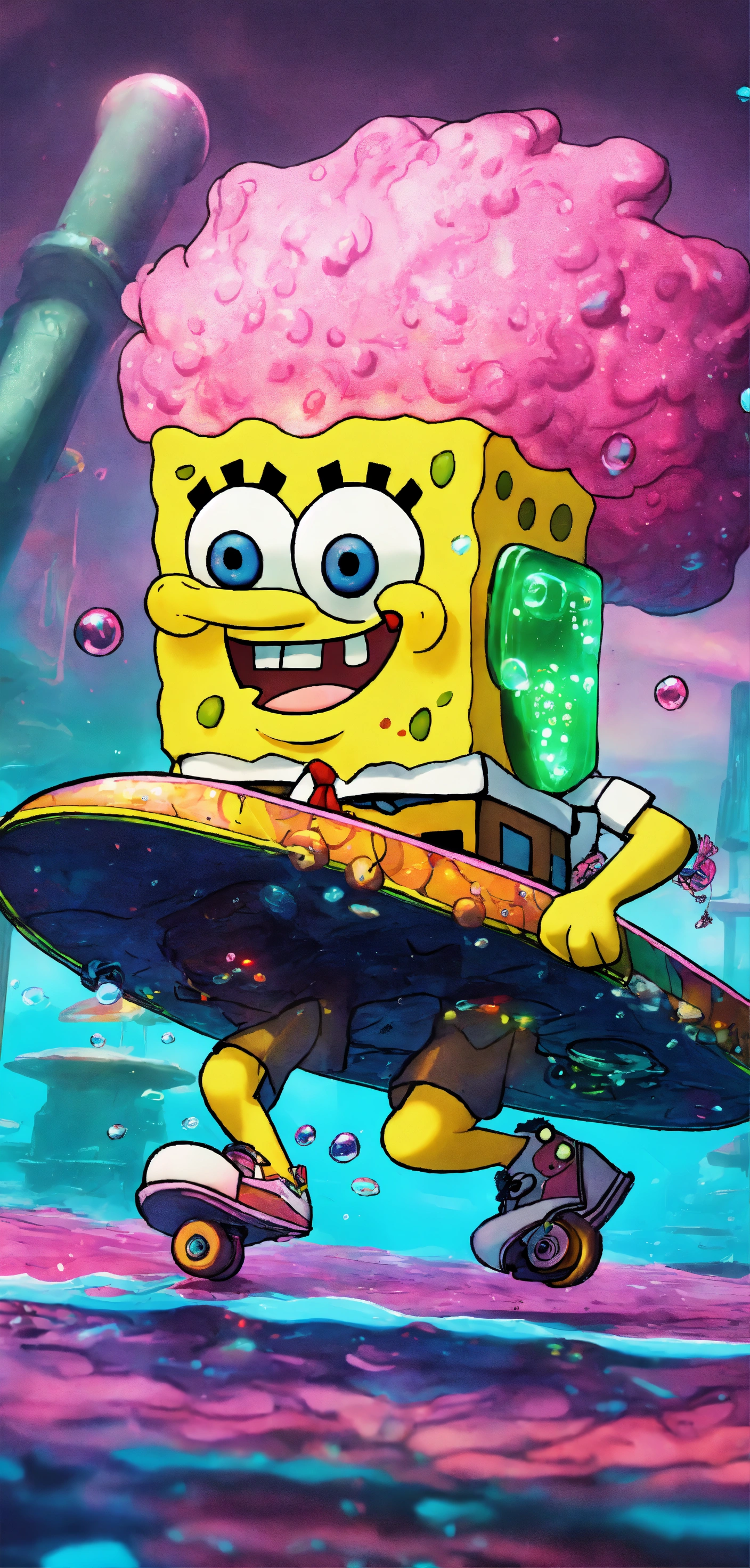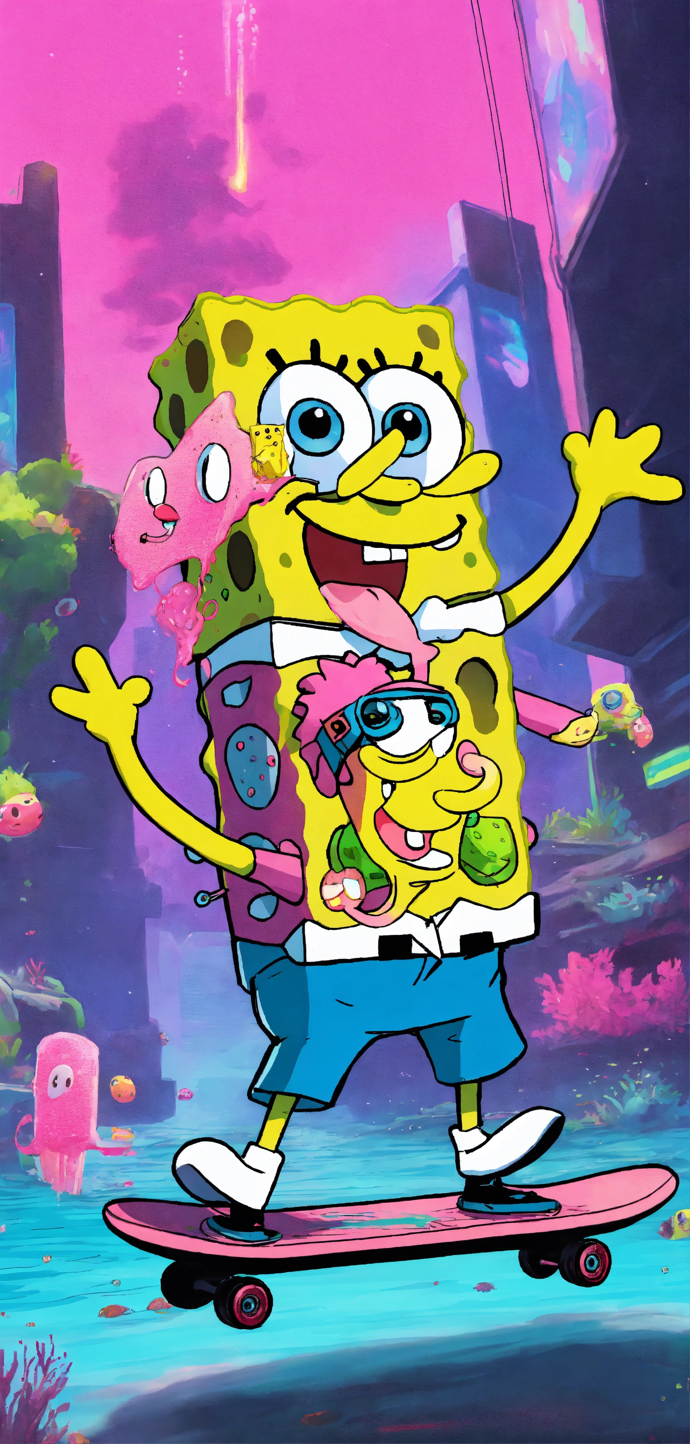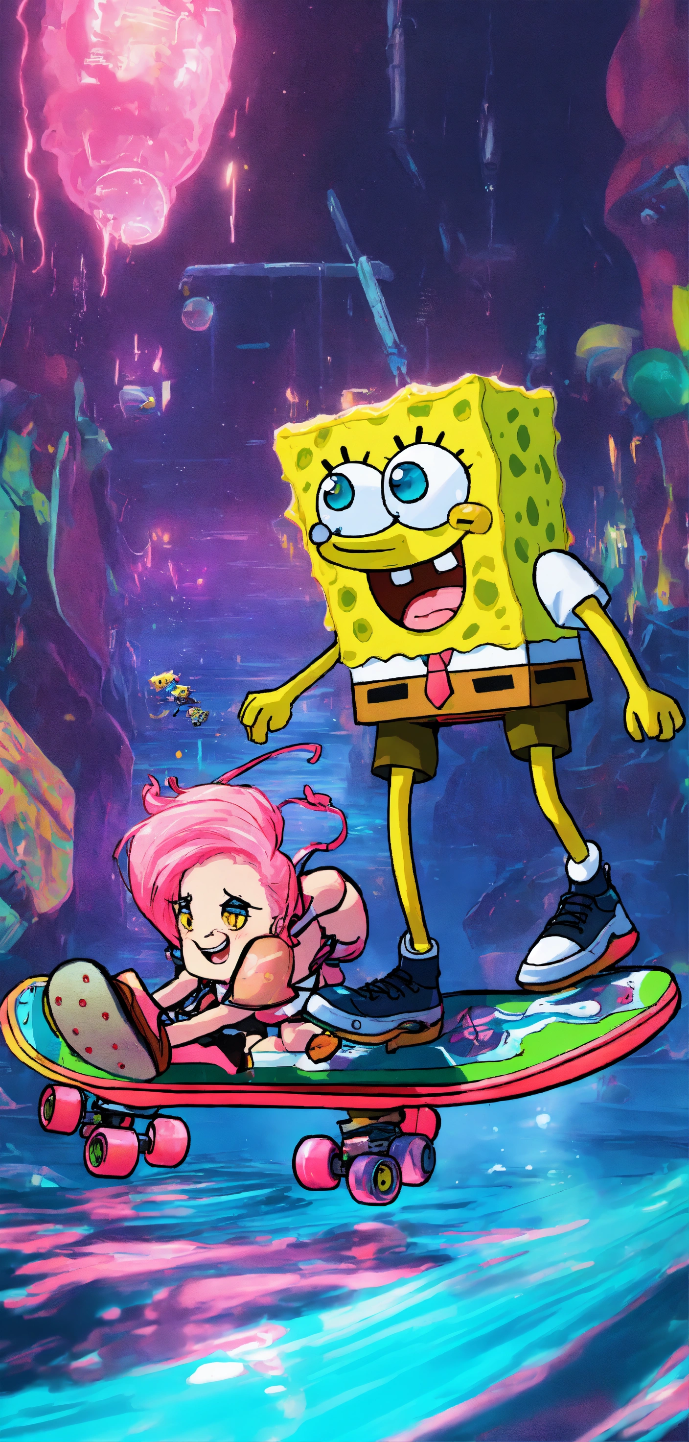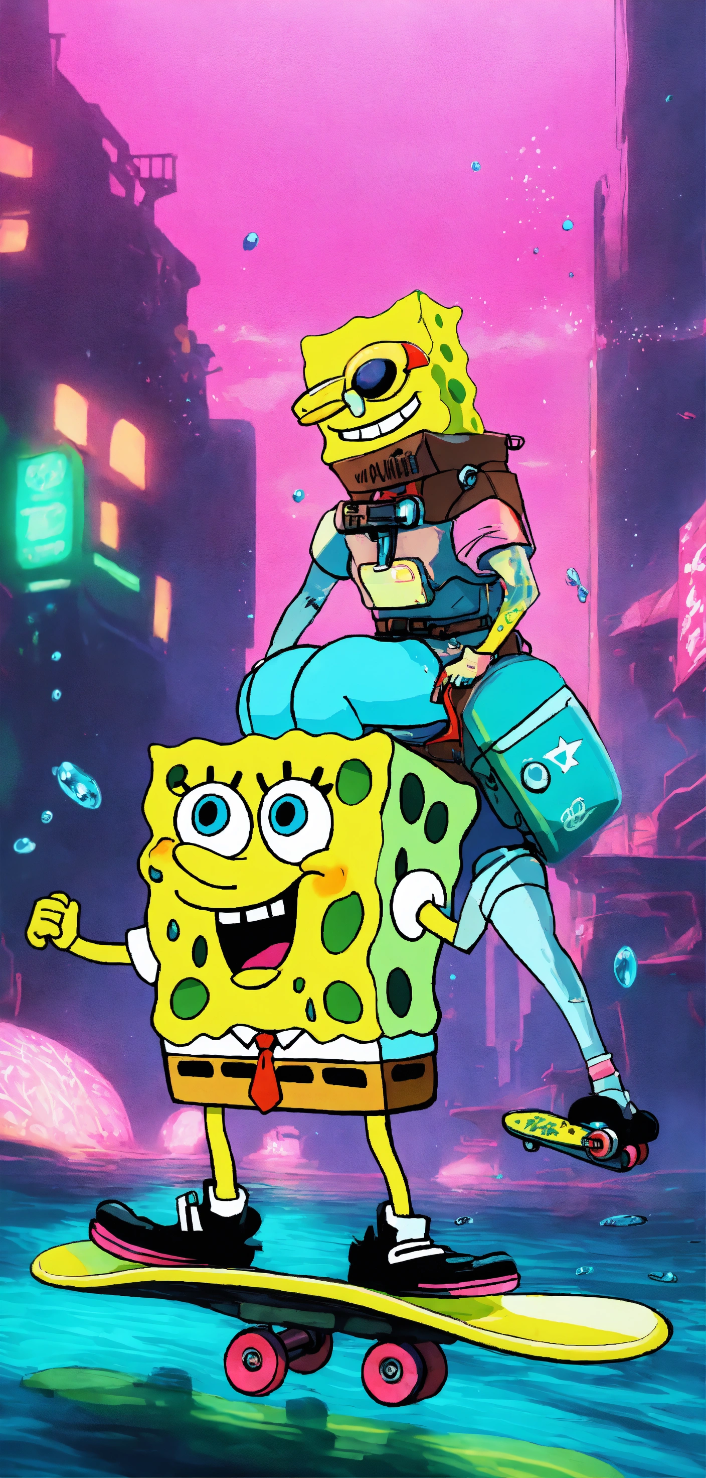 Cyberpunk spongebob and patrick with neon hair riding a futuristic skateboard underwater