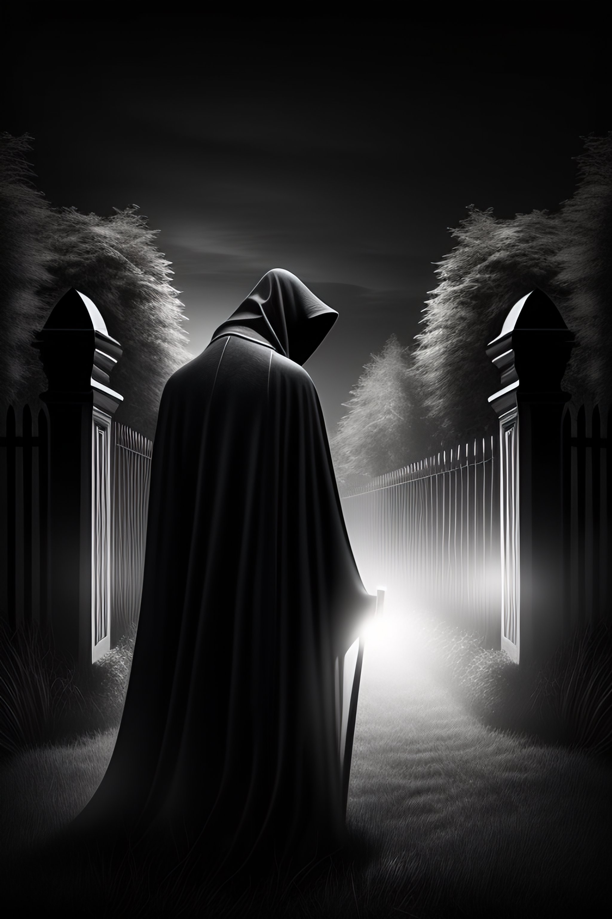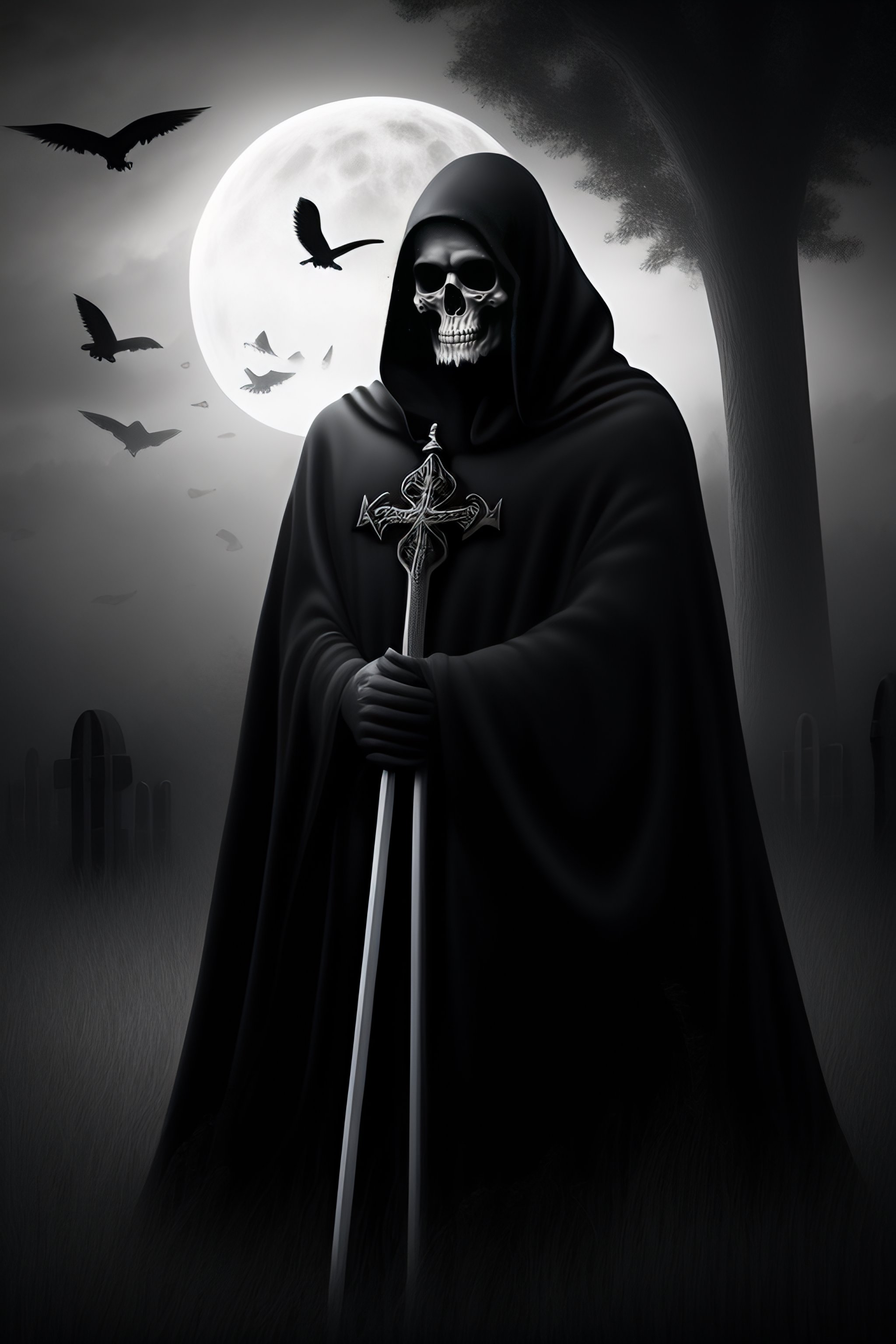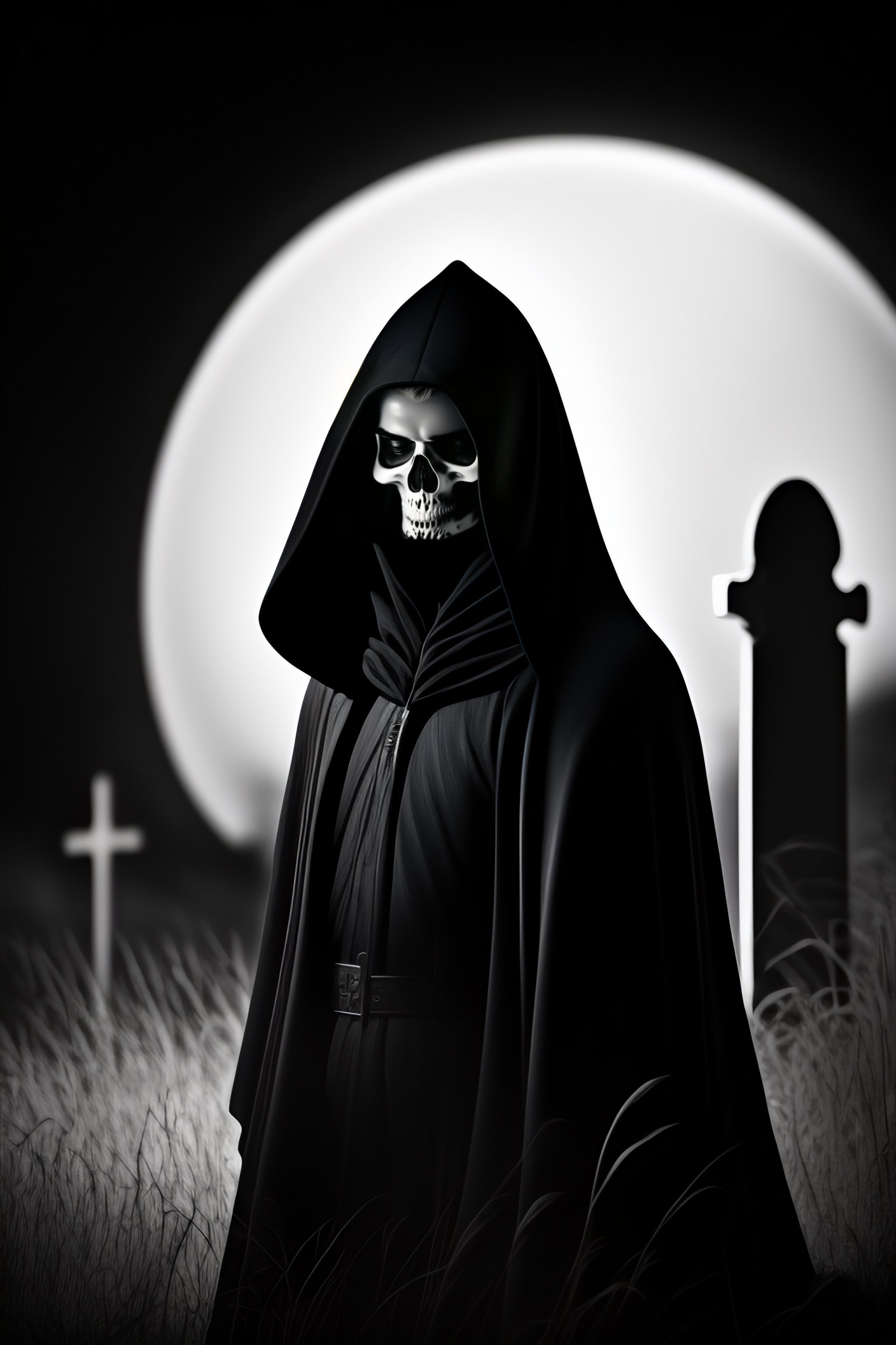 Black and white portrait of the grim reaper in a graveyard, dark and scary night, realistic, detailed, horror, spooky, terror