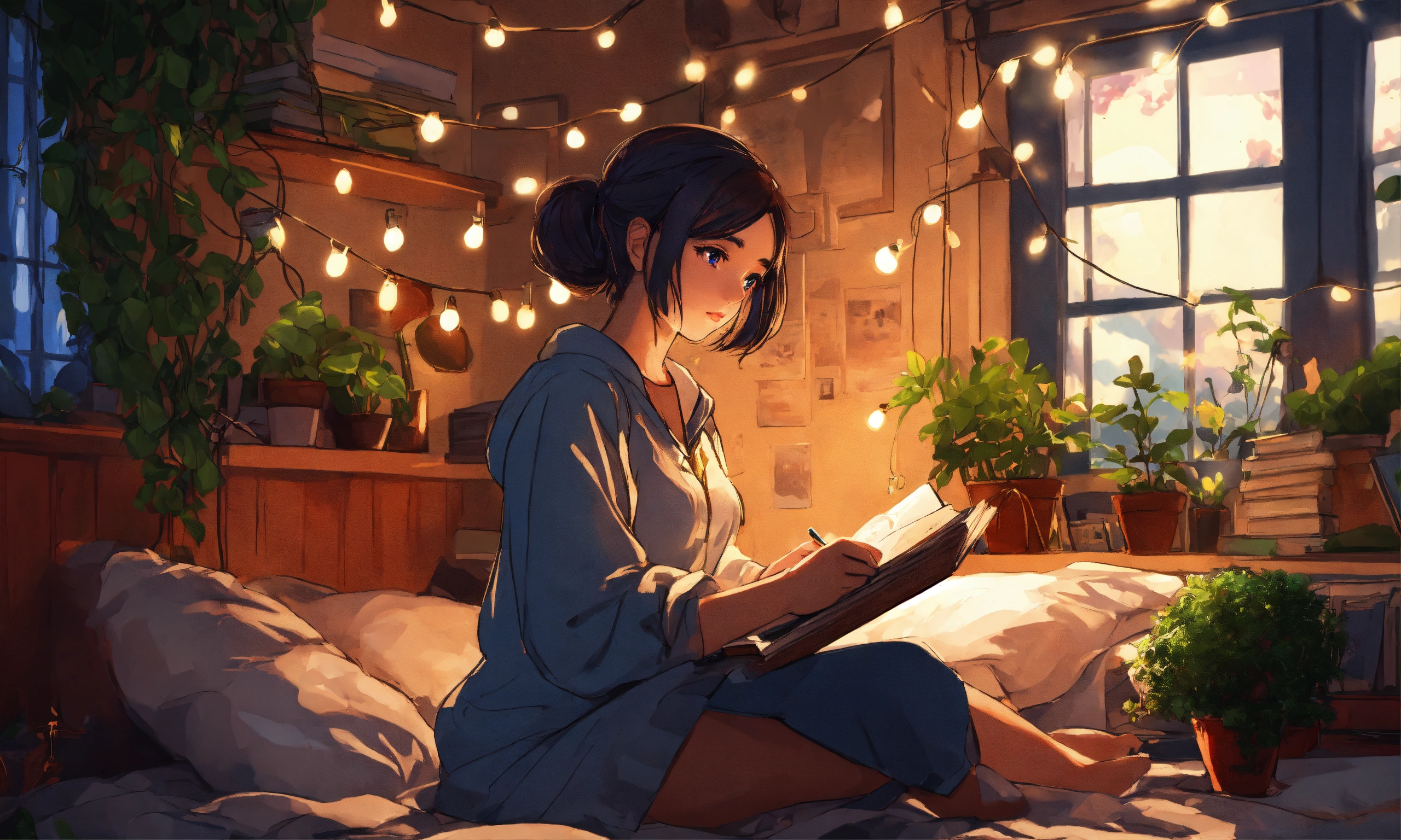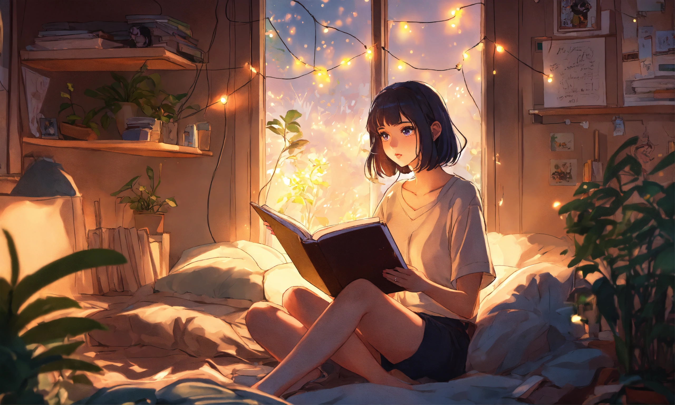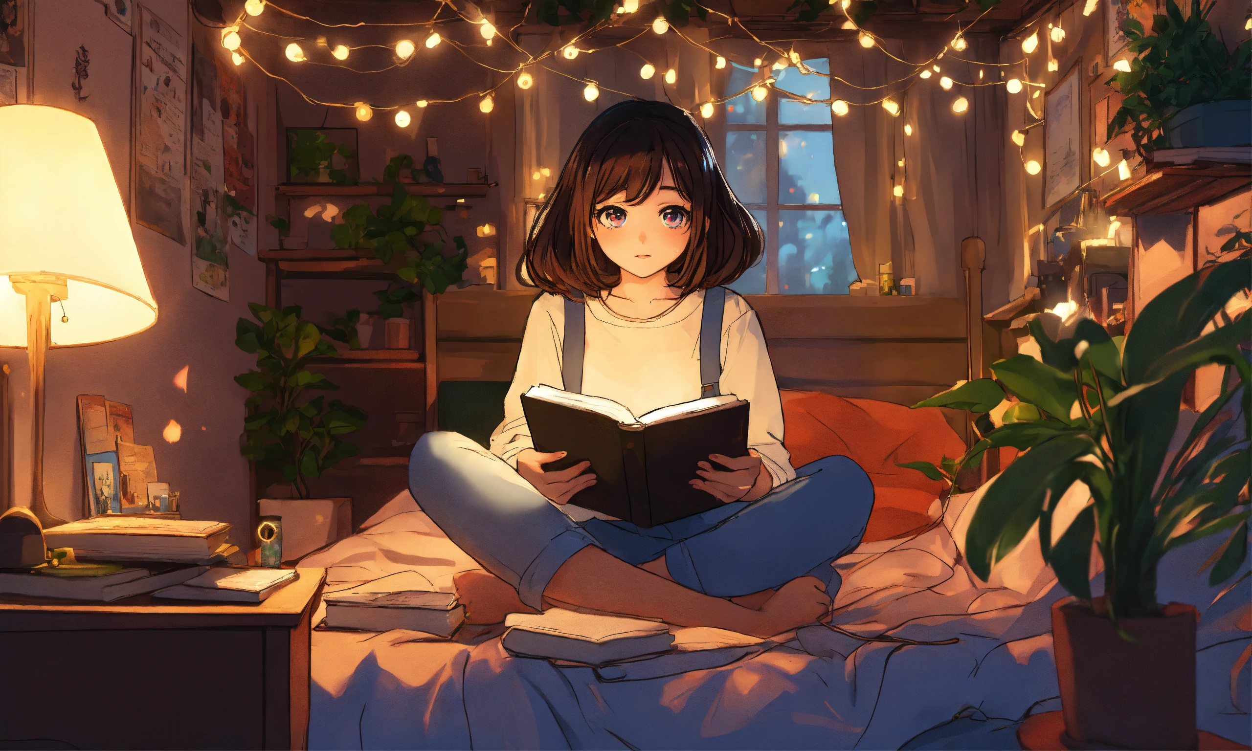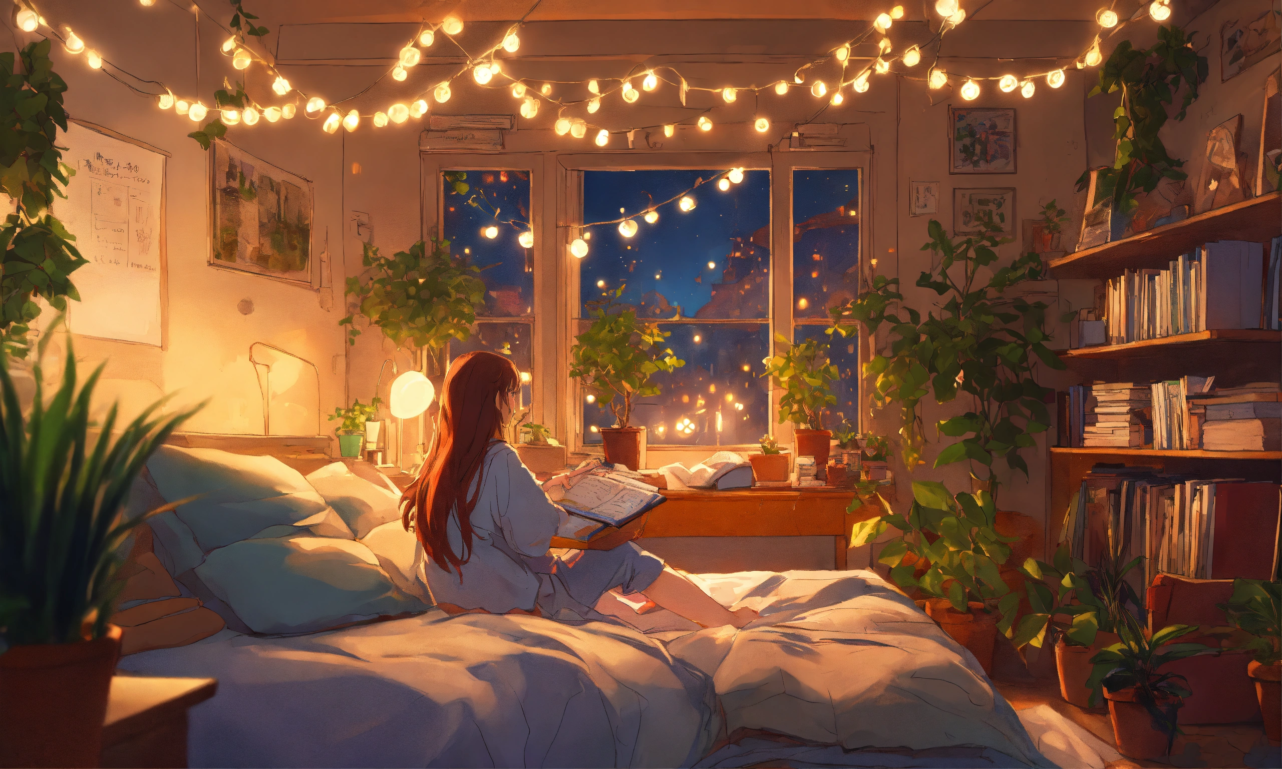 Stunning lofi college anime woman with big disney eyes studying in a messy cozy bedroom sitting on her bed reading, realistic, highly detailed, lots of string lights, plants, highly detailed, studio ghibl