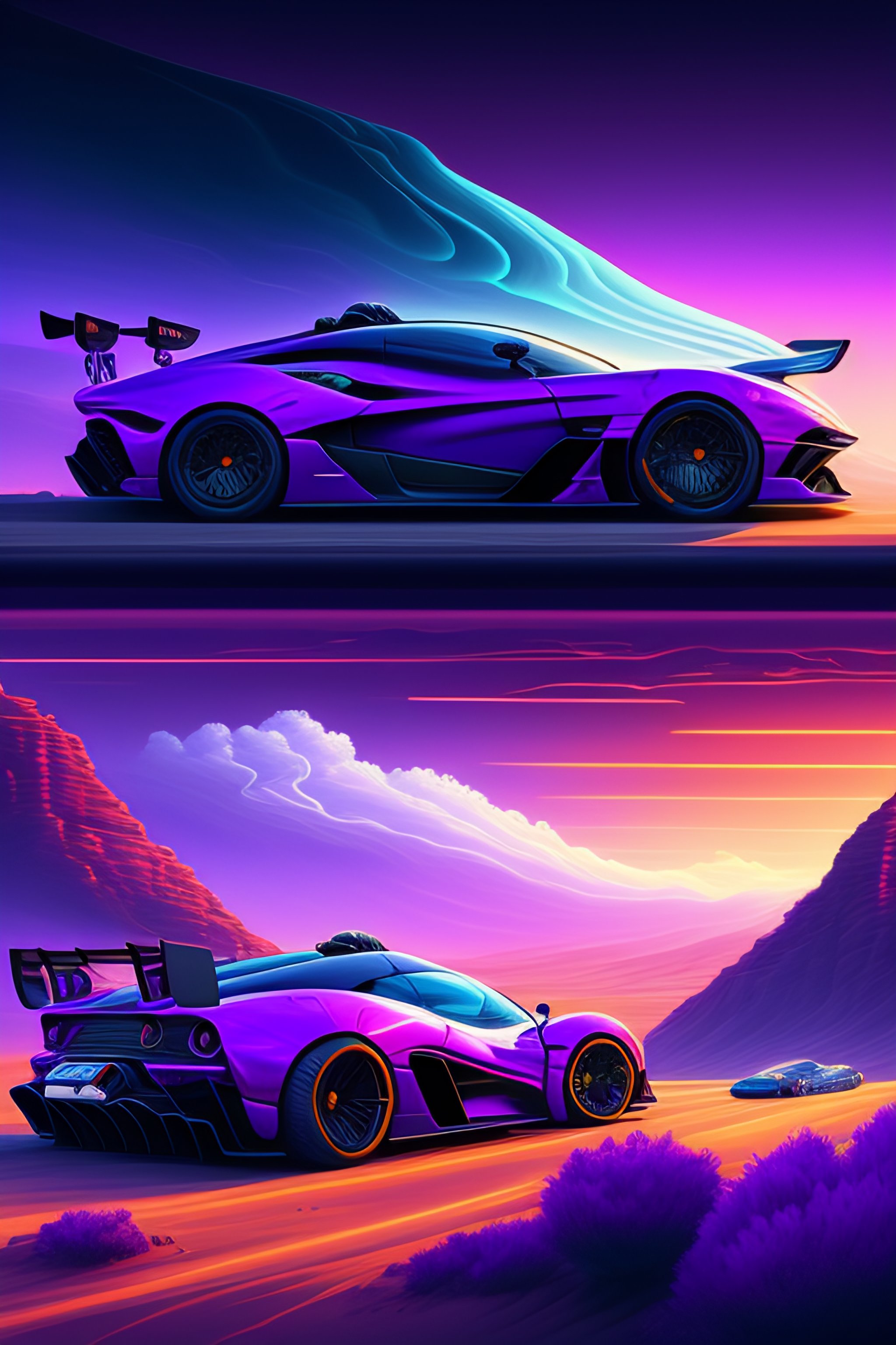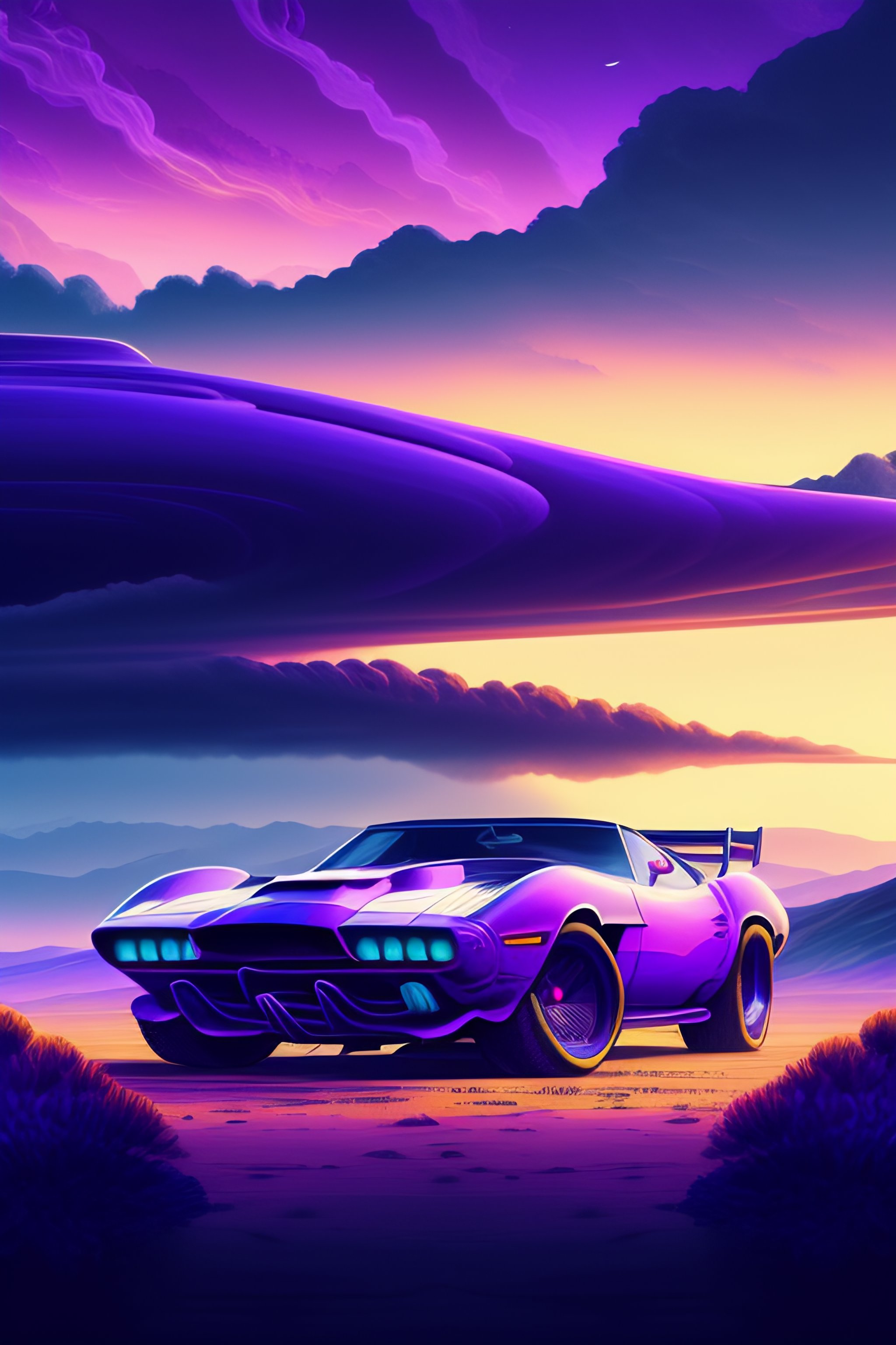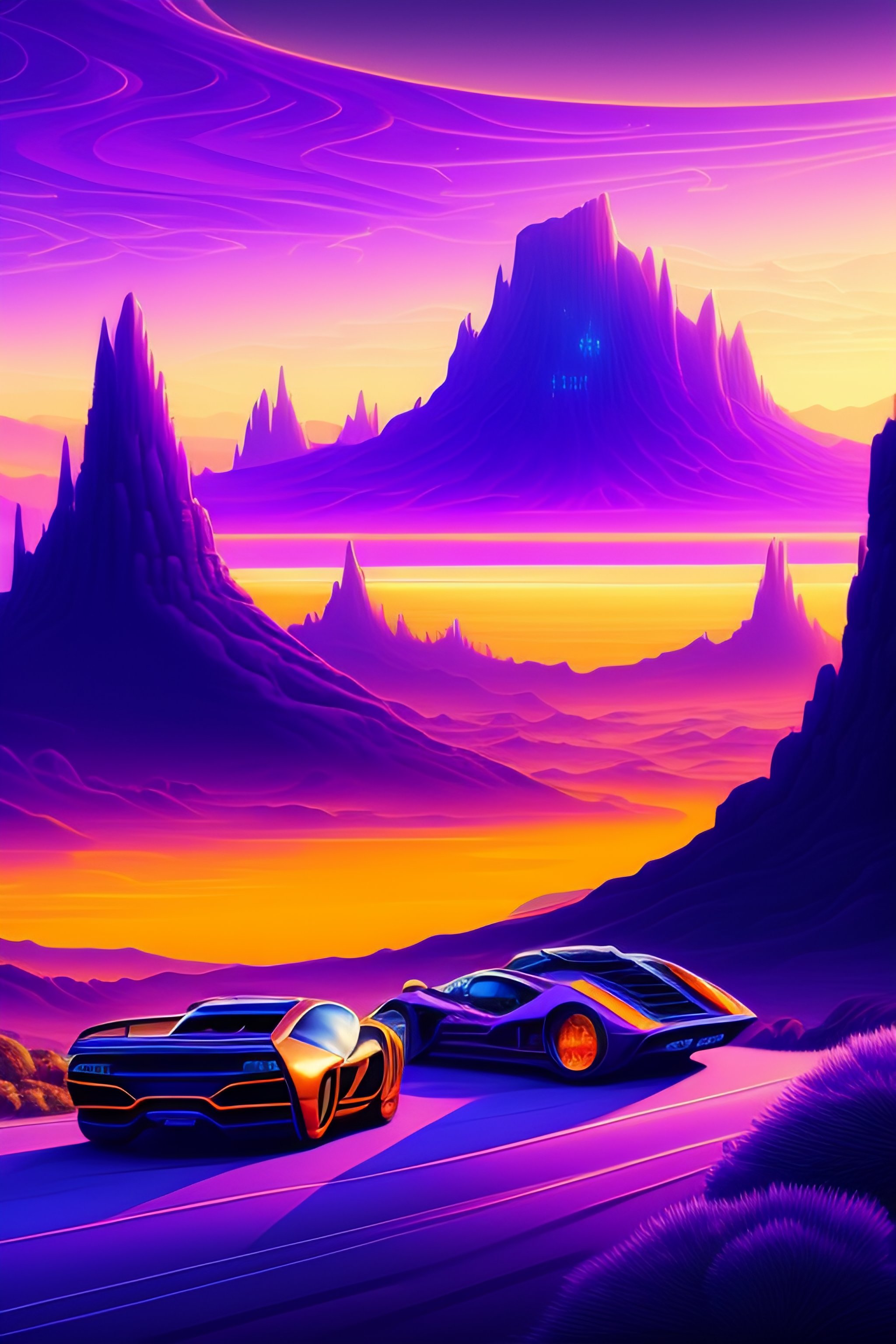 Illustration of super cars by dan mumford, alien landscape and vegetation, epic scene, a lot of swirling clouds, high exposure, highly detailed, fantastical, vibrant purple tinted colors, uhd
