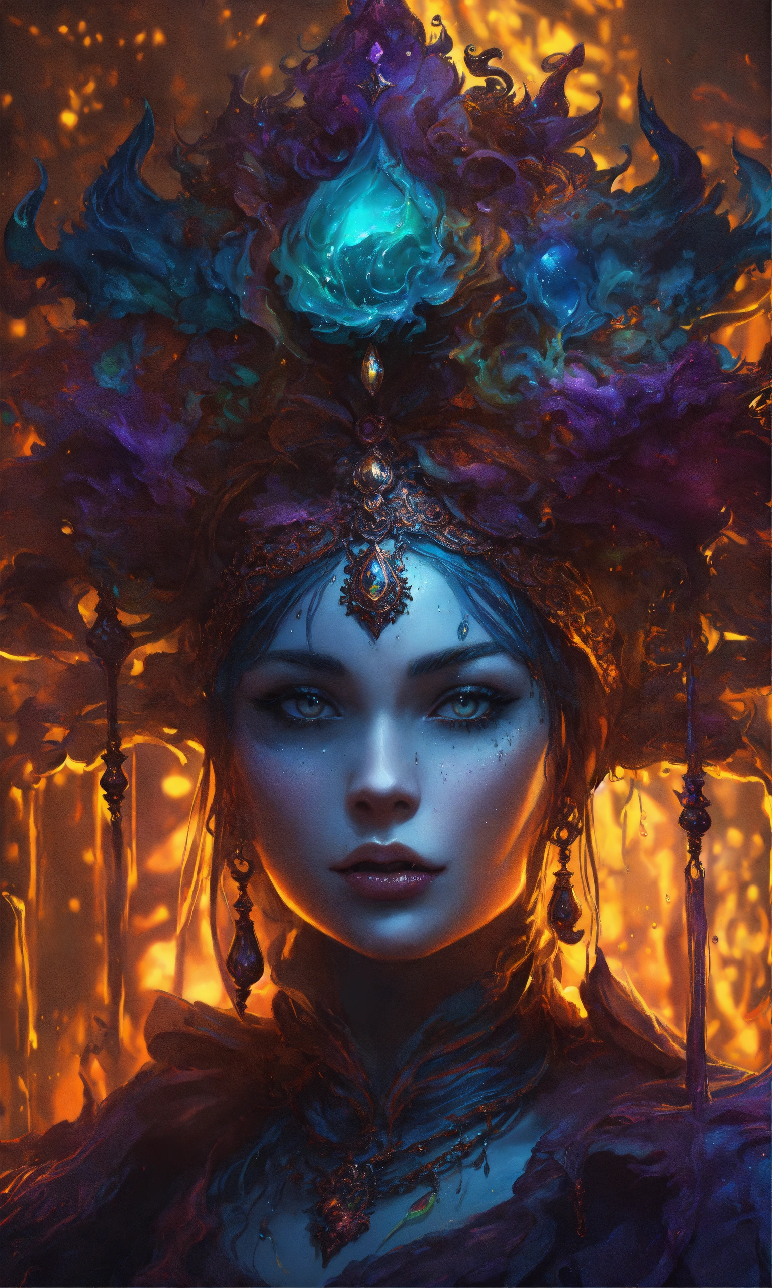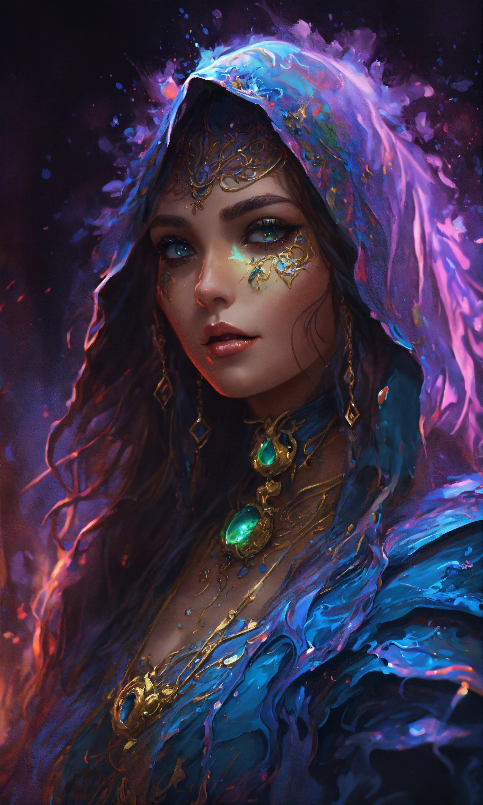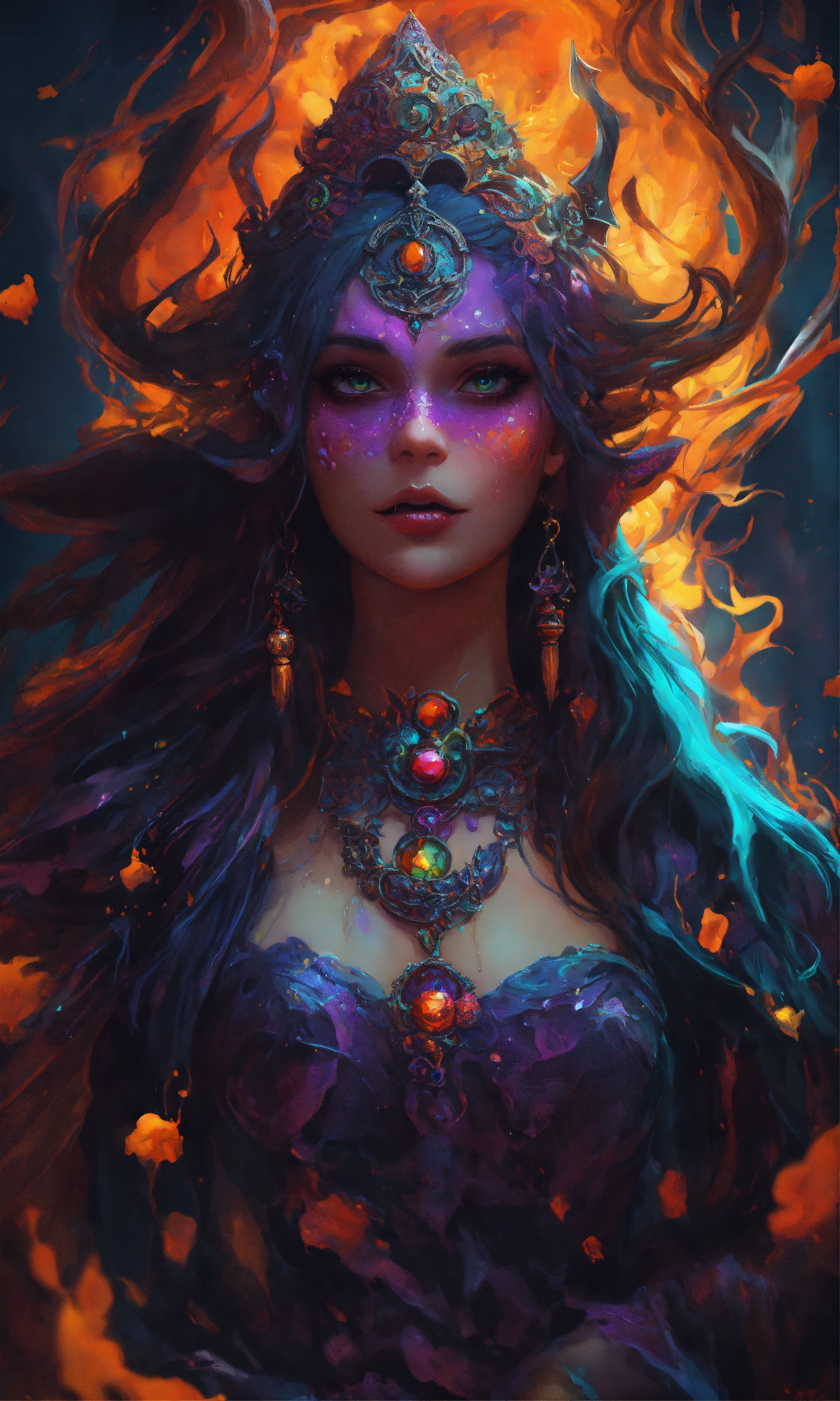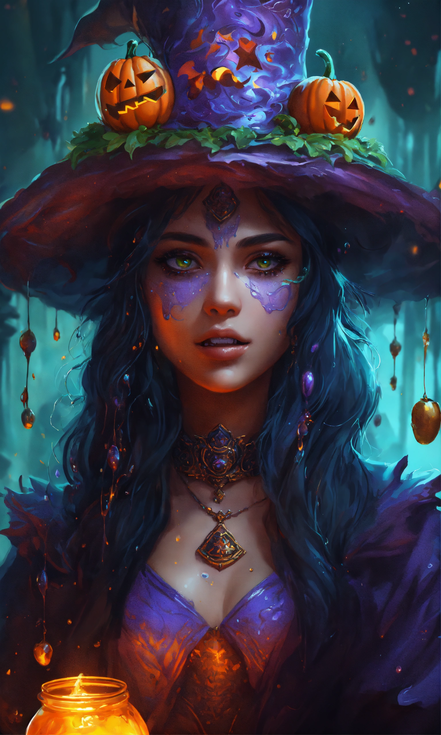 Splash art, a quirky liquid portrait of a hauntingly beautiful shadowy sorceress with fangs, splash style of paint, pixar style, halloween colors, hyper detailed intricately detailed, fantastical, intricate detail, splash screen, liquid, gooey, slime, splashy, fantasy, concept art, 8k resolution, masterpiece, melting, complex background, intricate detailed, dark colors, fantasy, concept art, digital art, intricate, oil on canvas, masterpiece, expert, insanely detailed, 4k resolution.
