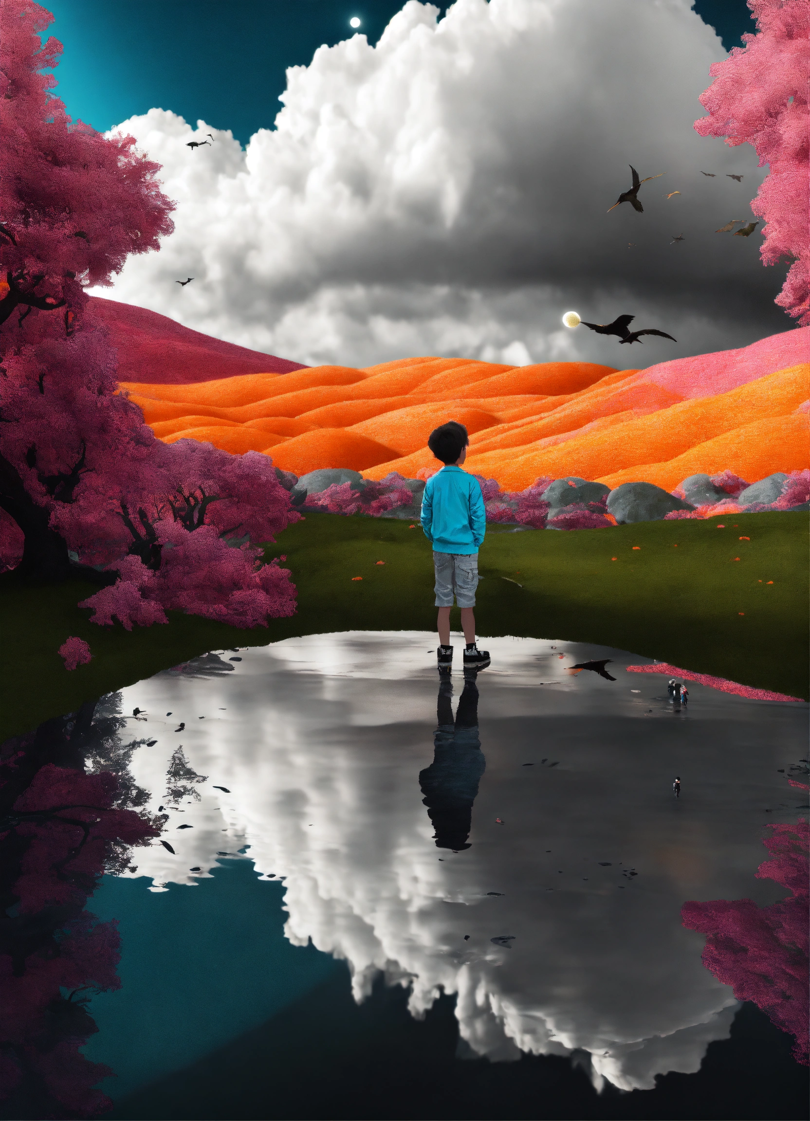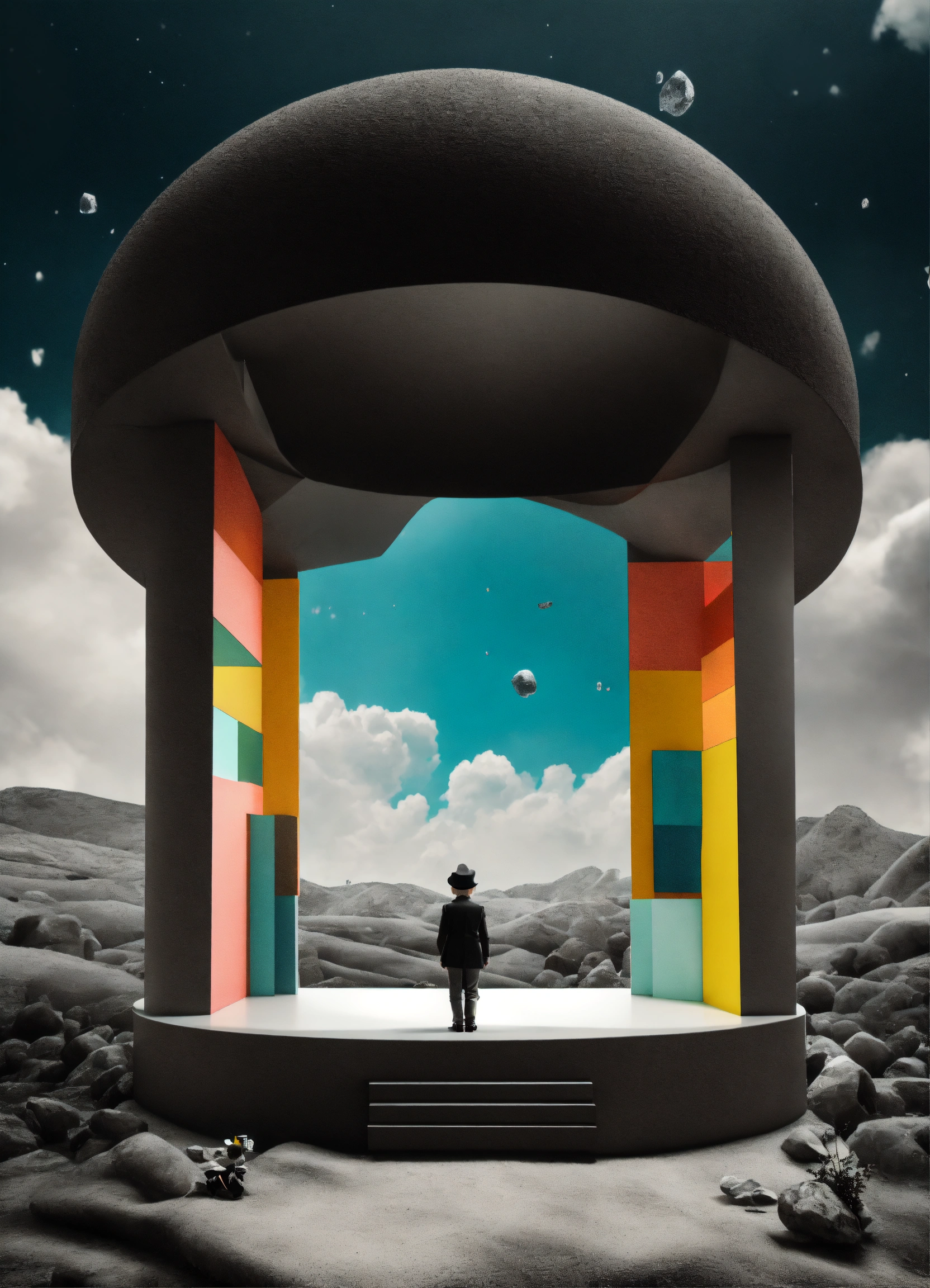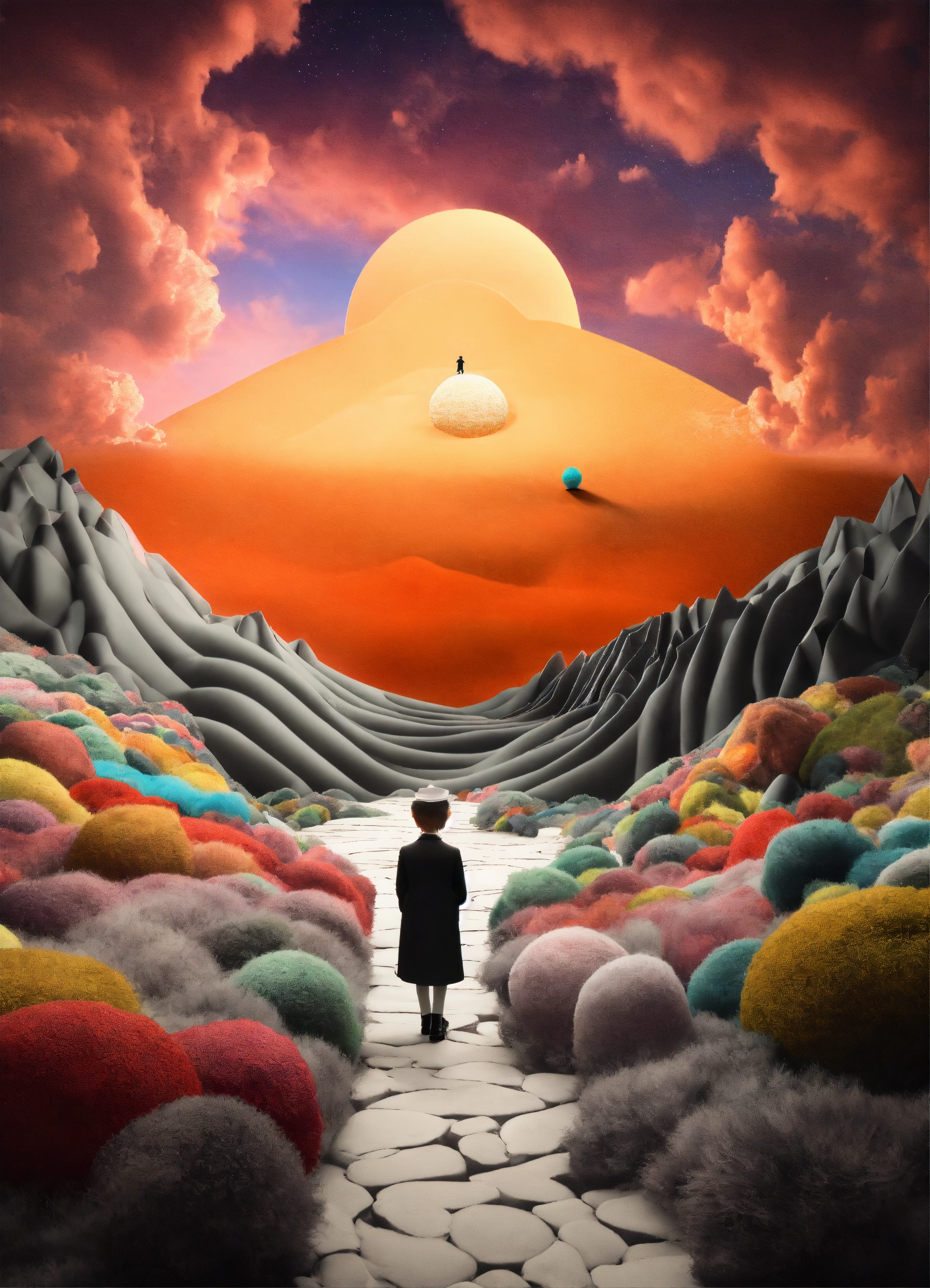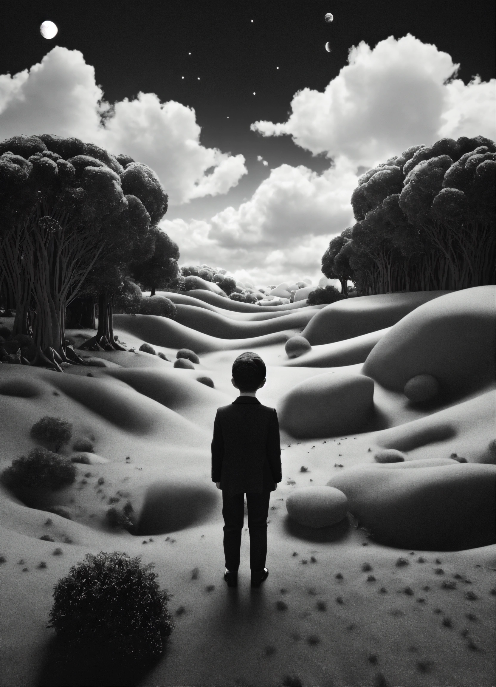 Black and white and colors, 3d surreal, hand-made modeling landscape, child contemplating, immersive-inspired landscape, inside and out dreams, rene magritte inspiration