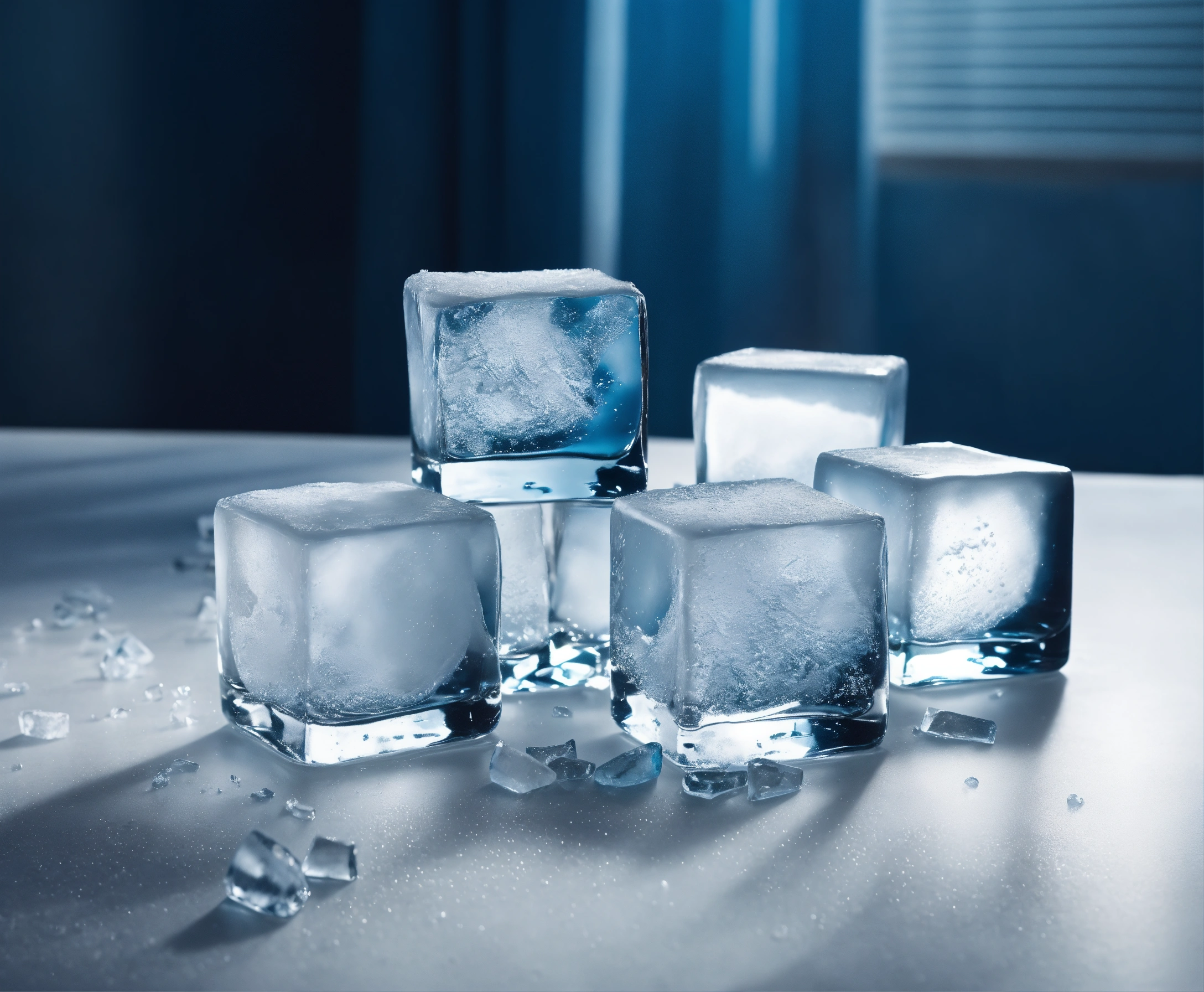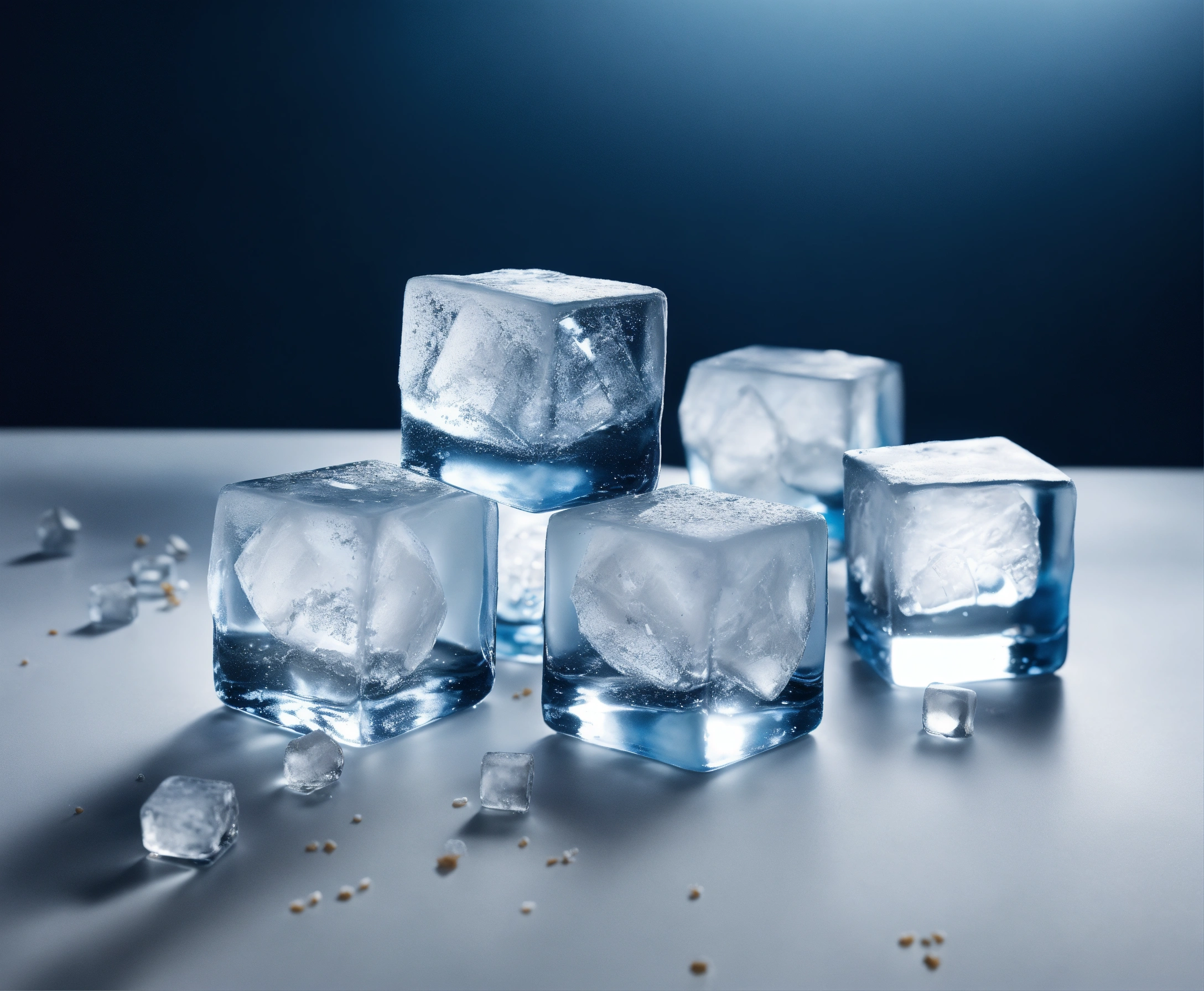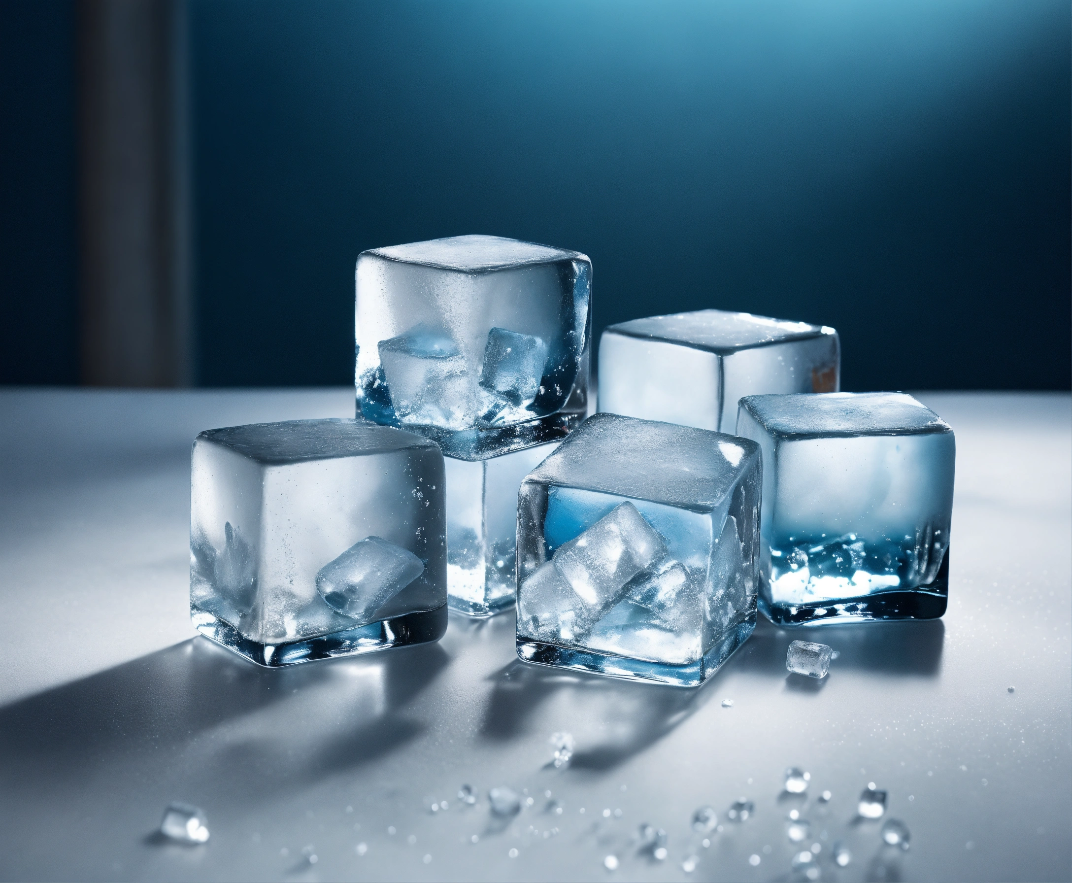 Create a captivating description in english for a stunning 3d still life of ice cubes arranged in a pristine white setting