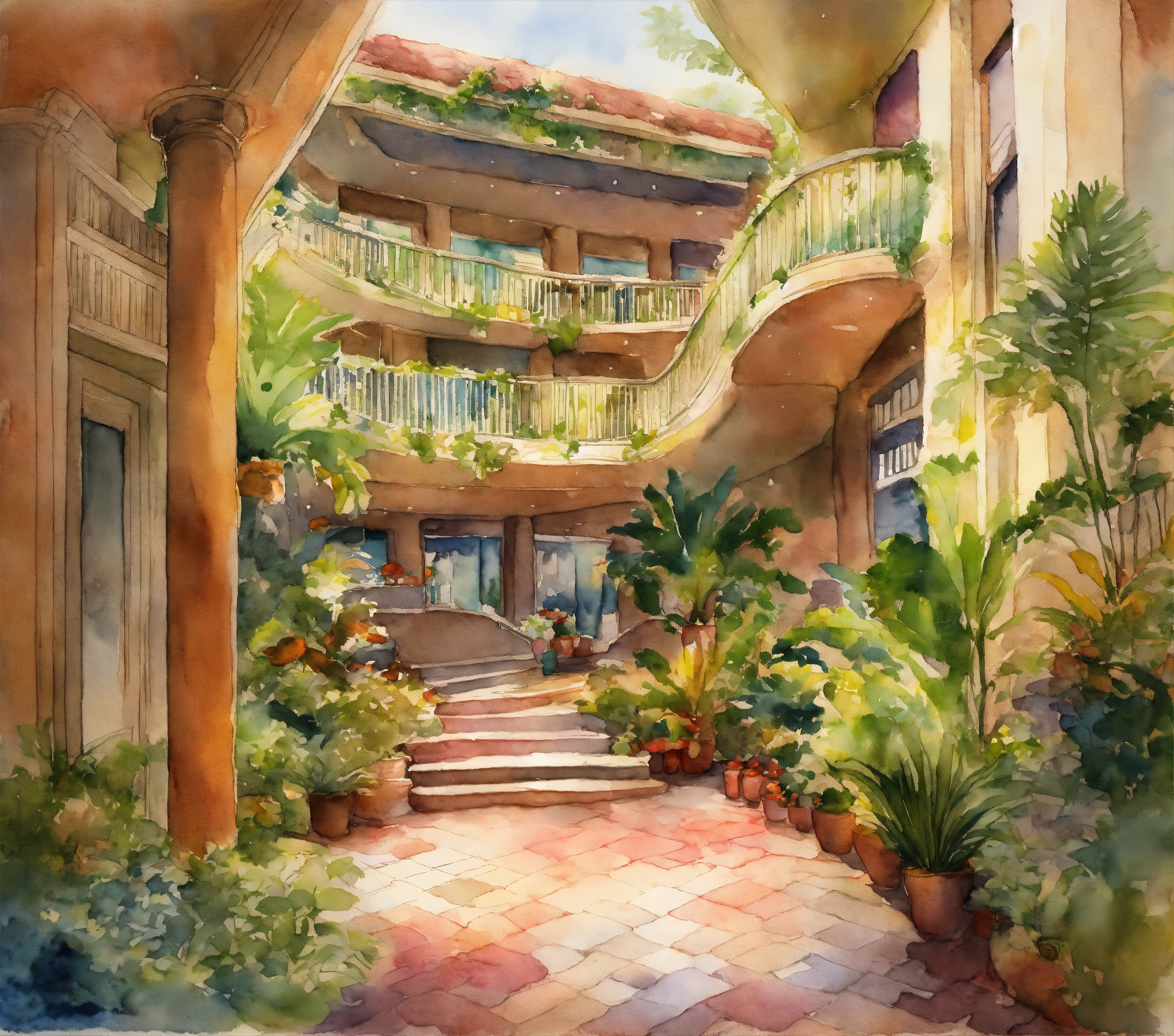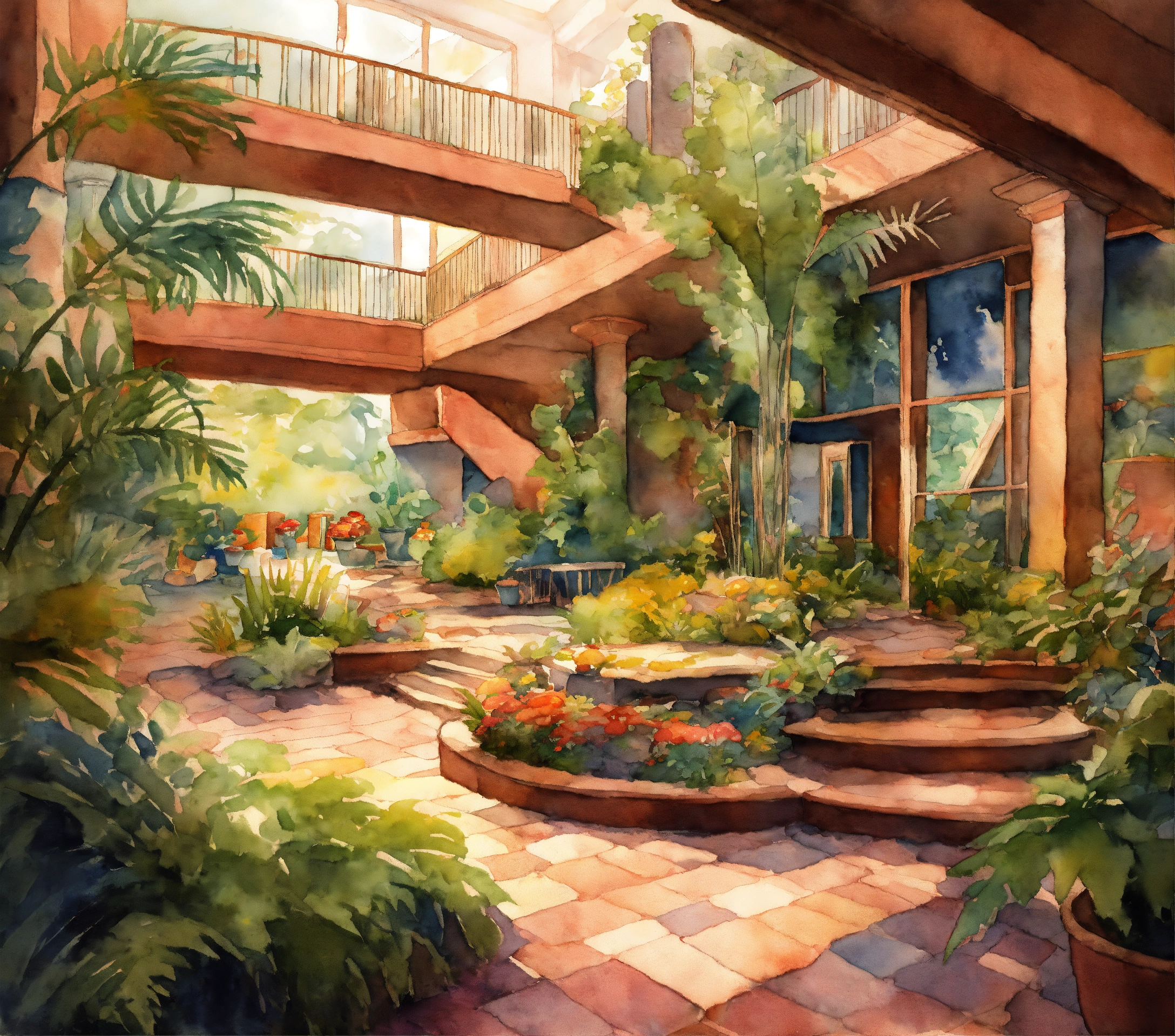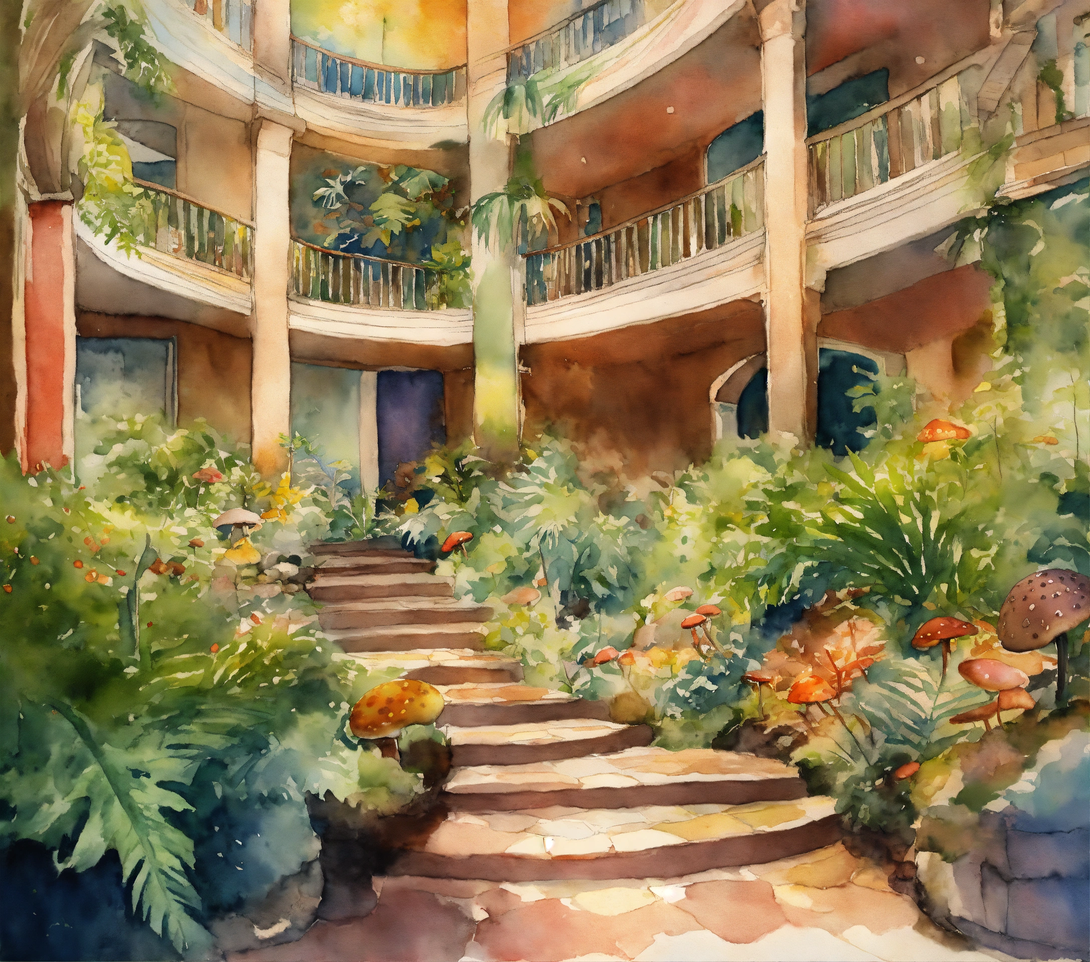 A cobblestone pathway winding through a hotel atrium filled with a colorful arrays of fern and palm varieties with undergrowth of glowing moss and muted colored cartoonish mushrooms with overlooking rounded balconies, watercolor cinematic ambiance