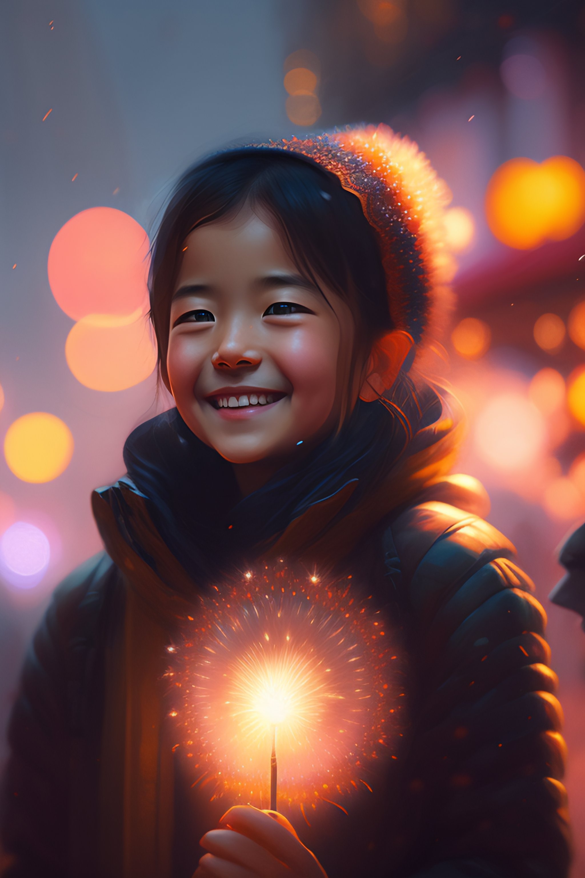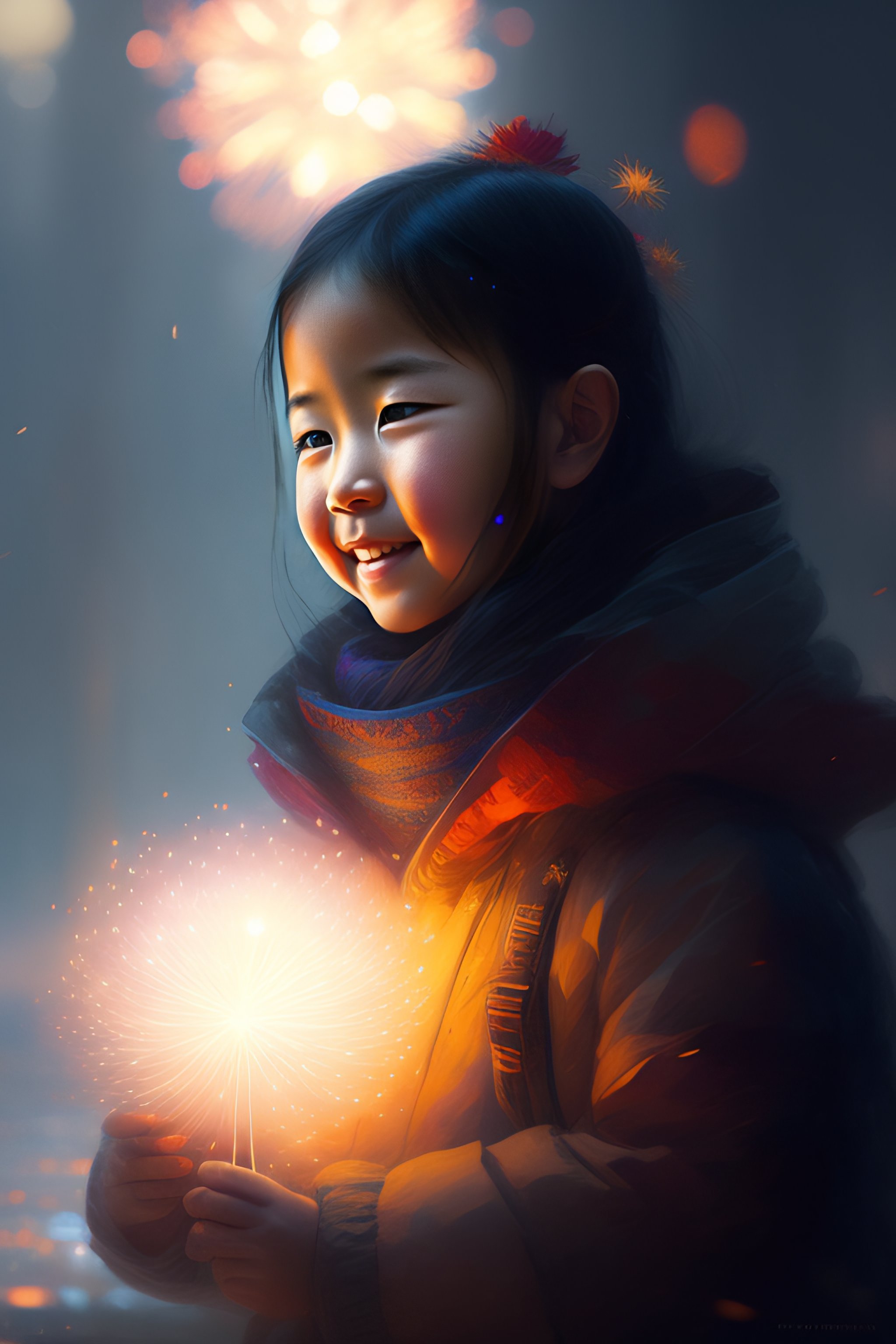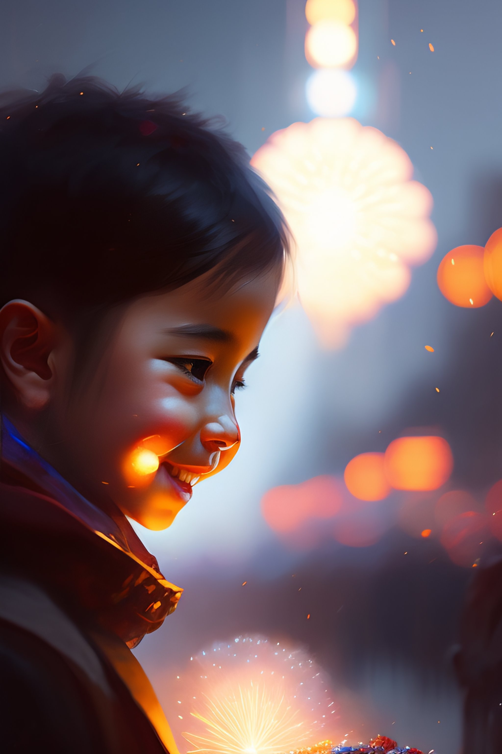 Smile mantra, fireworks, night festival, lens flare, bloom, intricate, sharp focus, illustration, highly detailed, digital painting, concept art, matte, art by ruan jia and wlop and greg rutkowski, masterpiece
