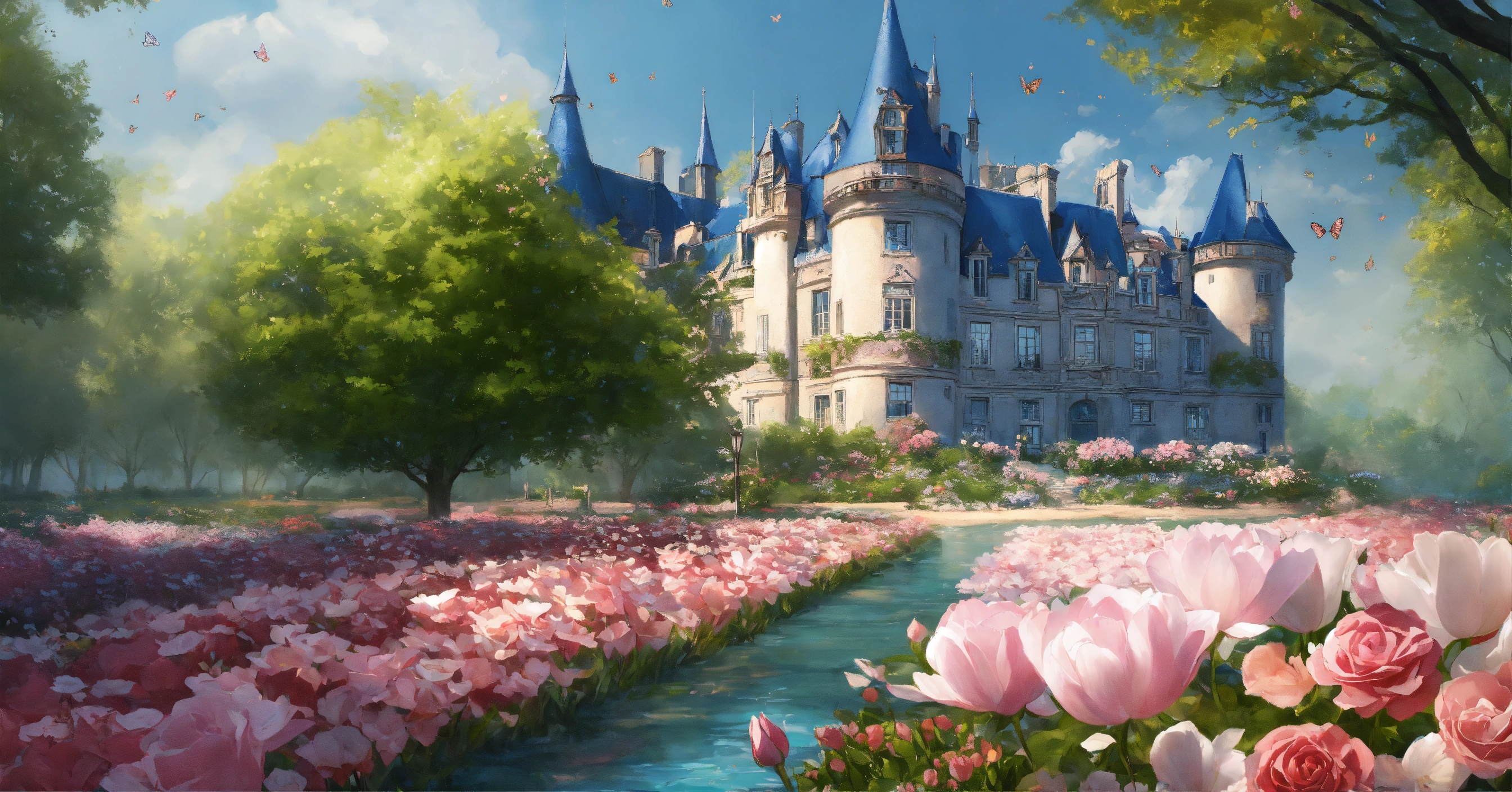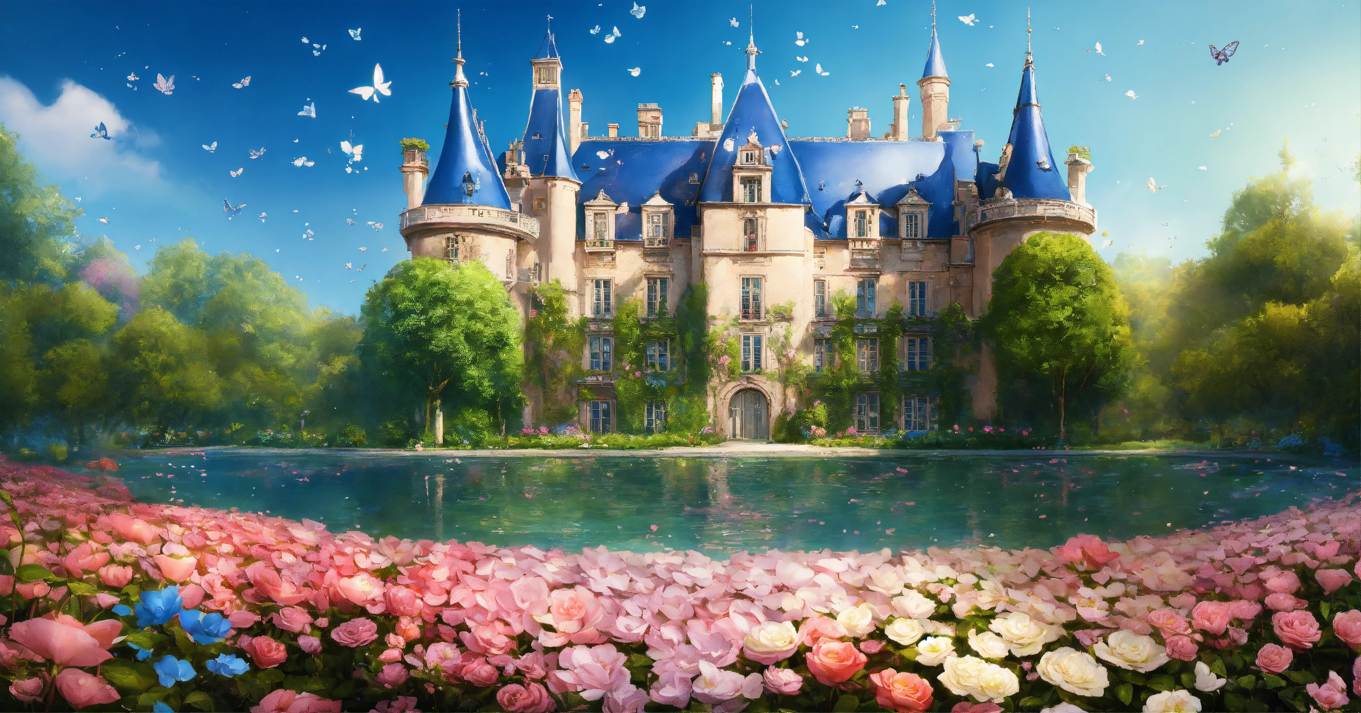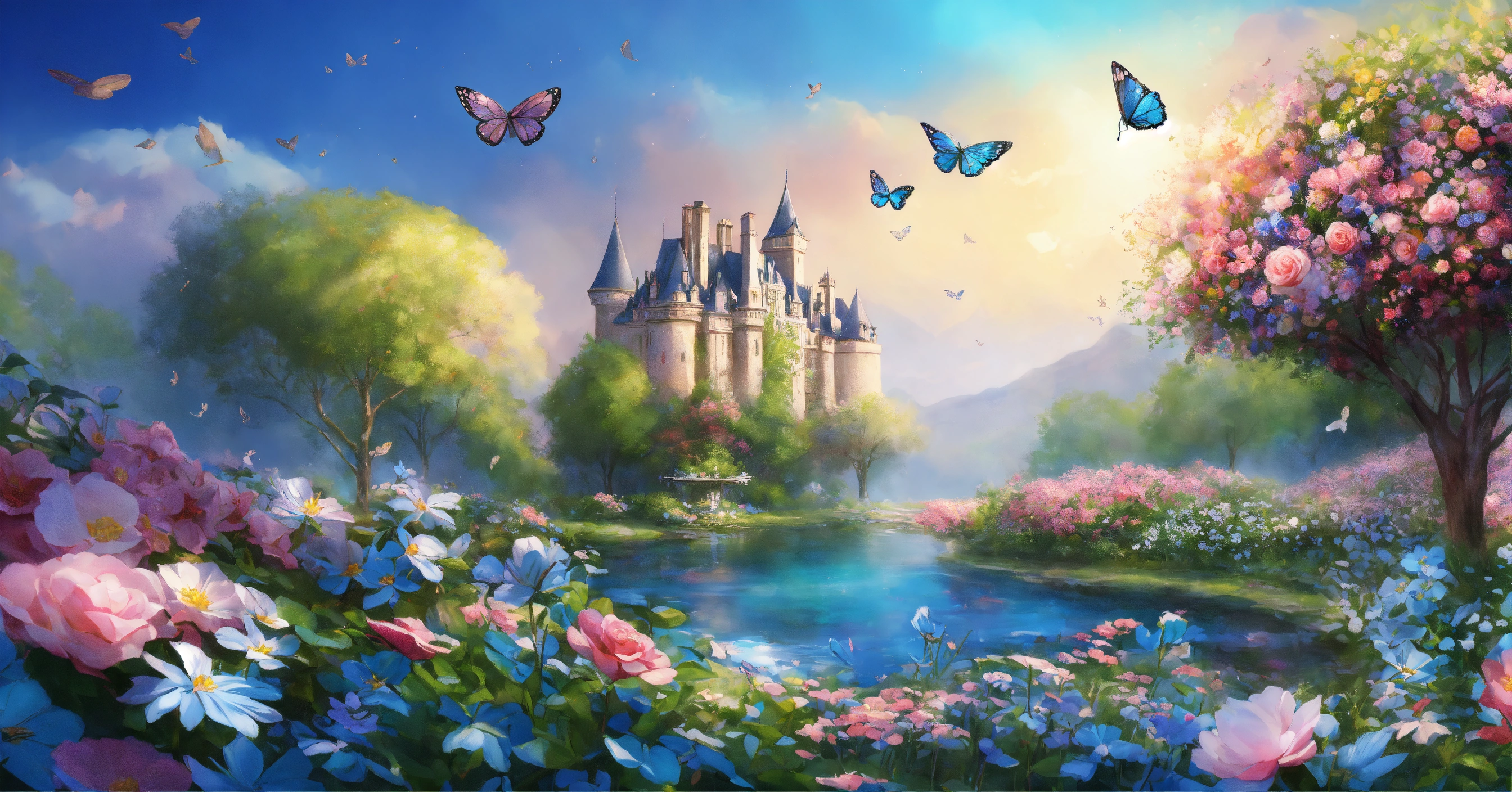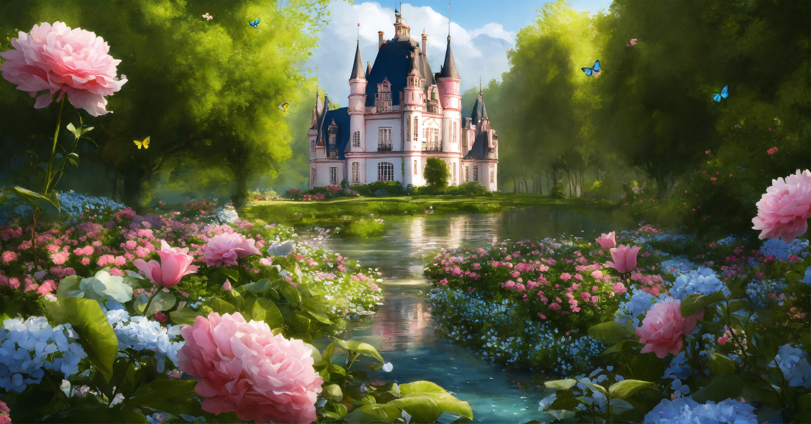 En premier plan des grandes fleurs sauvages, blanches non alignées, puis des grands arbres fleuris, couleurs bleu, blanc, rose, et un espace d eau, avec des gros papillons blancs ou roses, chateau futuriste et féérique, hd, très réaliste, 8k