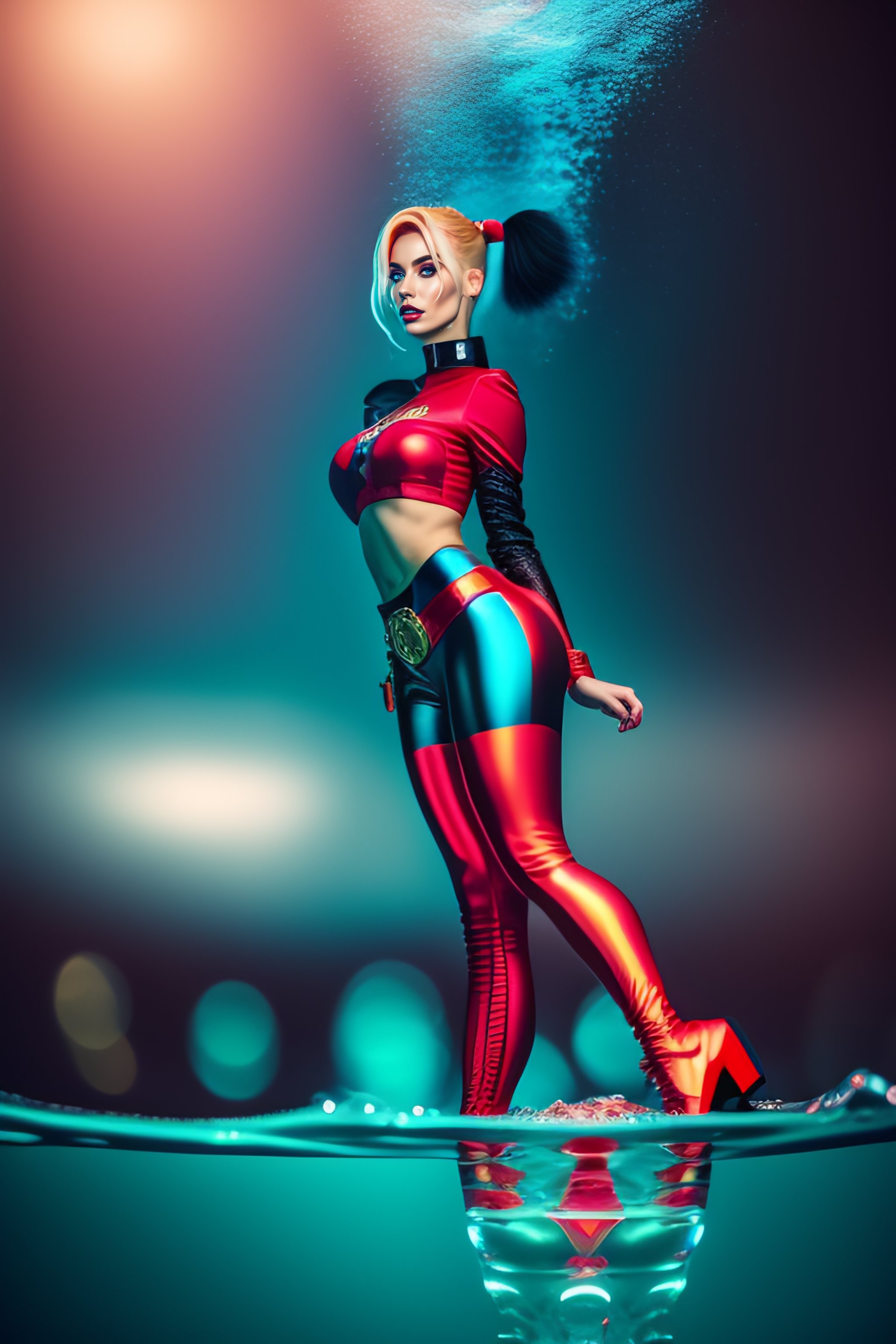 Fully body pose, photo of a very beautiful!! sexy model harley quinn, underwater, wearing high heels, 8 k, hdr, smooth, sharp focus, high resolution, award - winning photo, trending on artstation, dslr, 5 0 mm, perfect stomach, perfect legs