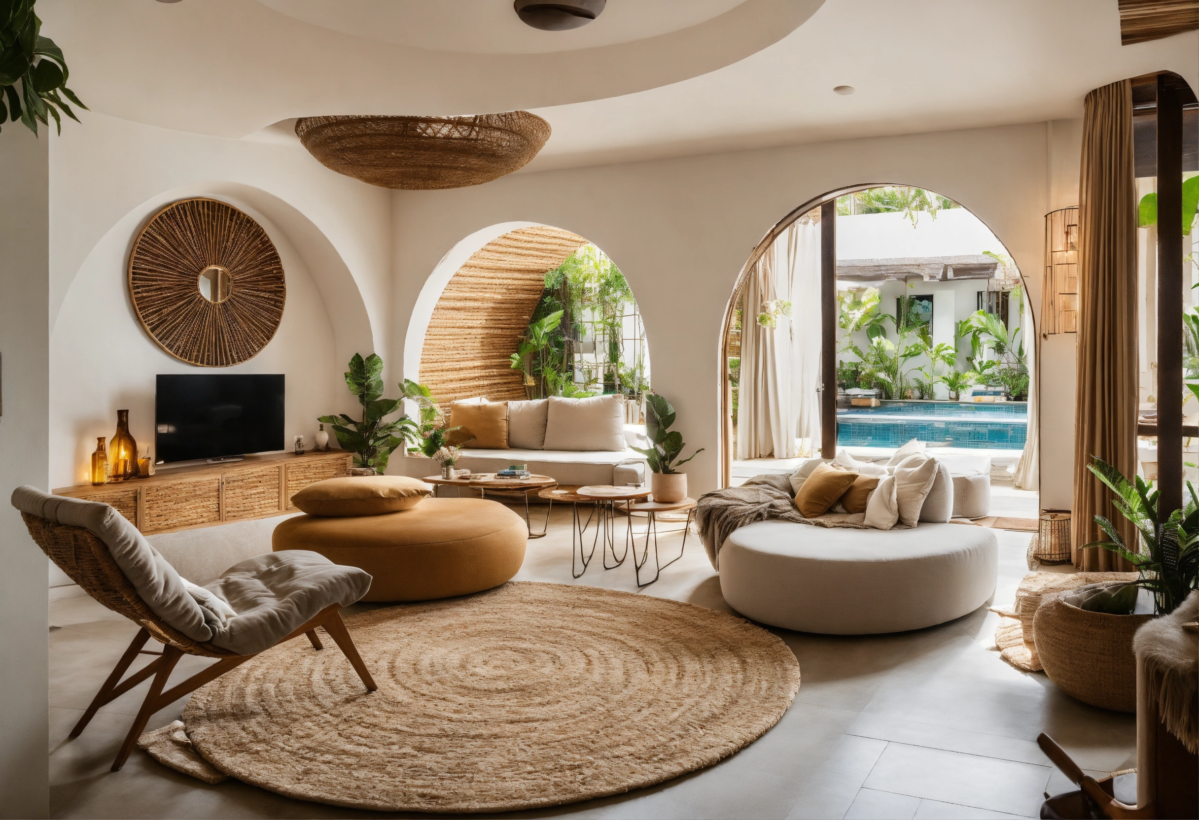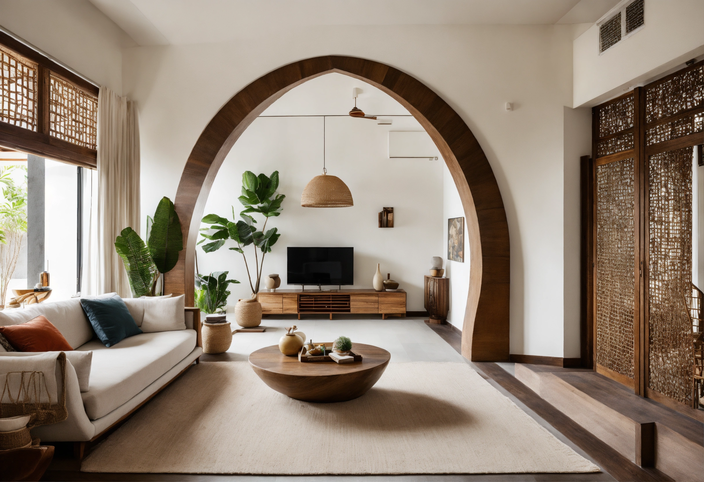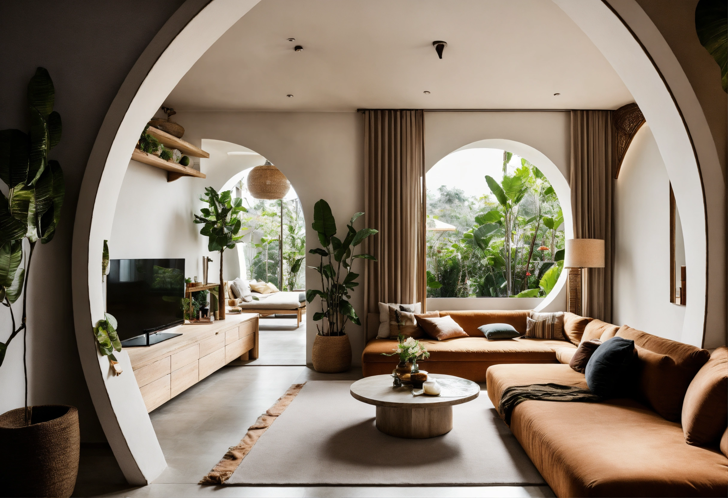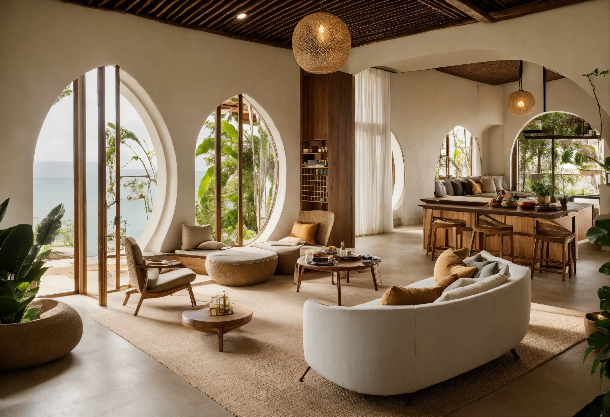 Modern take on upscale bali inspired small apartment white round arches interor view of kitchen living room bedroom