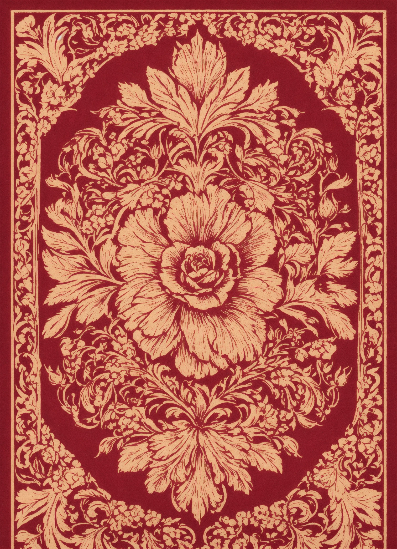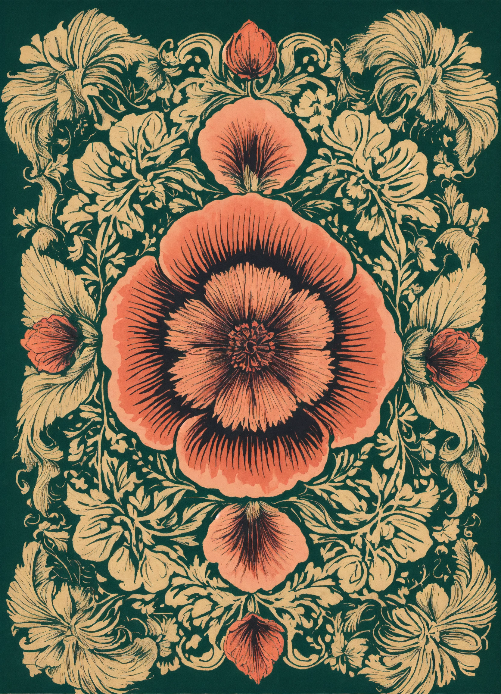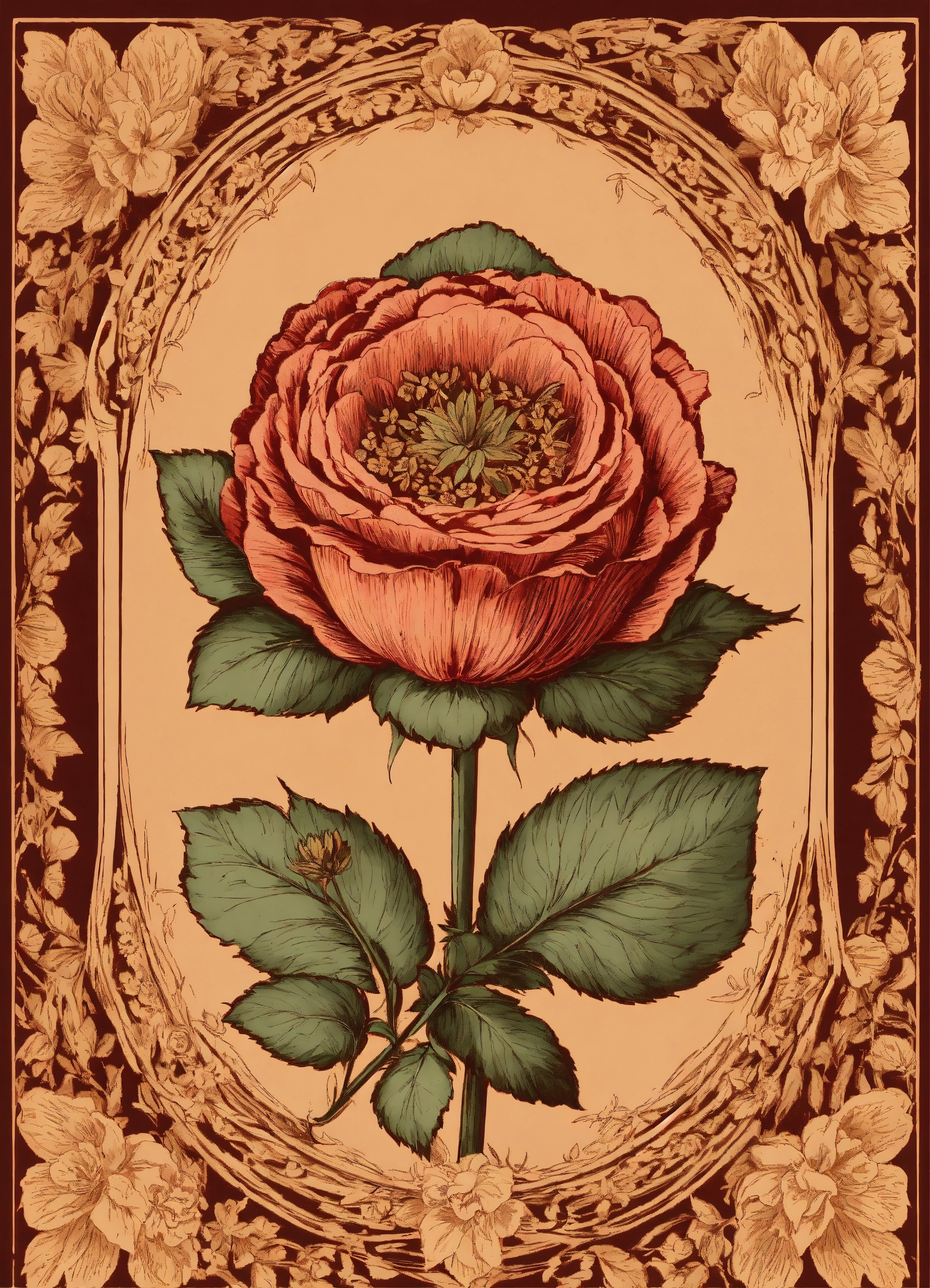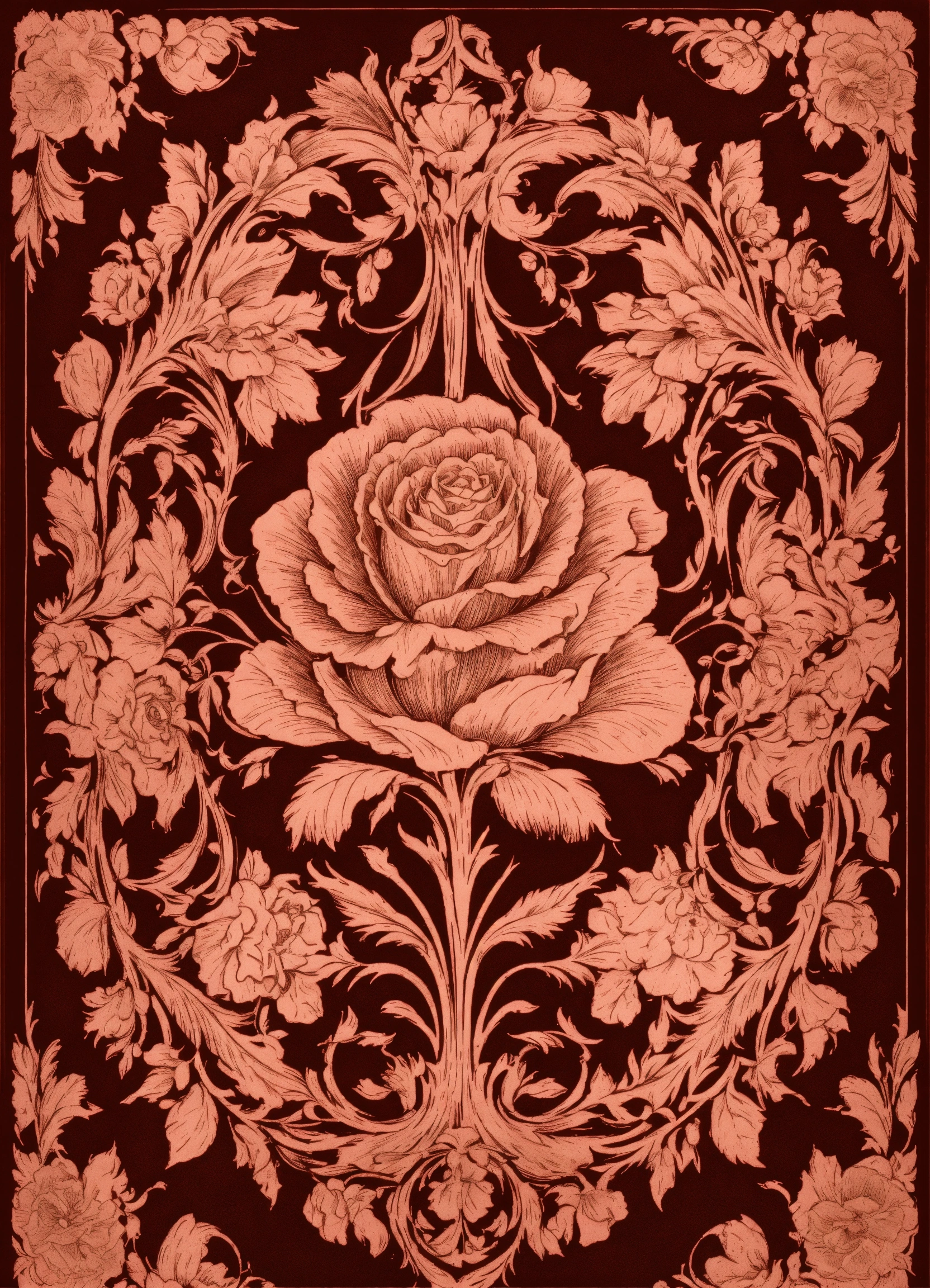 Beautiful decorative ornament with vintage floral elements emanating from center of design, woodcut template, decorative design, vintage ornament, motif, bilateral symmetry, rose, leaf, flower, bud, bud, feather, negative space, highly detailed etching, cover art