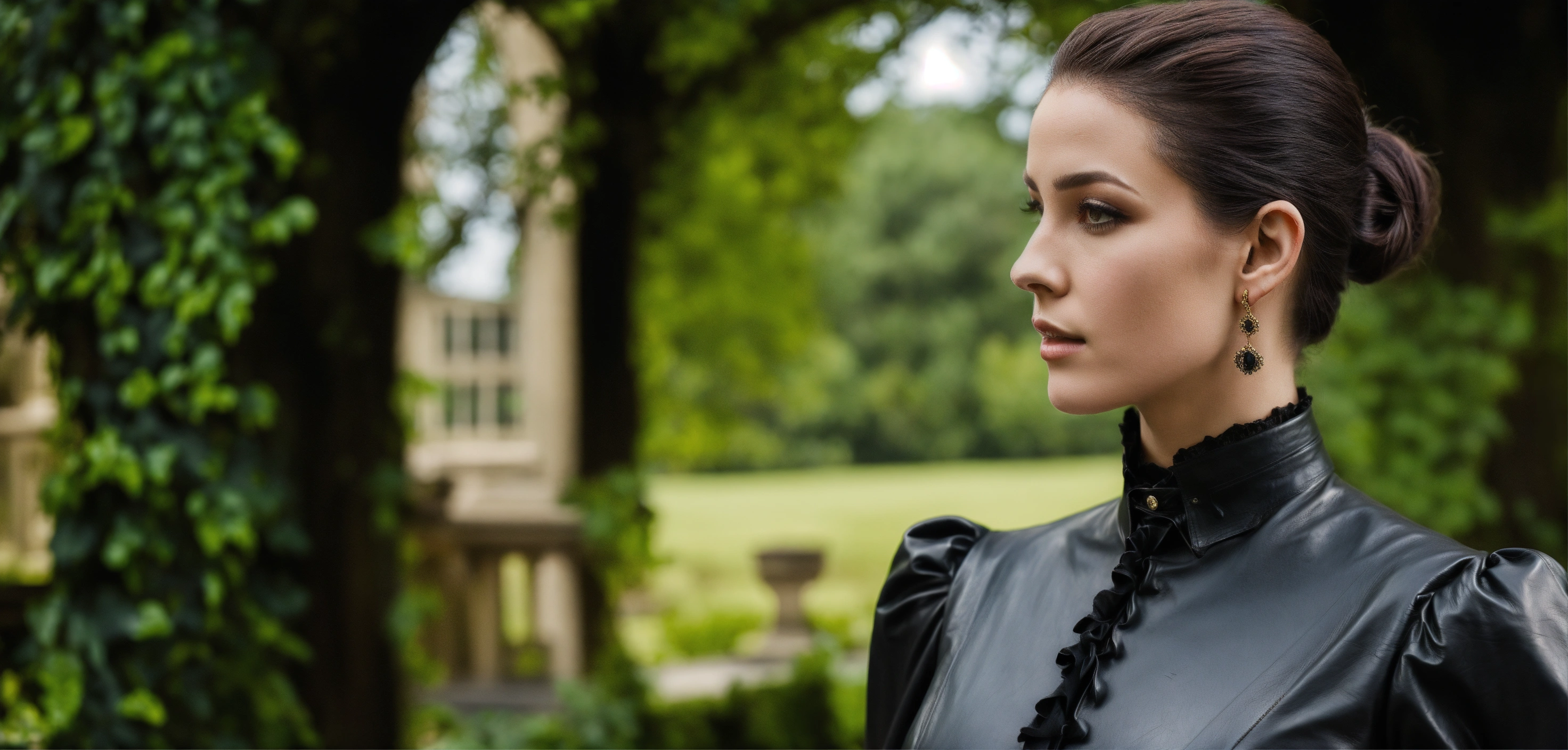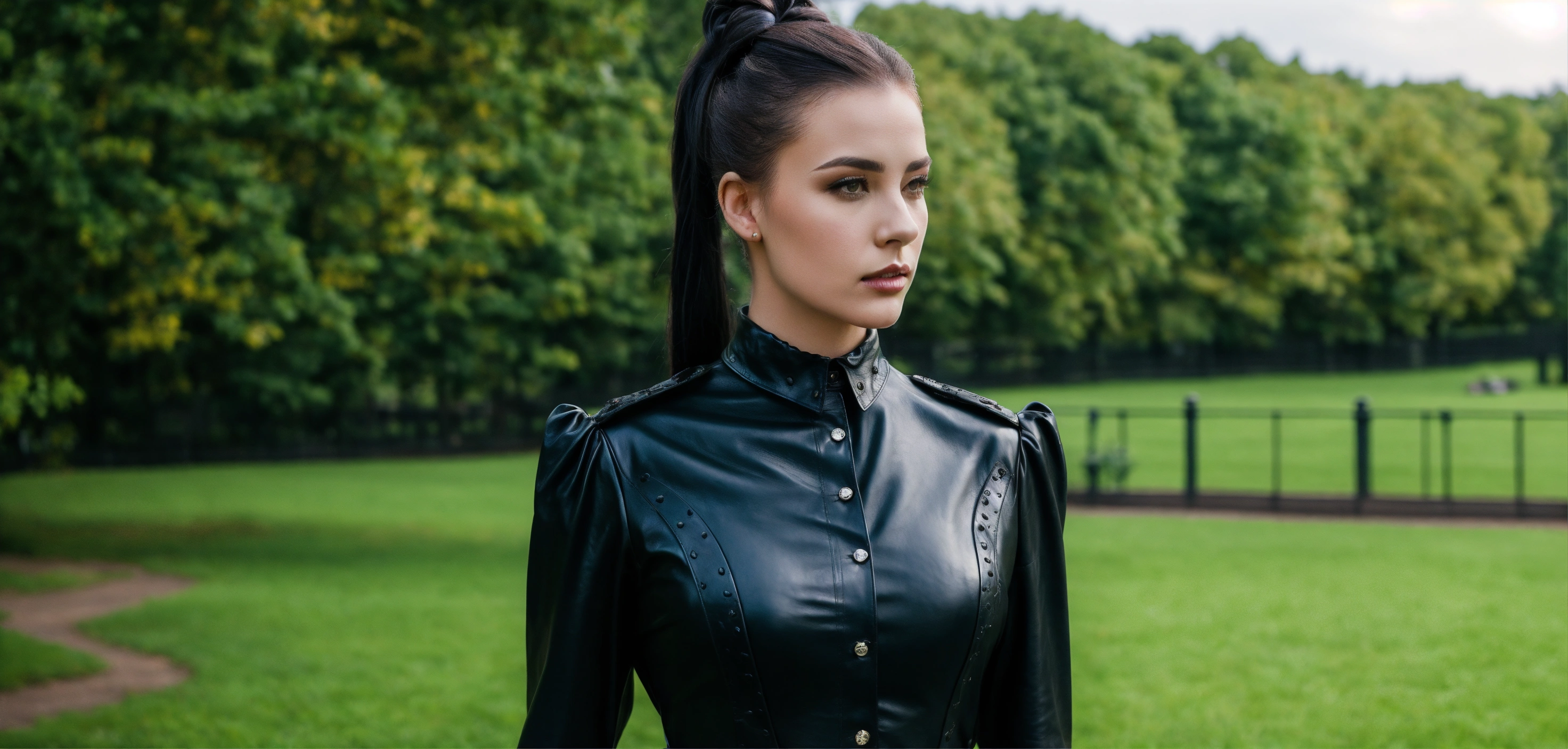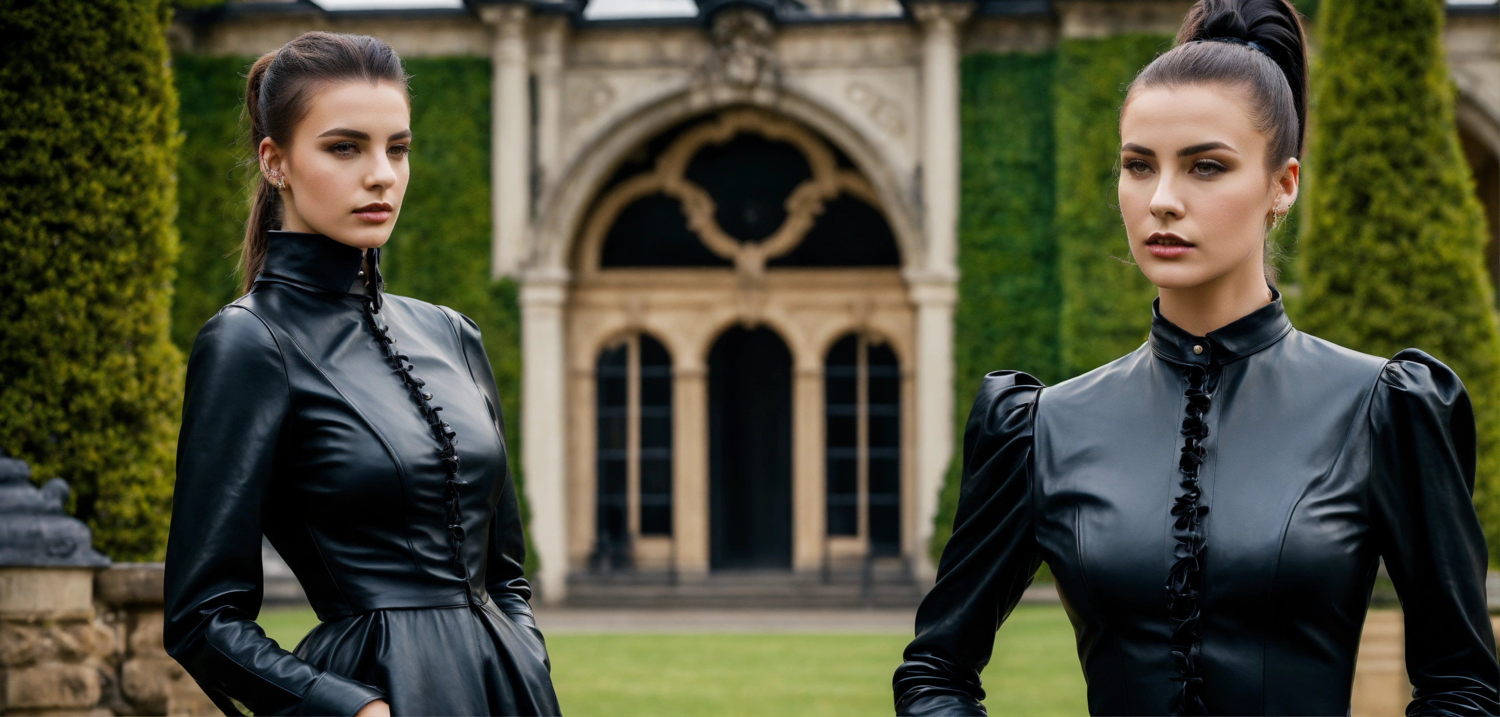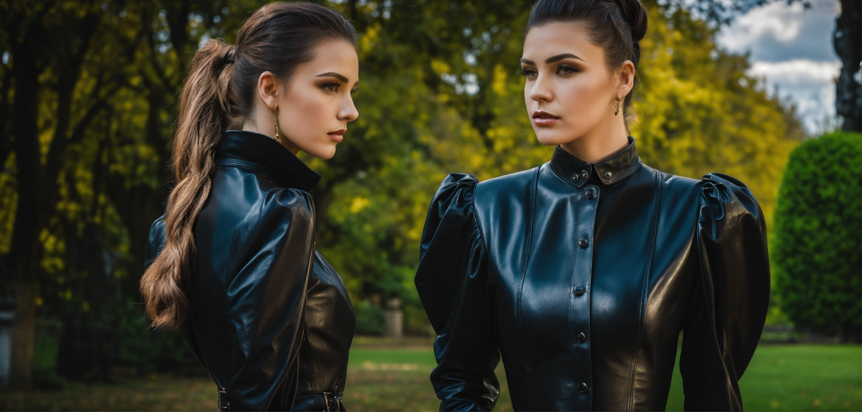 Two stunning arrogant women fashion model, strict victorian black leather governess shirt dress, leather shirt collar, black straight high ponytail, mansion park