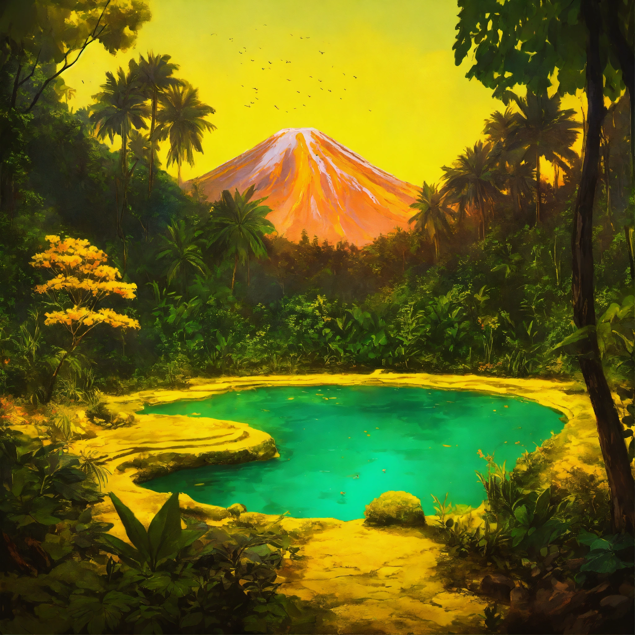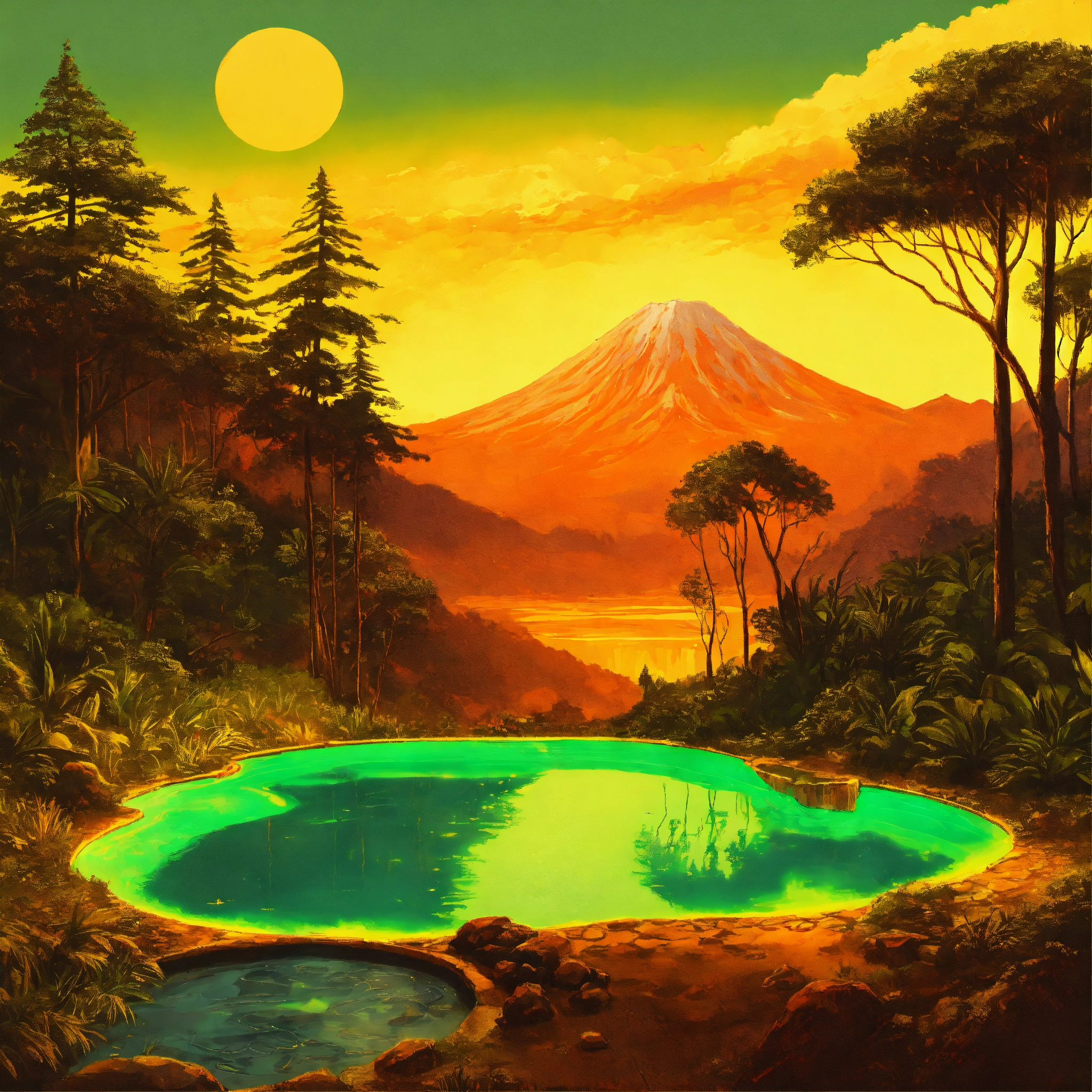 A wallpaper painting of a lush forest with a volcanic hot spring and mellow yellow sky with comet