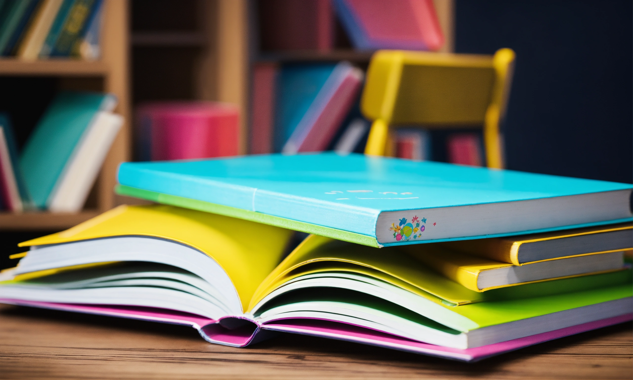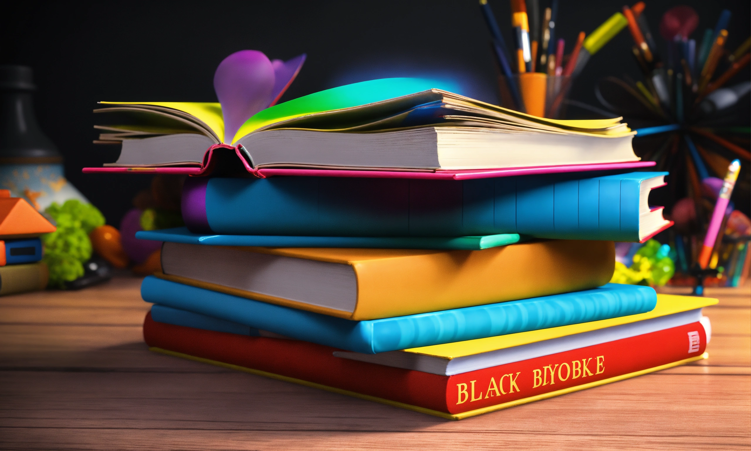 Educational books over a table, black background, cute, 8k, unreal engine, perfect, bright colors, funny, safe, secure