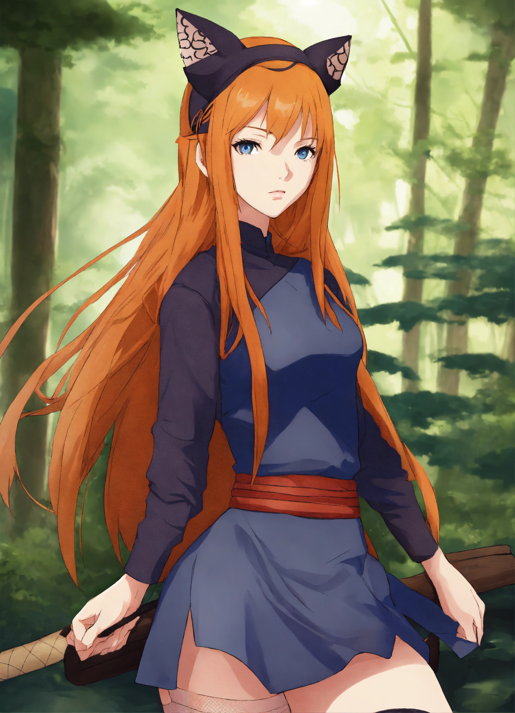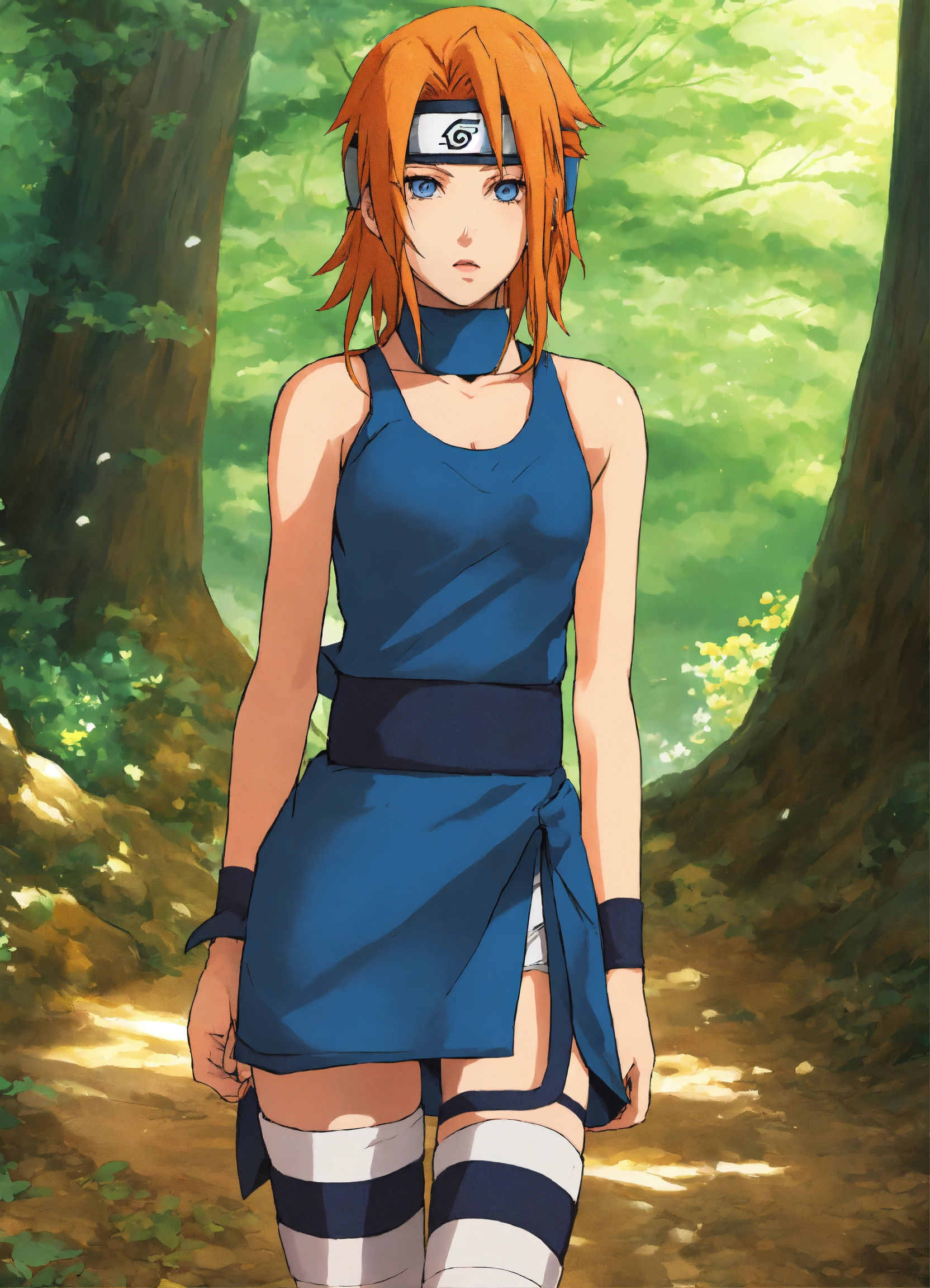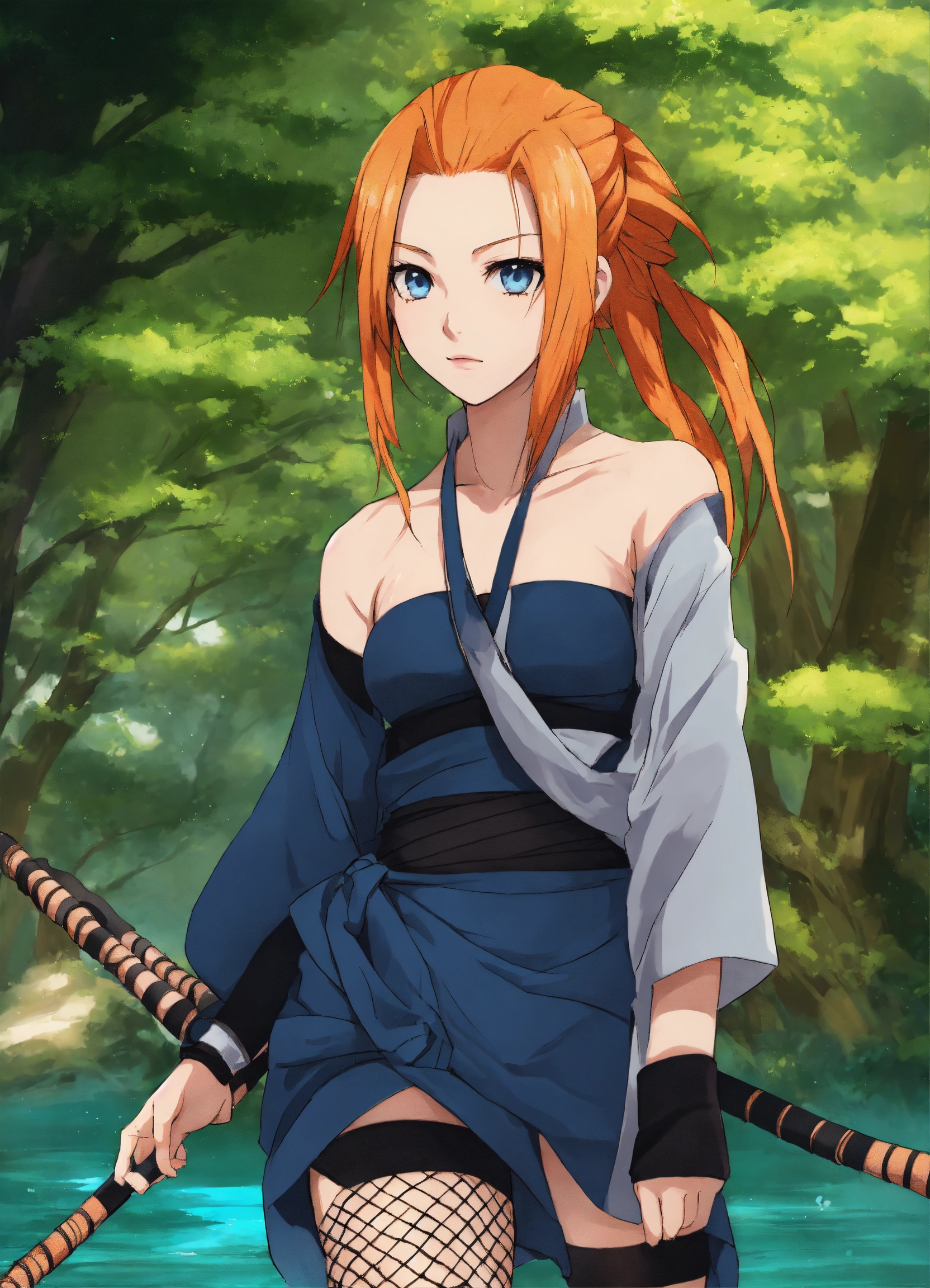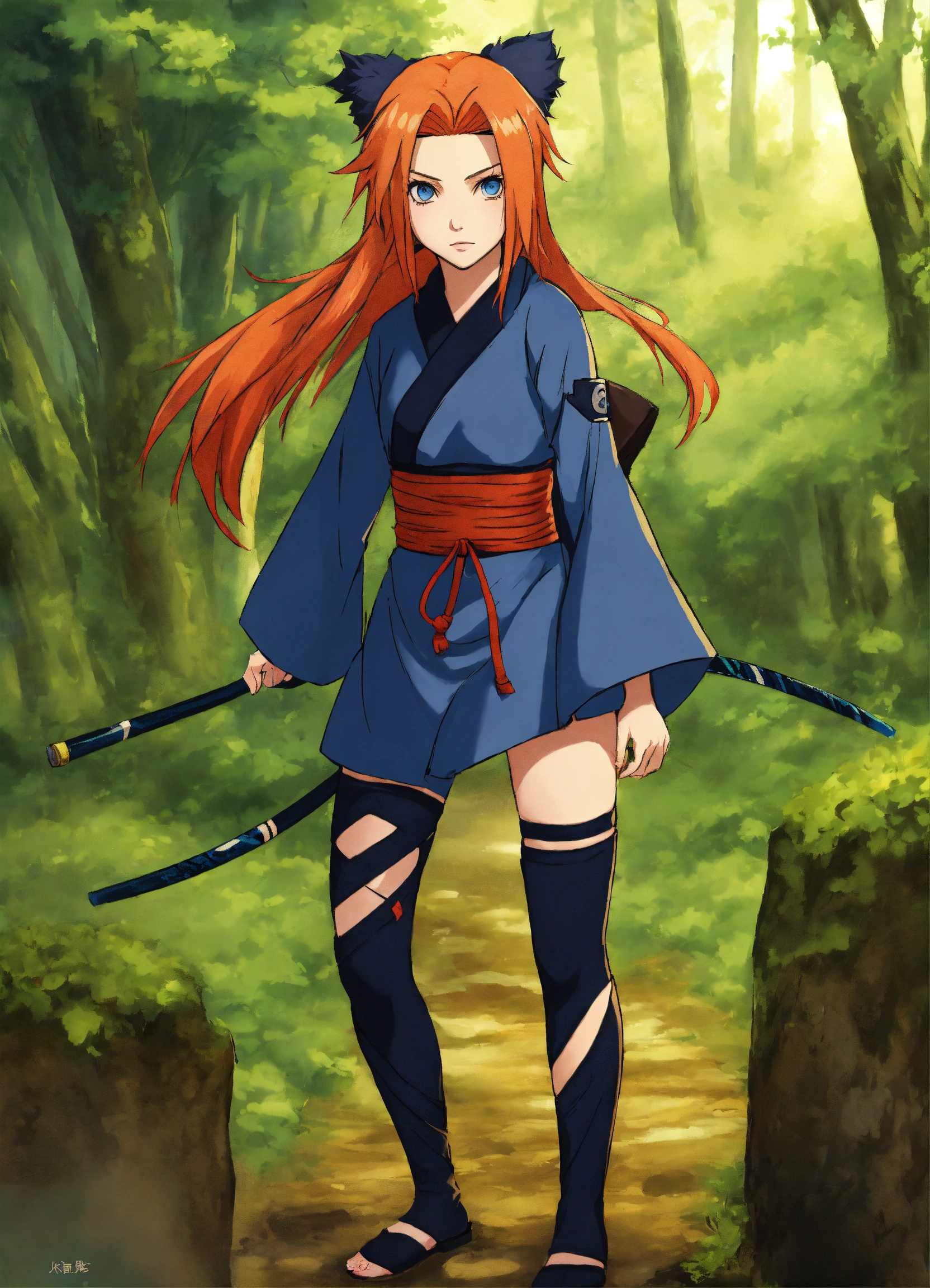 Naruto-style art, masashi kishimoto art, anime, naruto manga, naruto anime, original character, ginger hair, blue eyes, pretty woman, kunoichi, shinobi, konoha, ginger long hair, ginger hair, blue eyes, beautiful girl, beautiful young woman in naruto style art, feminine, fishnets, village hidden in the leaves headband, short dress, fishnets, kunoichi attire, feminine kunoichi attire, naruto headband, fishnets tights on legs, flattering kunoichi fishnets, long hair down and flowing, full body, full fishnets on her legs, full fishnet tights, wearing full fishnet tights on her legs, full fishnet tights on legs, long dress to ankles with slits up both thighs, 20-years-old, with sasuke uchiha, sasuke uchiha in masashi kishimoto style art