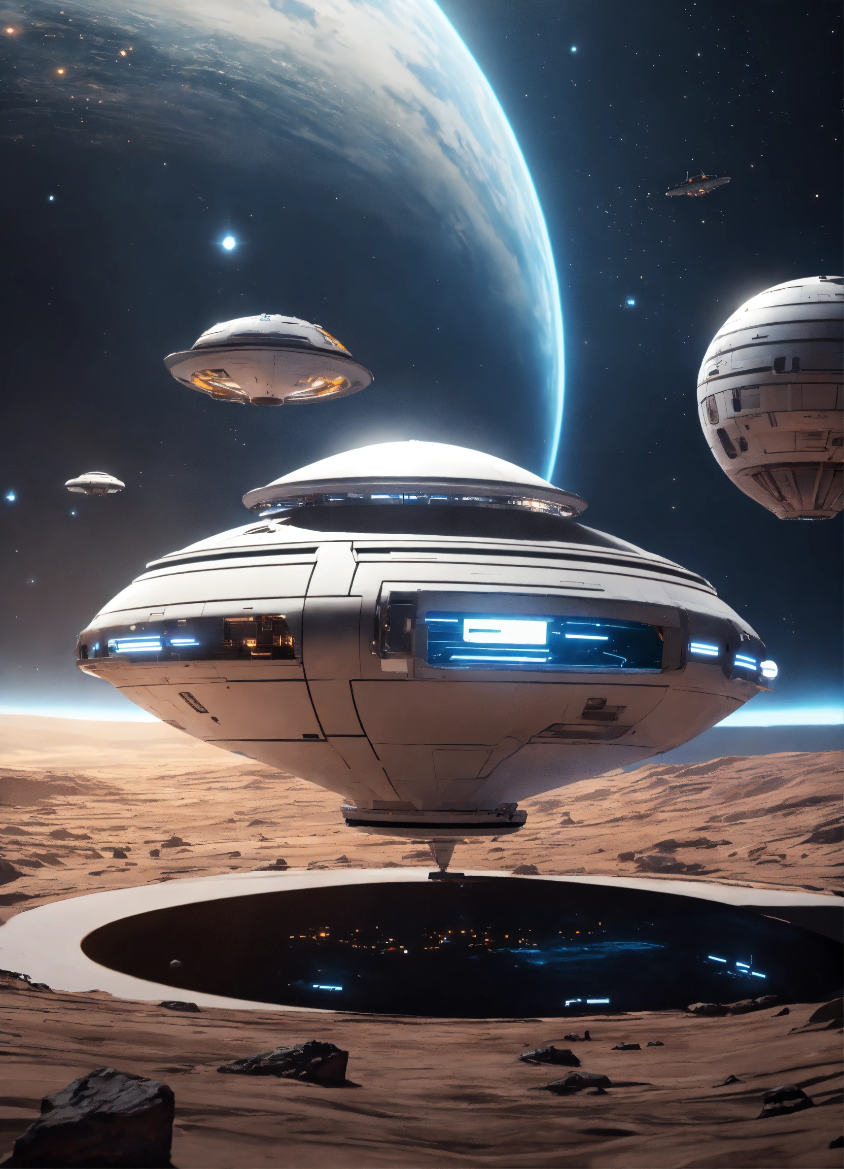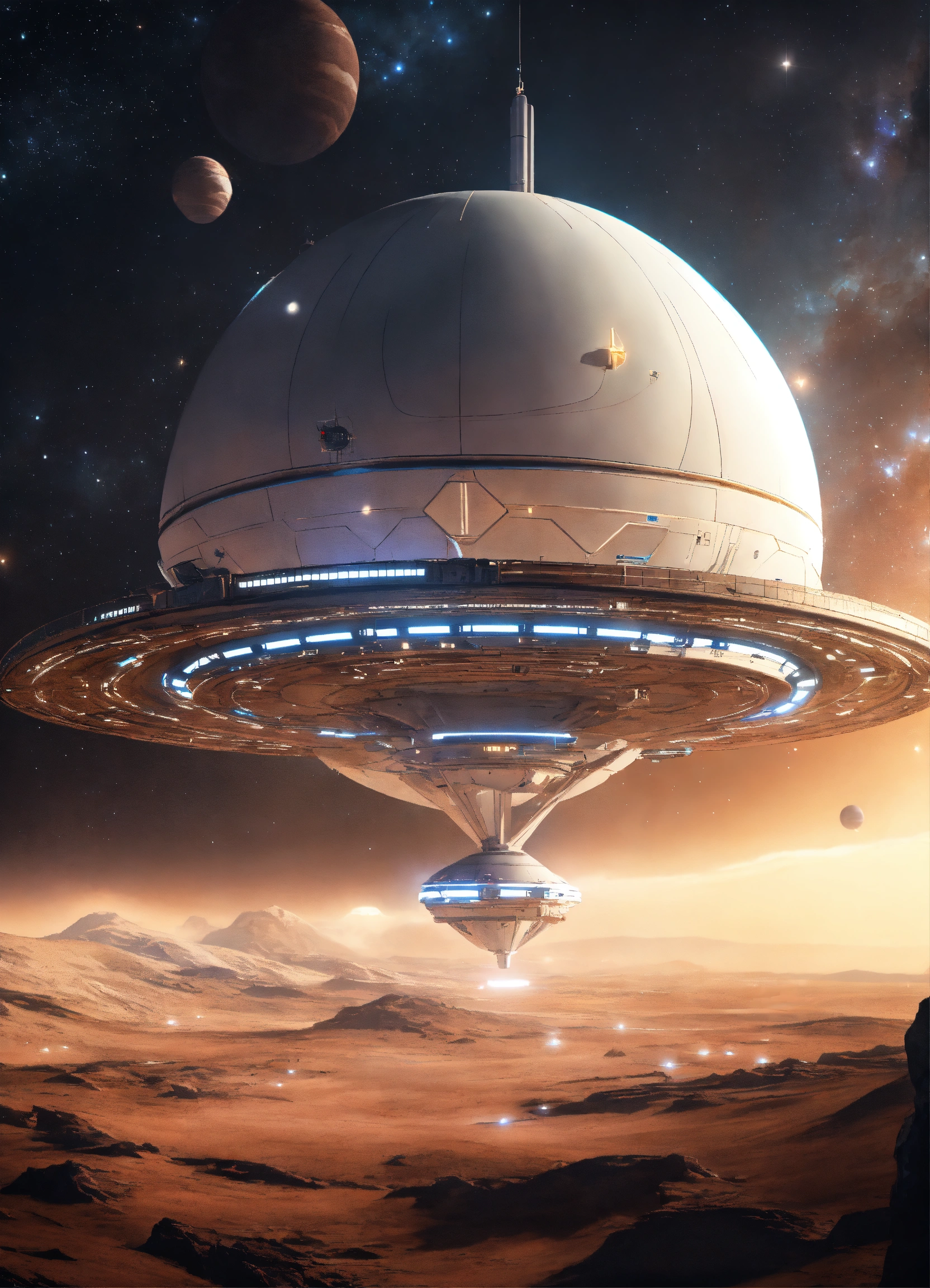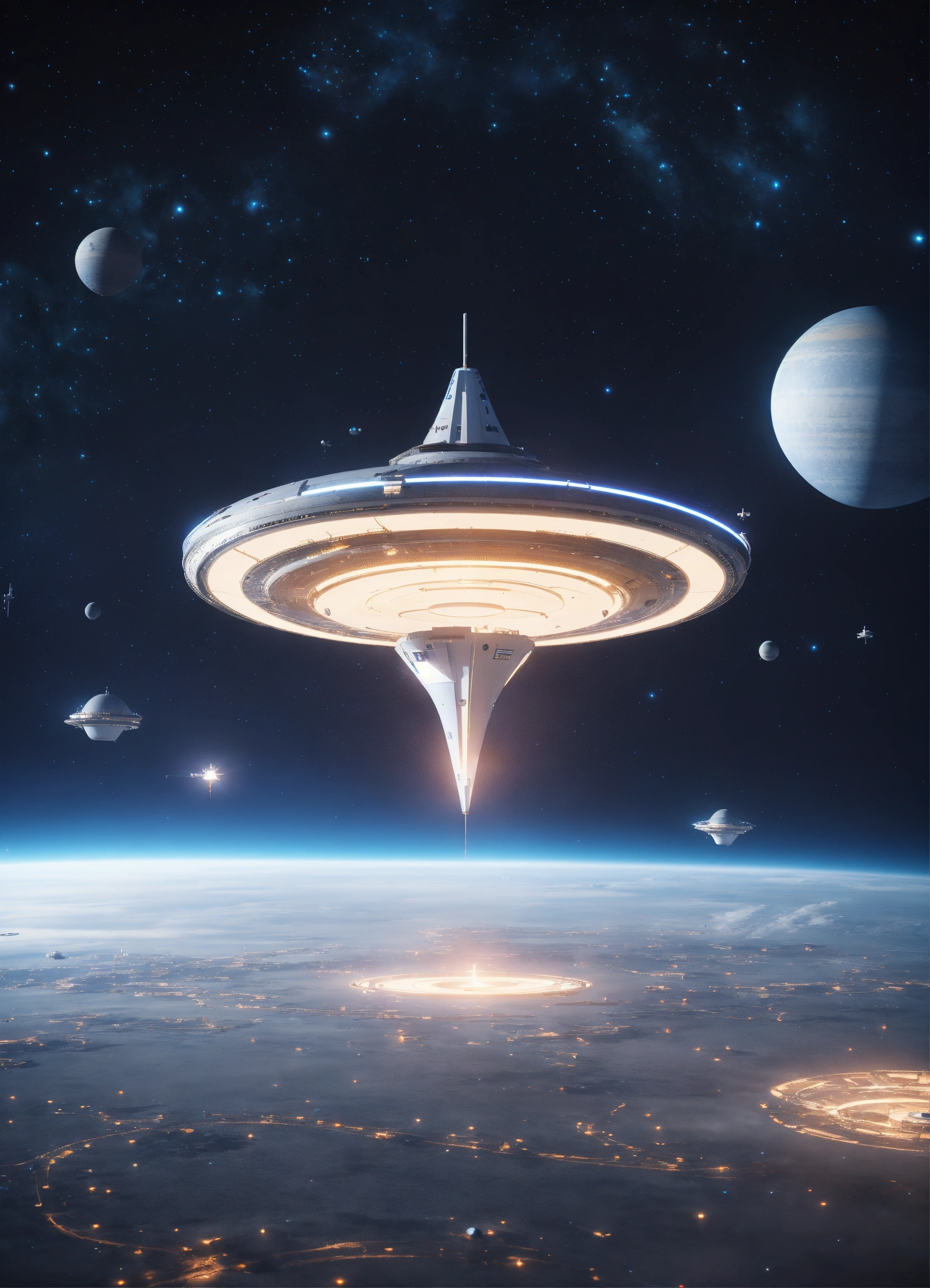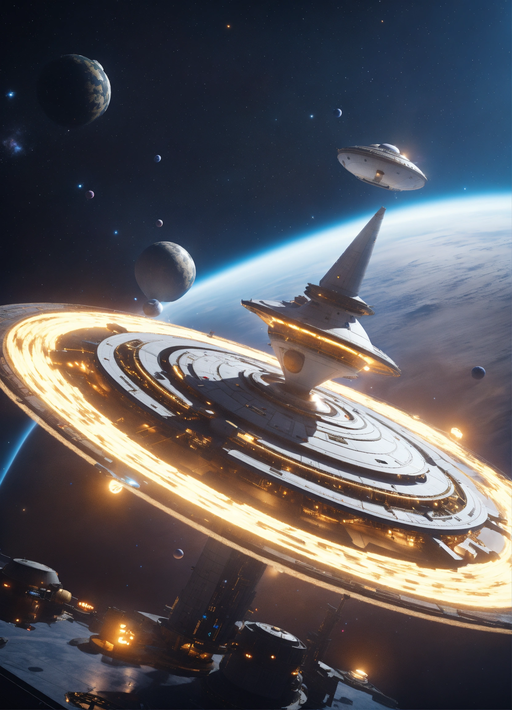 Beautiful white spinning top shaped spaceport flying floating in deep space, artificial star, futuristic, sci-fi, 8k, unreal engine, pixar