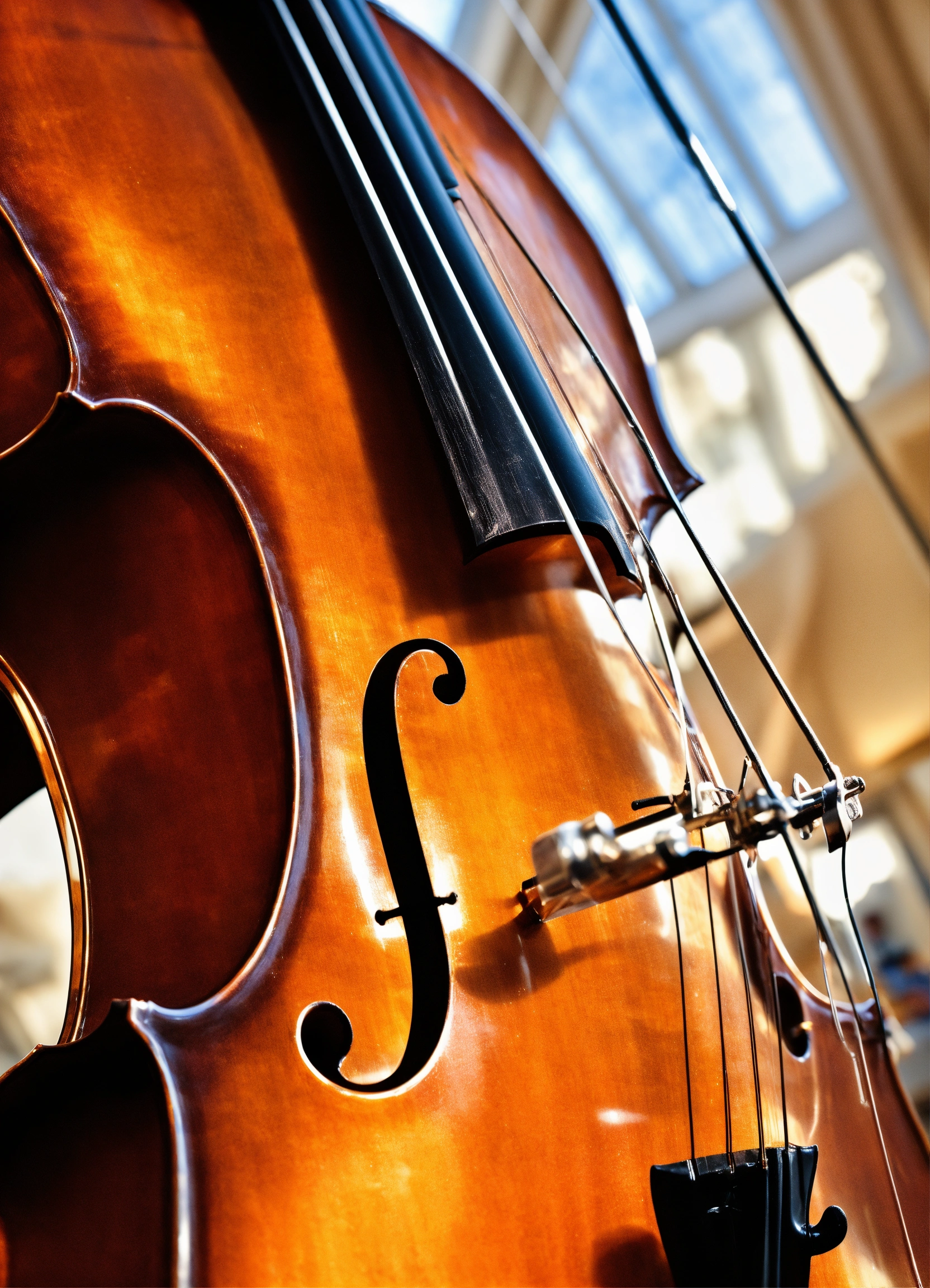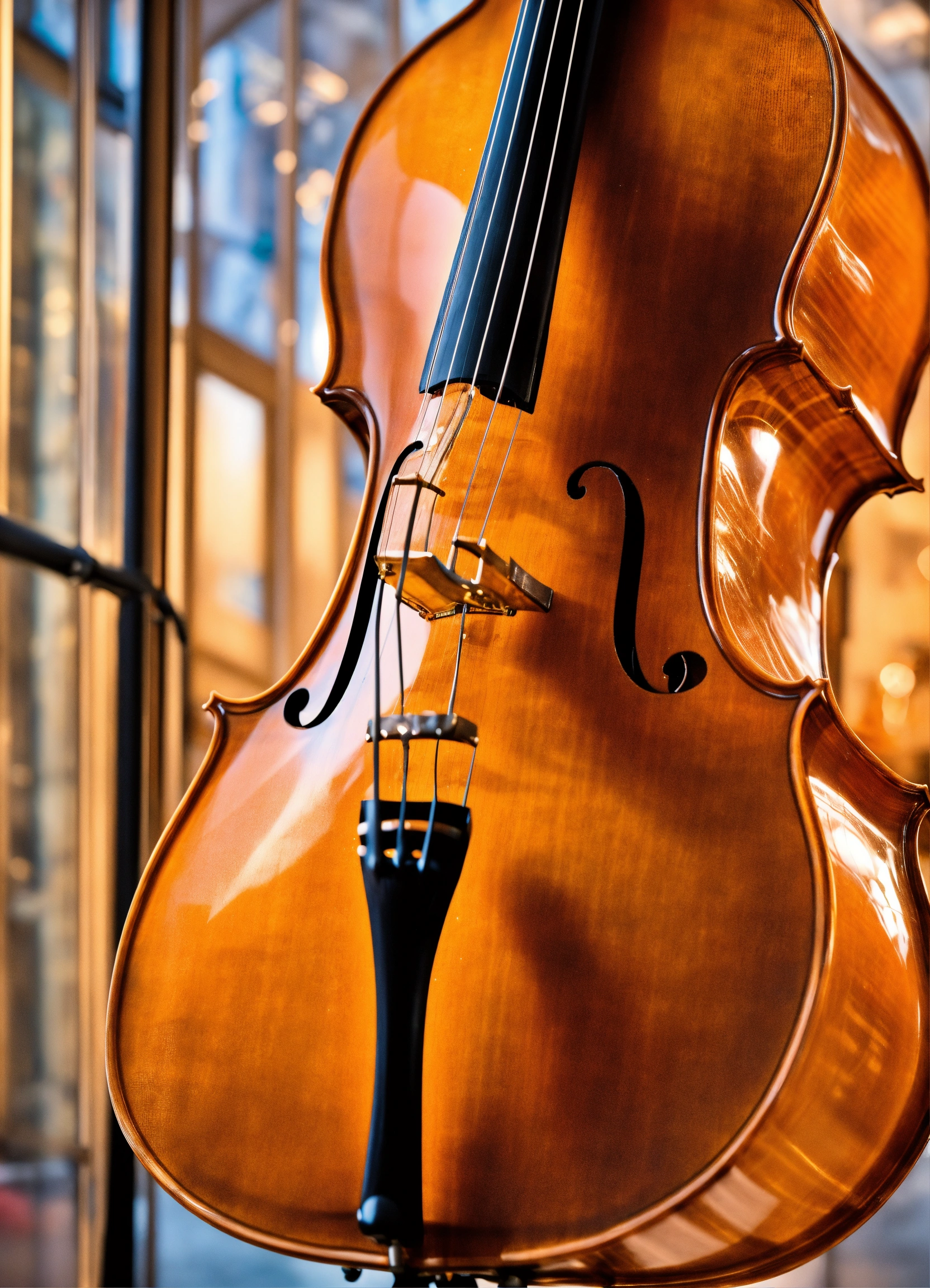 A photorealistic closeup view of inside a transparent cello, imagine you are standing inside of a glass cello and watching a modern concert hall inside the architecture of the instrument designed by frank gehry, don't show anything outside of the instrument but an ocean, just inside, the hidden part from eyes. created by canaletto, highly detailed image, extremely high resolution, surrealistic construction inside the cello