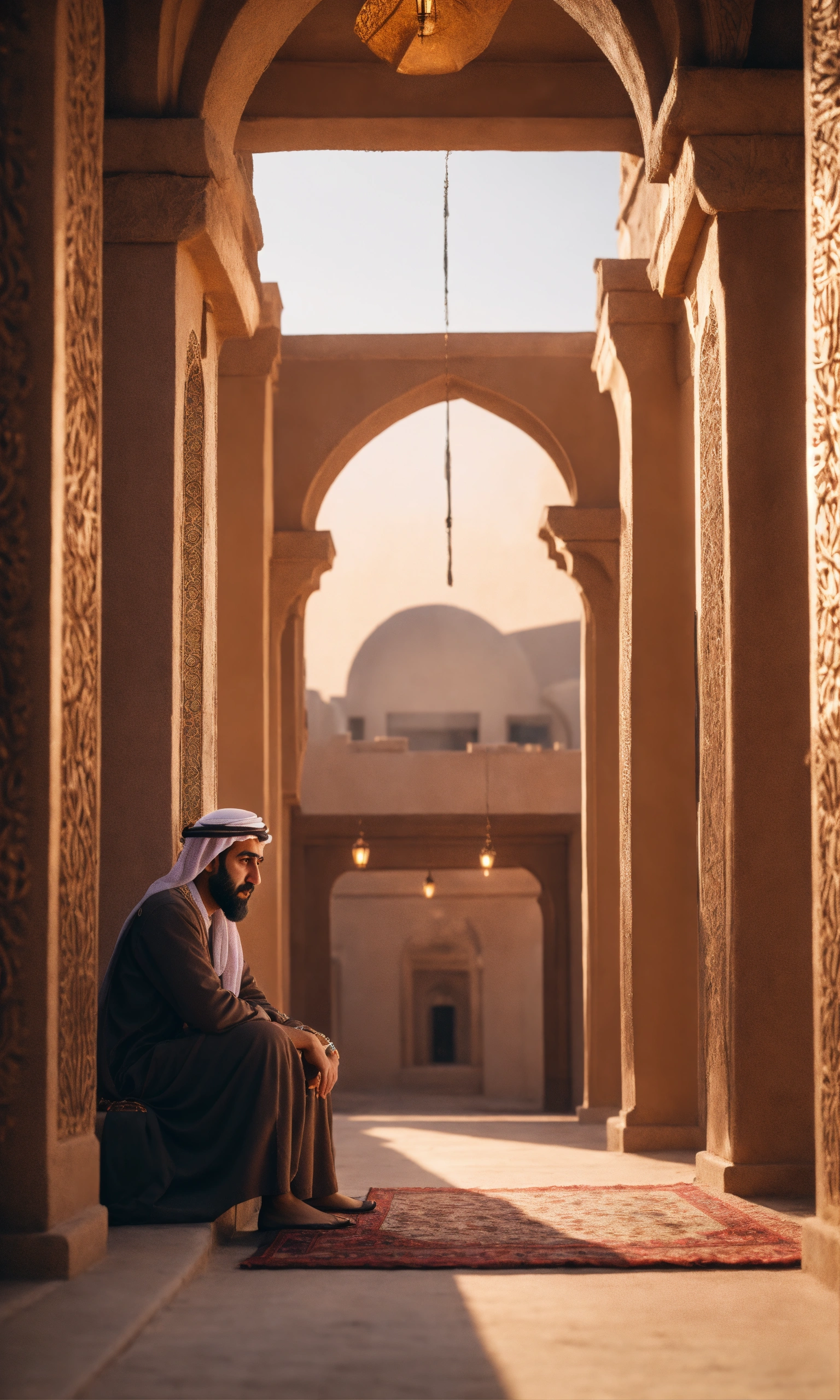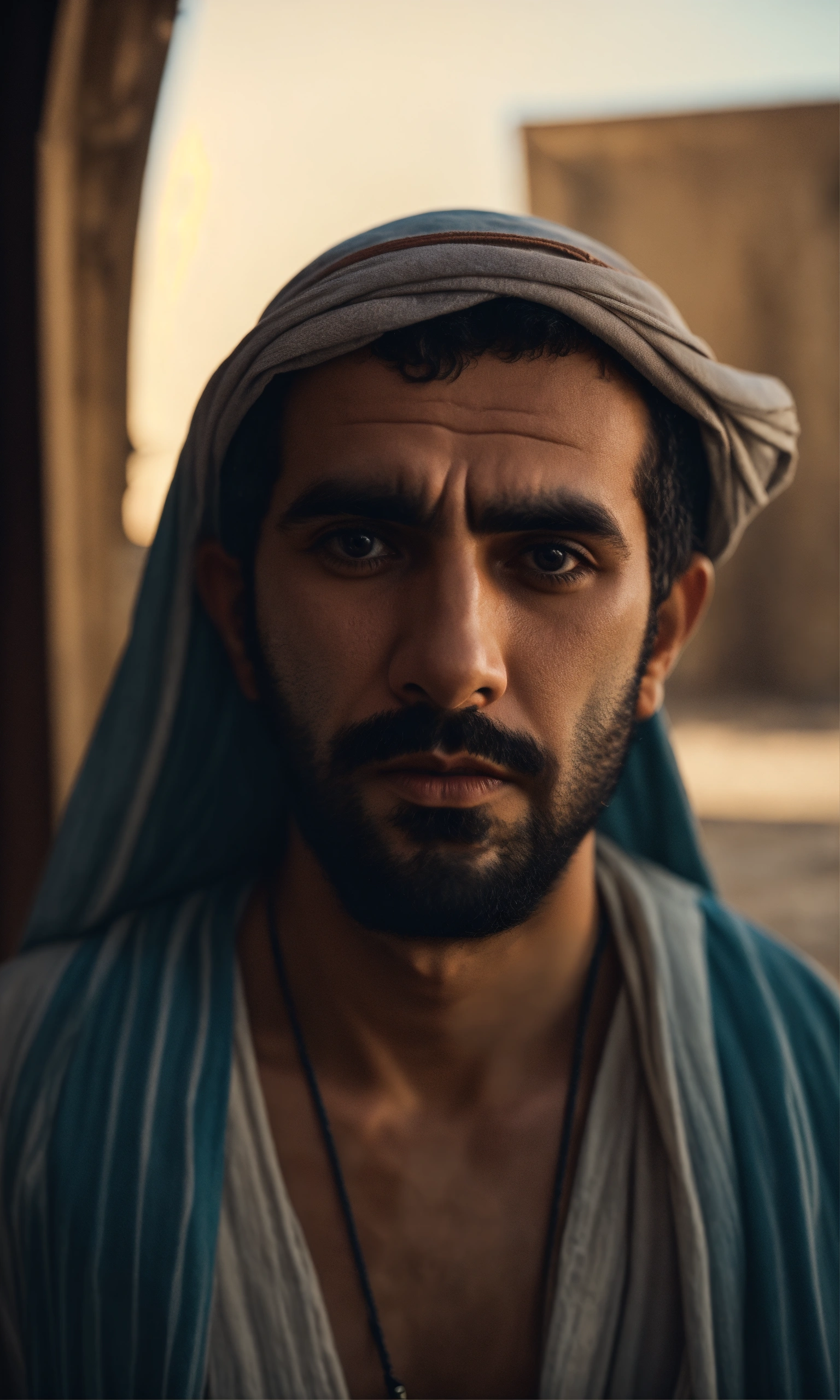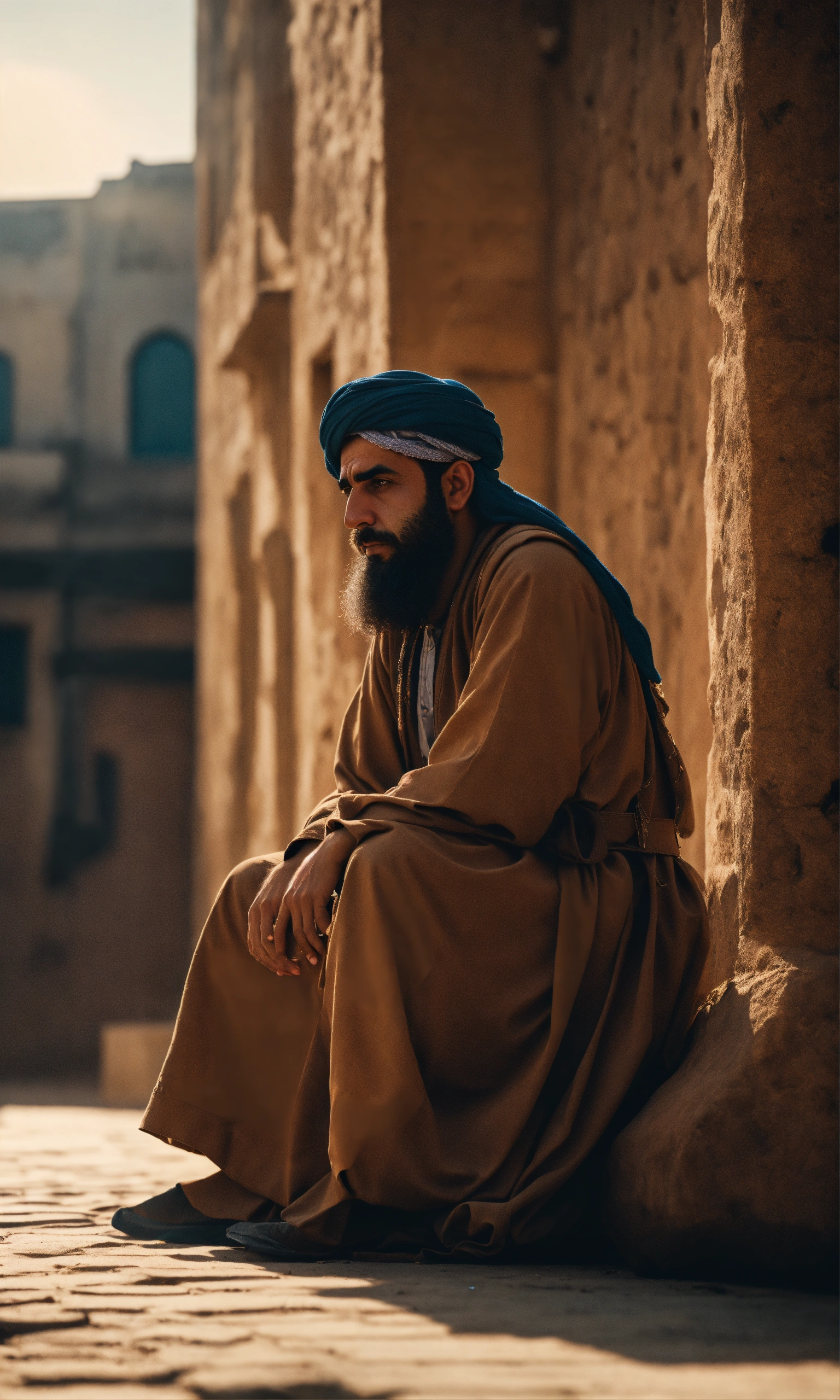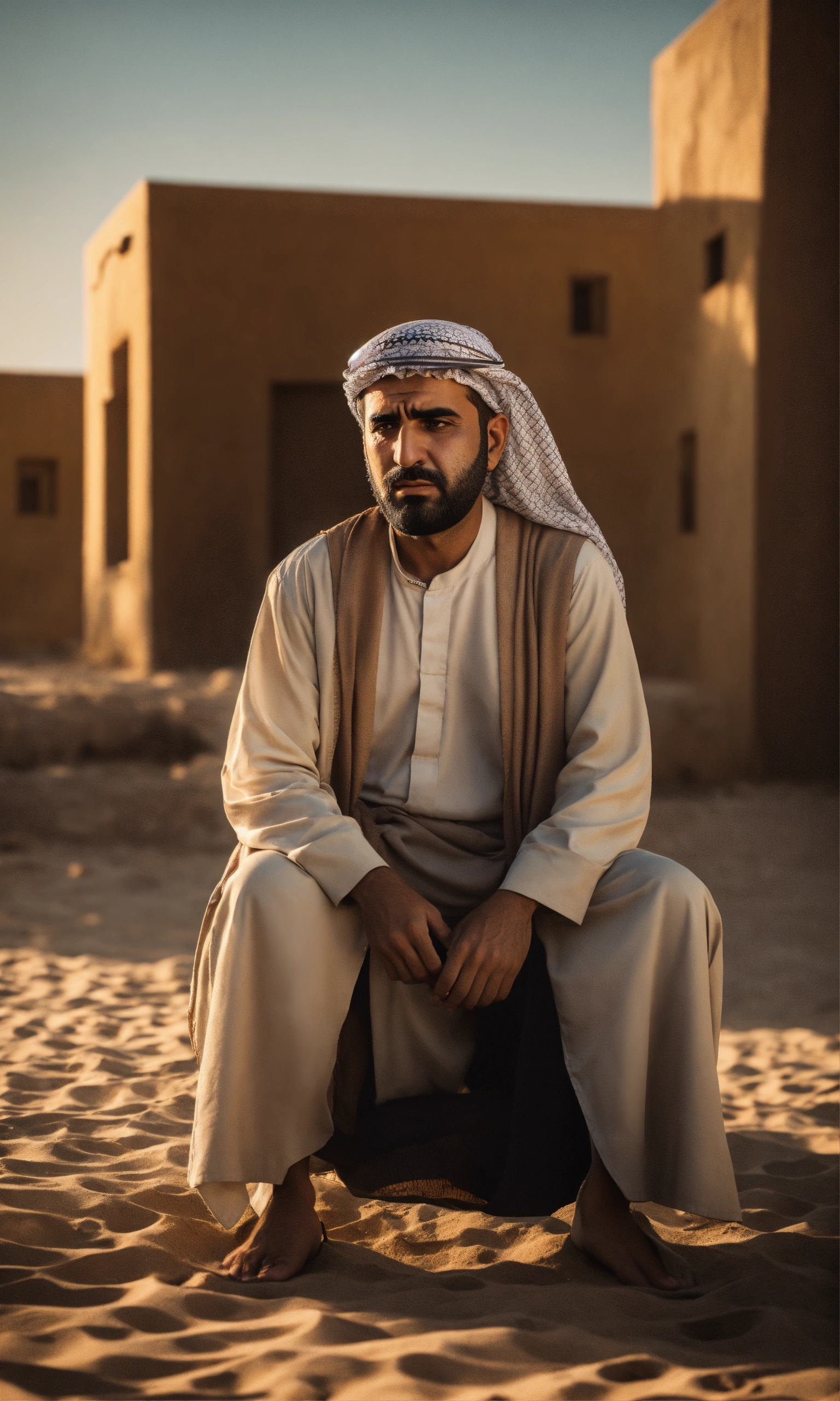 Middle eastern sad man, surreal photo, fujifilm xt3, outdoor, good lighting, raw photo, 8k uhd, film grain, unreal engine 5, ray trace