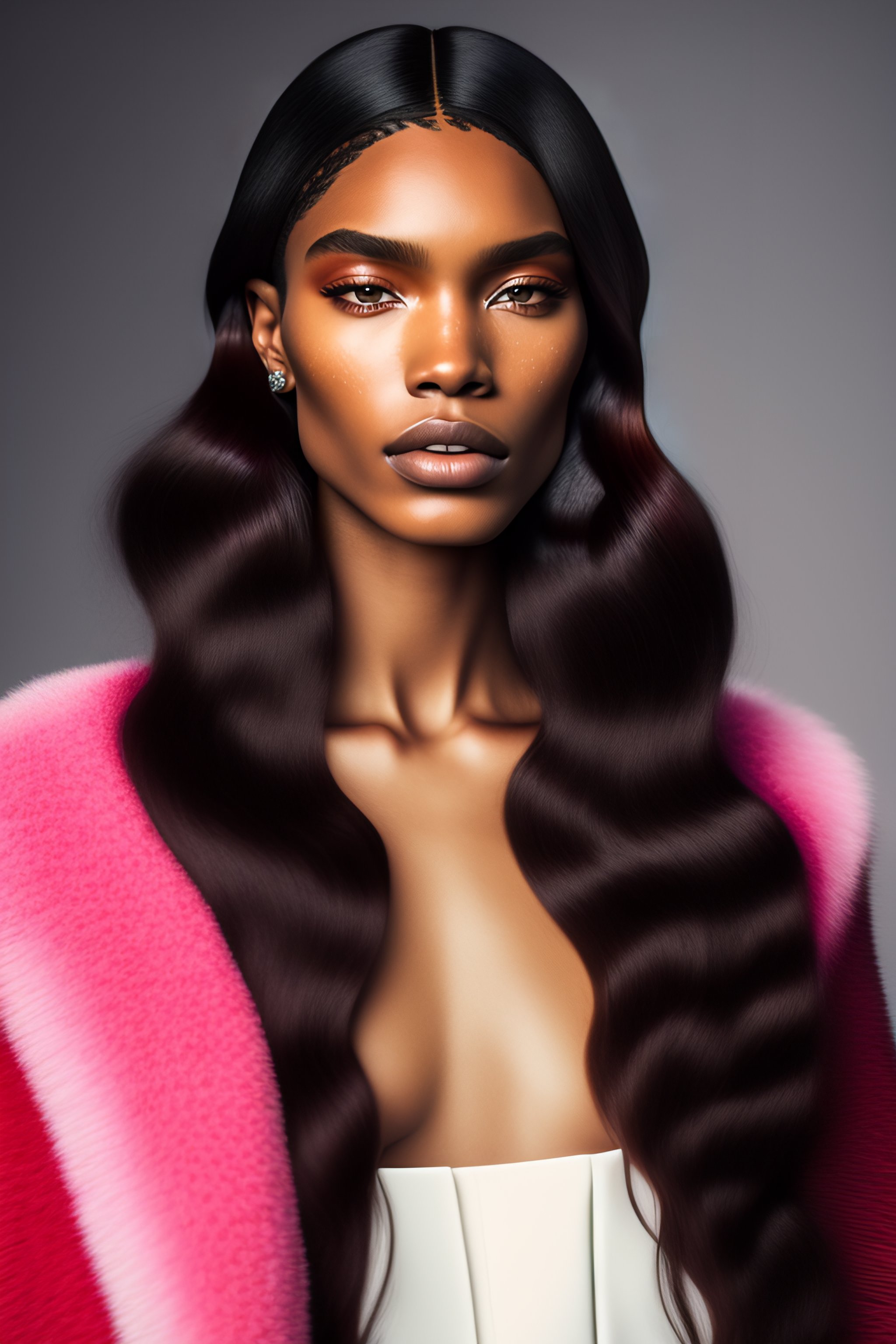 A photo close-up of a beautiful long haired woman with light ivory skin, with freckles, fashion editorial, studio photography, magazine photography, pointed nose, wearing bright pink, silver and black colors, stunning, wearing glossy pink lipstick, elegant, 8k, intricate, hyperdetailed, hd, blurry background