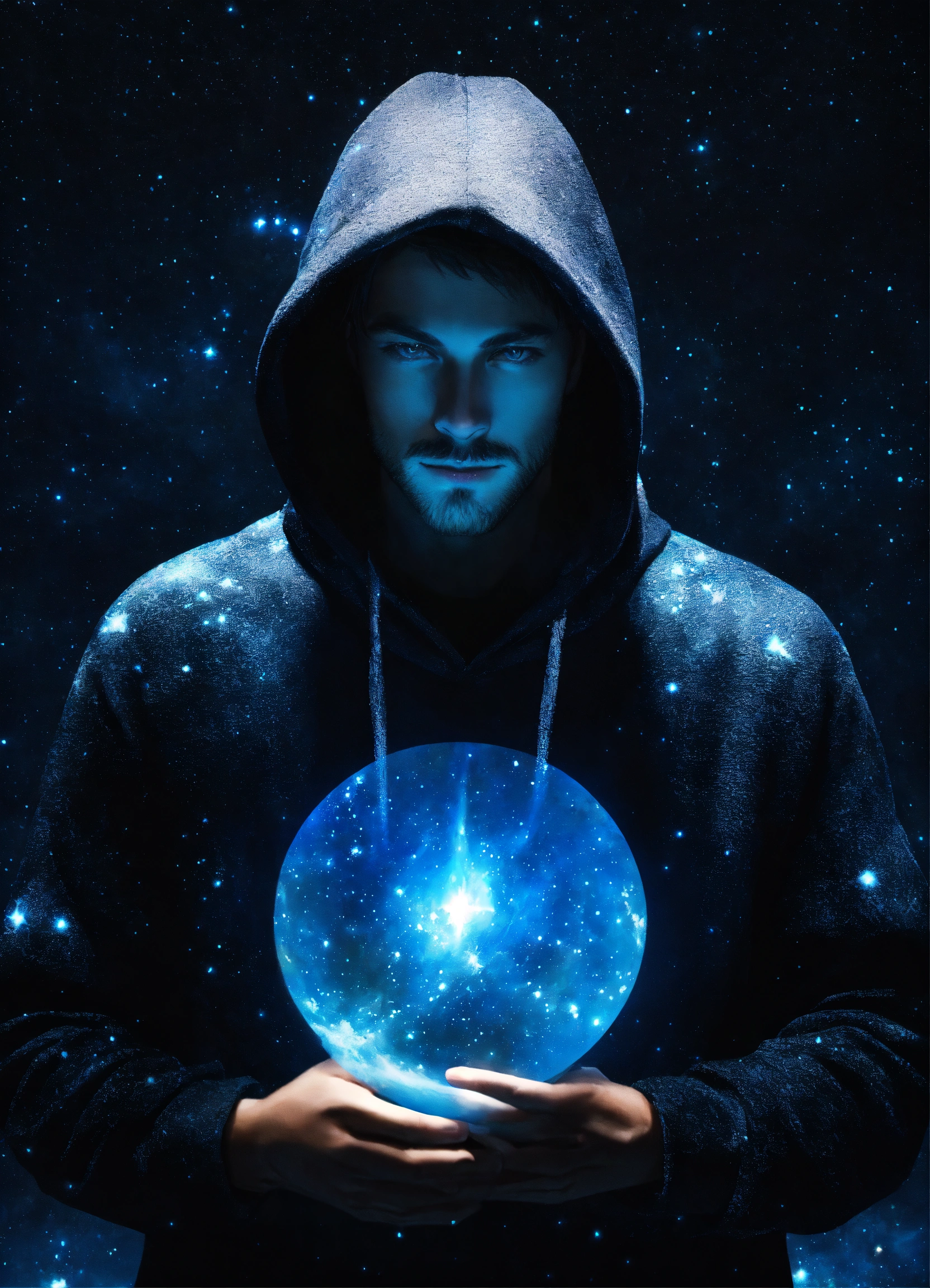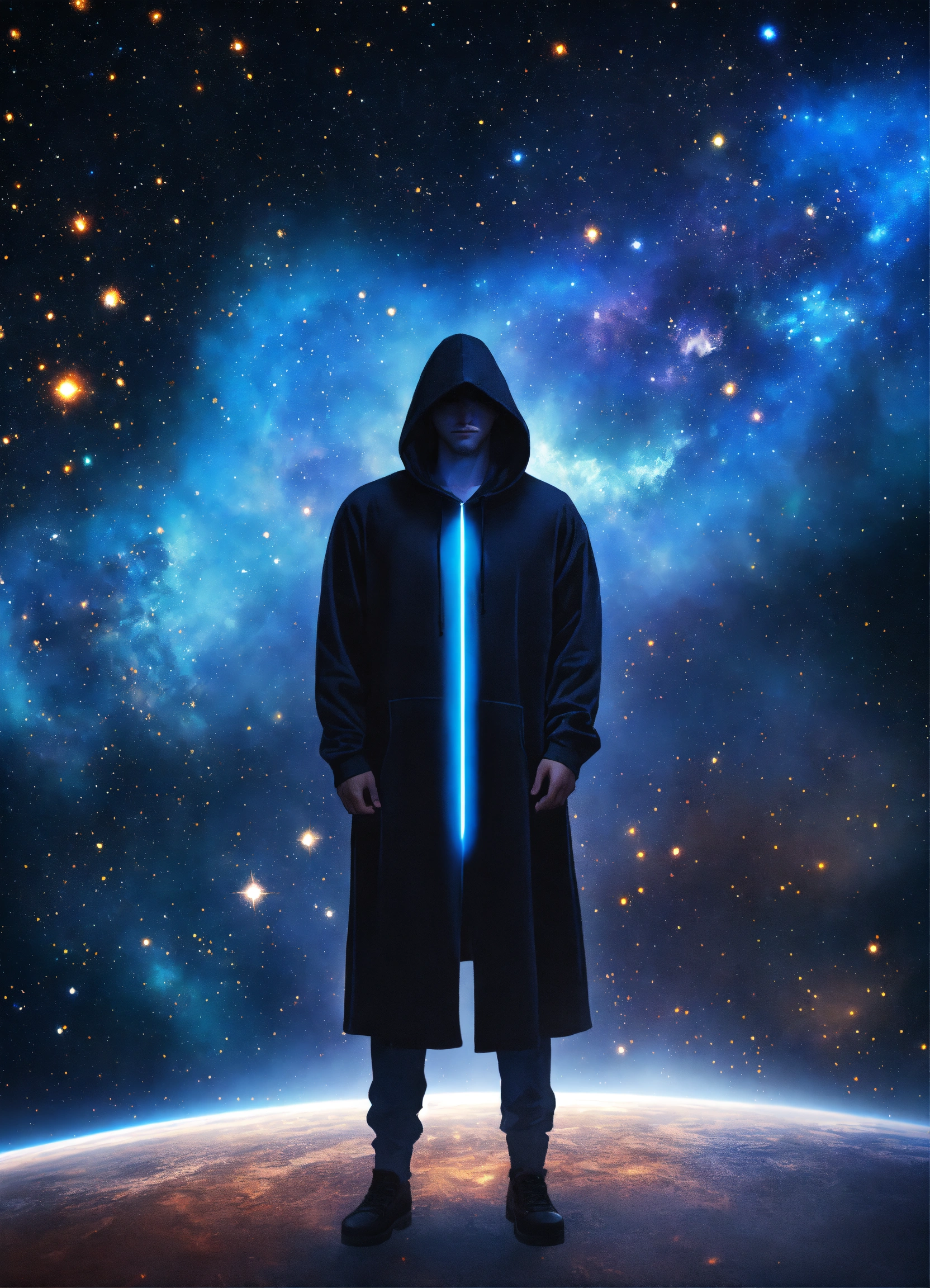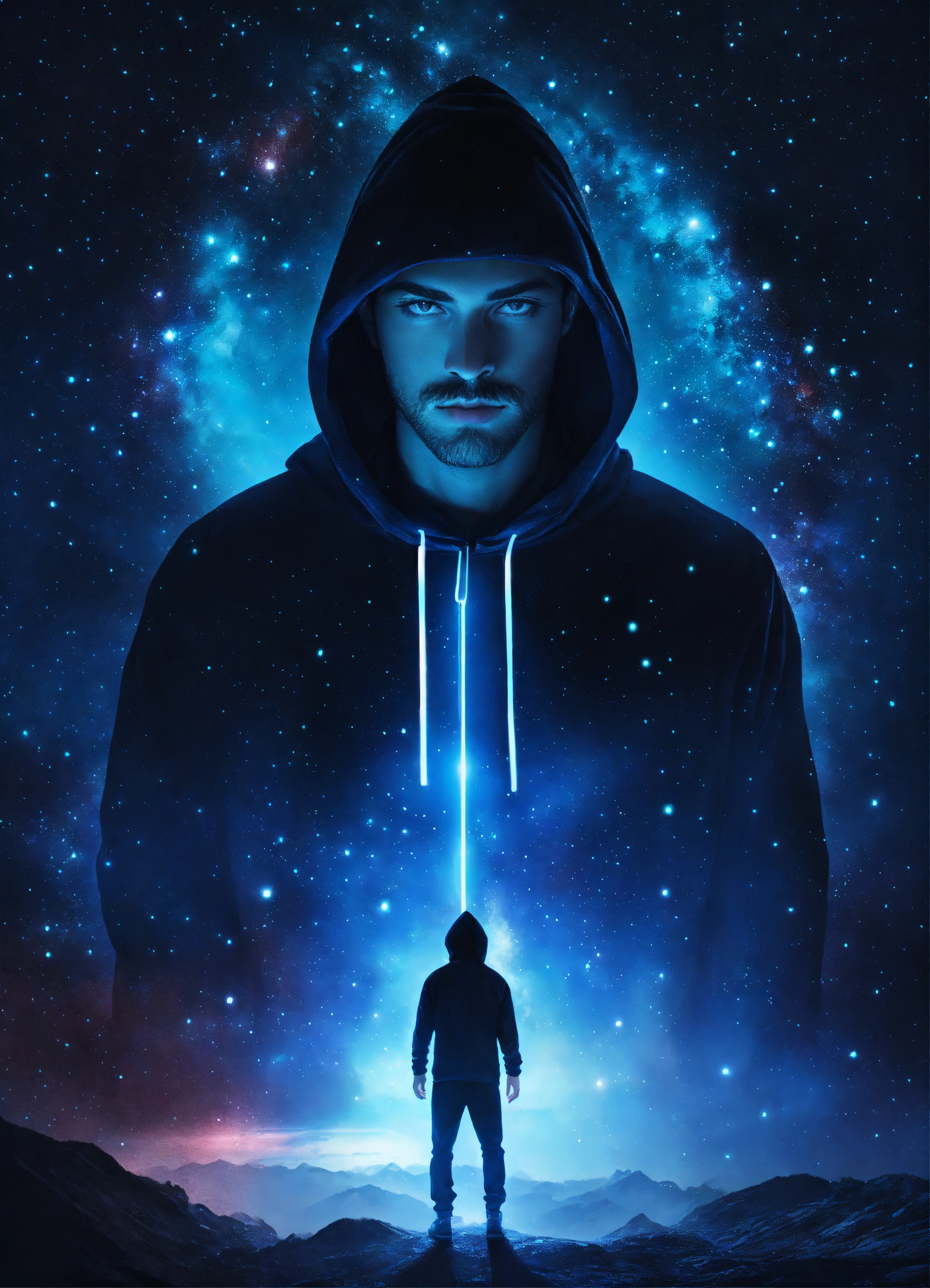A man in a hoodie with a luminous blue aura around him, in the middle of space, black background and many stars