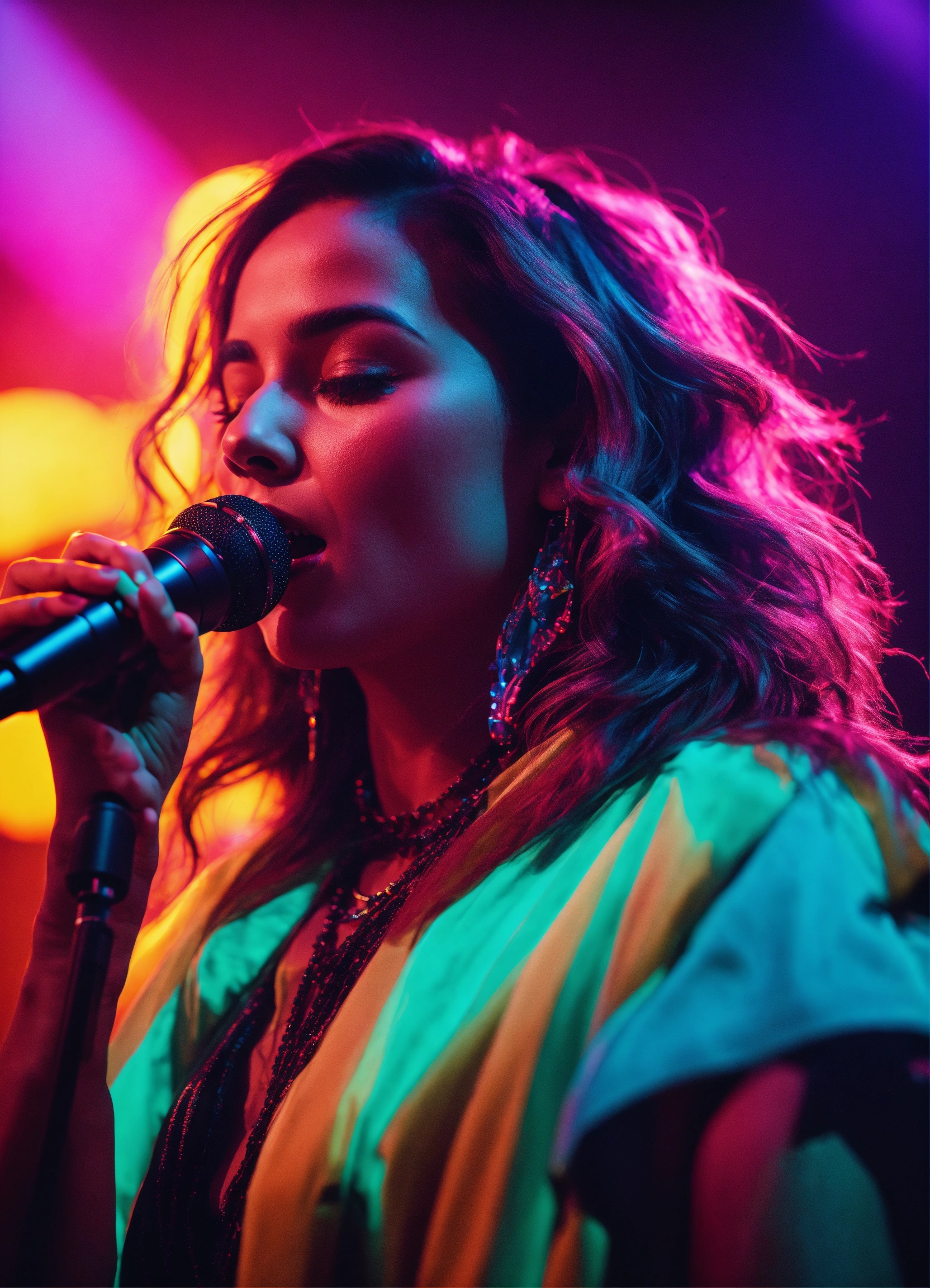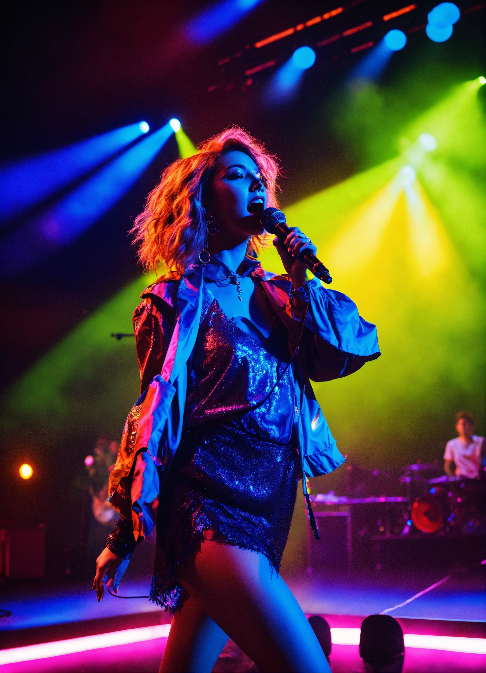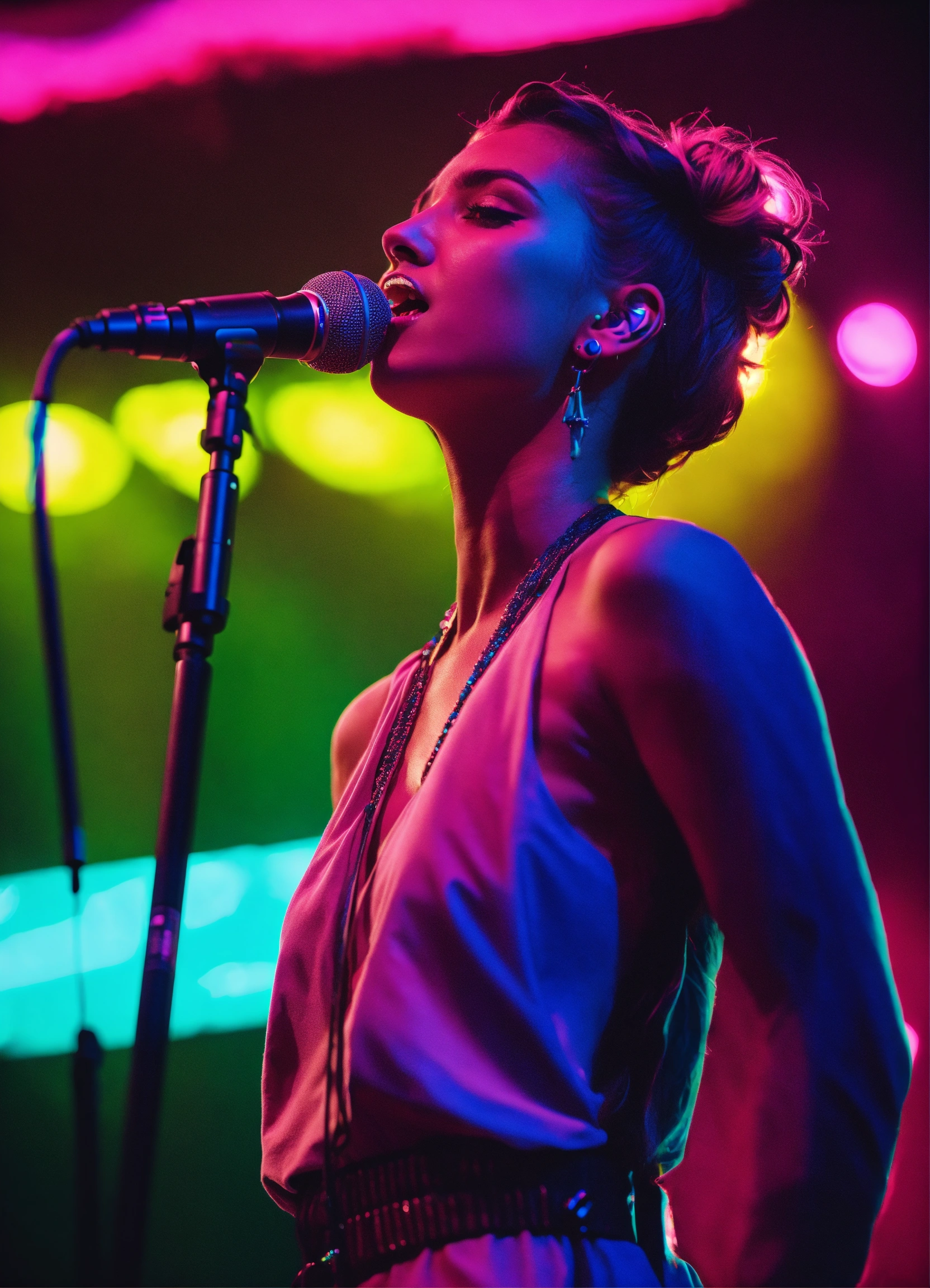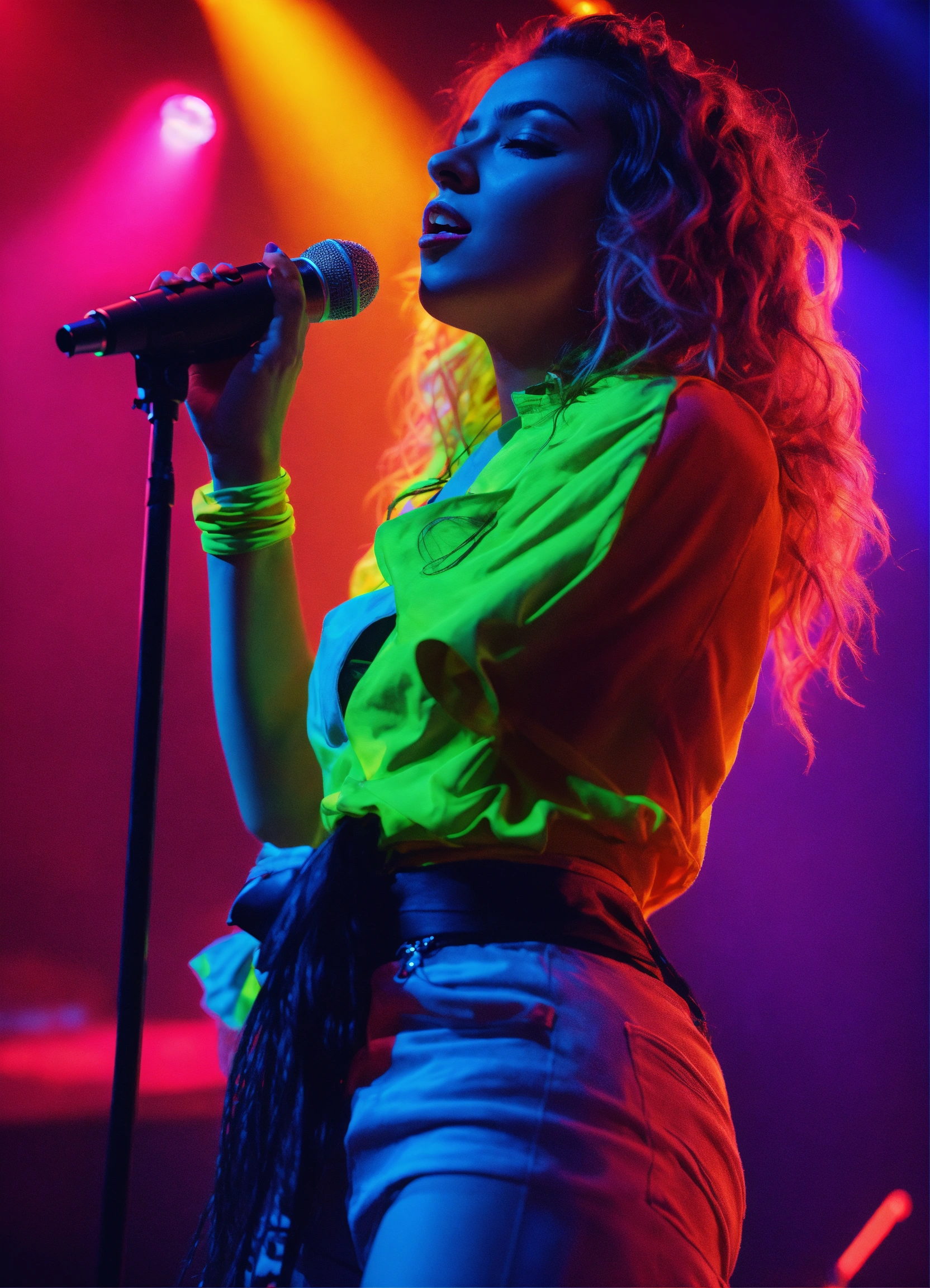 Cinematic photography, modern, female singer on stage performing, neon colors, realistic details, ultra 8k resolution