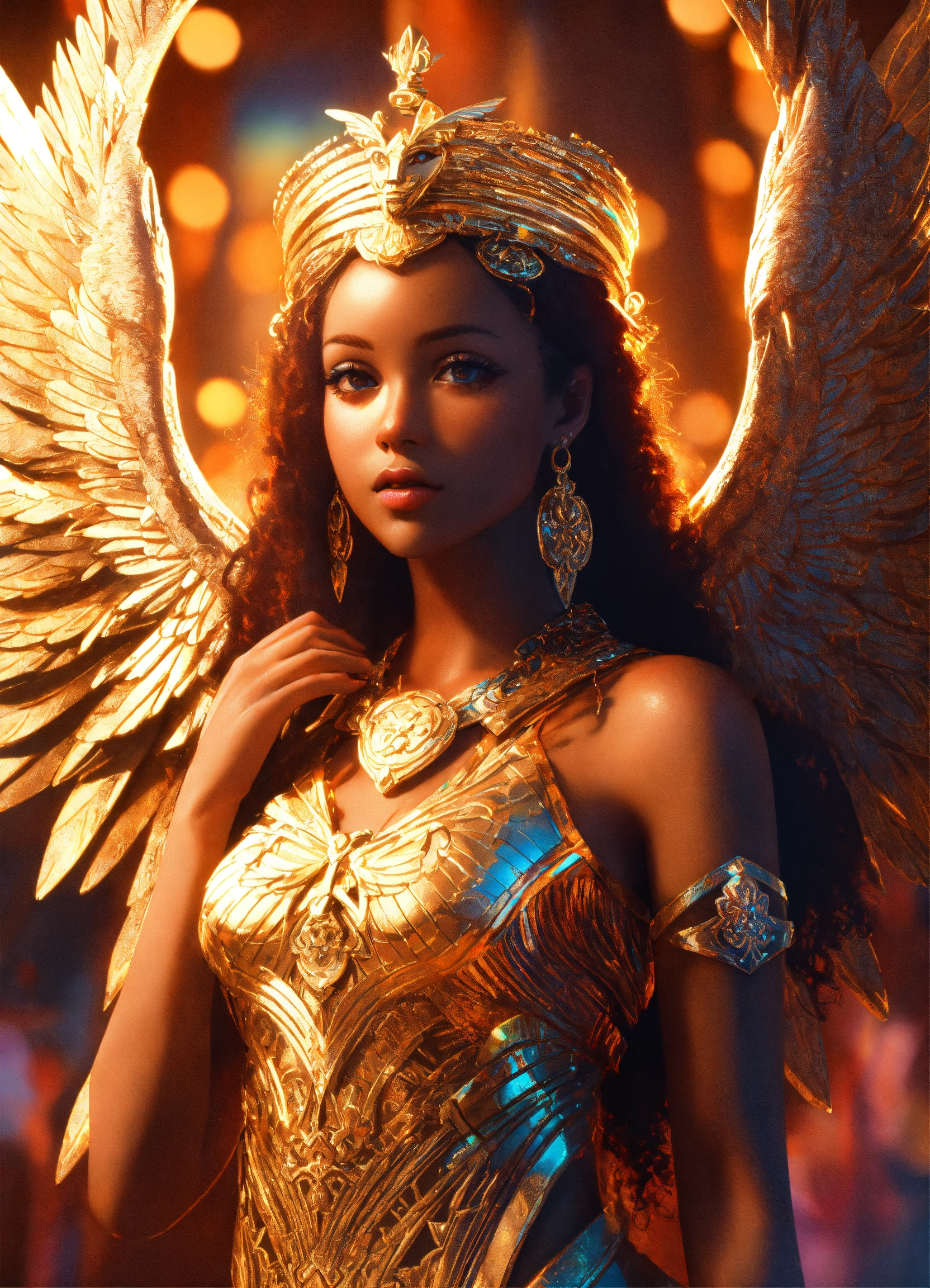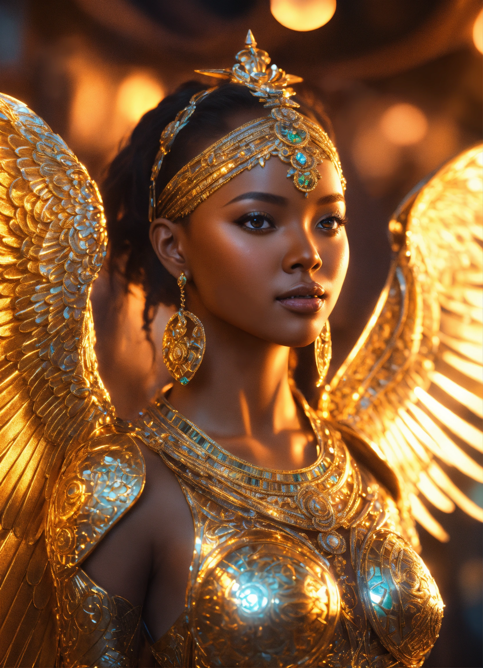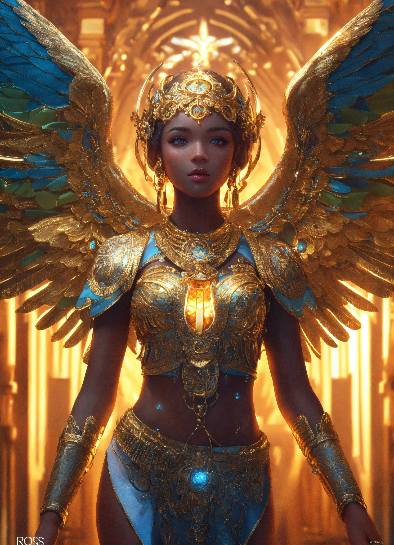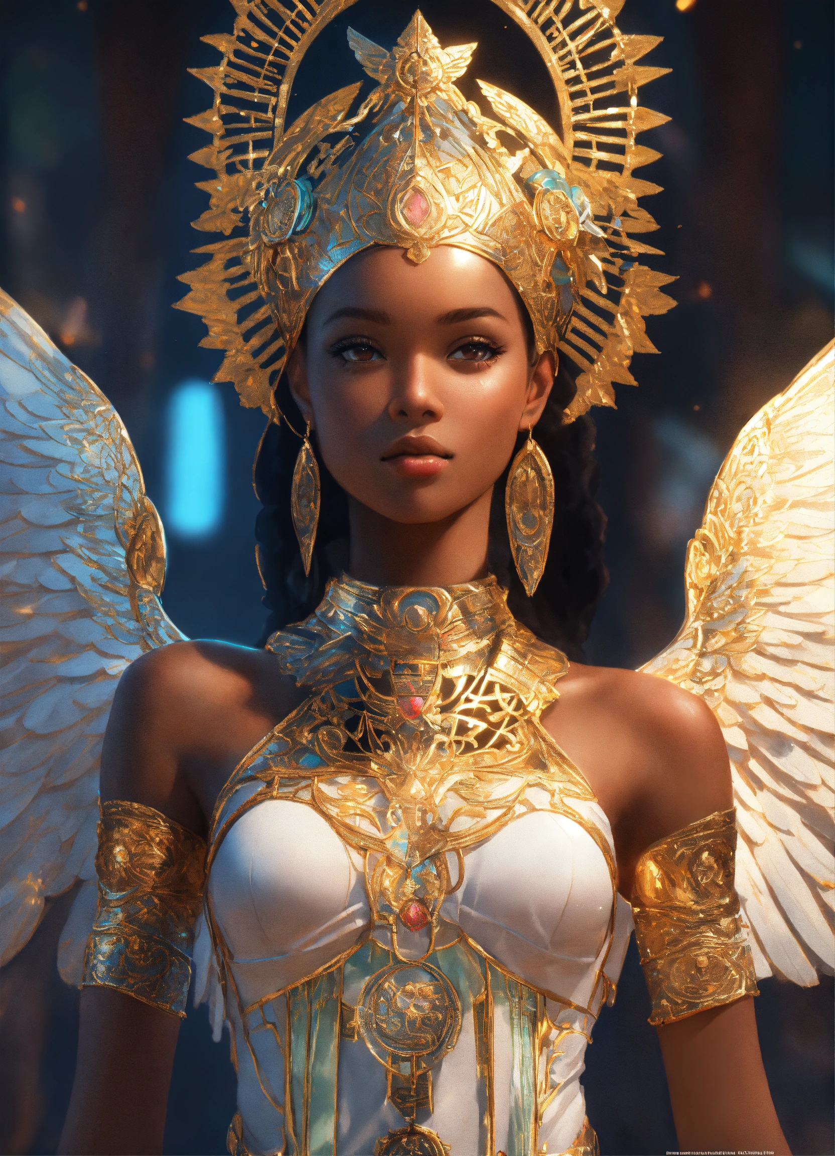 Highly-detailed full-body shot illustration of ethiopian angel michelle, detailed face, symmetrical, art by ross tran, global illumination, radiant light, intricate environment, trend on artstation, octane render